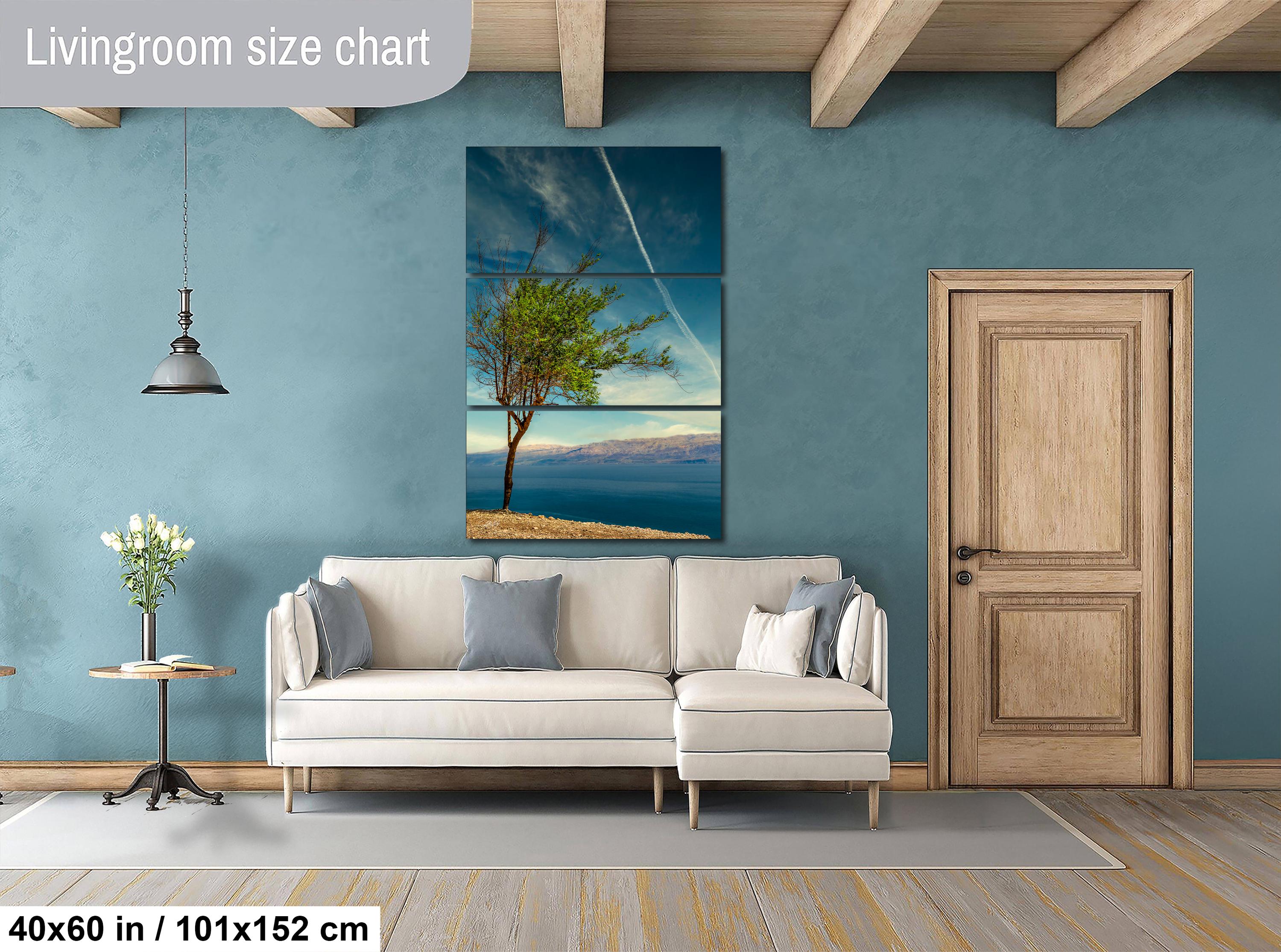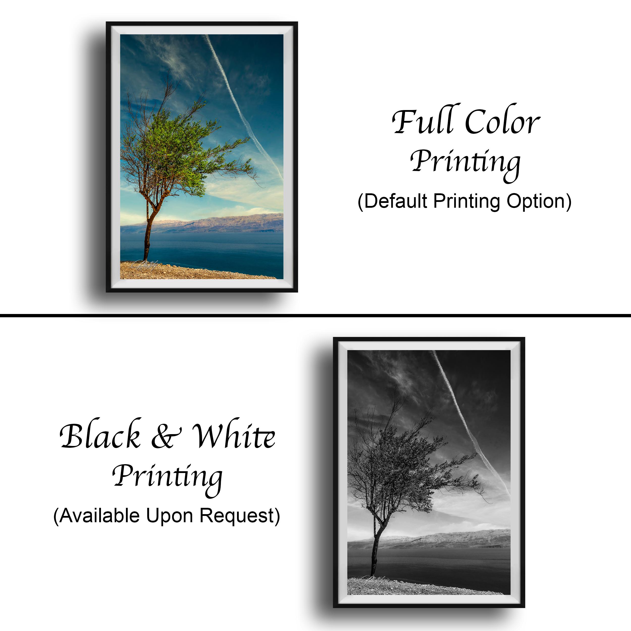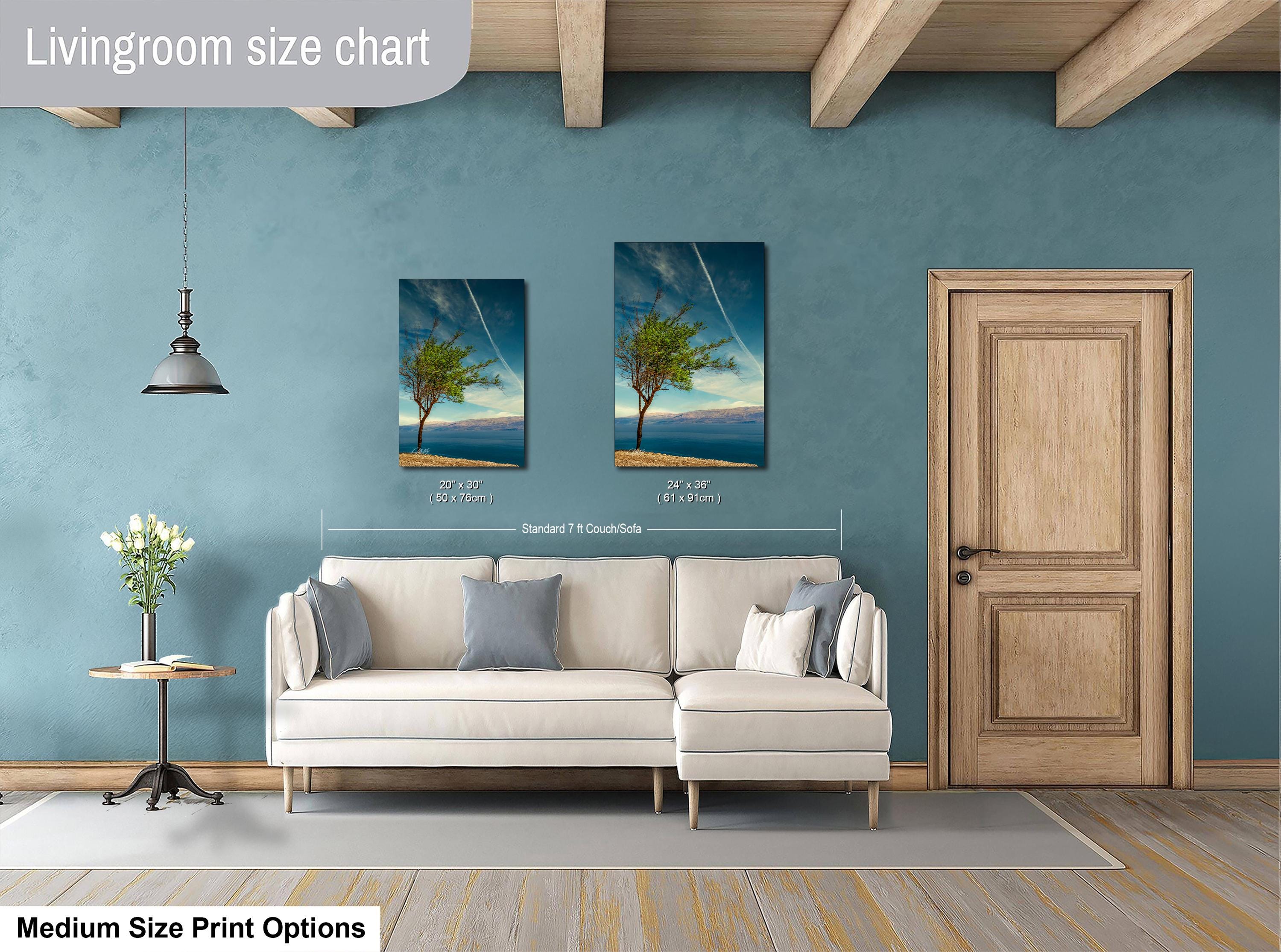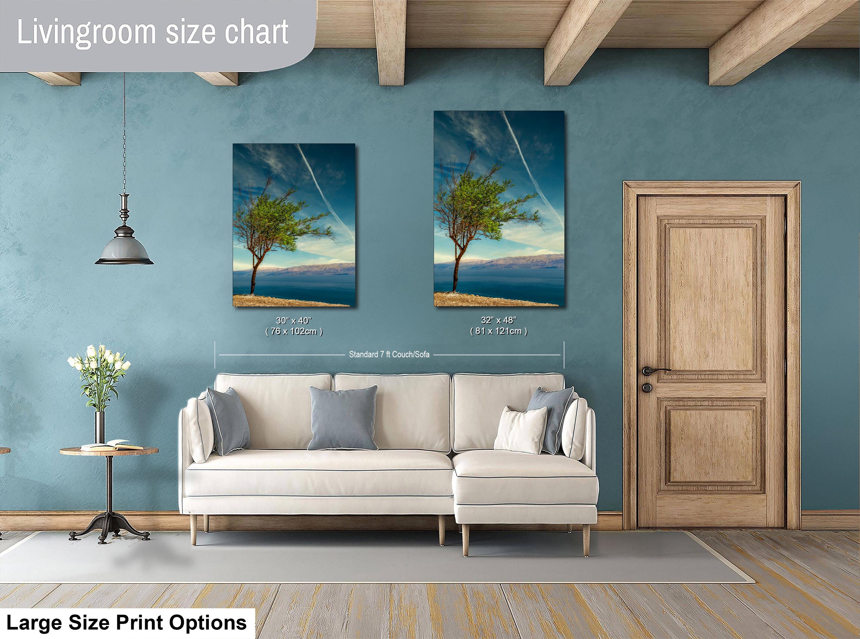 Perched above the shimmering Dead Sea, this fine art wall decor showcases the iconic acacia tree, a symbol deeply woven into ancient history and spirituality. The ancient acacia wood, famously used in sacred artifacts like the Ark of the Covenant, lends this image a profound cultural resonance.
