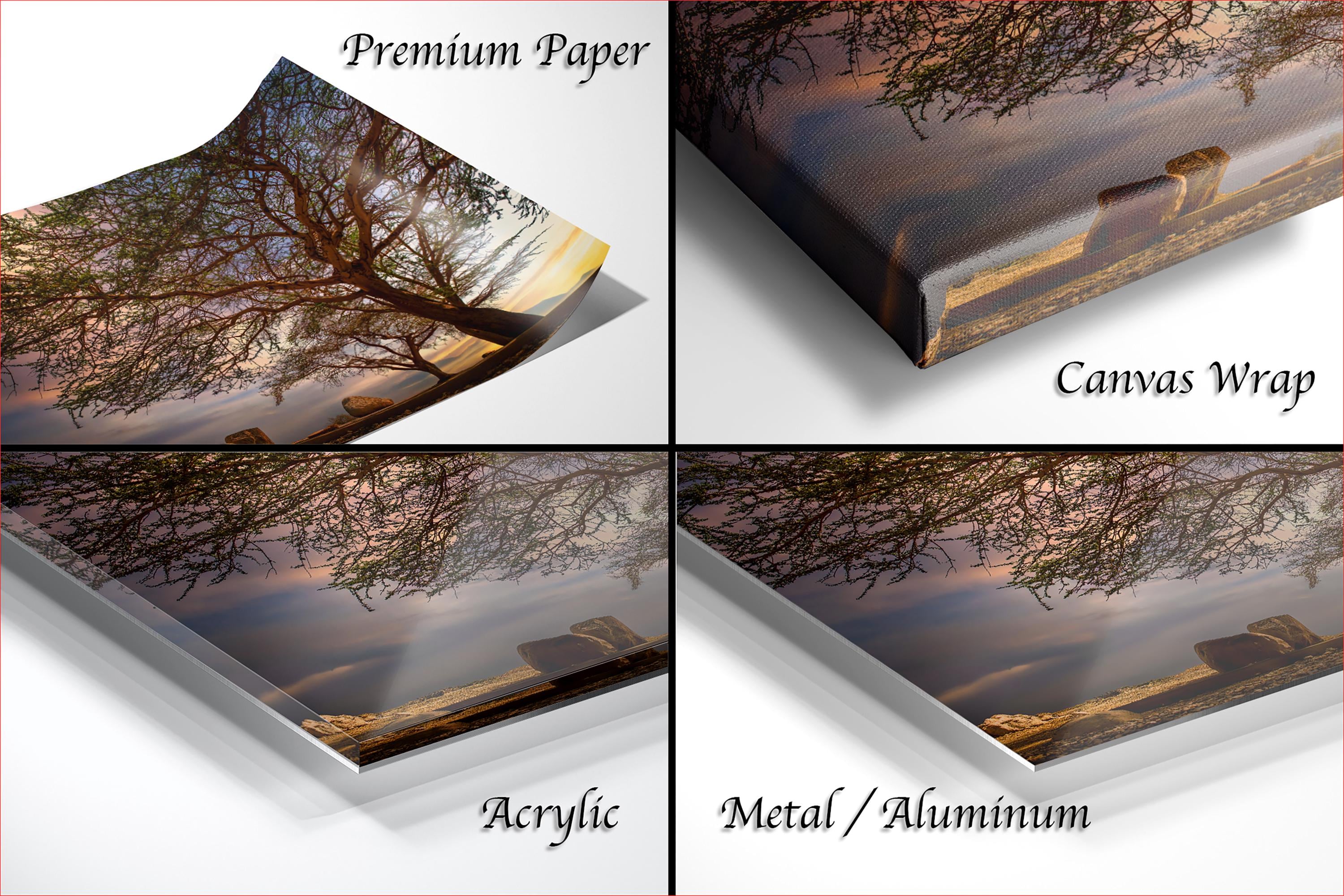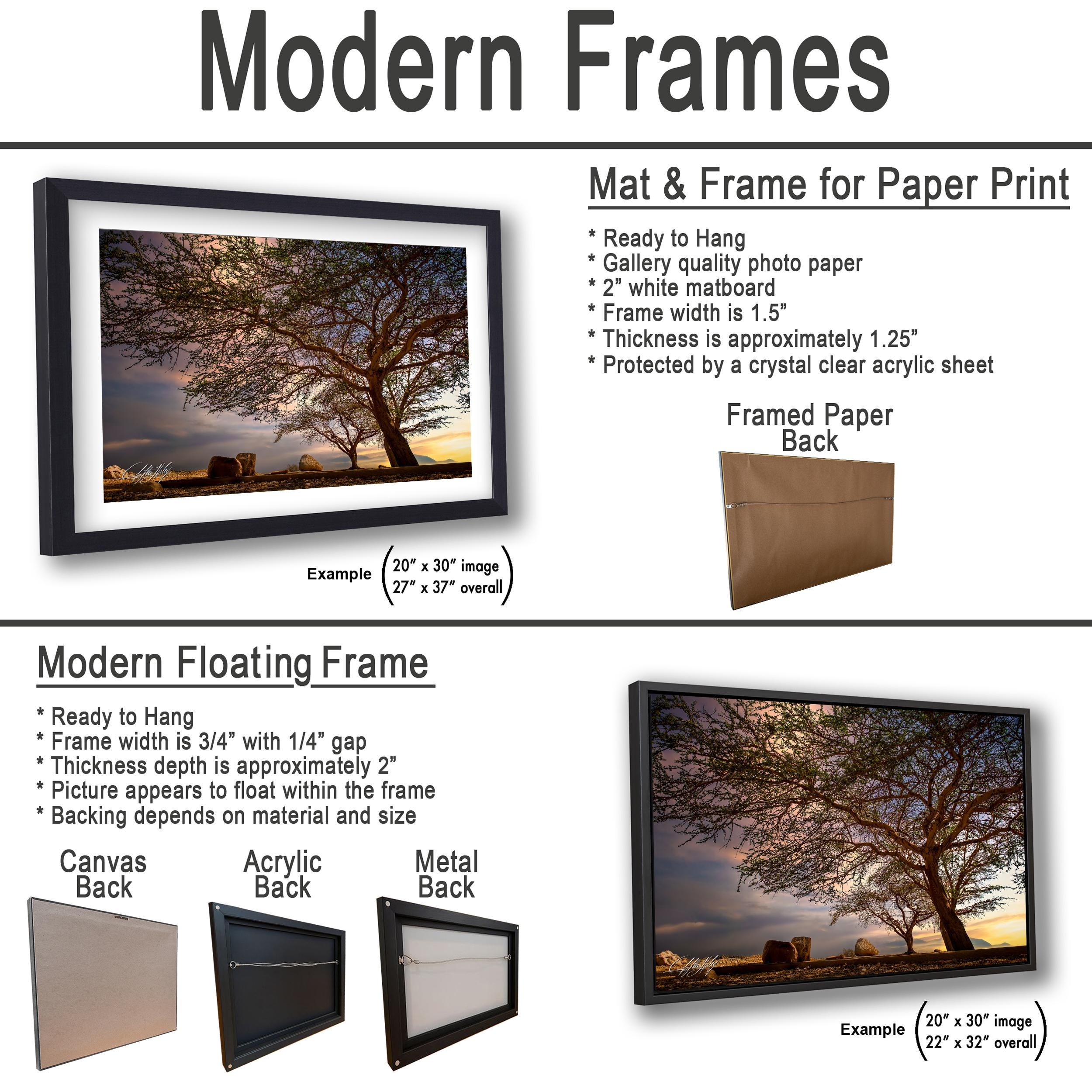 1. Our made-to-order process means no returns, but if your print arrives damaged or has any issues, we’ll gladly exchange or replace it. 2. Framed paper prints, acrylics, and metal prints include a 2" white mat border for elegant presentation. 3. Canvas prints are flush mounted without a mat border for a sleek, modern look.