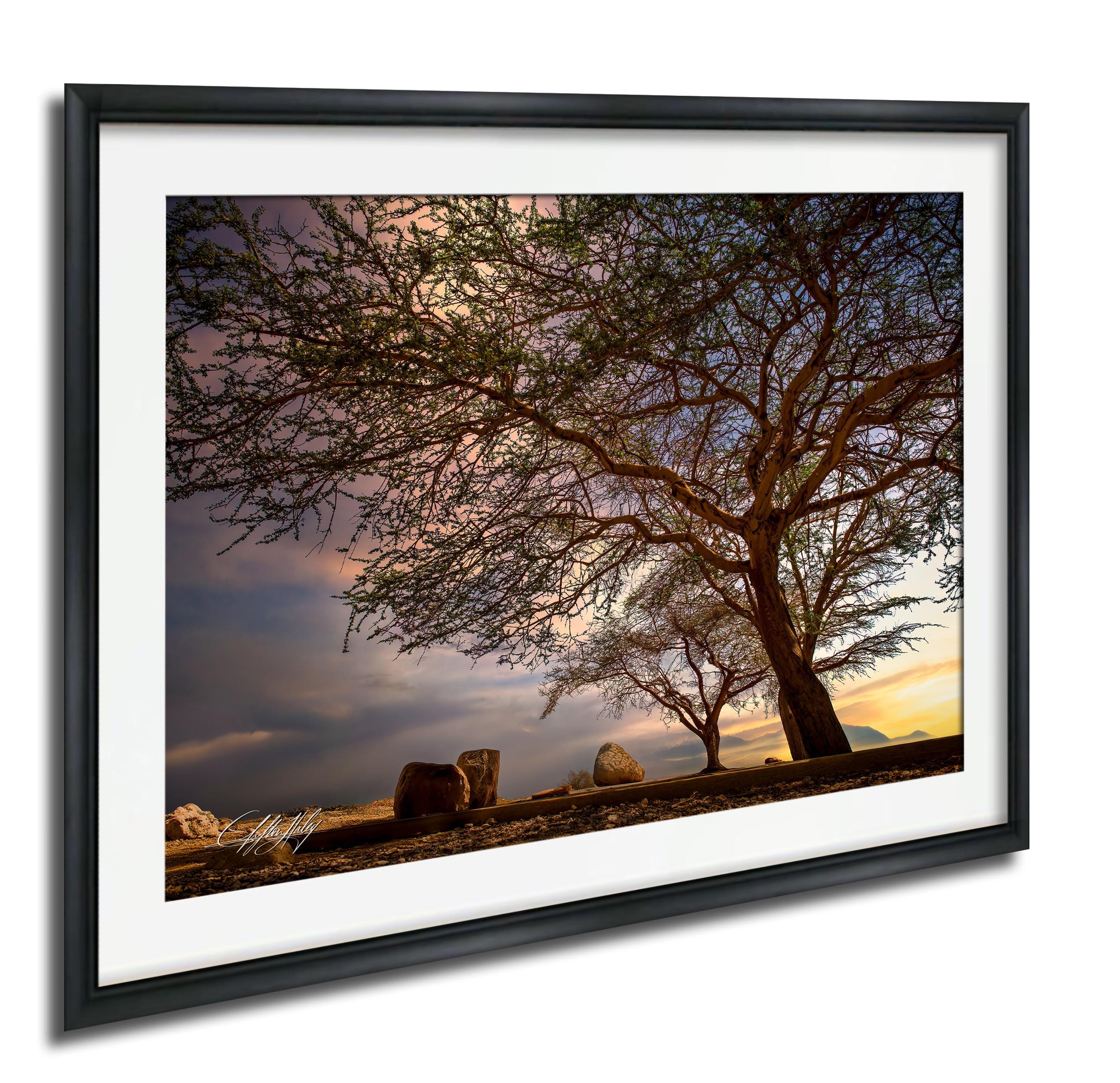 Experience the majestic Moab Mountains view as the backdrop to this fine art photography, capturing the sacred acacia wood long revered in the Holy Land. The Ein Gedi wilderness setting enriches this Israeli nature print with authentic connection and tranquility.