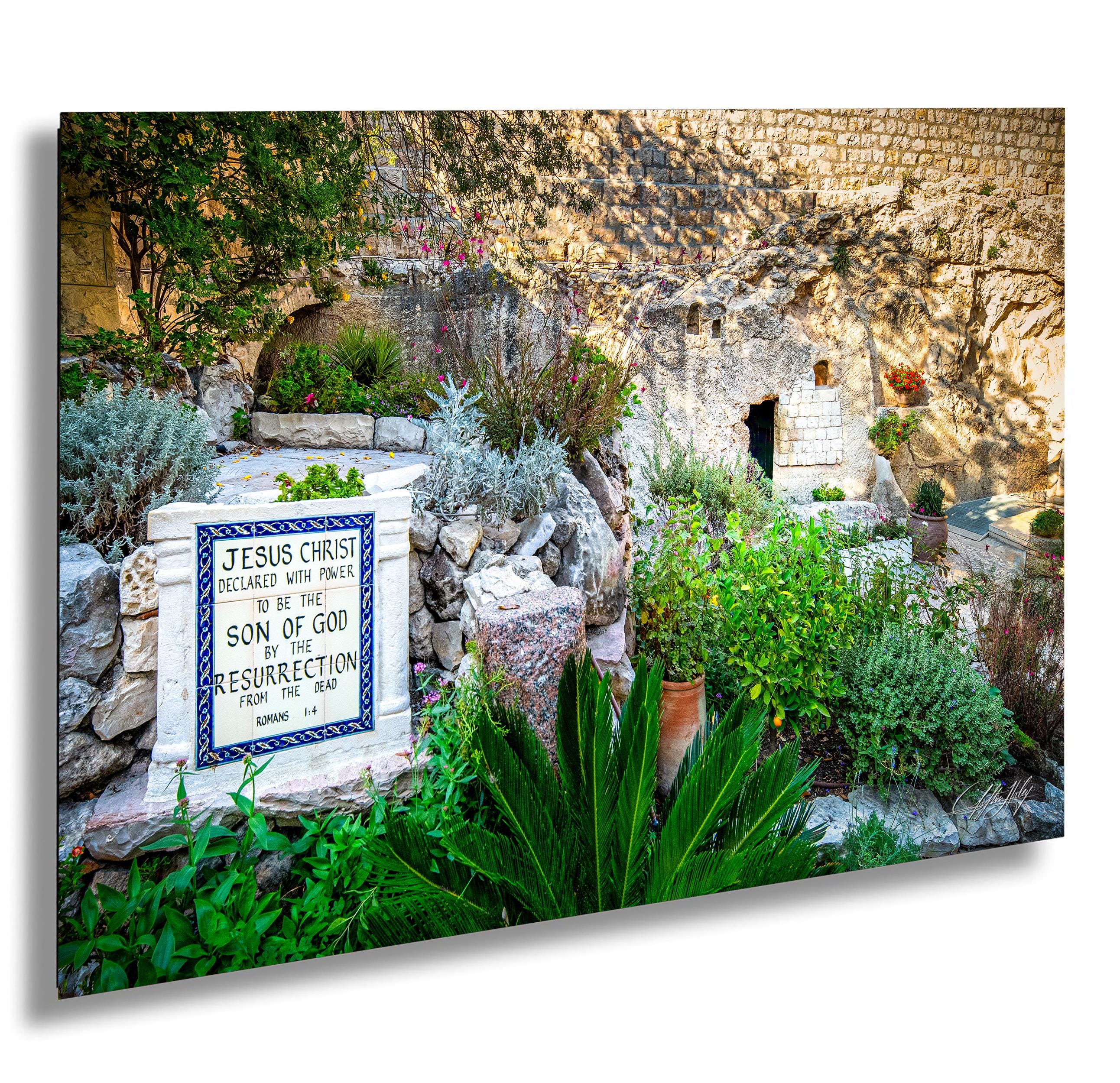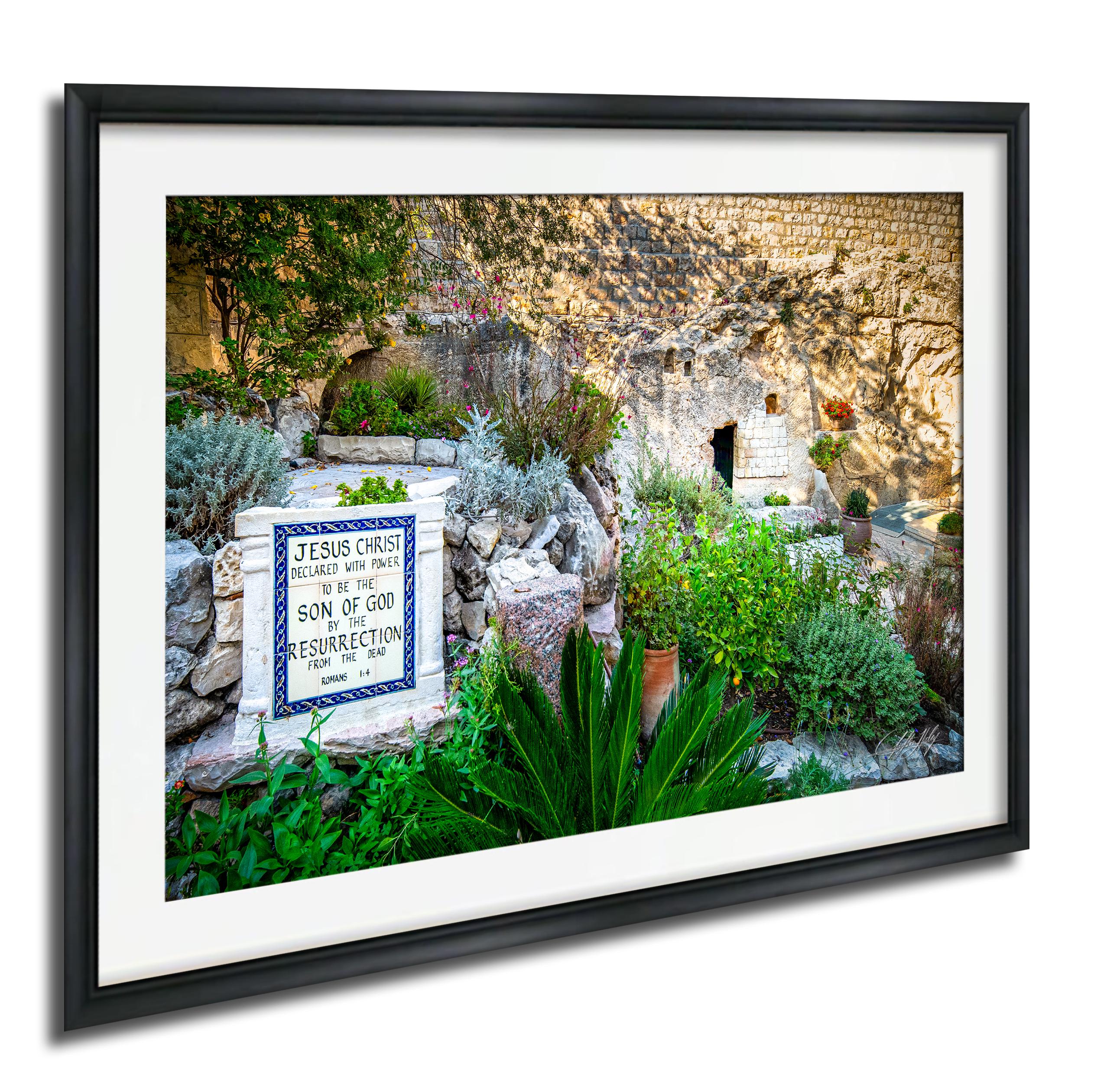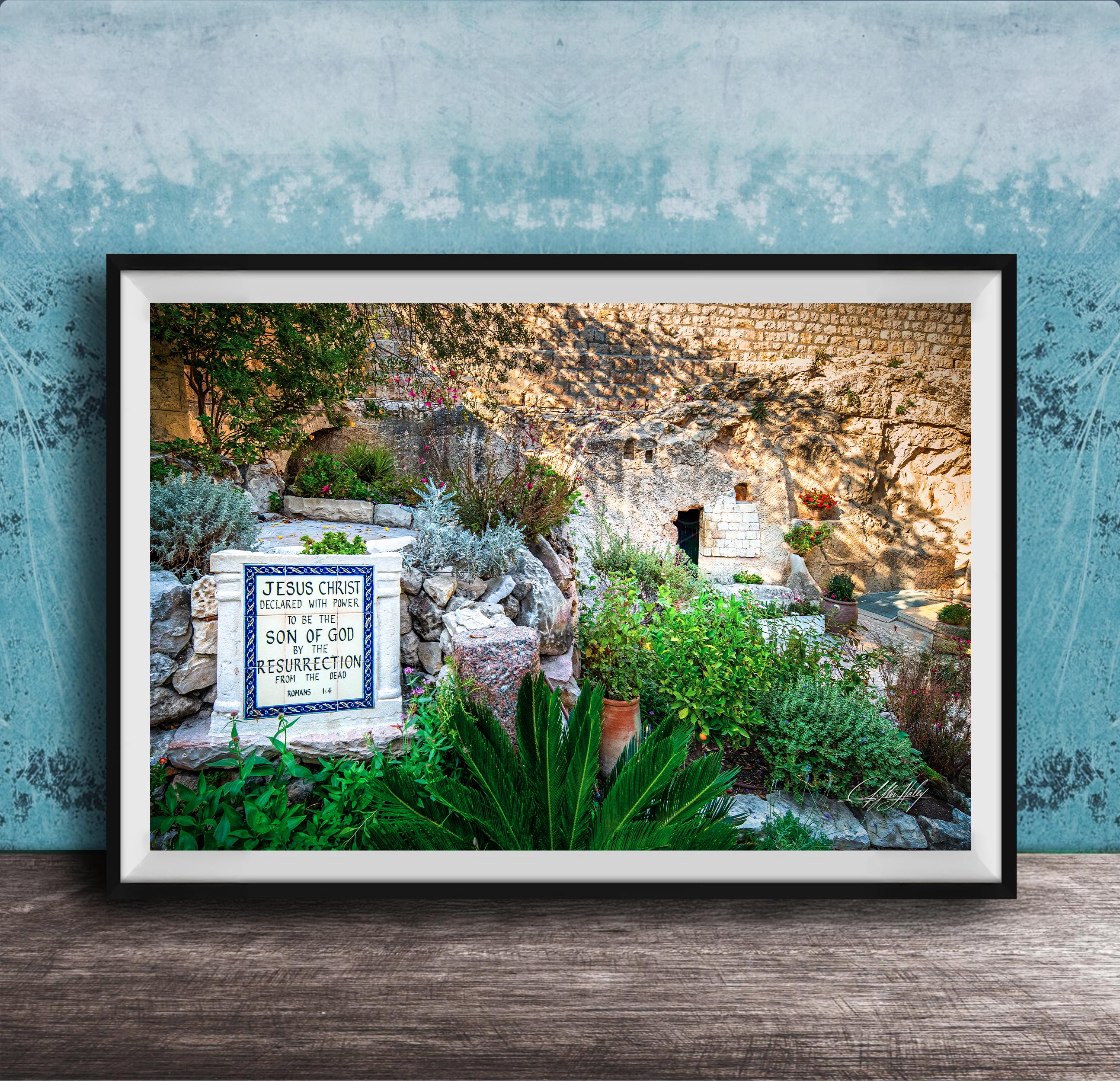 Bring the essence of the Garden Tomb into your space with this peaceful garden view artwork that celebrates faith and renewal.