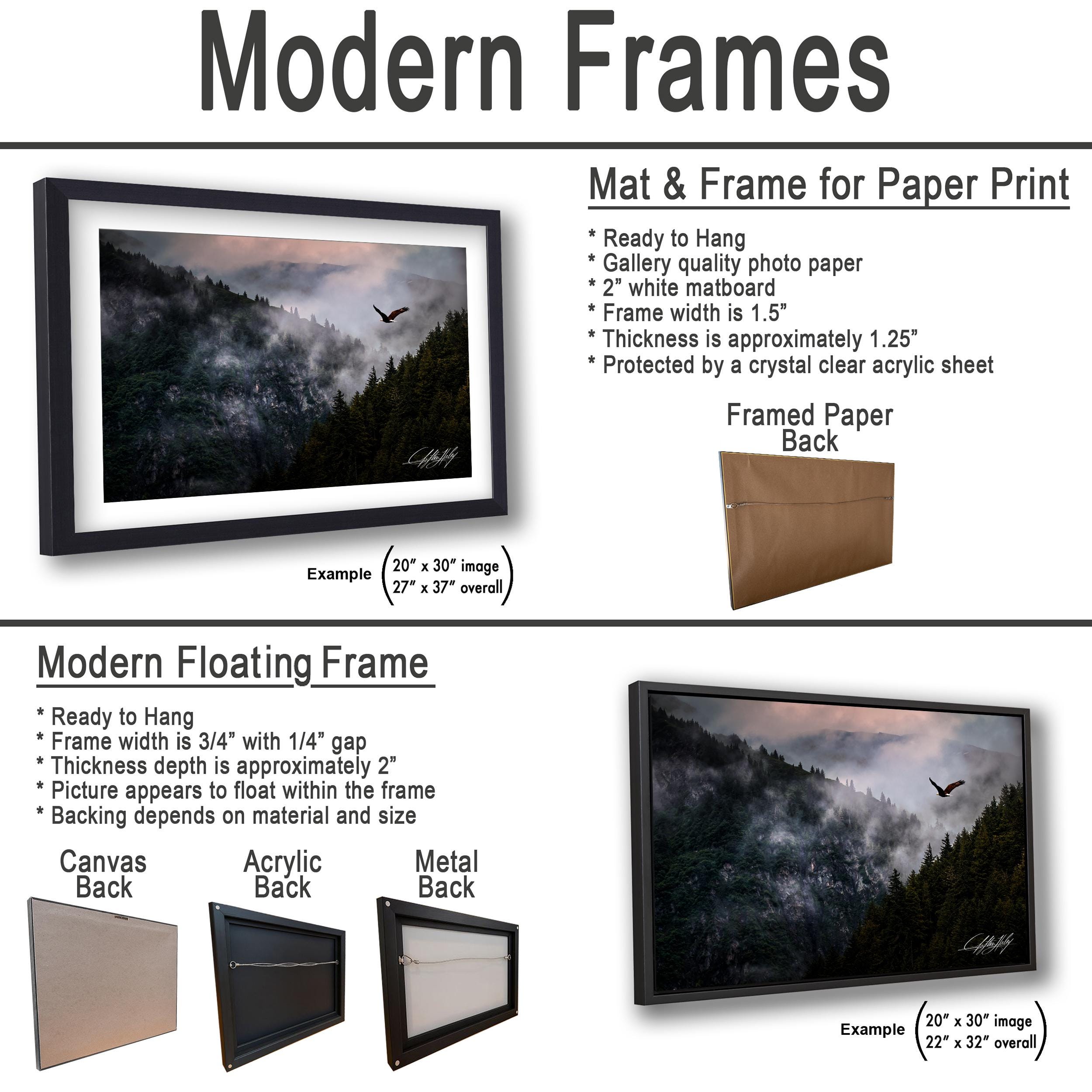 3.1) Only framed paper prints, acrylics and aluminum/metal prints will have a 2" white mat border. 3.2) Canvas prints will be a flush mounted (no mat border) to the frame.