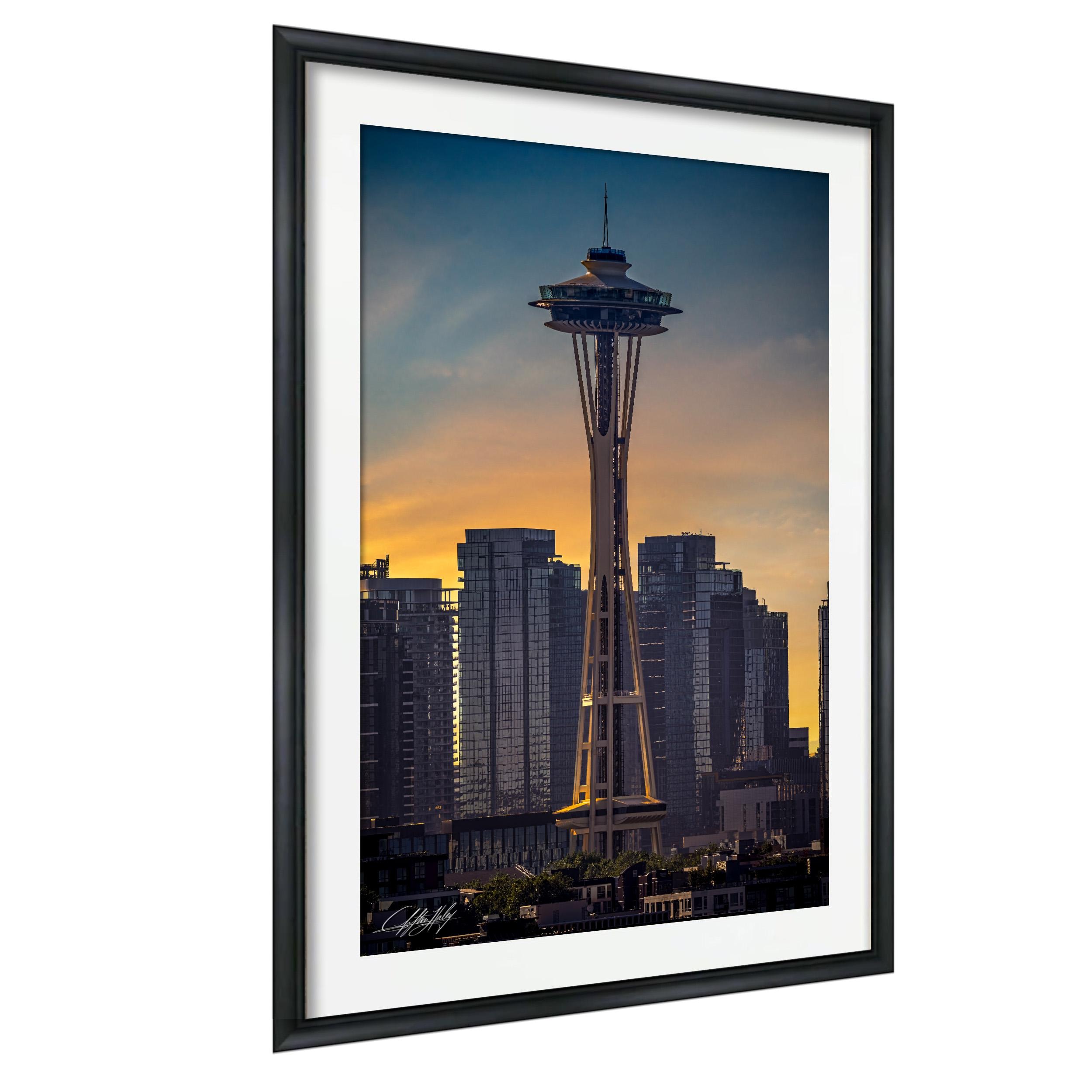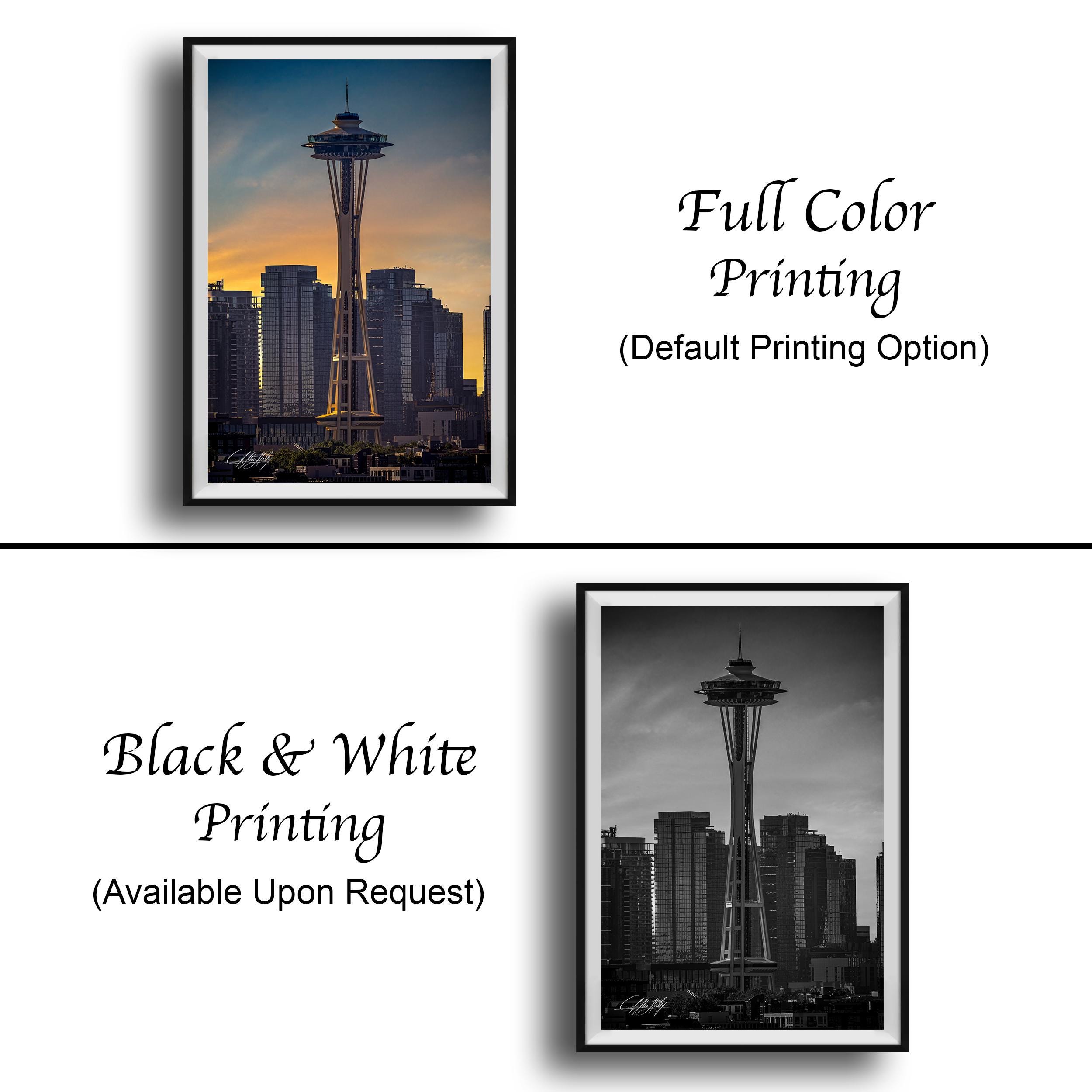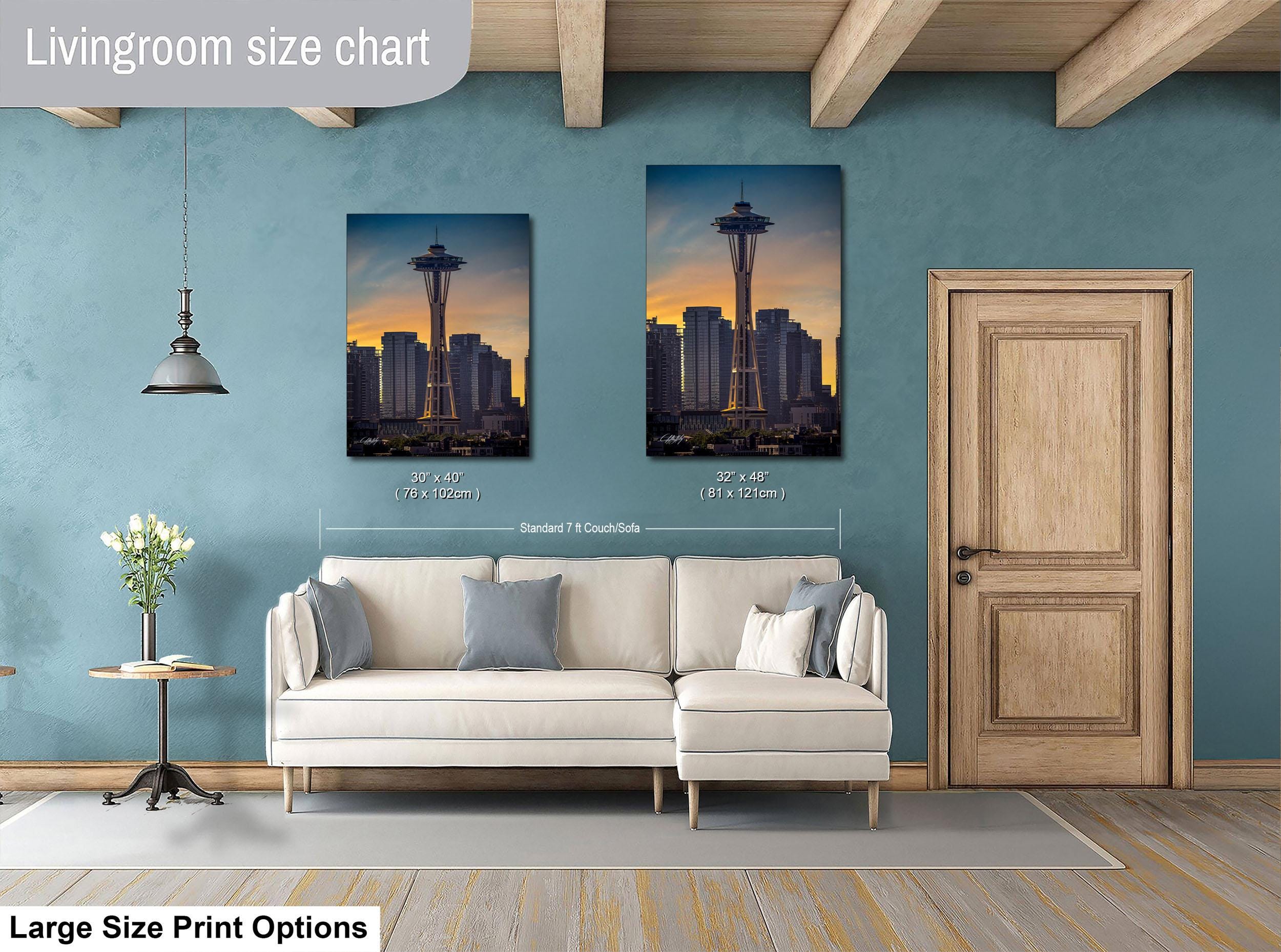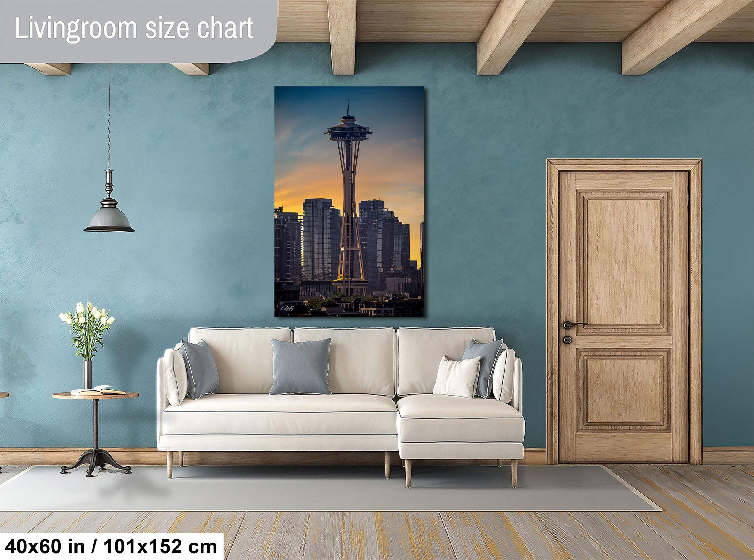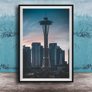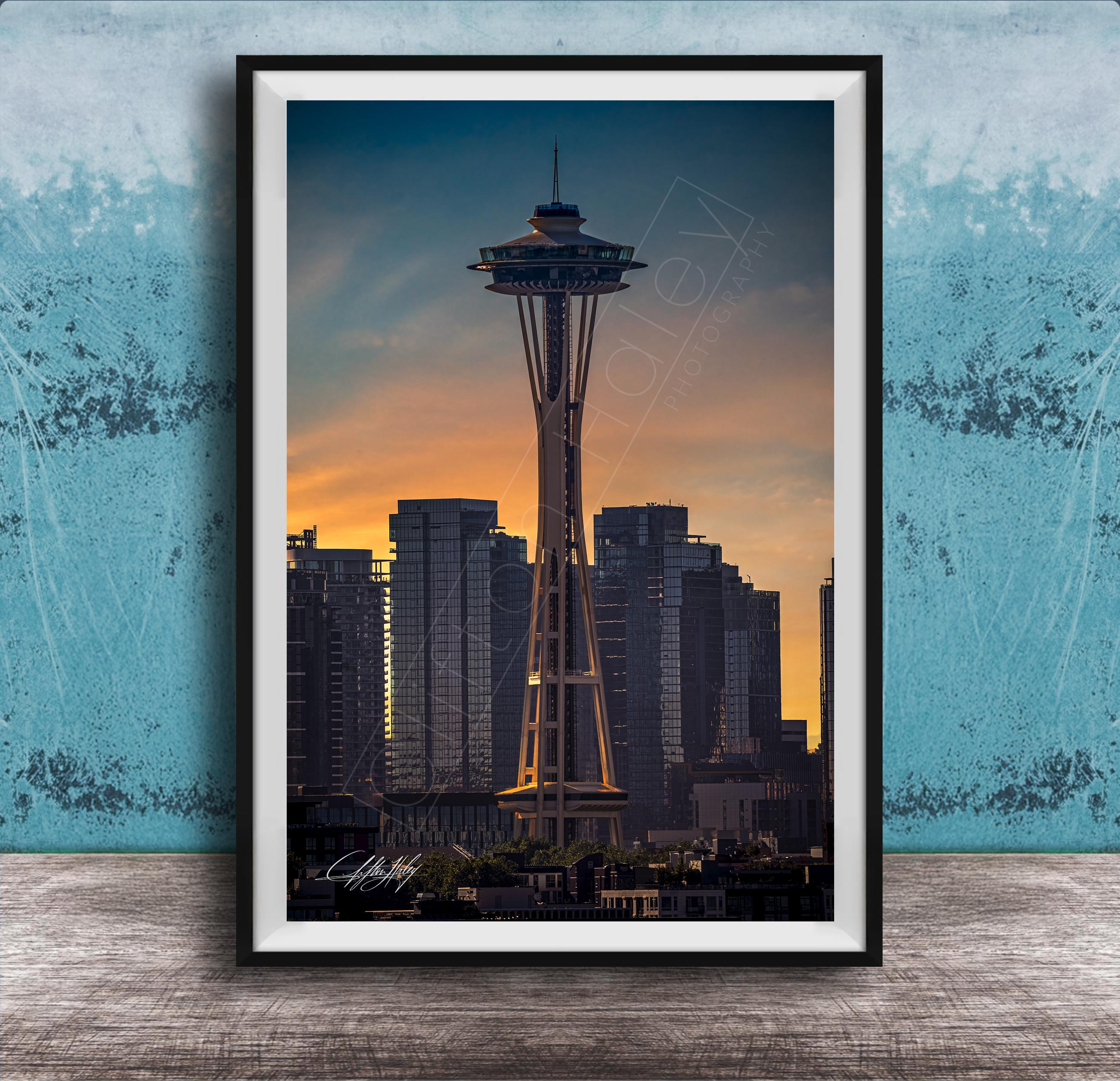 This Seattle art print beautifully captures the iconic Space Needle Seattle at sunset, offering a stunning Washington wall art piece perfect for urban decor lovers.