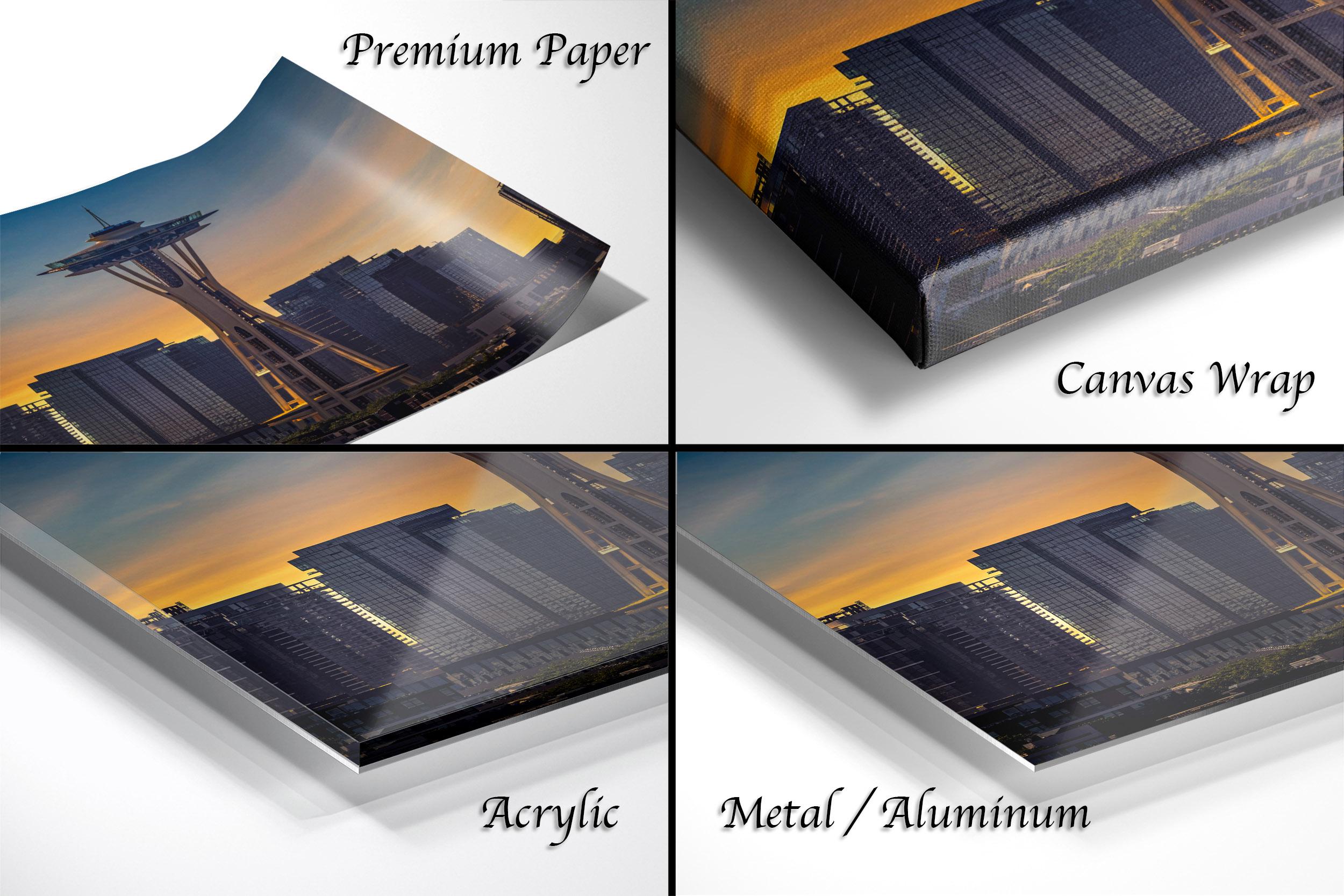Immerse yourself in the warm glow of the cityscape skyline poster, where the legendary Space Needle stands tall against the vibrant hues of an urban sunset. This premium quality print showcases Seattle’s unique blend of modern architecture and historic charm, making it a captivating addition to any home or office.