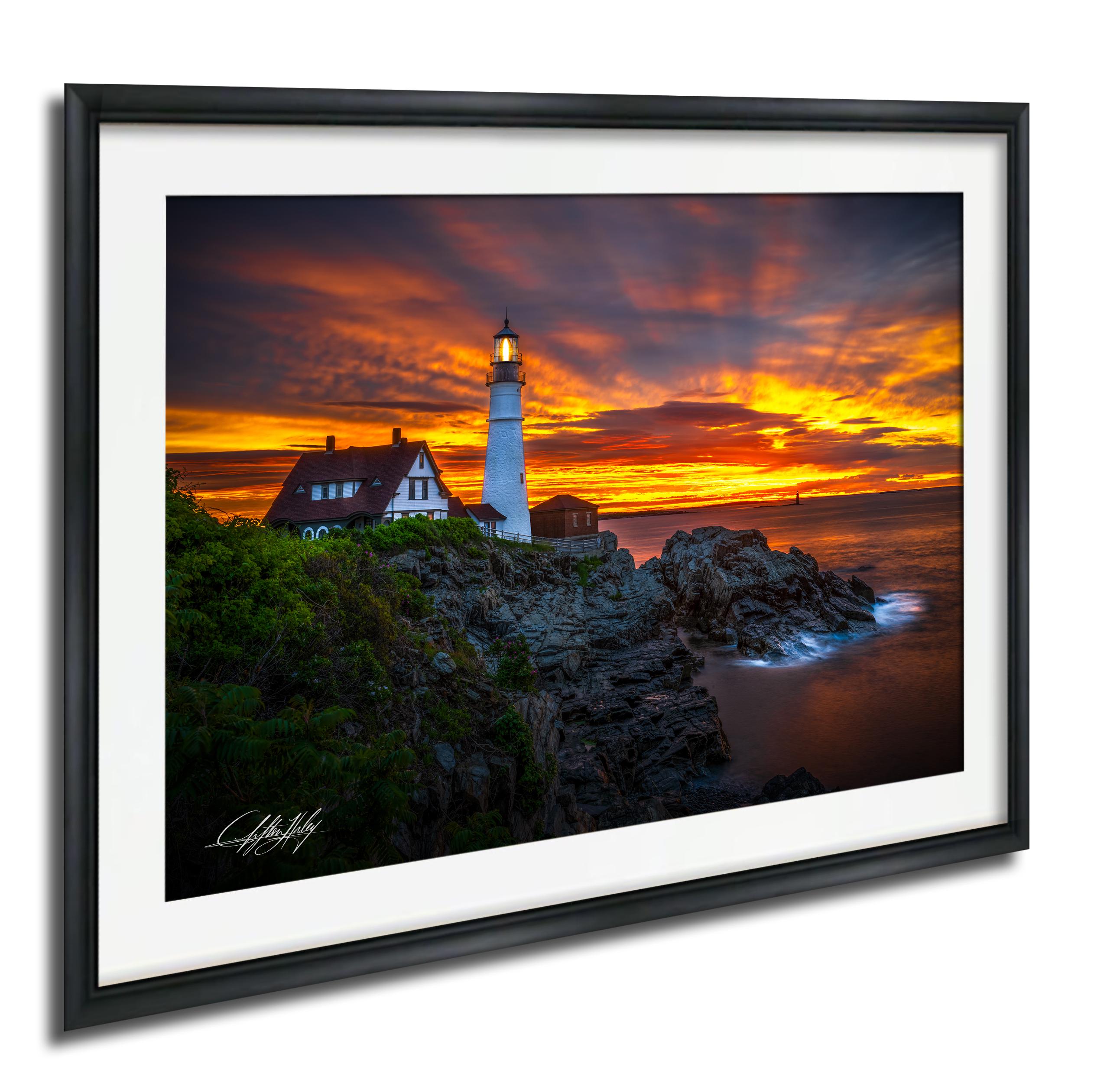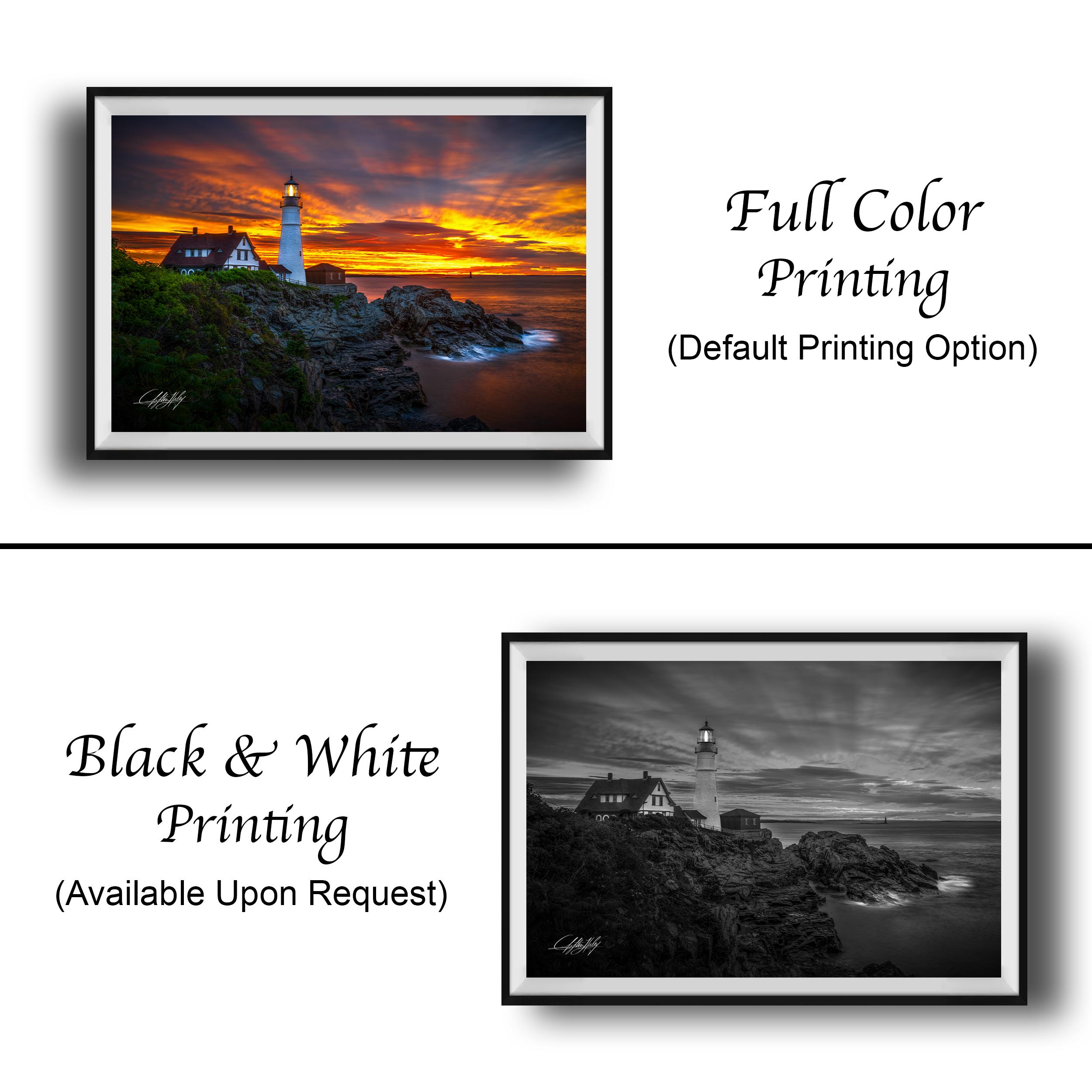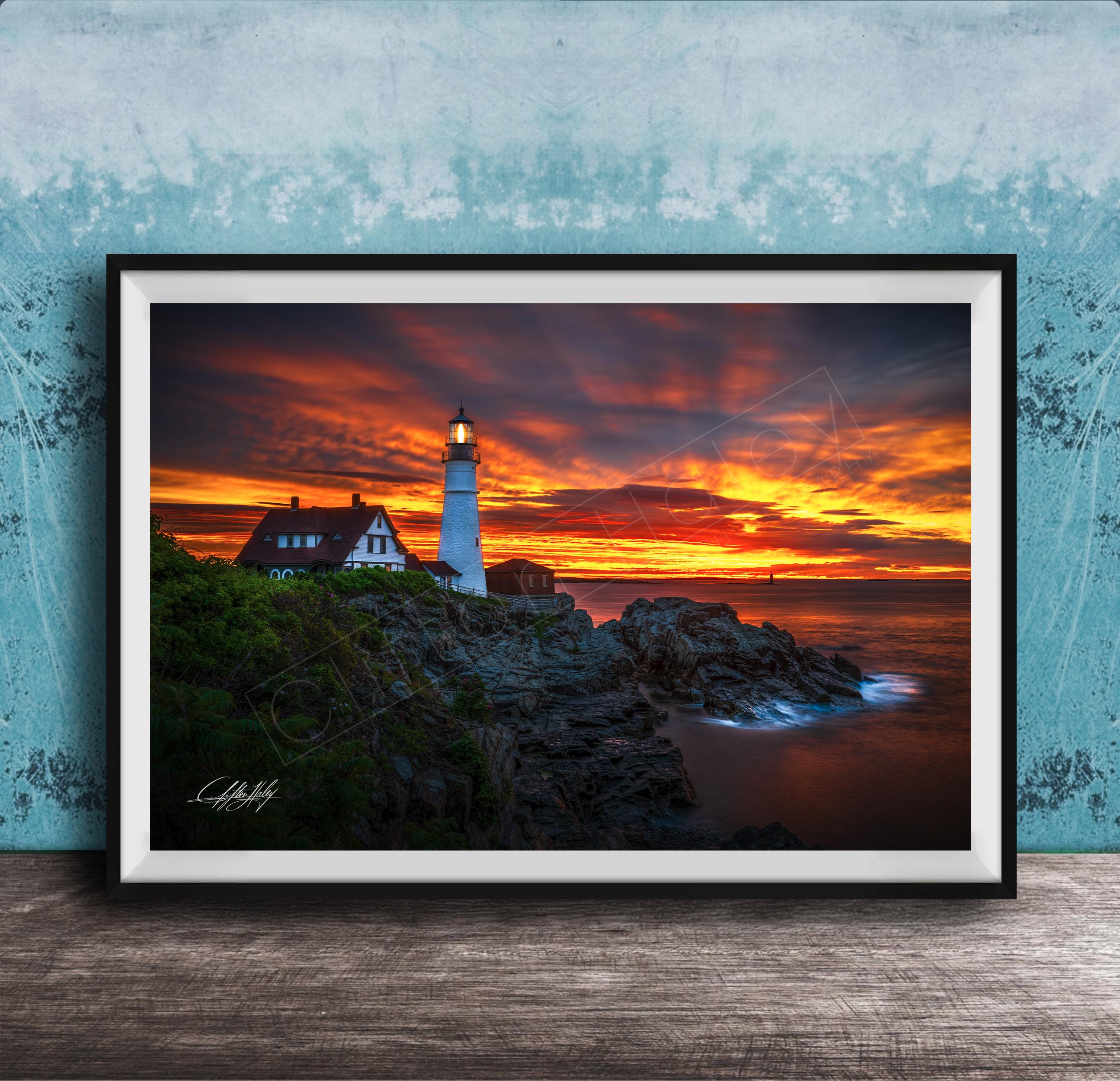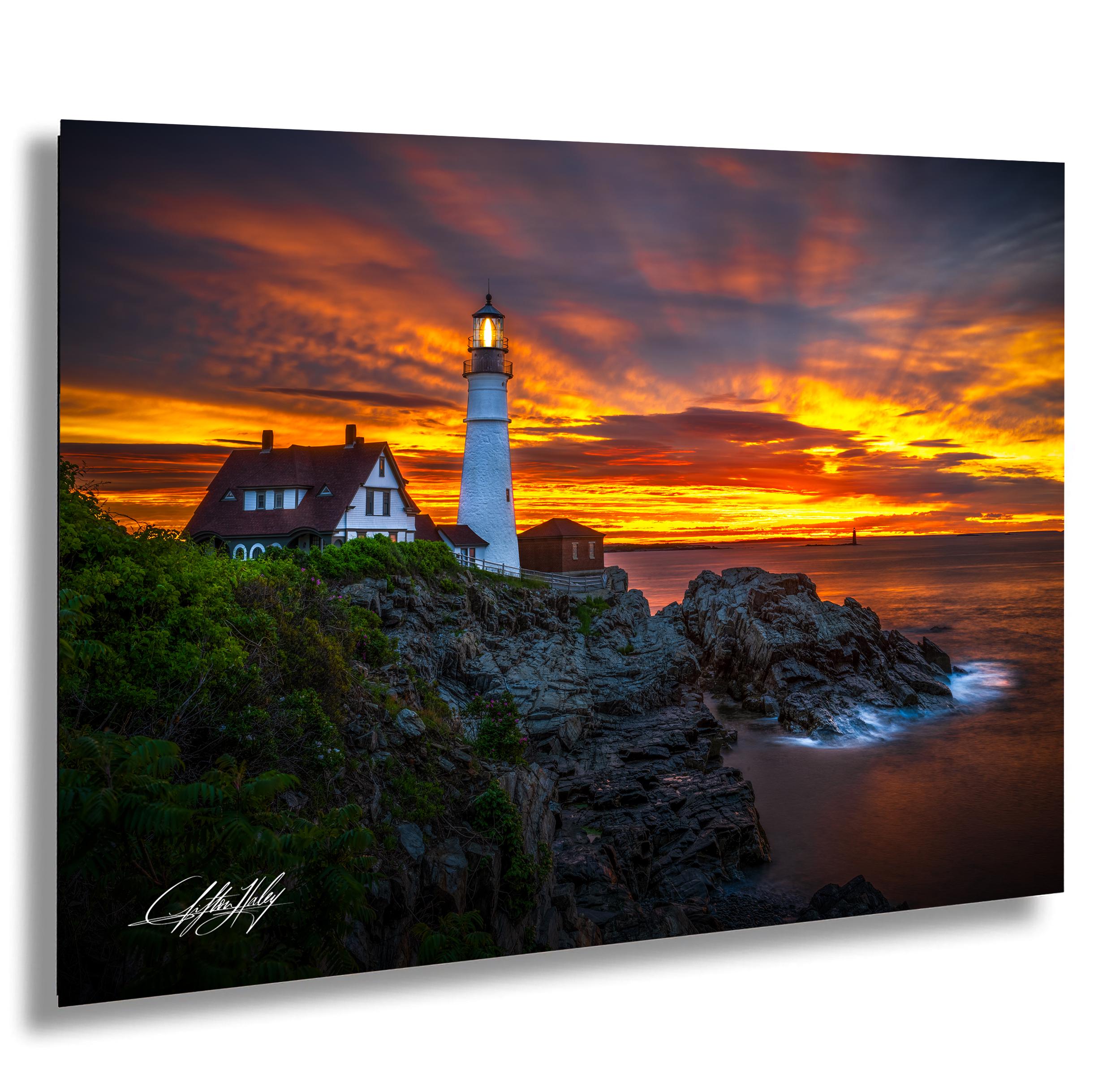 Portland Head Light lighthouse print captures the serene beauty of Maine's iconic coastal landmark at sunrise. This coastal wall art brings a peaceful seascape painting into your home, perfect for nautical decor enthusiasts seeking a timeless ocean scene.