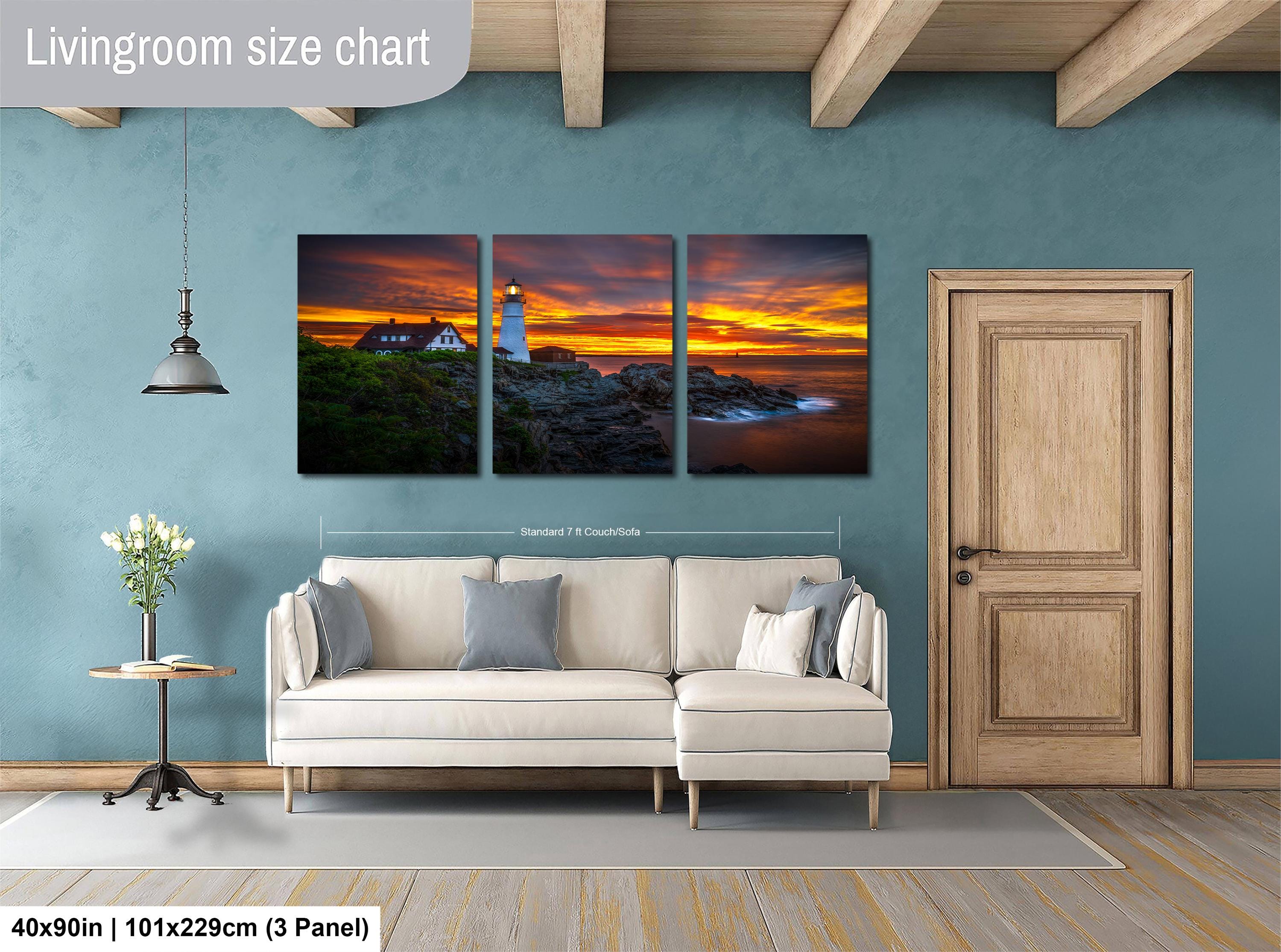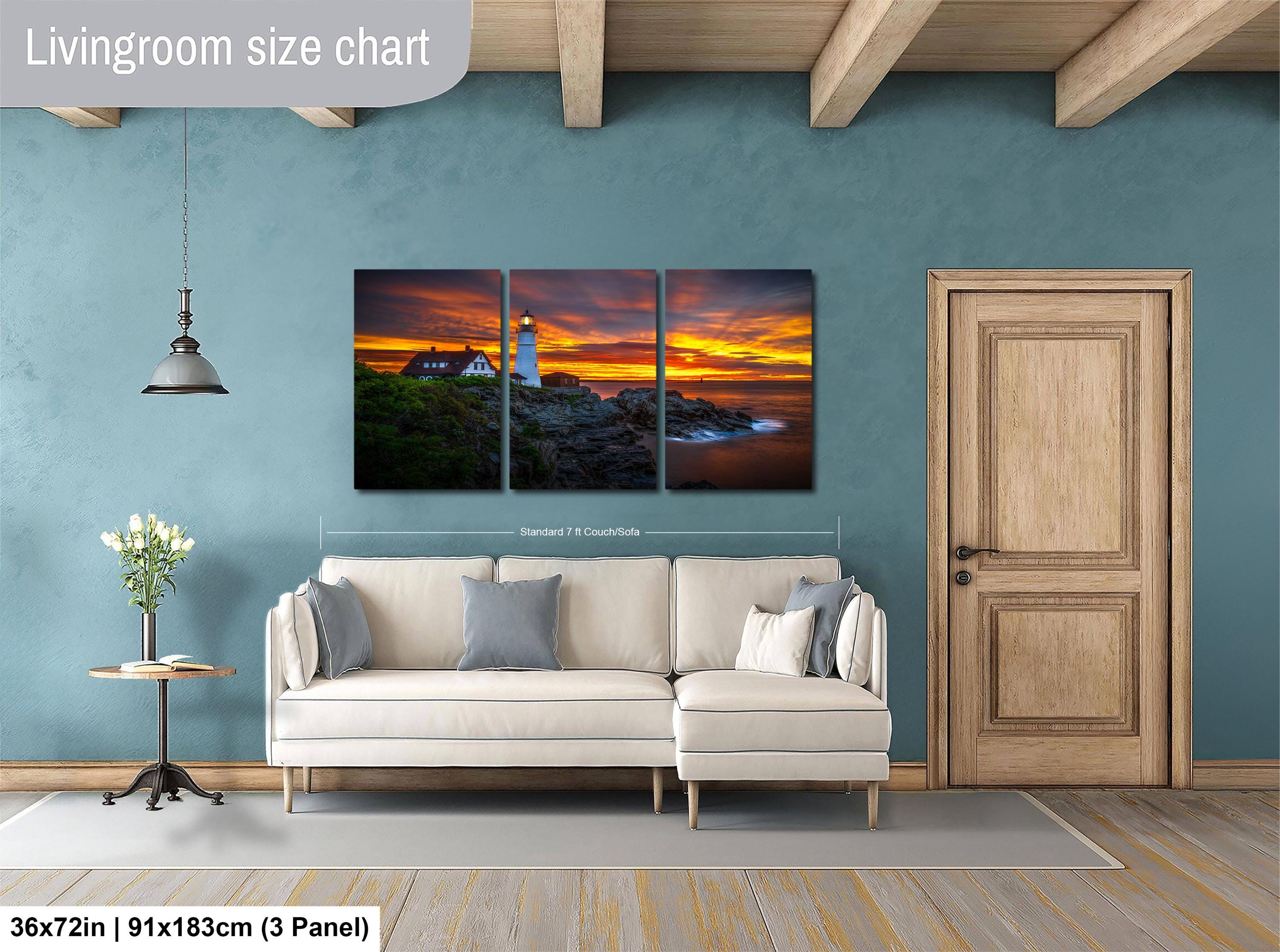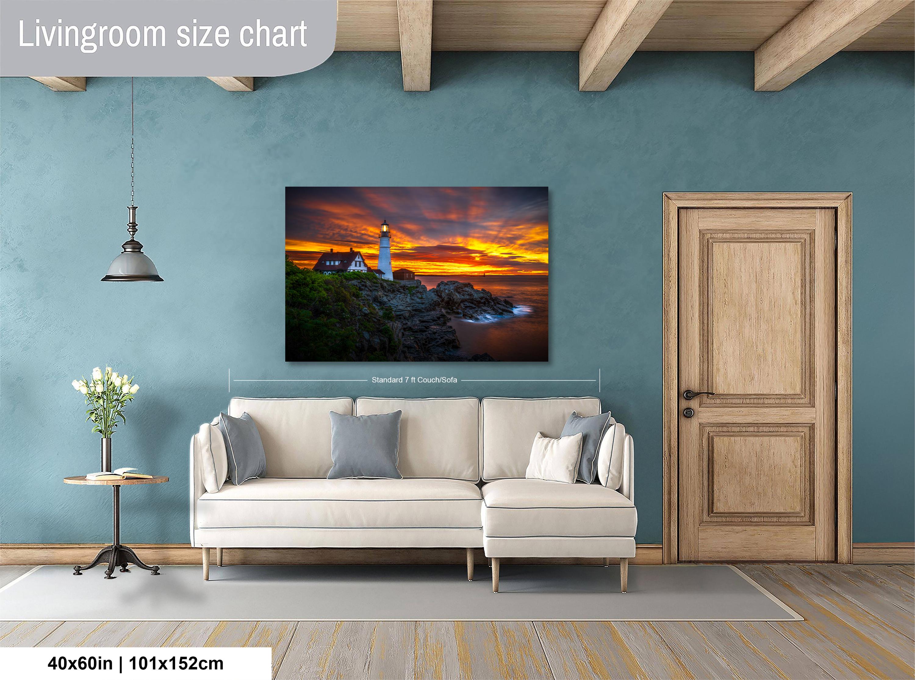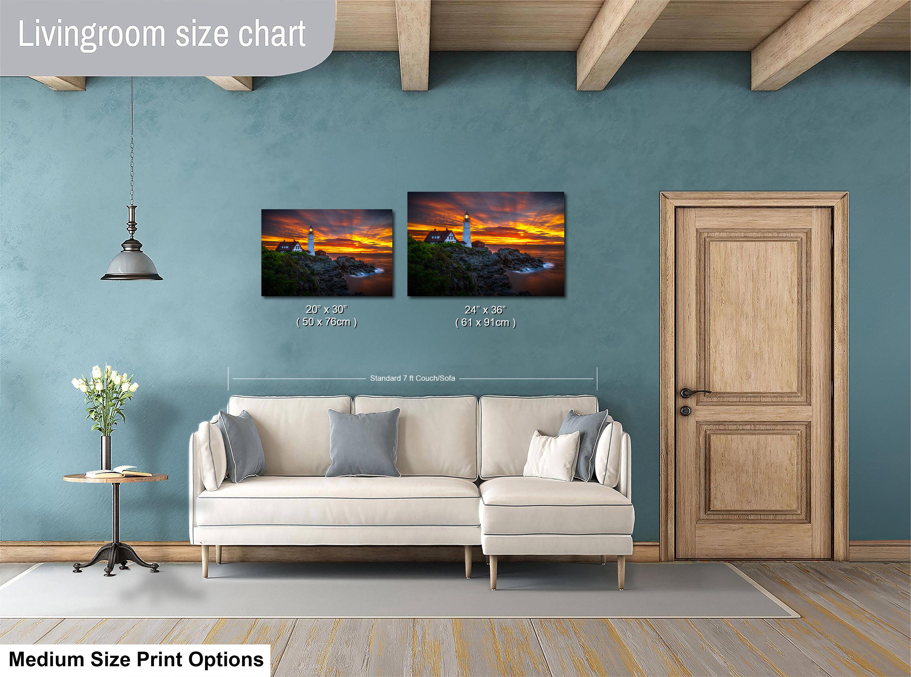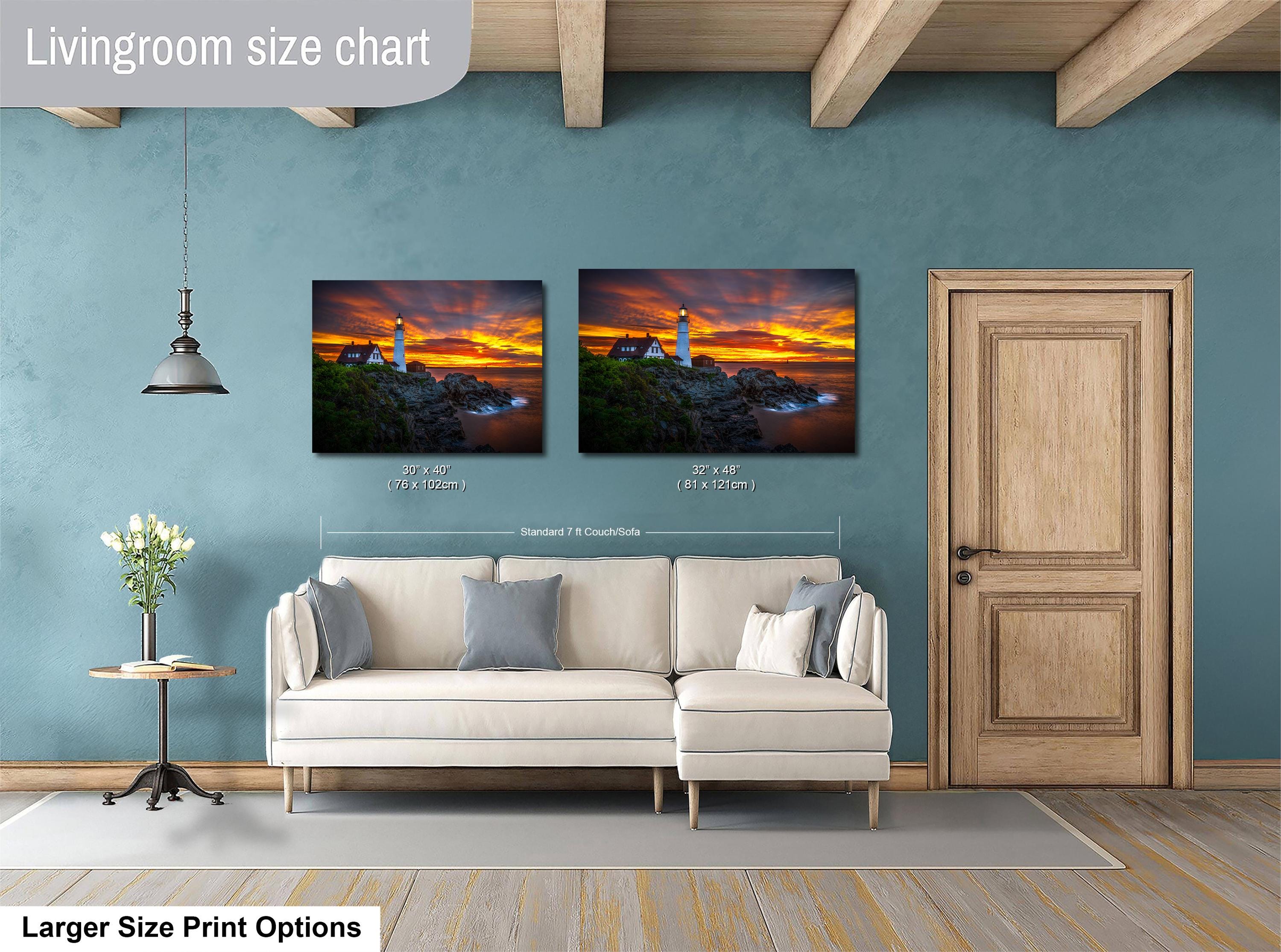 Portland Head Light lighthouse print captures the serene beauty of Maine's iconic coastal landmark at sunrise. This coastal wall art brings a peaceful seascape painting into your home, perfect for nautical decor enthusiasts seeking a timeless ocean scene.