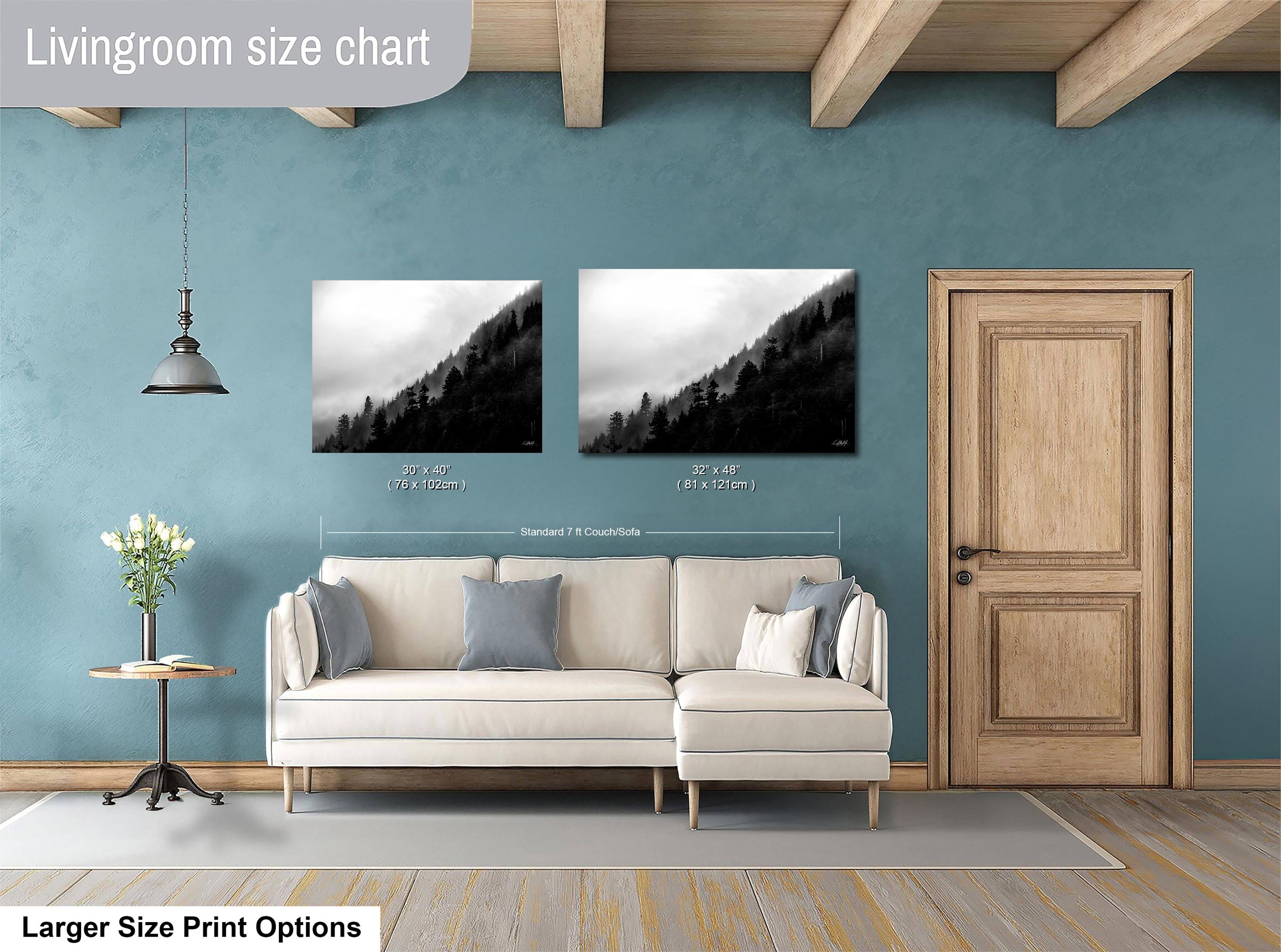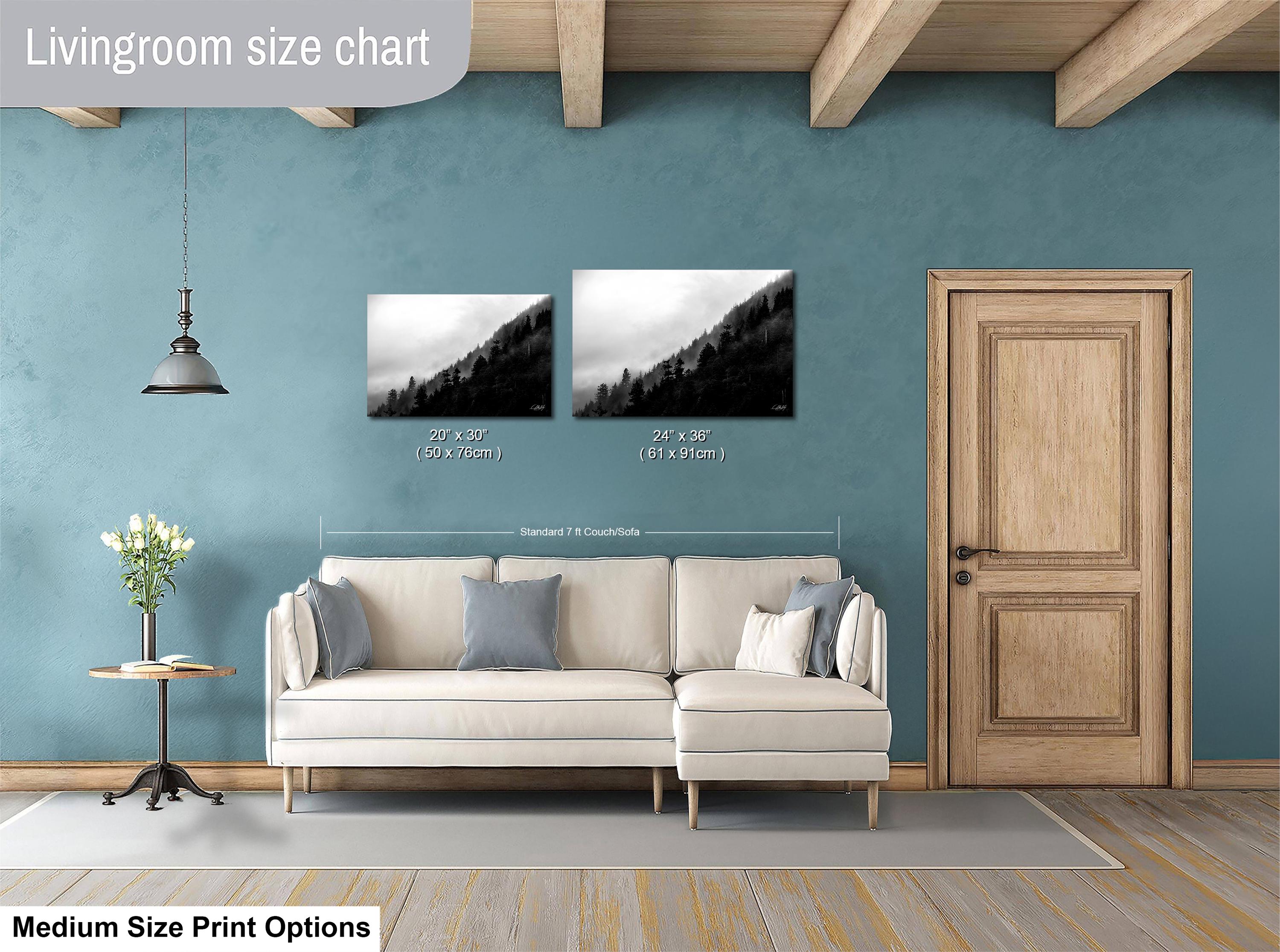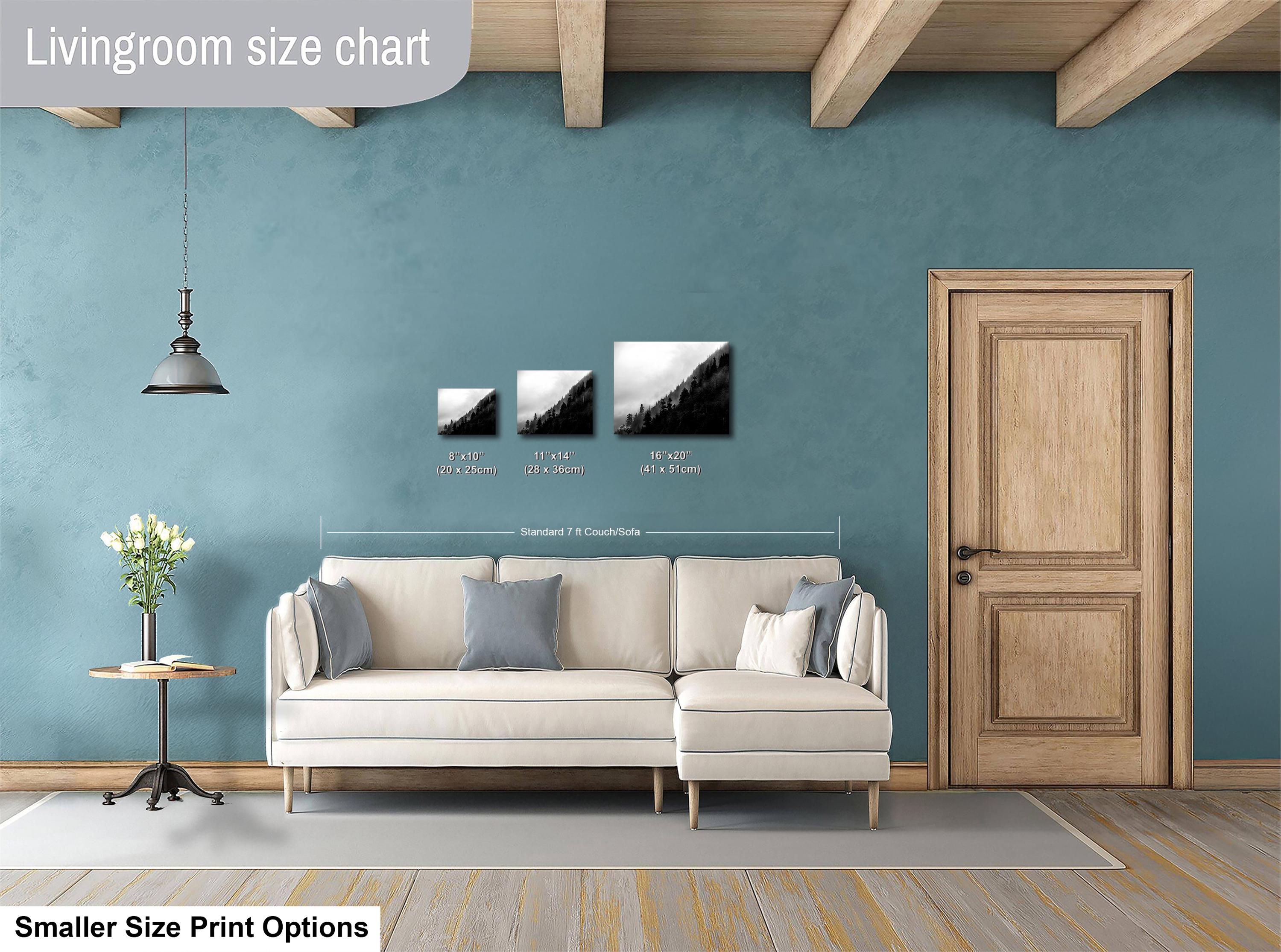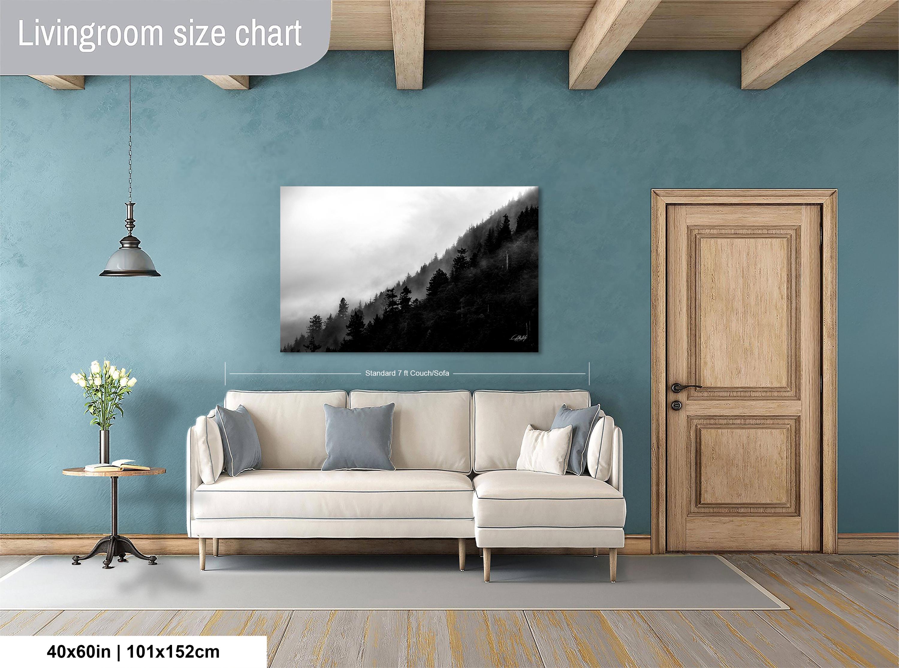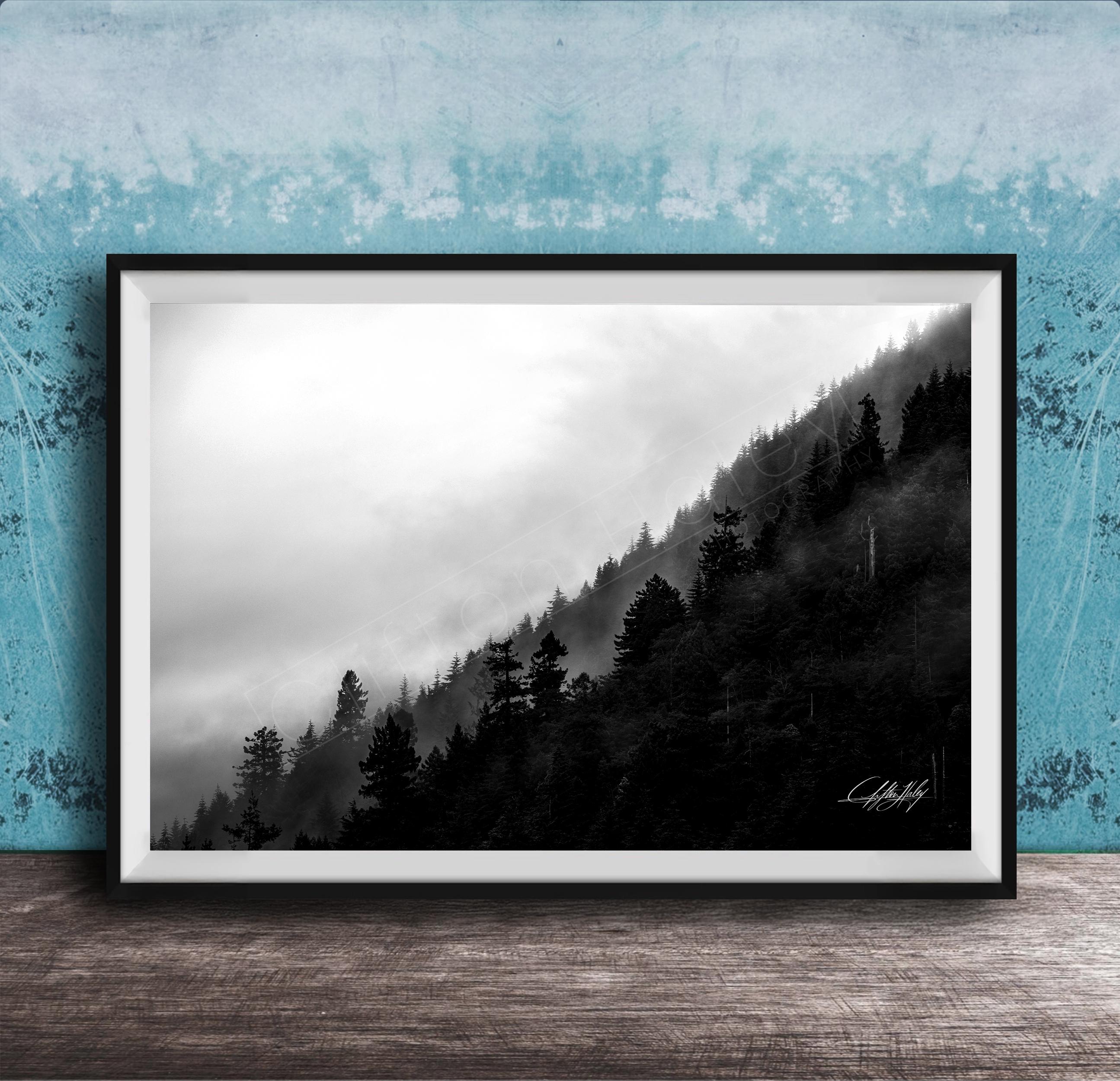 This foggy forest apartment wall art captures the calming, relaxing ambiance of a misty pine tree landscape, perfect cottagecore art for your living room or office.