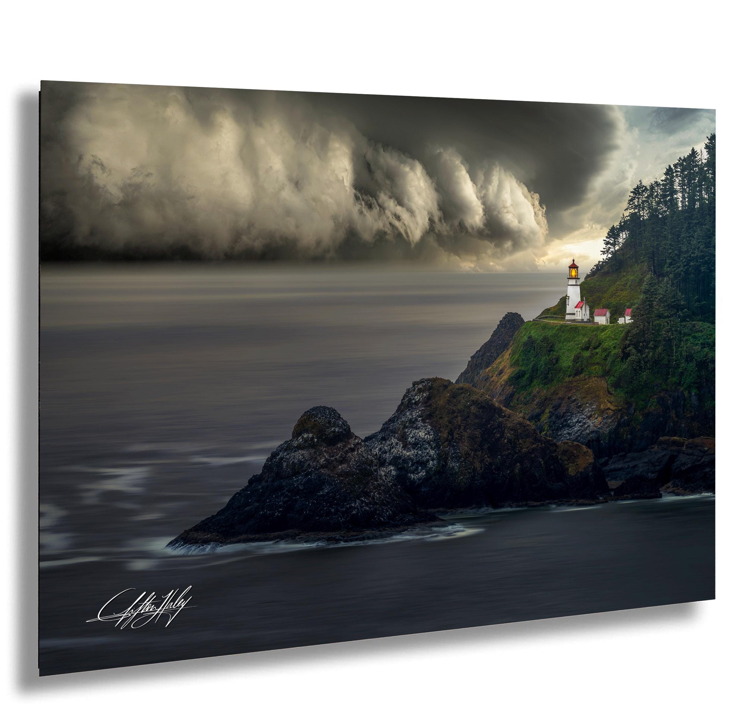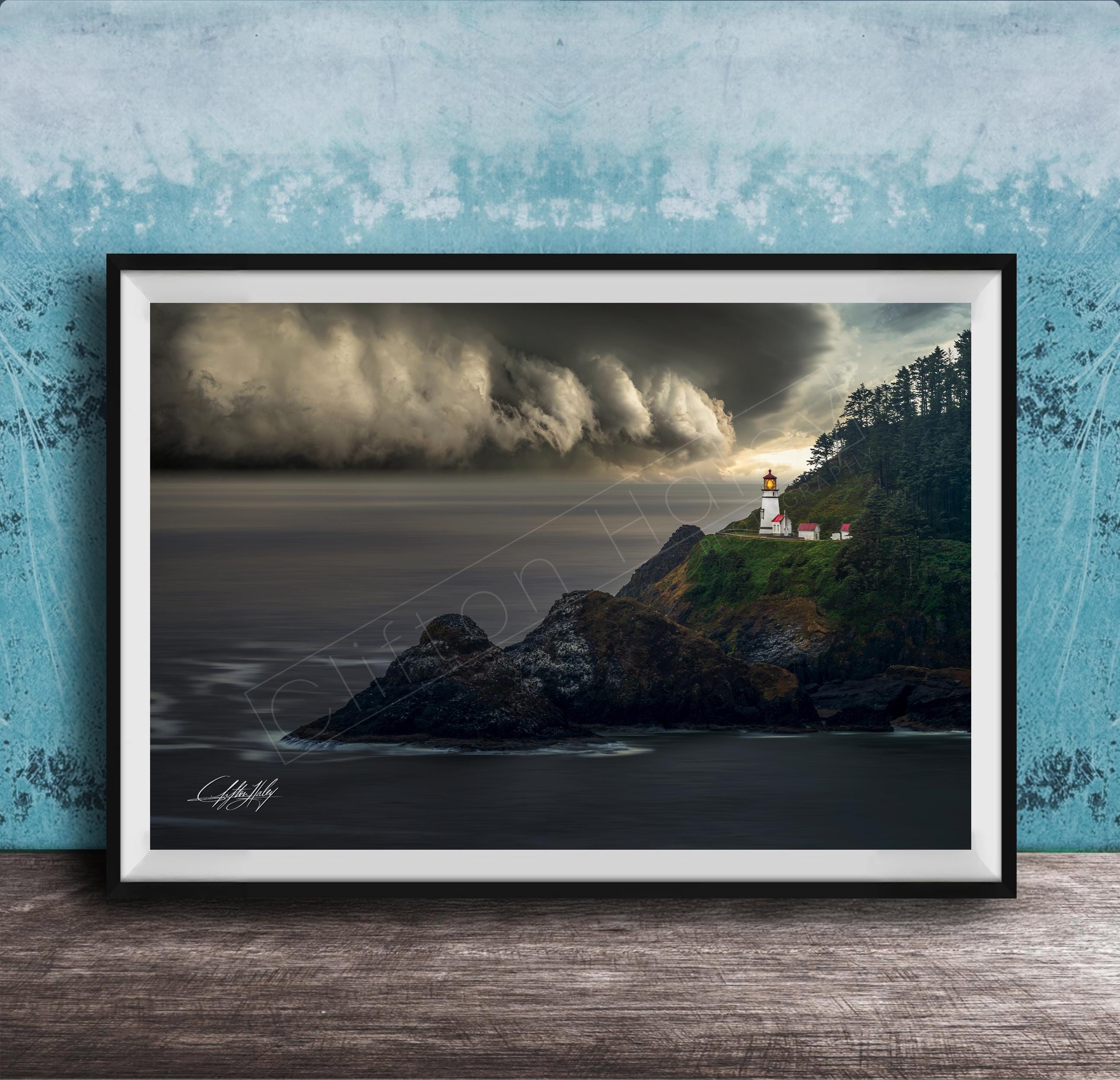 This landscape painting captures more than just an image—it tells a story of steadfast light guiding sailors through fog and storms since 1894. The dramatic ocean painting reflects the powerful natural beauty of the Pacific Northwest, making it a meaningful addition to any home or office.