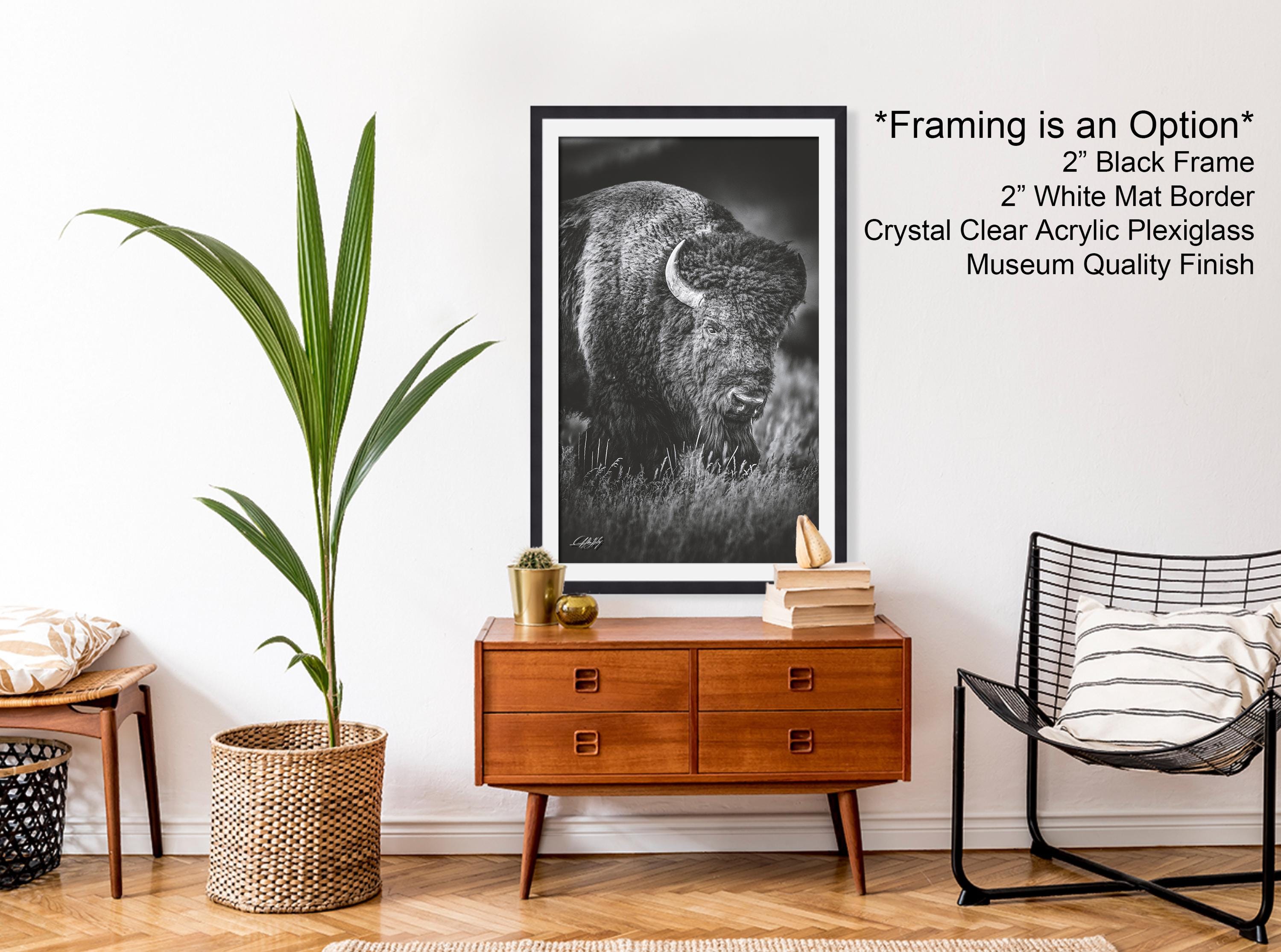 This original wildlife painting brings the spirit of the ancient plains and the grandeur of the Grand Tetons and Yellowstone right into your home or office. The striking black and white depiction highlights the bison's thick fur detail and majestic presence, making it a timeless piece for rustic cabin decor or a unique Native American gift.