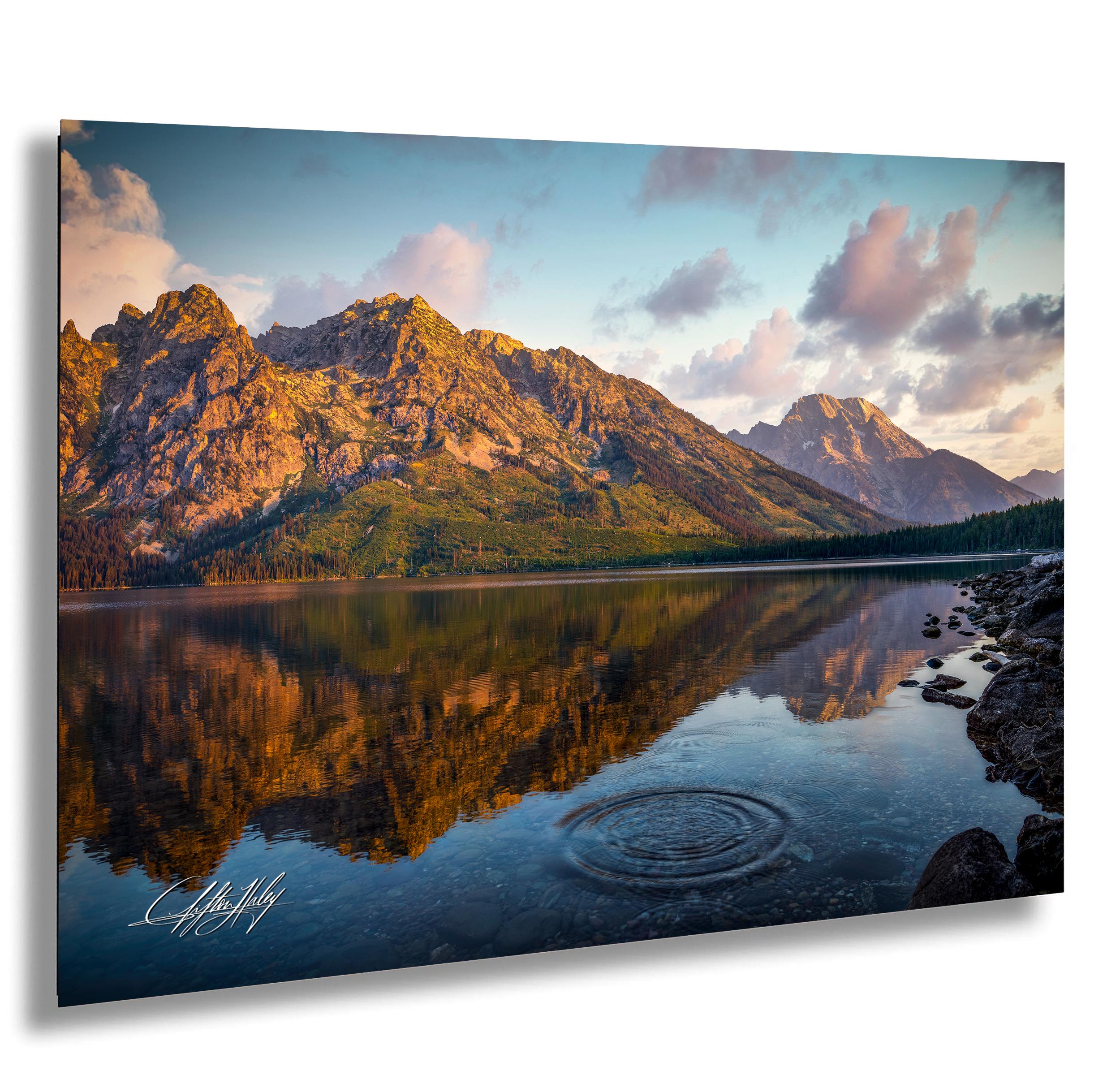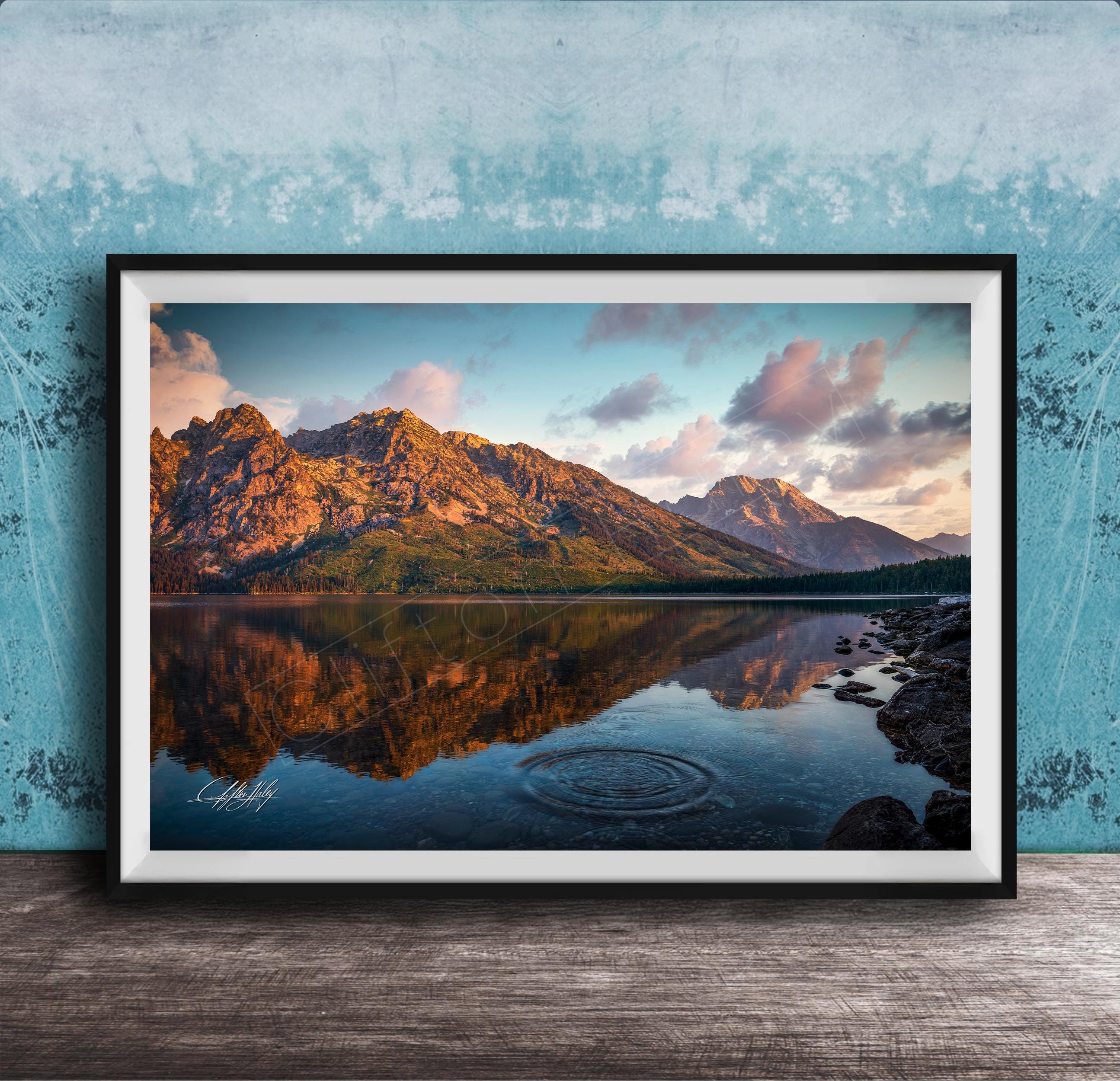As the first light of dawn began to stretch across the Grand Tetons, I found myself descending the rugged mountainside, carefully navigating the uneven terrain to reach the stone-covered beach of Jenny Lake. The chill of the morning air bit at my skin, but the promise of capturing the perfect shot kept me focused. The sky was a tapestry of soft pinks and golds, mirrored in the crystal-clear waters below, where the mighty Tetons stood reflected like guardians of the earth.