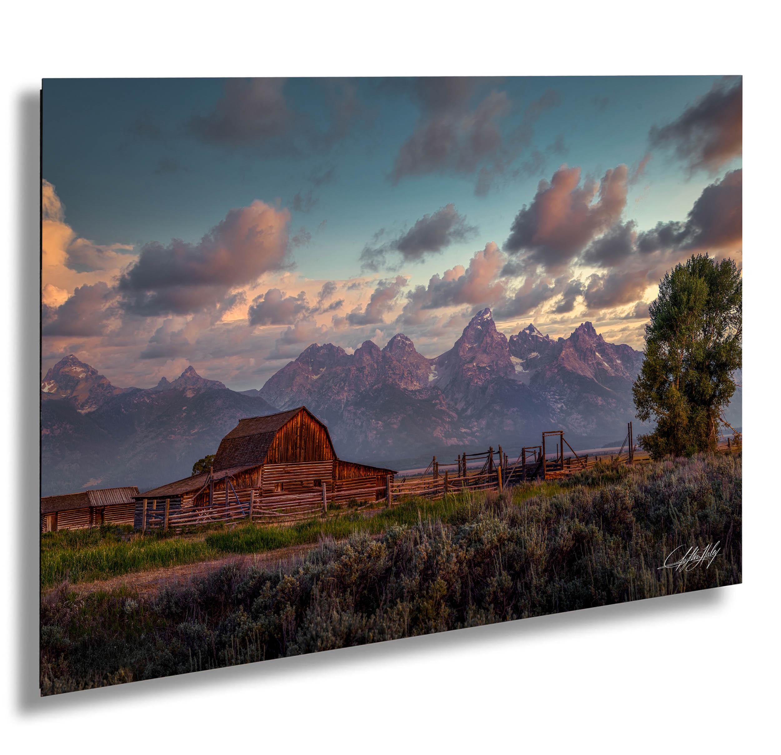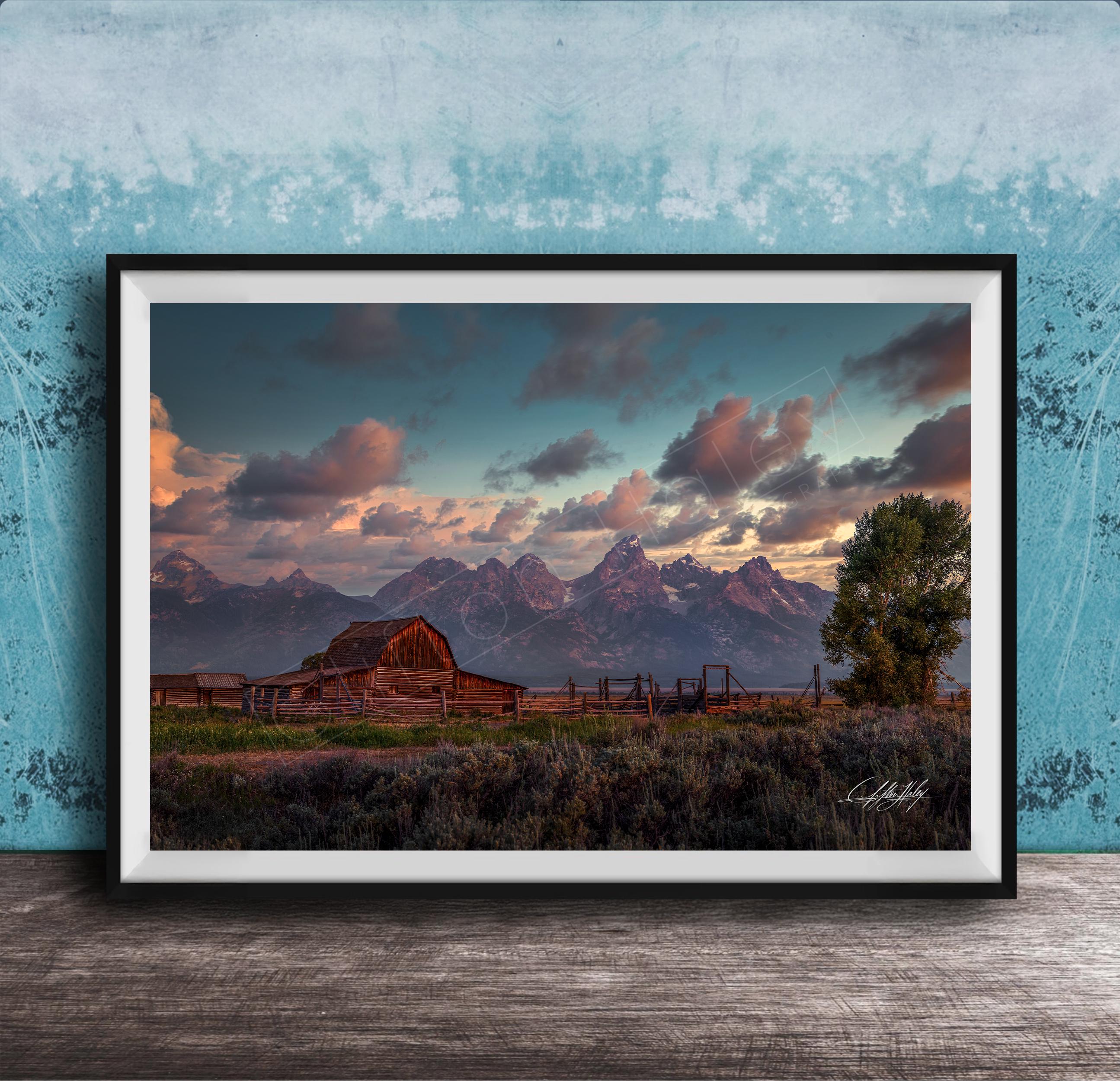 The air was crisp, carrying the scent of dew-soaked grass and the faint, earthy aroma of the surrounding sagebrush. The Tetons, still shadowed by night, began to emerge in the soft pre-dawn light, their jagged peaks cutting through the fading darkness. The barn, with its rustic wooden planks and weathered roof, stood as a witness to the endurance of those who had settled in this harsh, yet breathtaking landscape.
