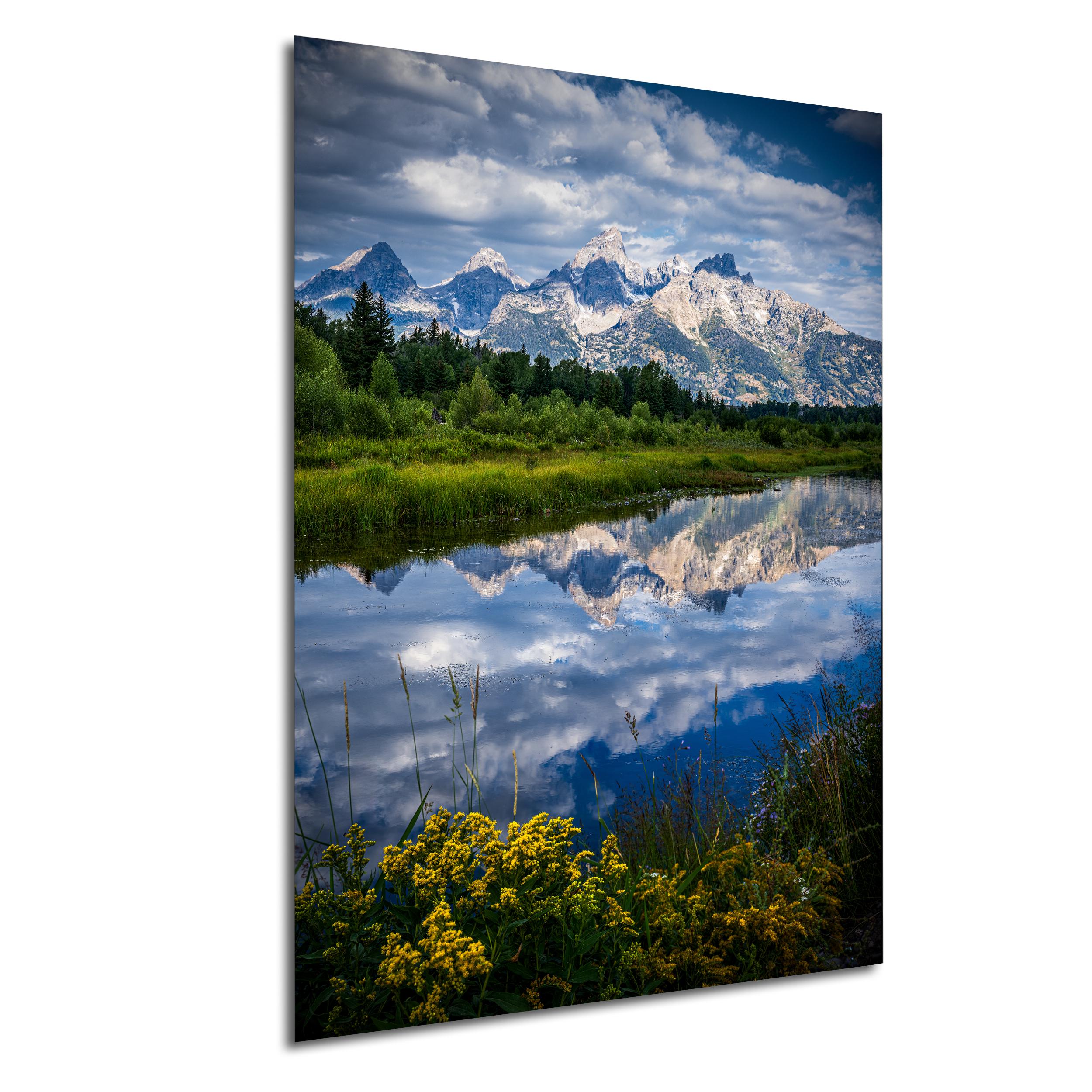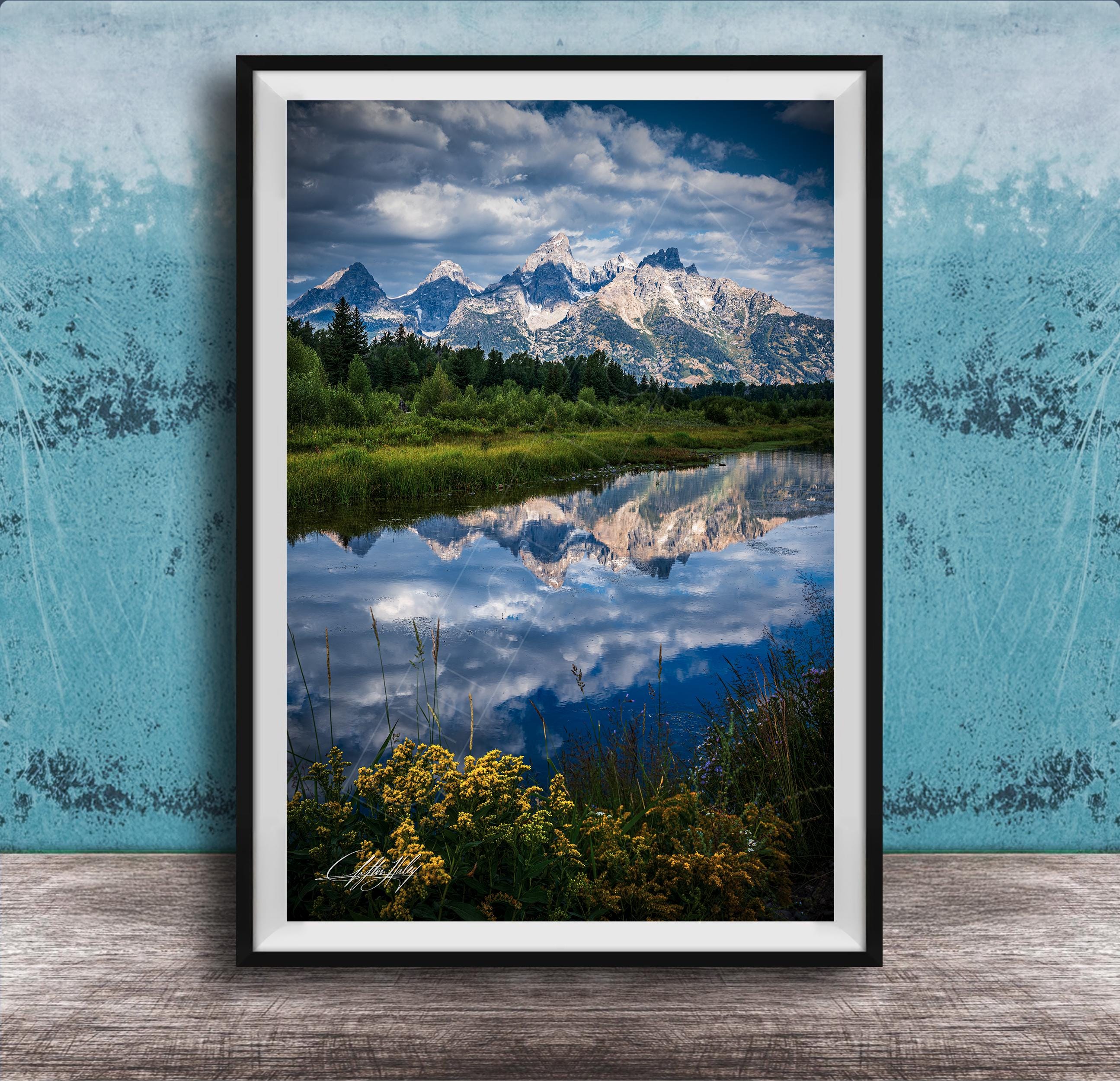 The morning’s golden hour at Schwabacher Landing was like stepping into a masterpiece painted by the hand of God. The stillness of the water created a perfect mirror, reflecting the Grand Tetons with a clarity that was almost surreal. The mountains, majestic and towering, seemed to float upon the water, their jagged peaks softened by the early morning light. Yellow wildflowers framed the scene, adding a touch of warmth to the cool blues and greens.