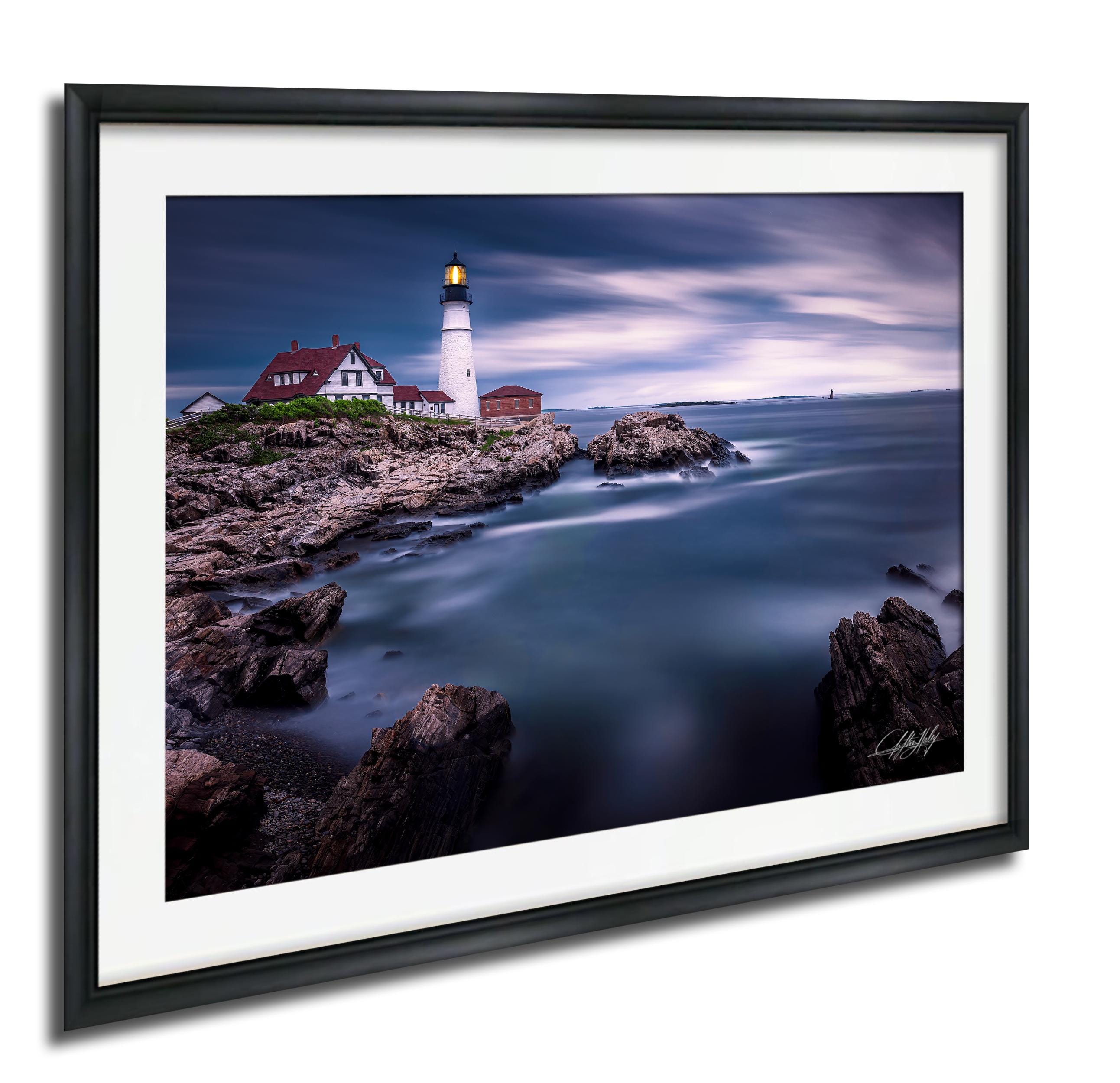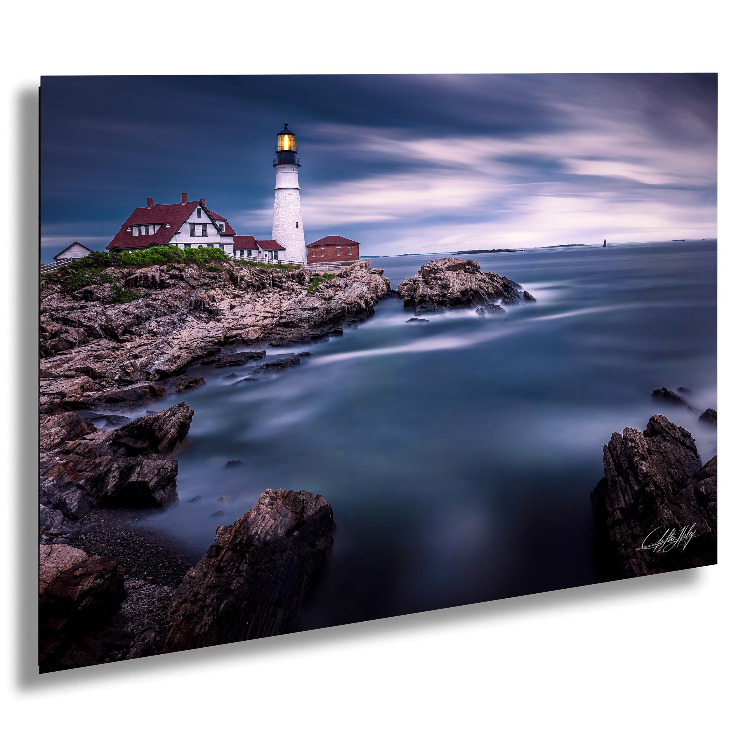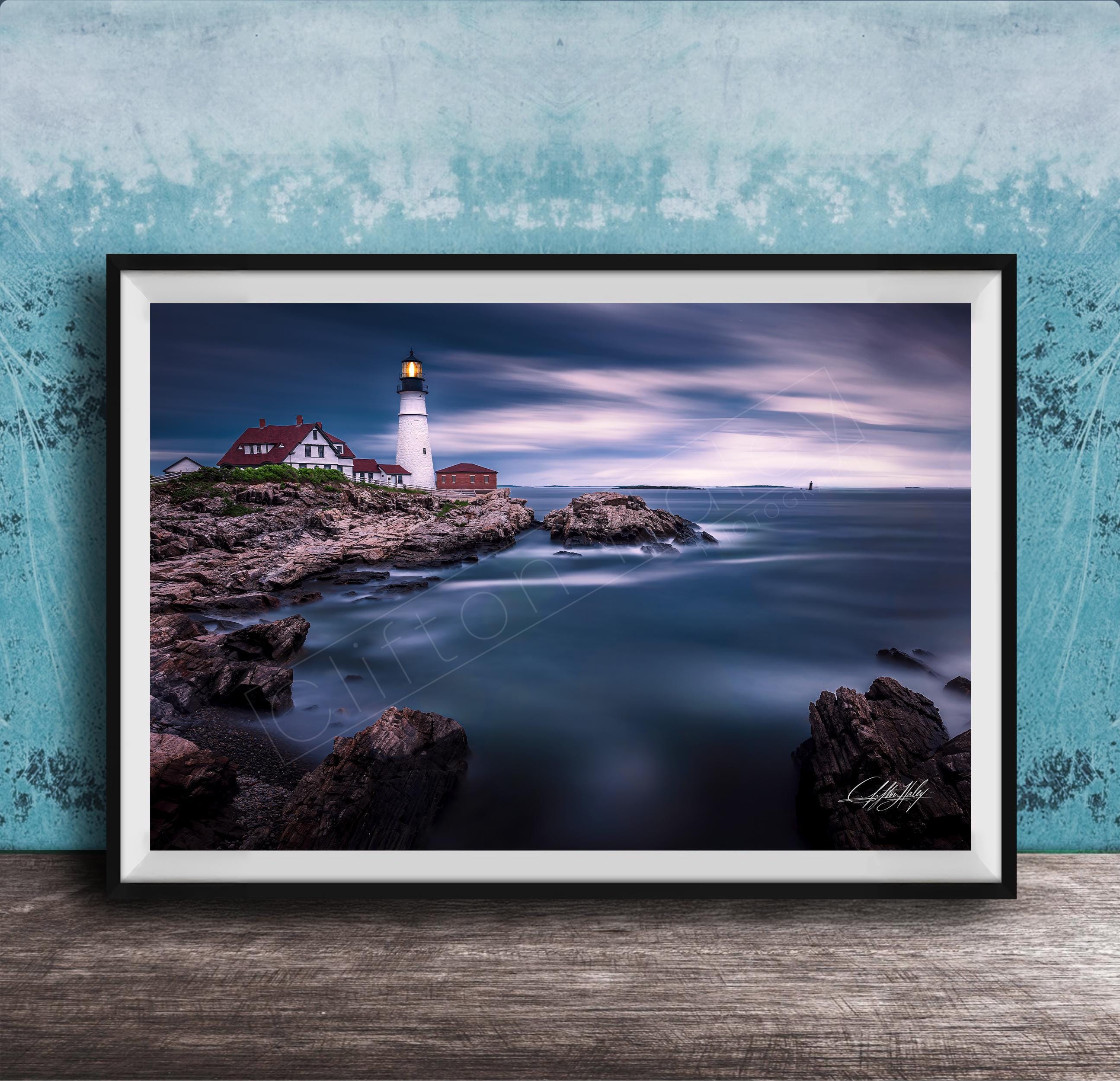 Experience the serene beauty of the Portland Head Light, a historic lighthouse commissioned by George Washington, immortalized in this fine art print. The artwork showcases the blue hour’s ethereal glow over crashing waves and rocky shores, blending landscape painting with nautical painting elements for a truly captivating scene.