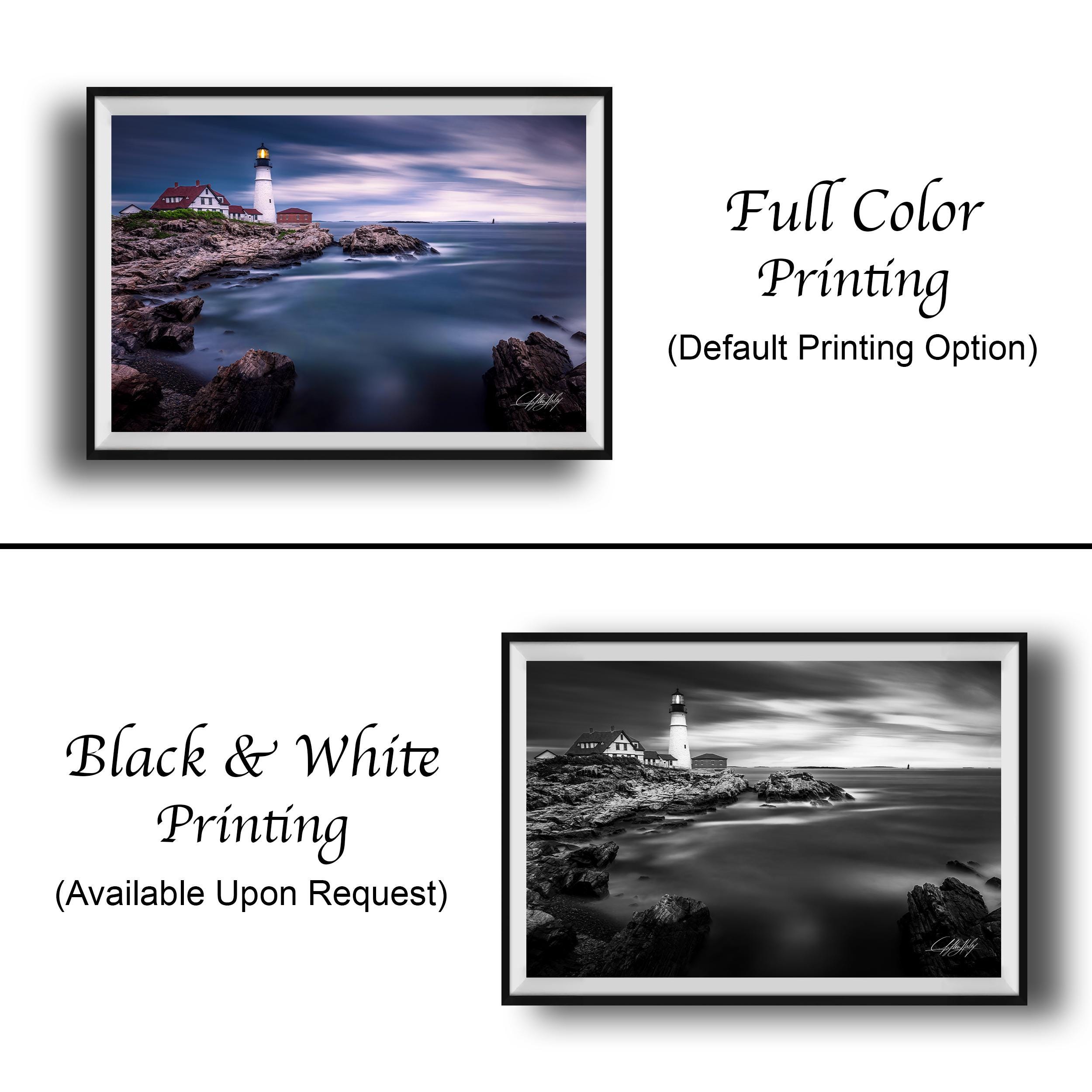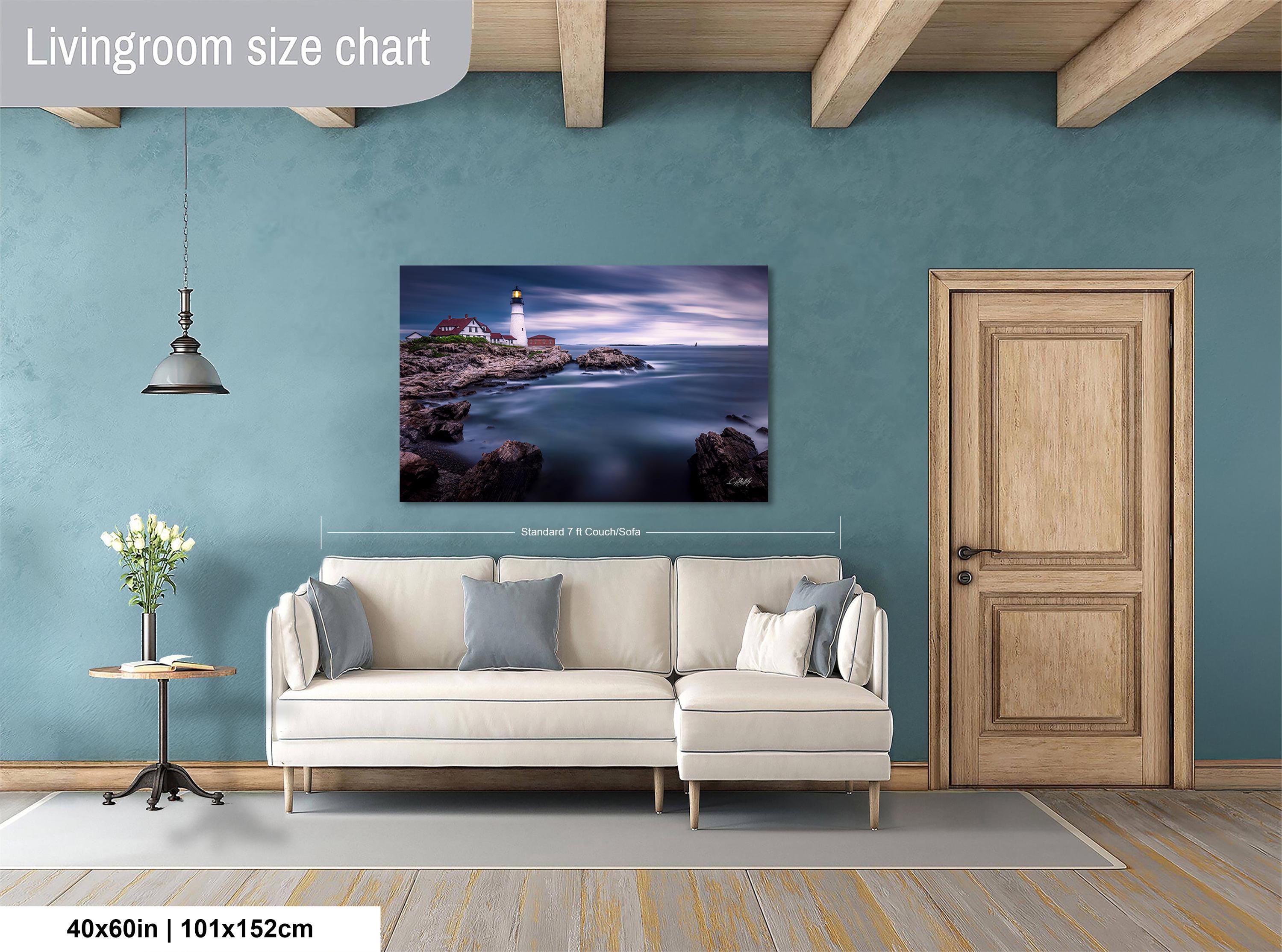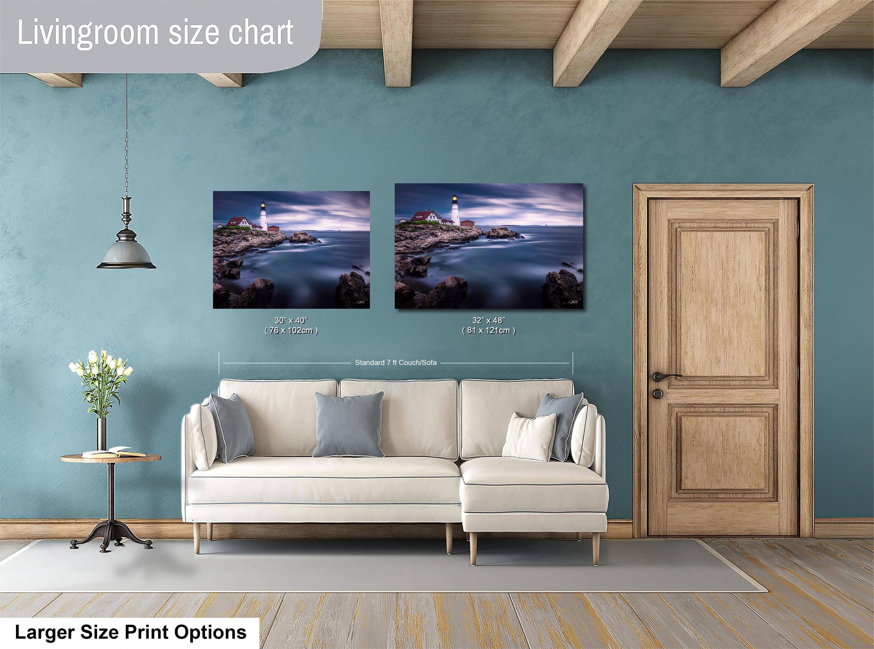 Experience the serene beauty of the Portland Head Light, a historic lighthouse commissioned by George Washington, immortalized in this fine art print. The artwork showcases the blue hour’s ethereal glow over crashing waves and rocky shores, blending landscape painting with nautical painting elements for a truly captivating scene.
