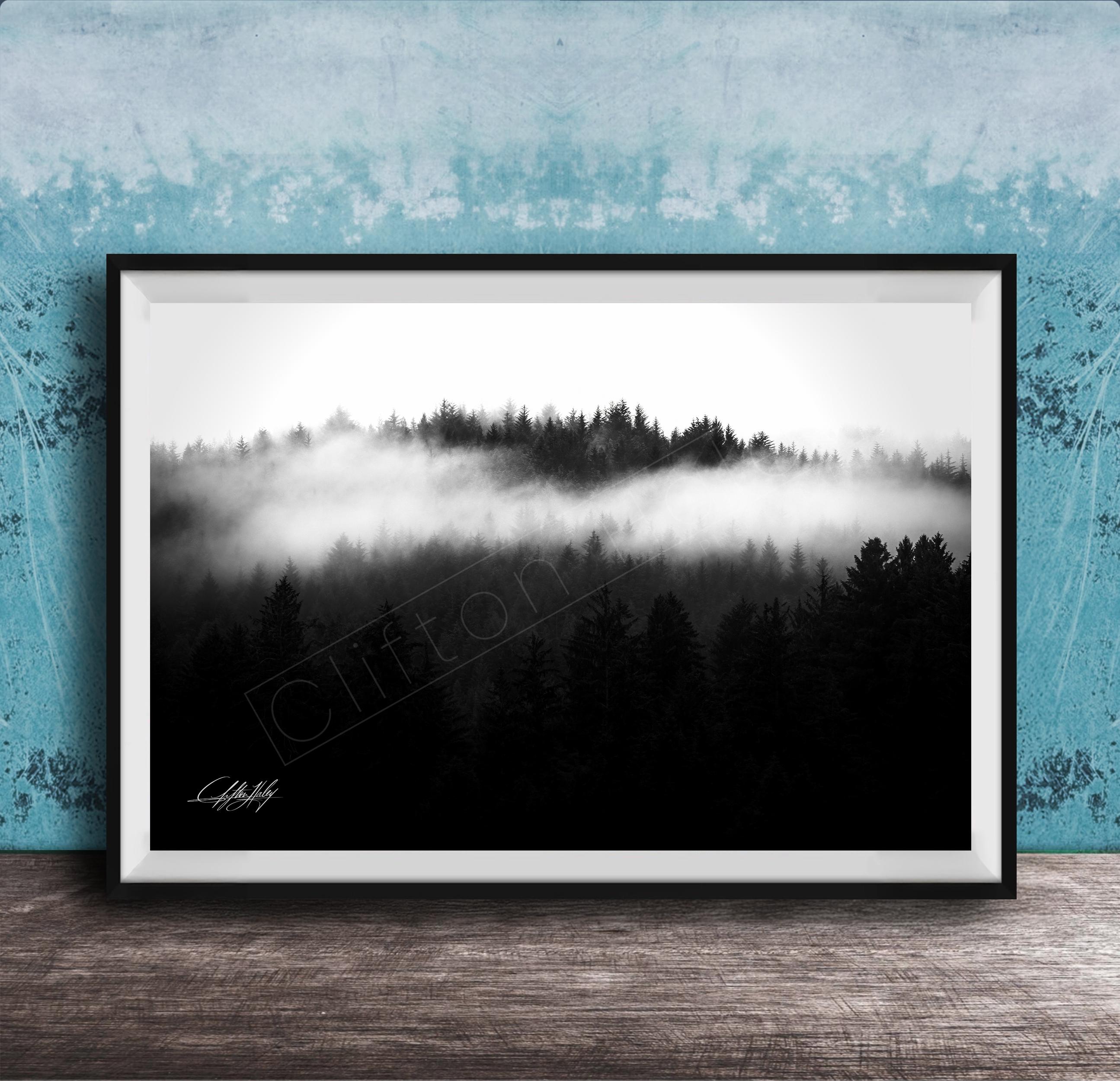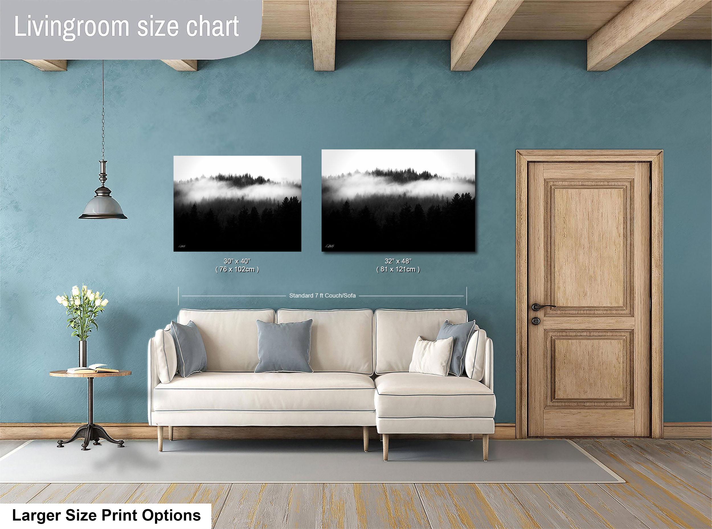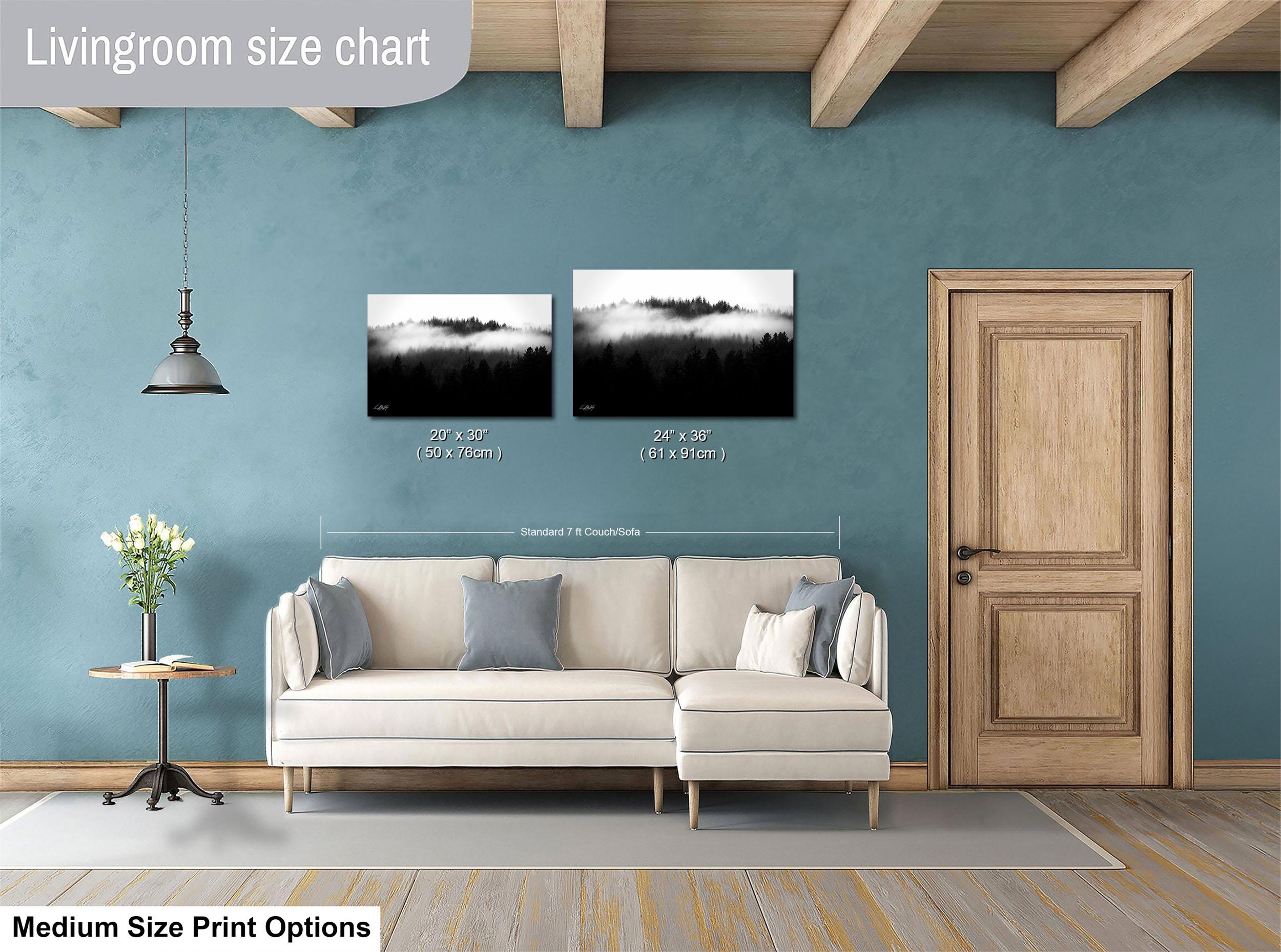Bring nature's peacefulness indoors with this misty morning fog art, ideal for lovers of pine trees forest scenes and cottagecore aesthetics.