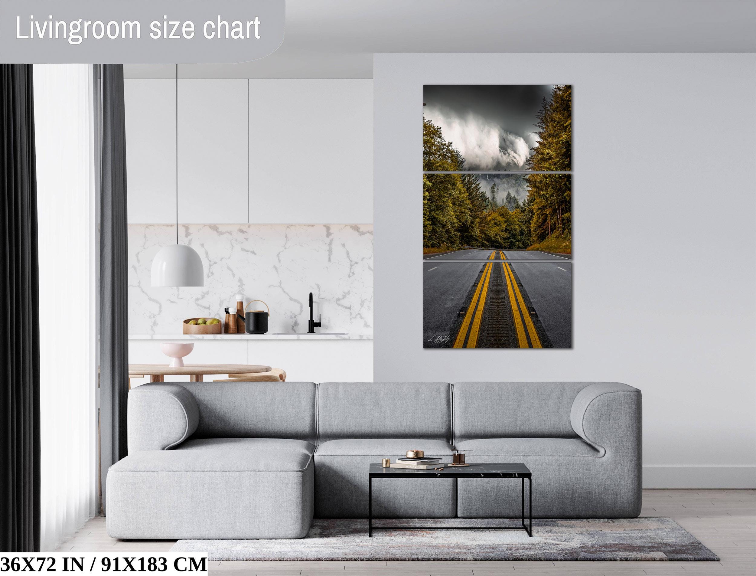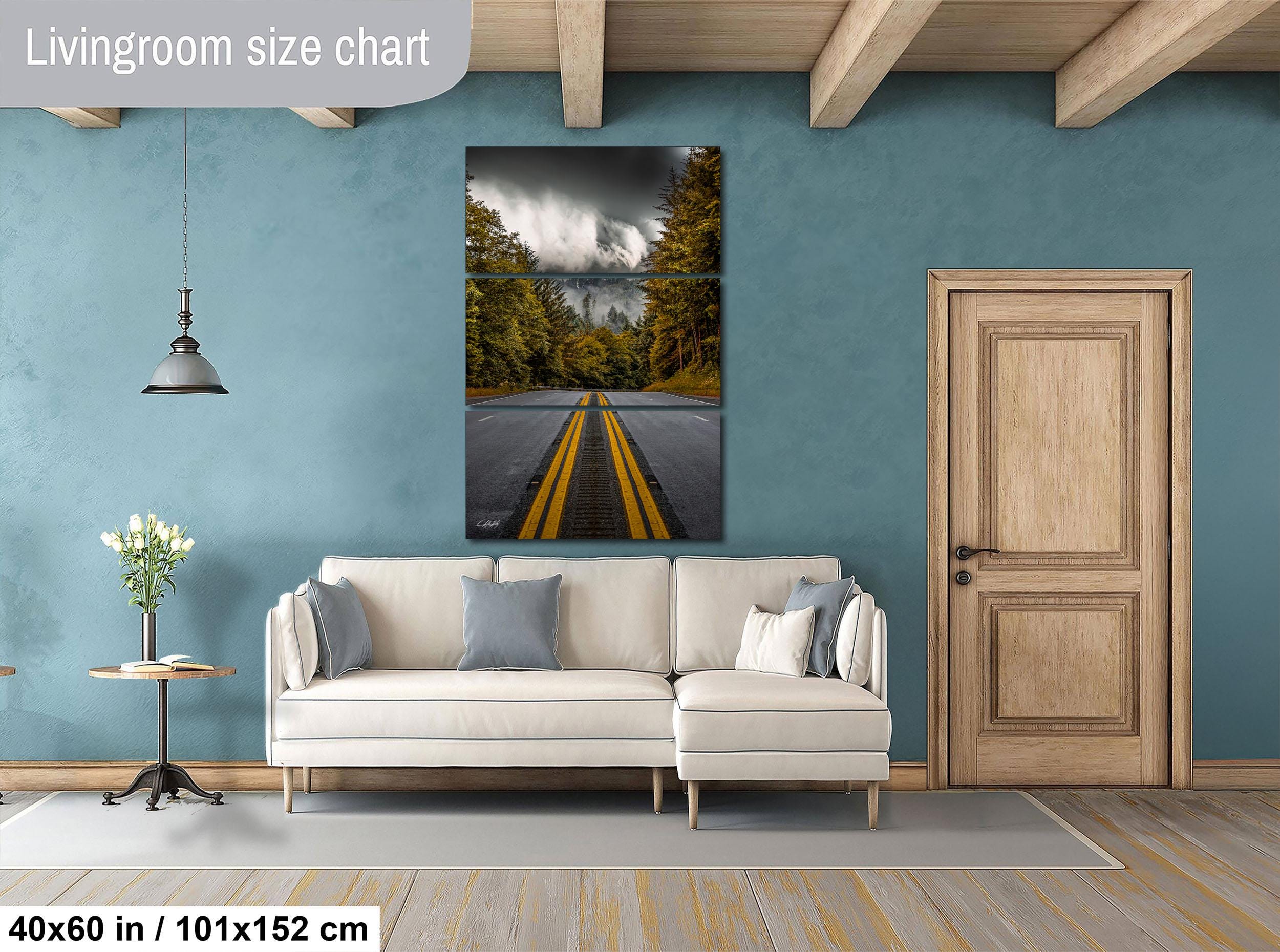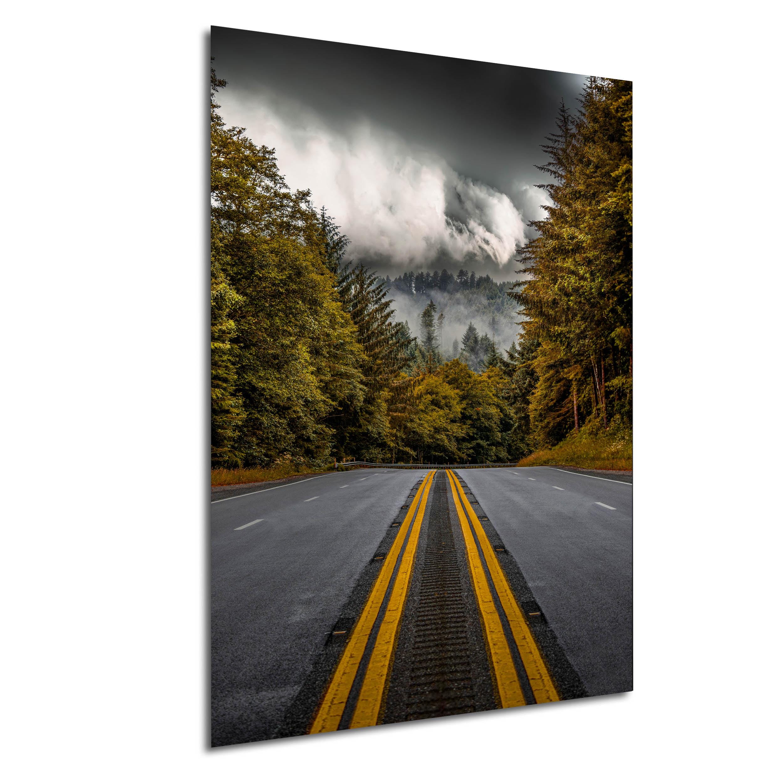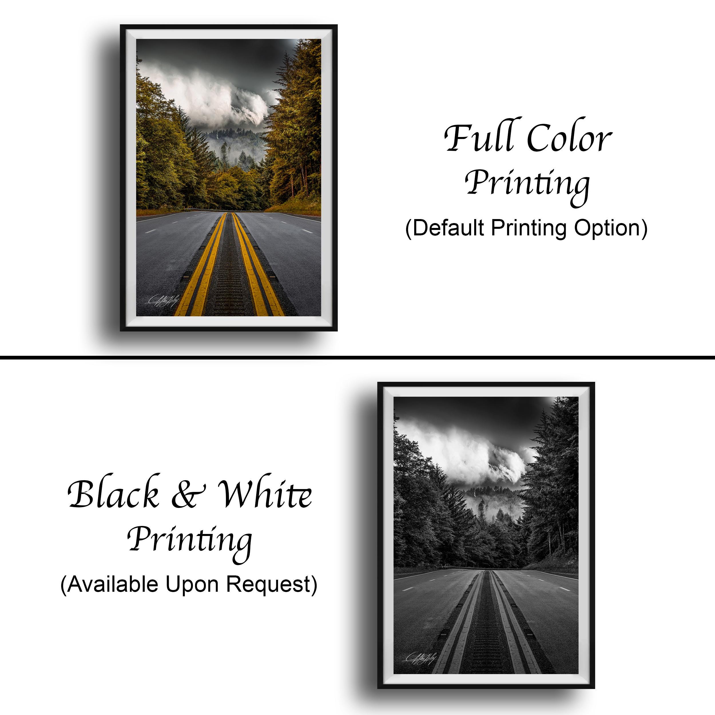 The road before me, wet from the morning dew, stretched out into the fog, leading the eye towards the mysterious mountains in the distance. The yellow lines stood out starkly against the gray pavement, guiding the viewer through the scene. It was a composition of contrasts—the man-made road juxtaposed with the wild, untamed beauty of the forest.