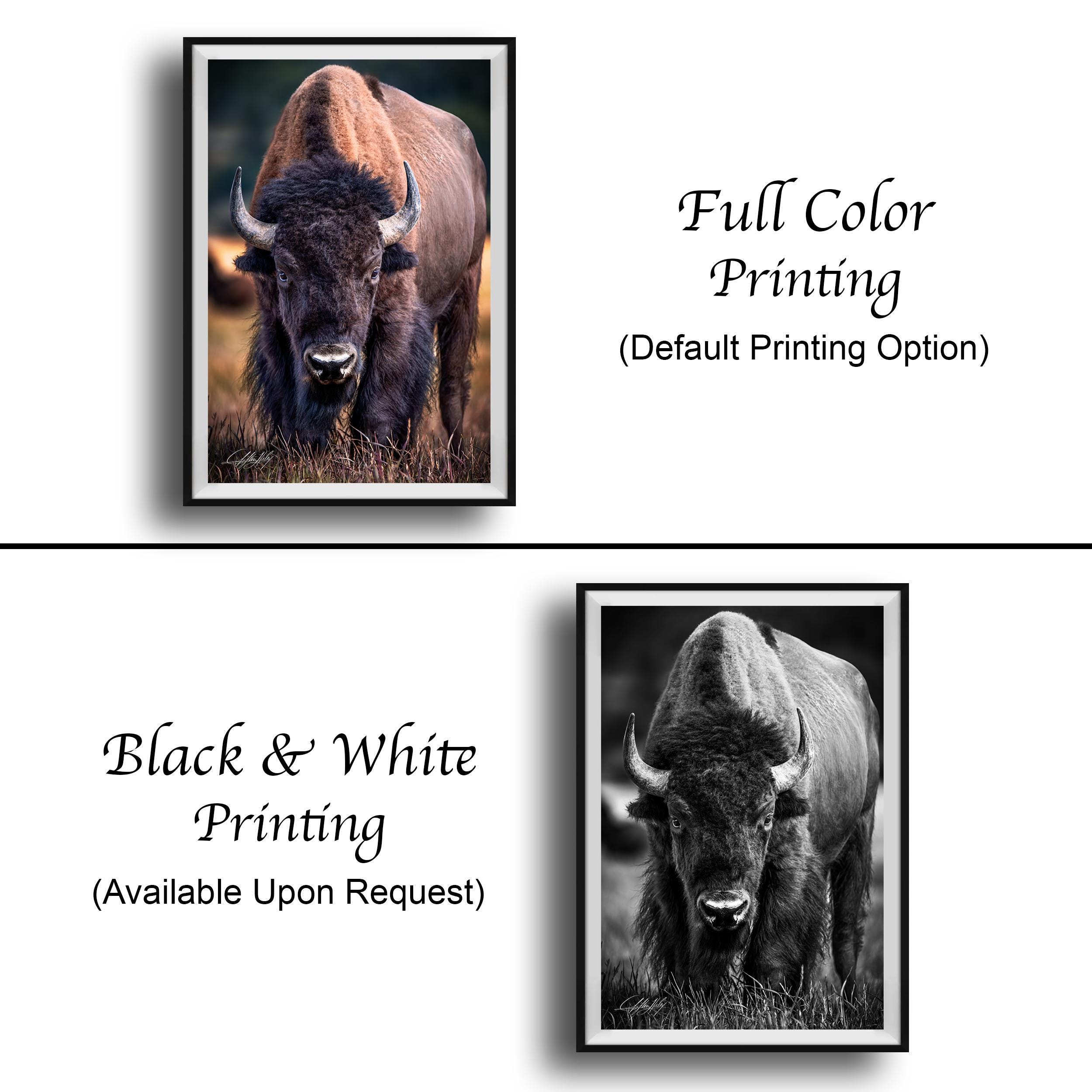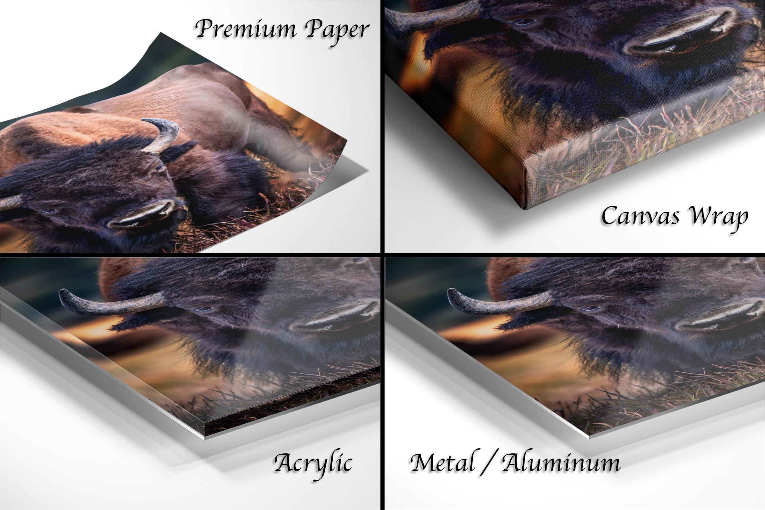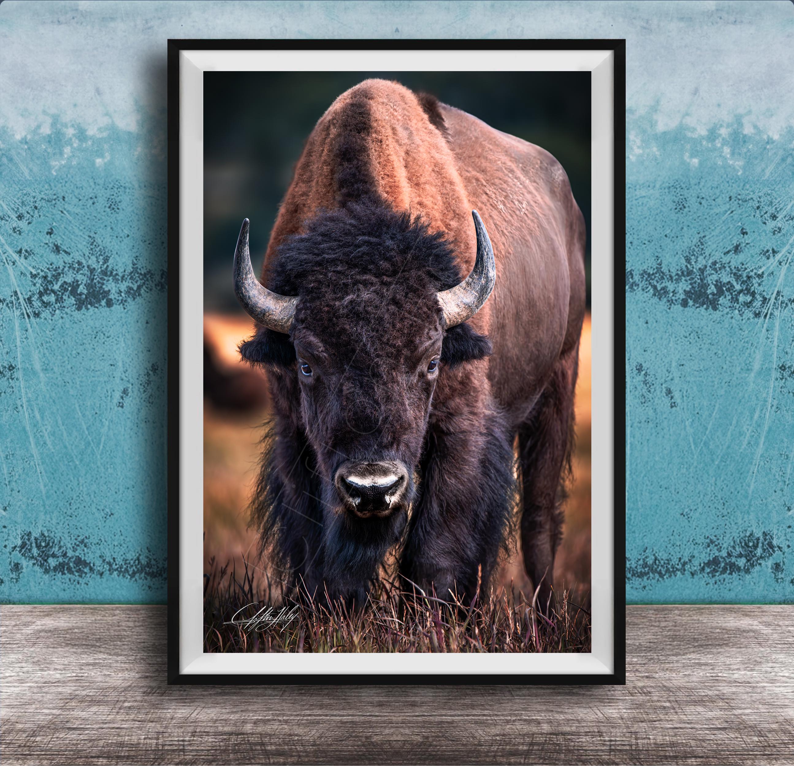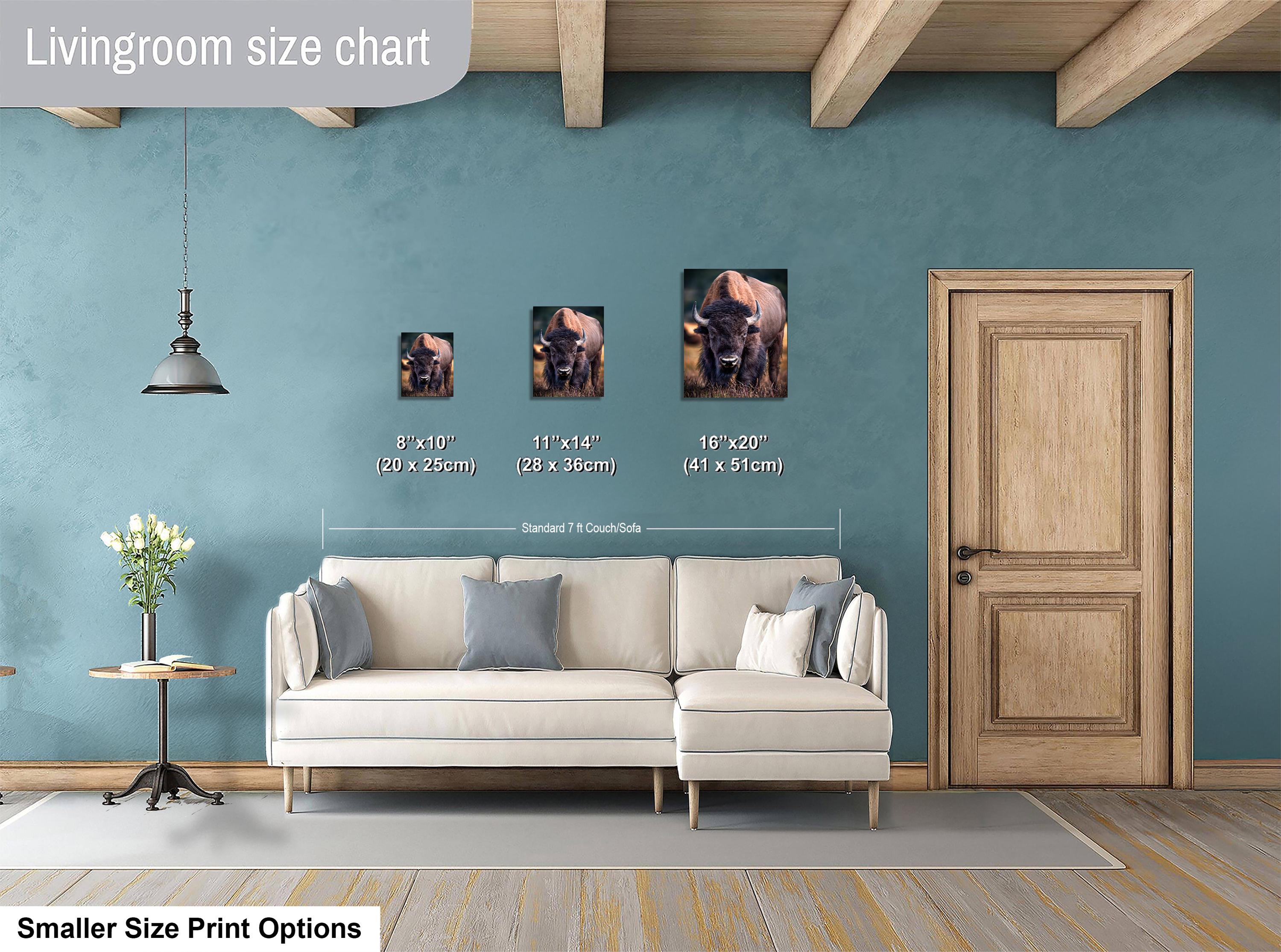 • Made-to-order large canvas print, flush mounted to the frame for a sleek, modern look without a mat border • Artist's signature authenticates each unique piece, ensuring an original wildlife art experience • Dimensions designed to make a bold statement in your home office or living room • A meaningful Native American gift or nature lover gift celebrating the enduring spirit of the bison herd • Earth tone canvas enhances the natural textures and colors, perfect for outdoor inspired art enthusiasts