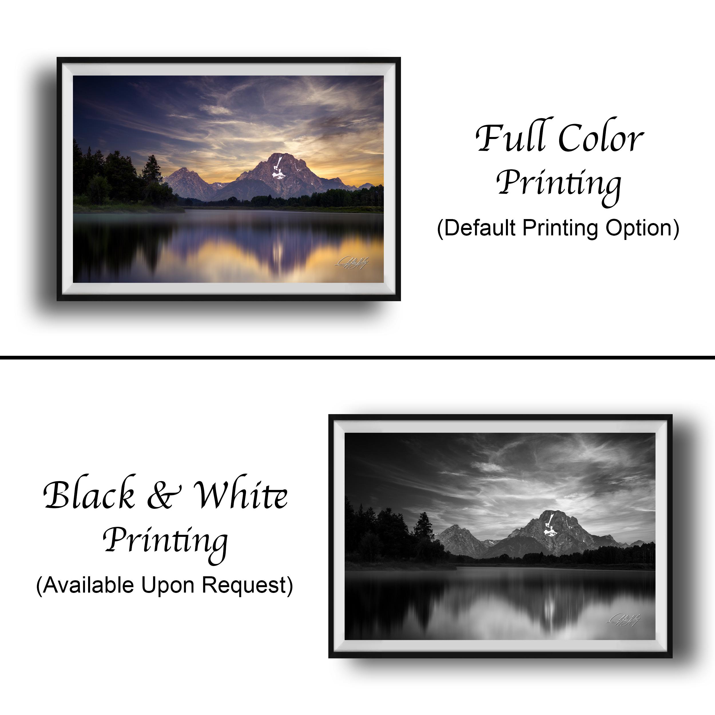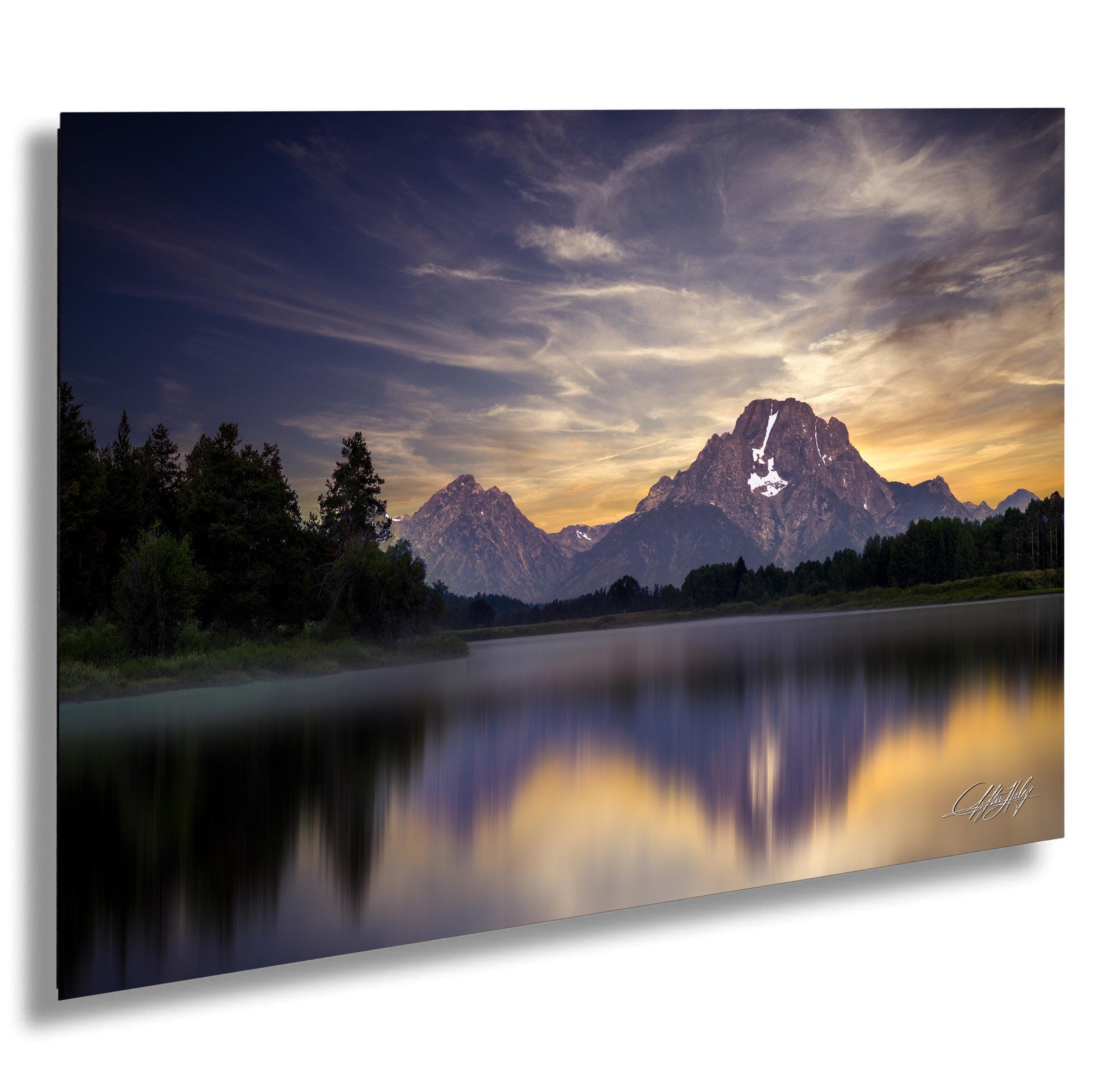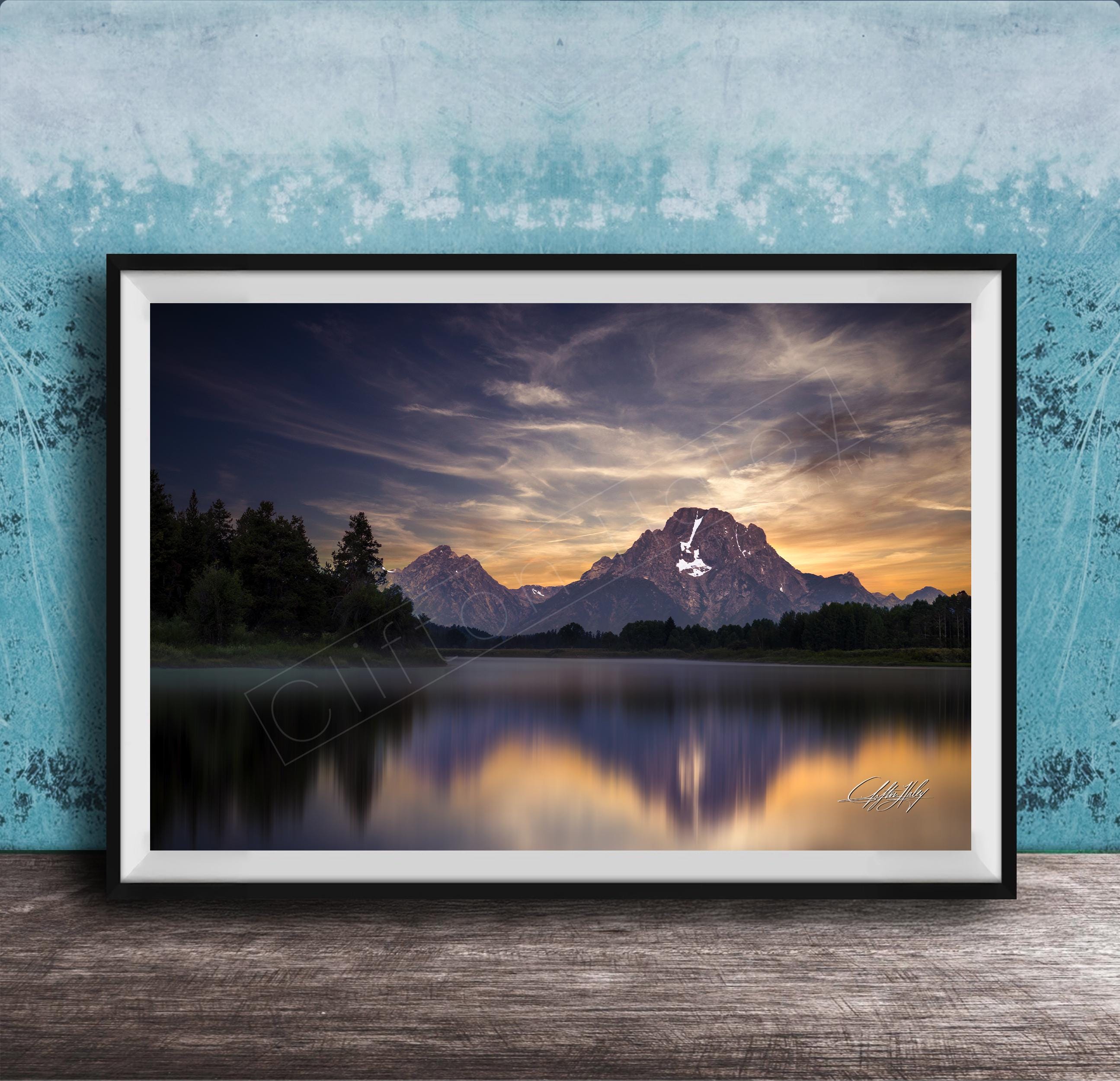 There’s a quiet magic that unfolds at sunrise along Oxbow Bend, where the golden hour paints the Grand Teton Park in soft, glowing hues. This fine art print captures that serene moment when the Snake River reflects the towering mountains, creating a breathtaking mirror of nature’s splendor. Inspired by the crisp morning air and the pine forest scent that fills the scene, this artwork invites you to bring a piece of that tranquil wilderness into your space.