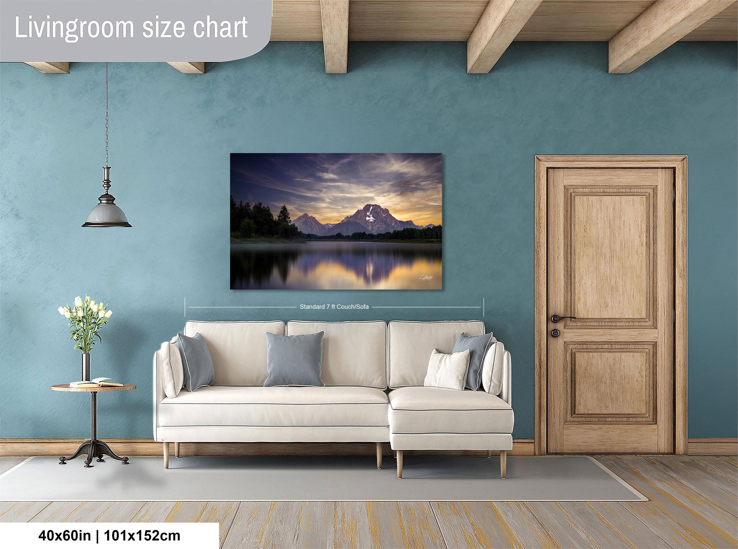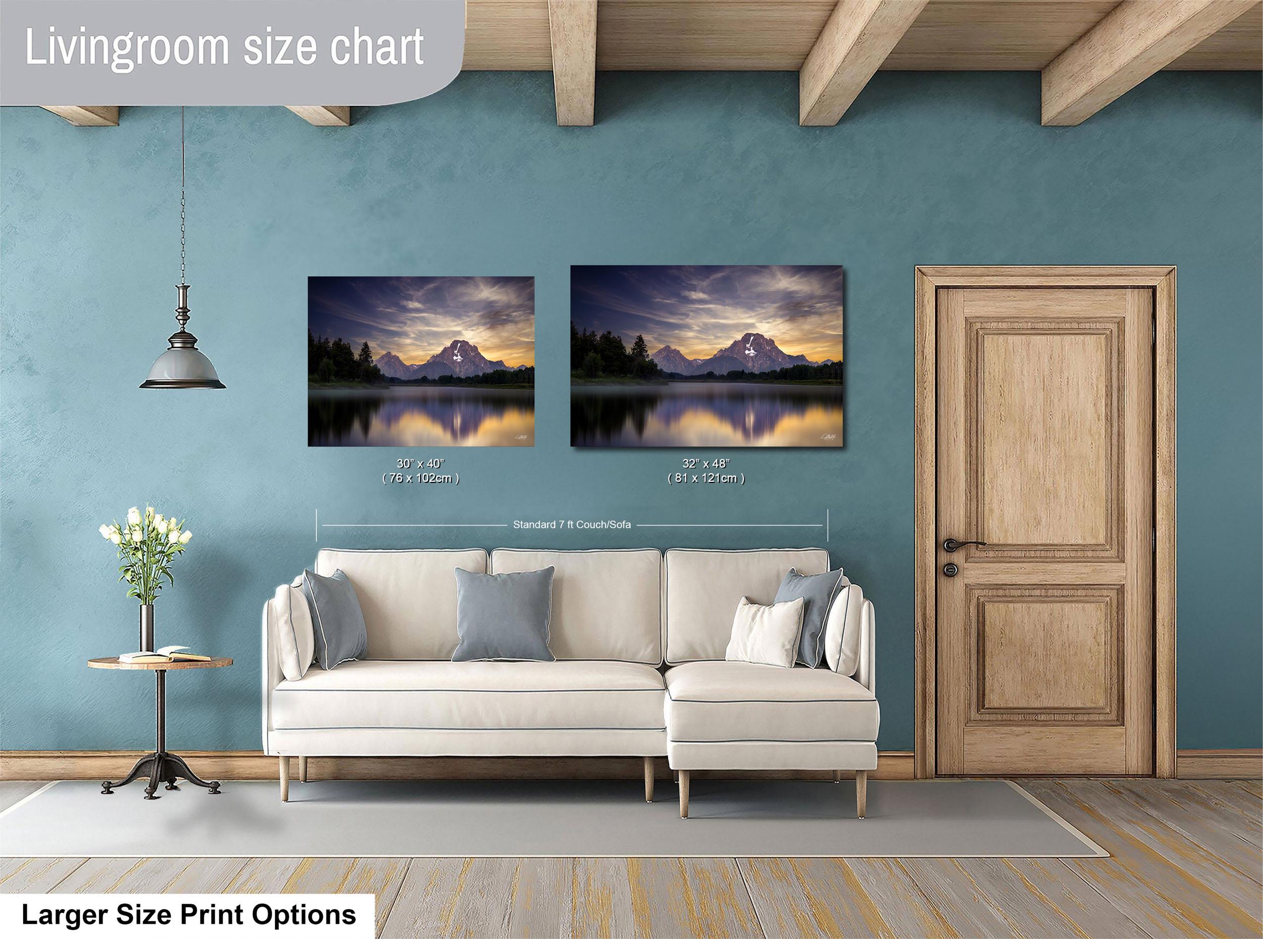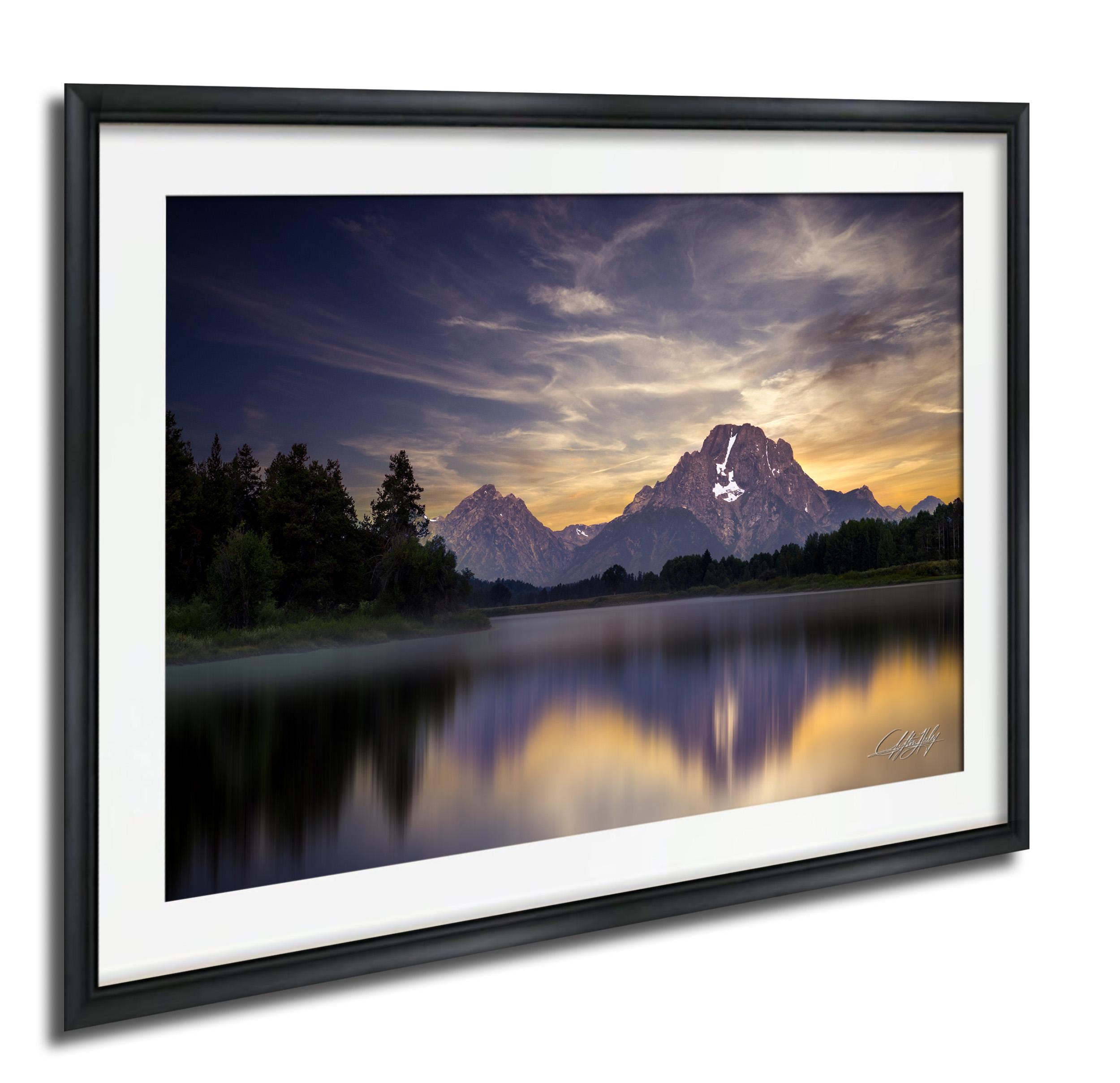 There’s a quiet magic that unfolds at sunrise along Oxbow Bend, where the golden hour paints the Grand Teton Park in soft, glowing hues. This fine art print captures that serene moment when the Snake River reflects the towering mountains, creating a breathtaking mirror of nature’s splendor. Inspired by the crisp morning air and the pine forest scent that fills the scene, this artwork invites you to bring a piece of that tranquil wilderness into your space.
