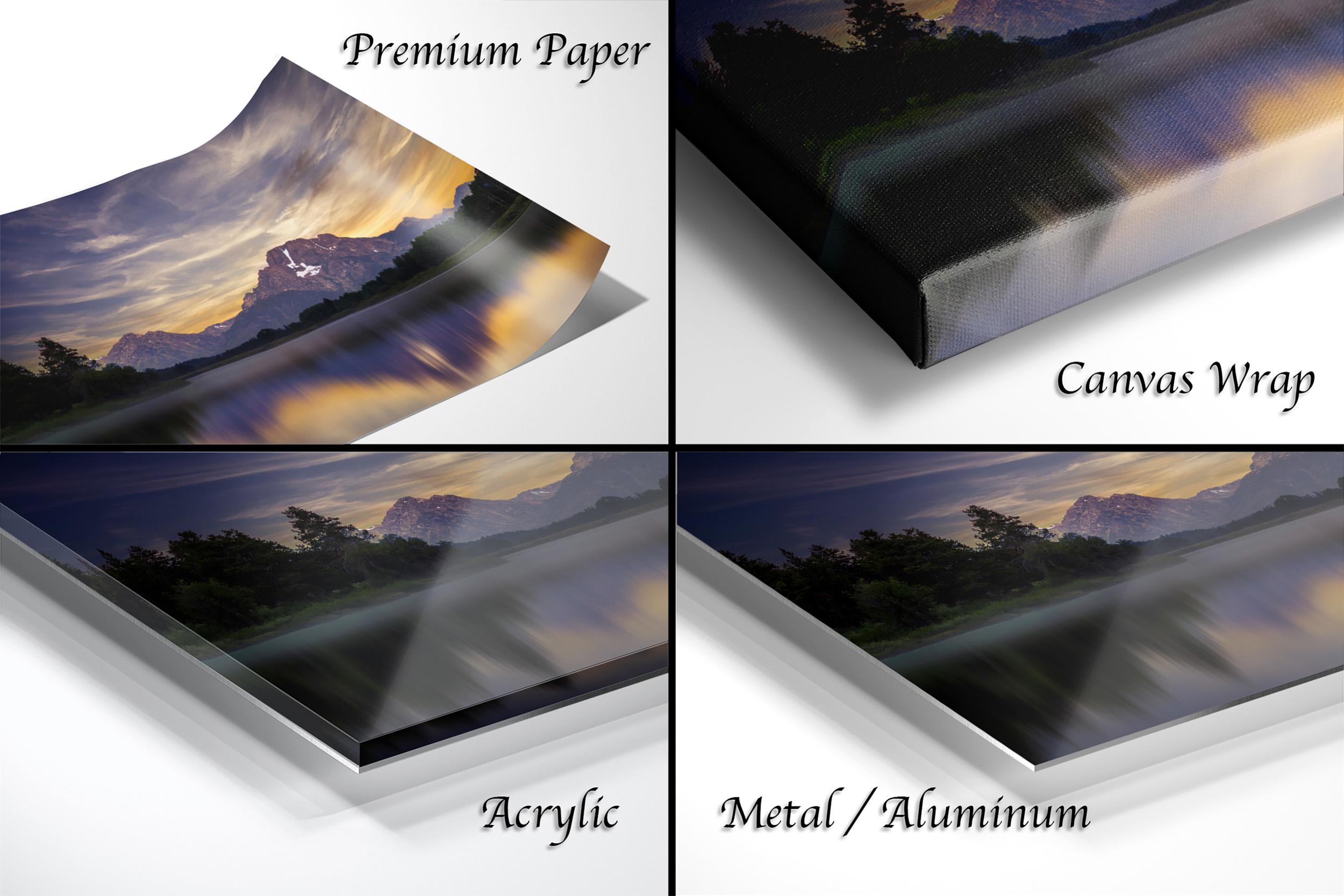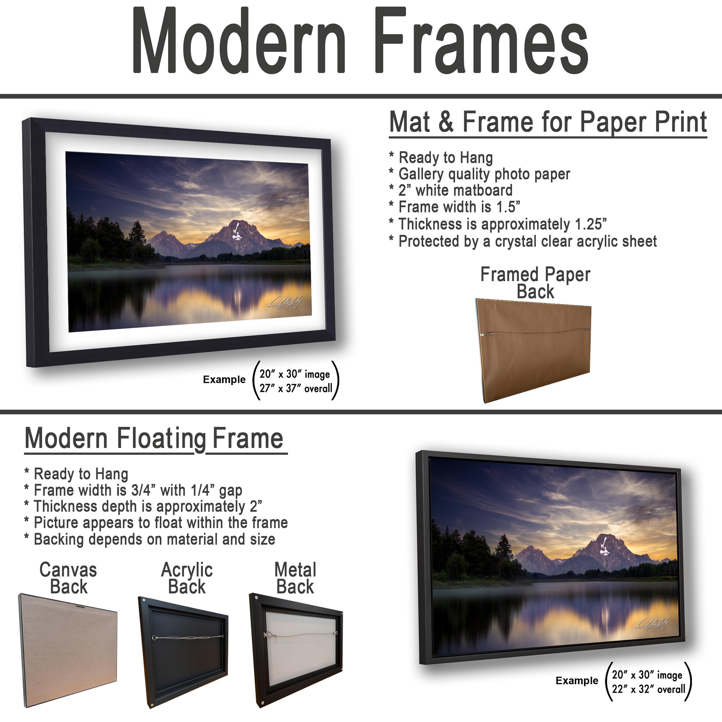- 1. Framed paper prints, acrylics, and metal prints include a 2" white mat border - 2. Canvas prints are flush mounted with no mat border - 3. Please allow processing time for made-to-order custom artwork