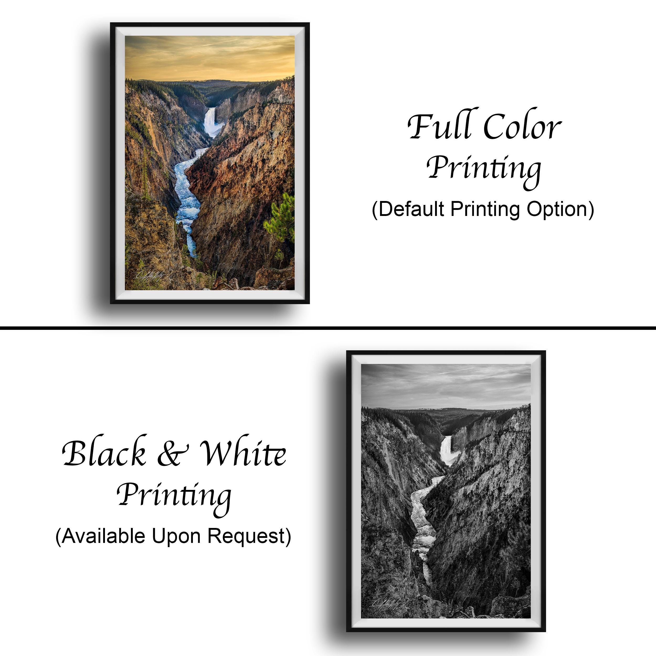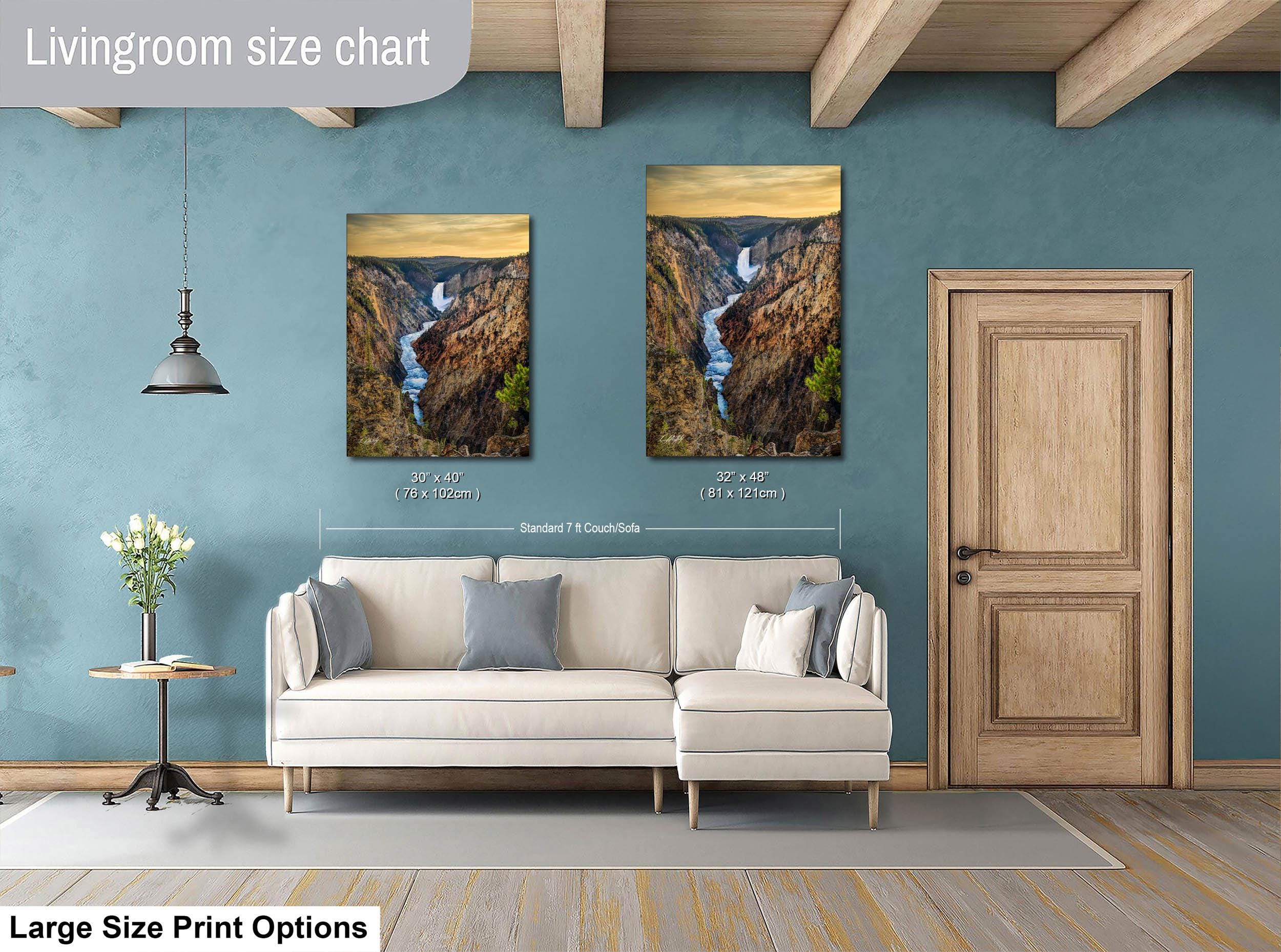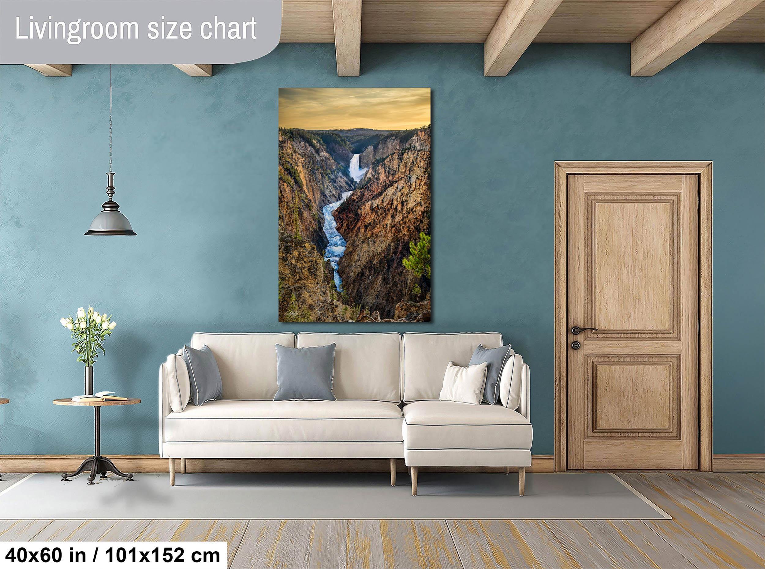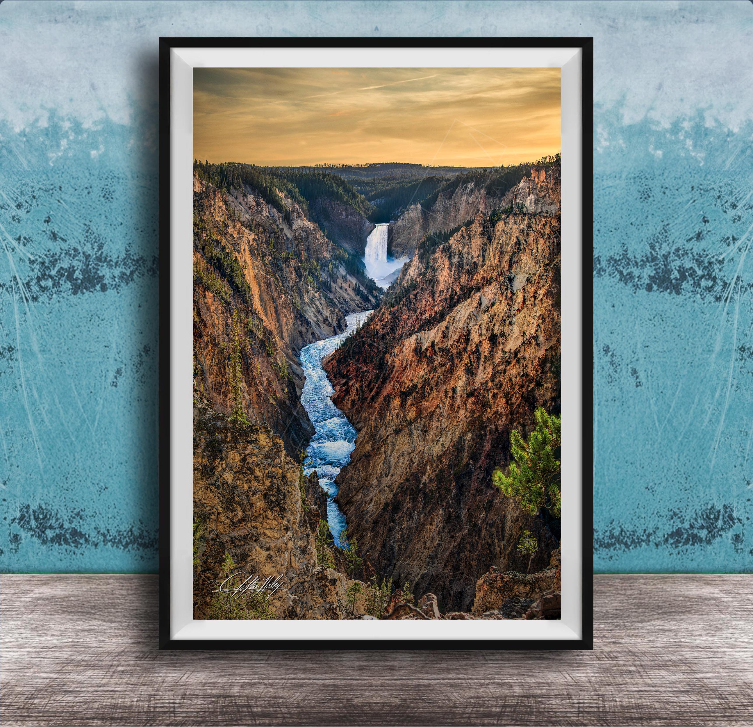This stunning waterfall print showcases the volcanic landscape and the majestic Yellowstone River carving through the canyon. Perfect as canyon wall art or a nature gift, it brings the serene beauty of sunrise and sunset right to your space.