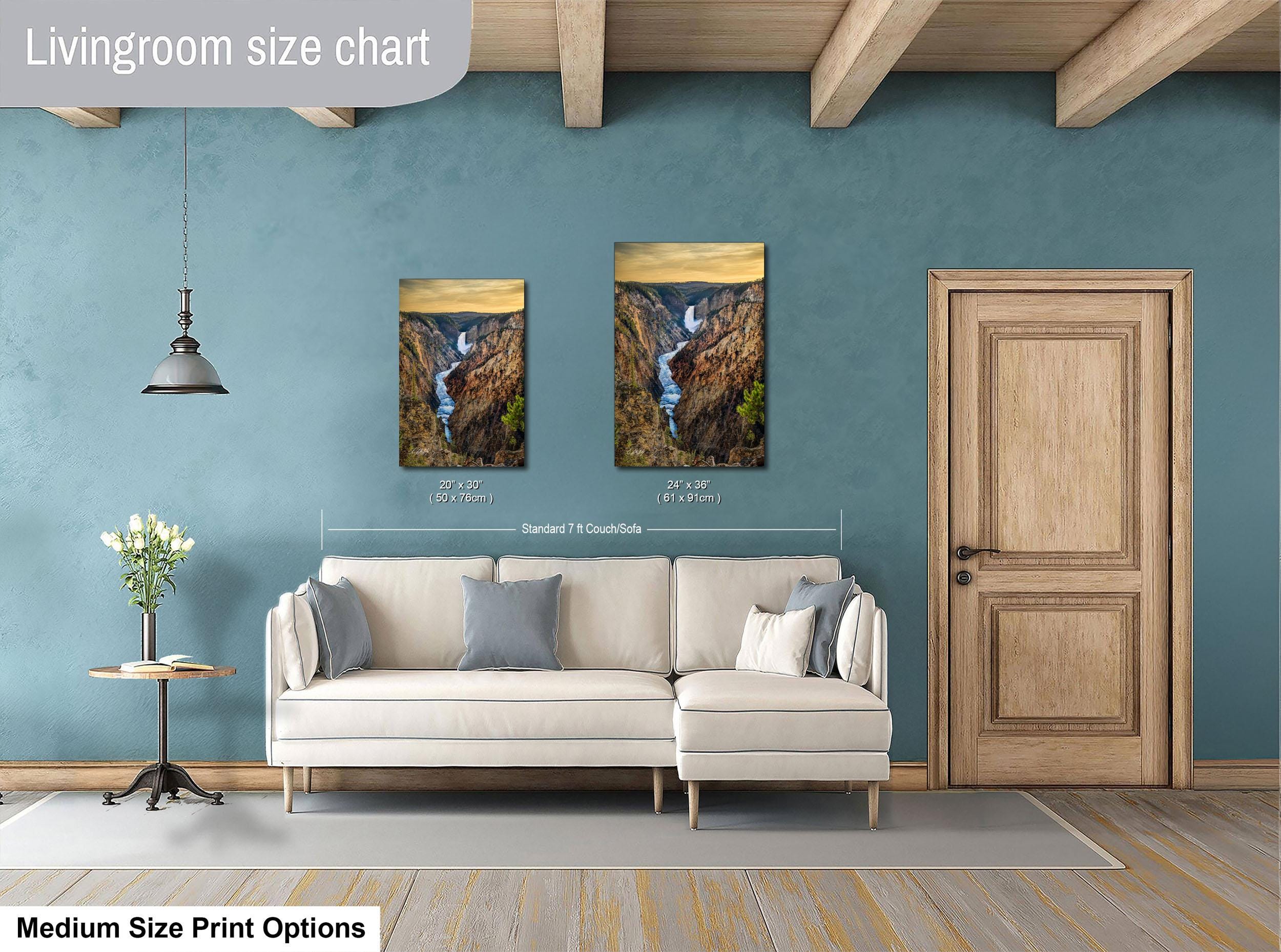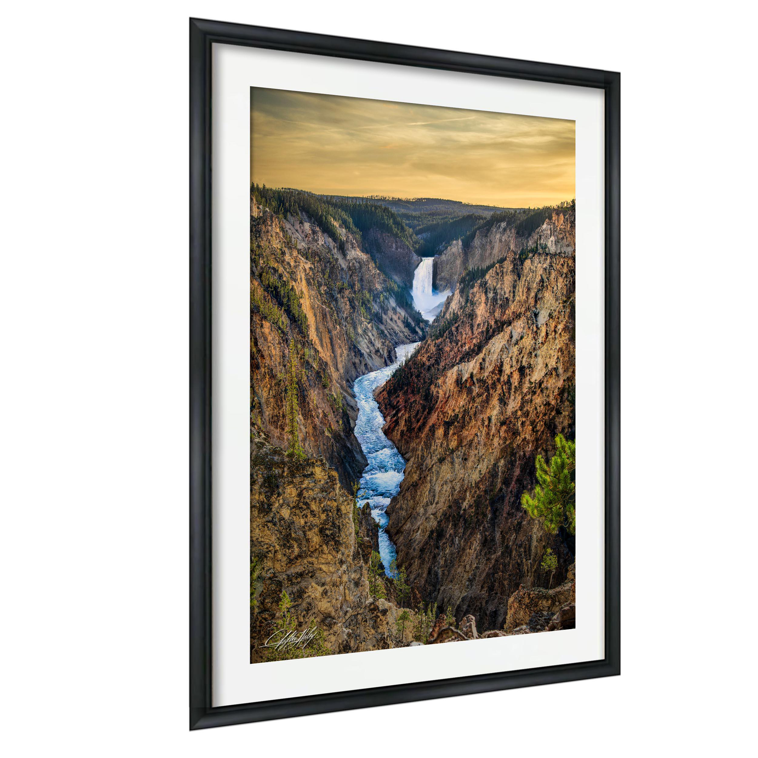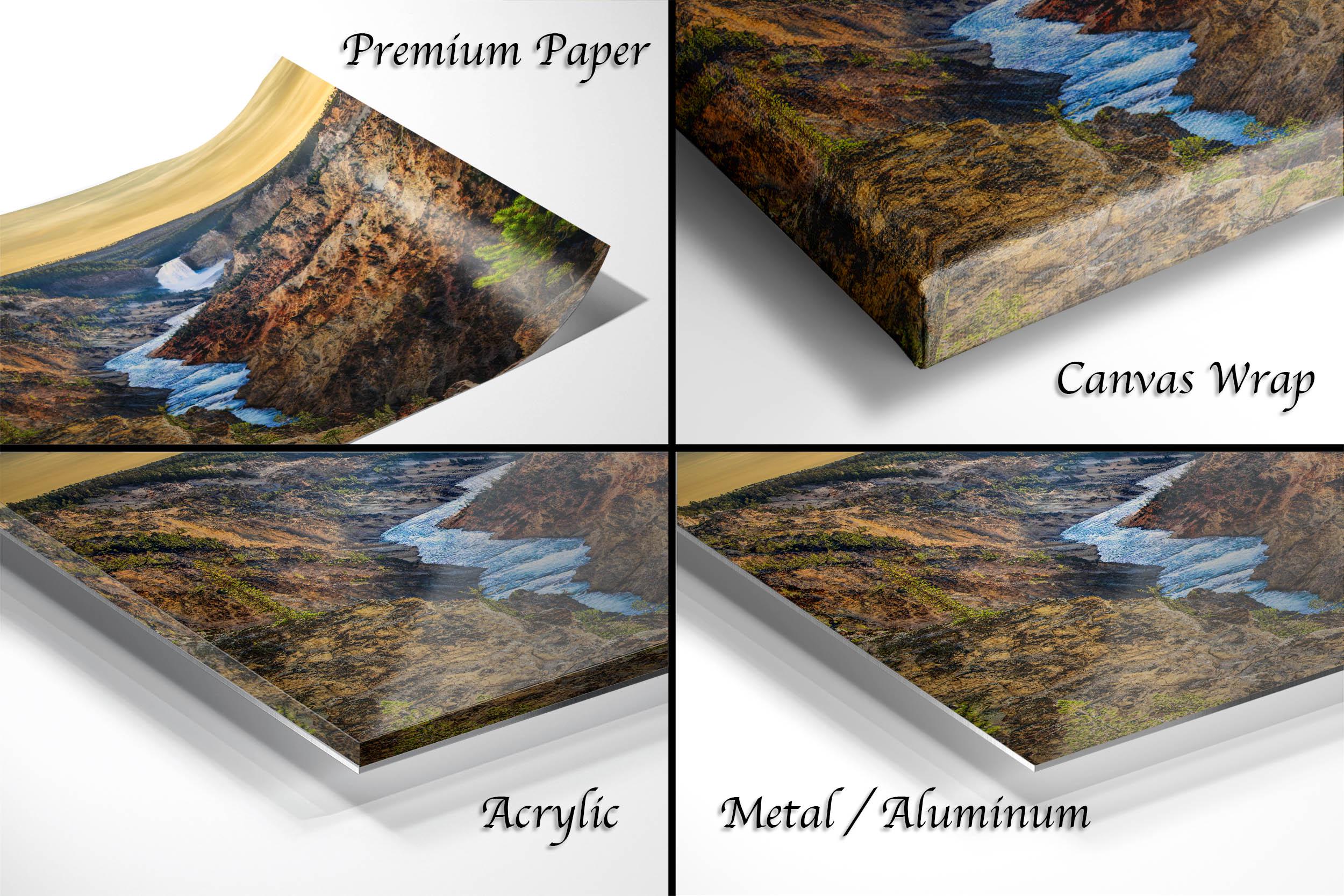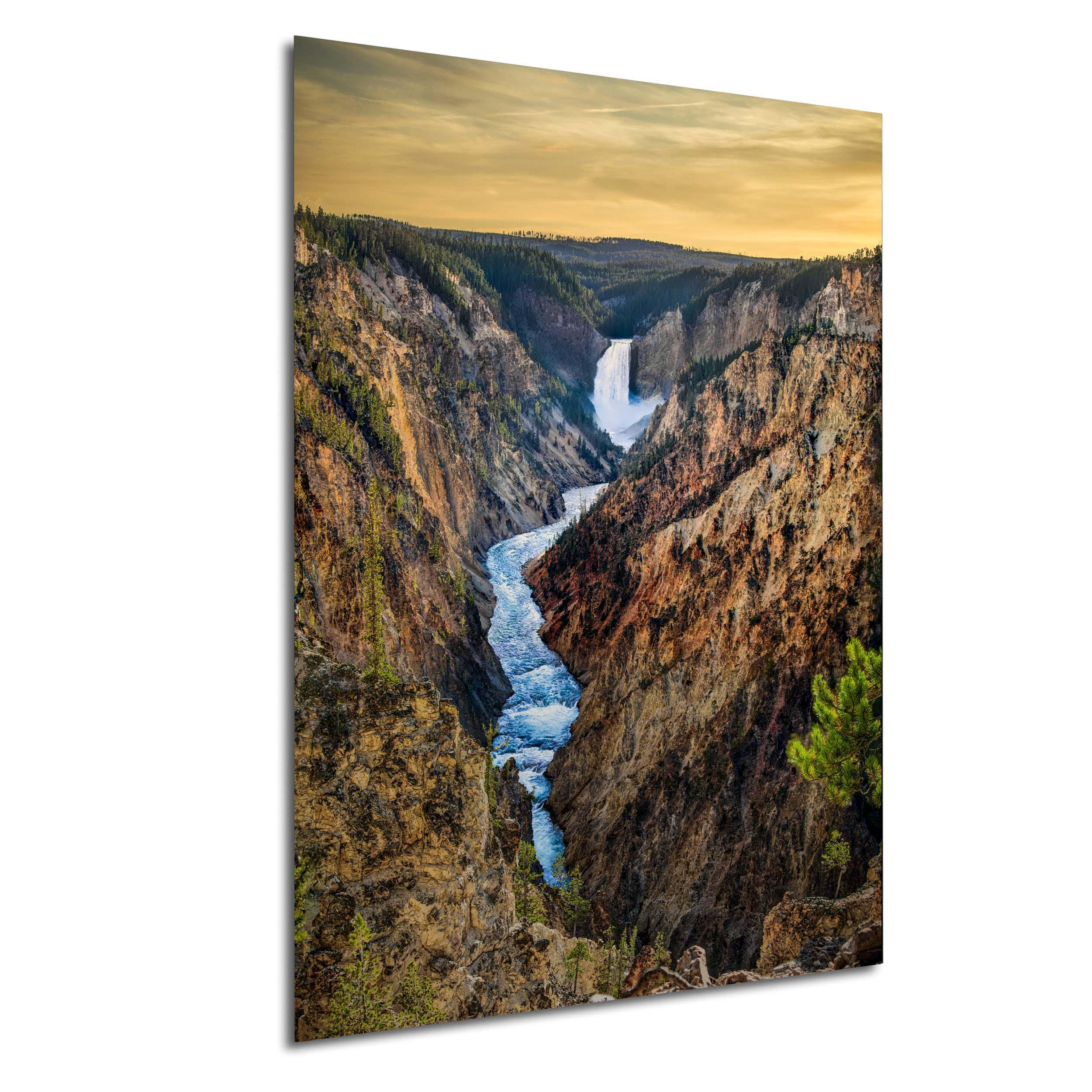 This stunning waterfall print showcases the volcanic landscape and the majestic Yellowstone River carving through the canyon. Perfect as canyon wall art or a nature gift, it brings the serene beauty of sunrise and sunset right to your space.