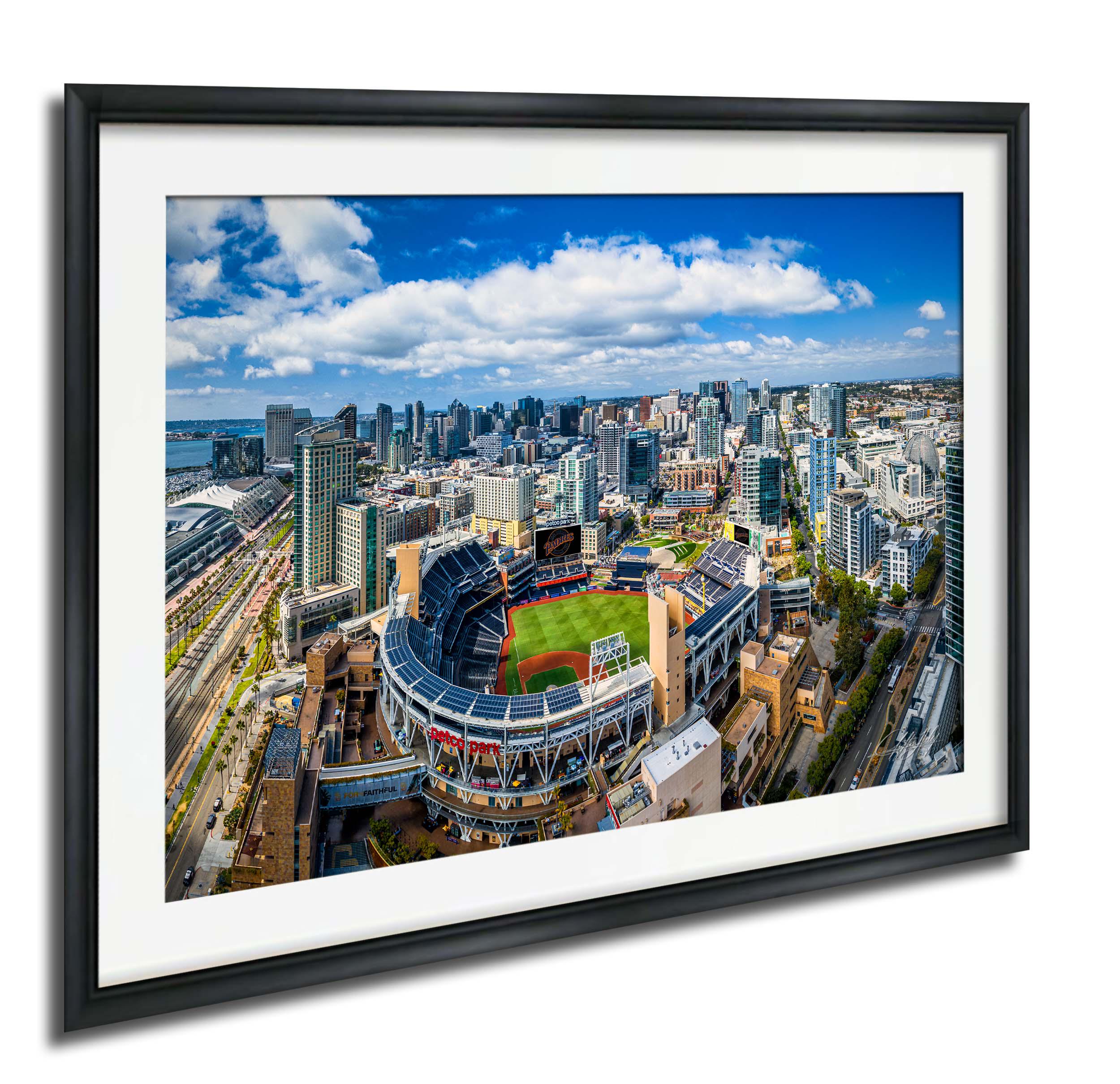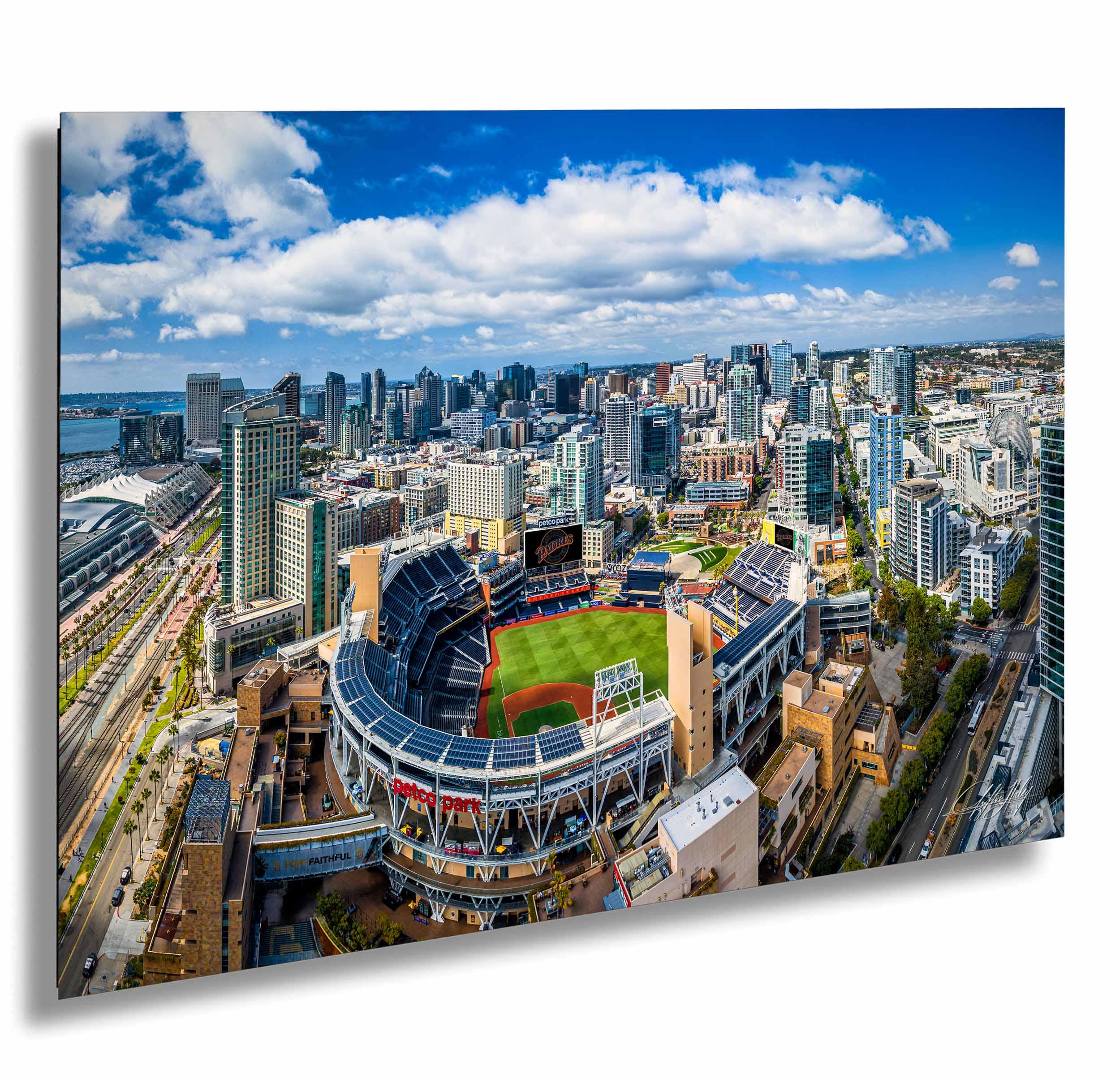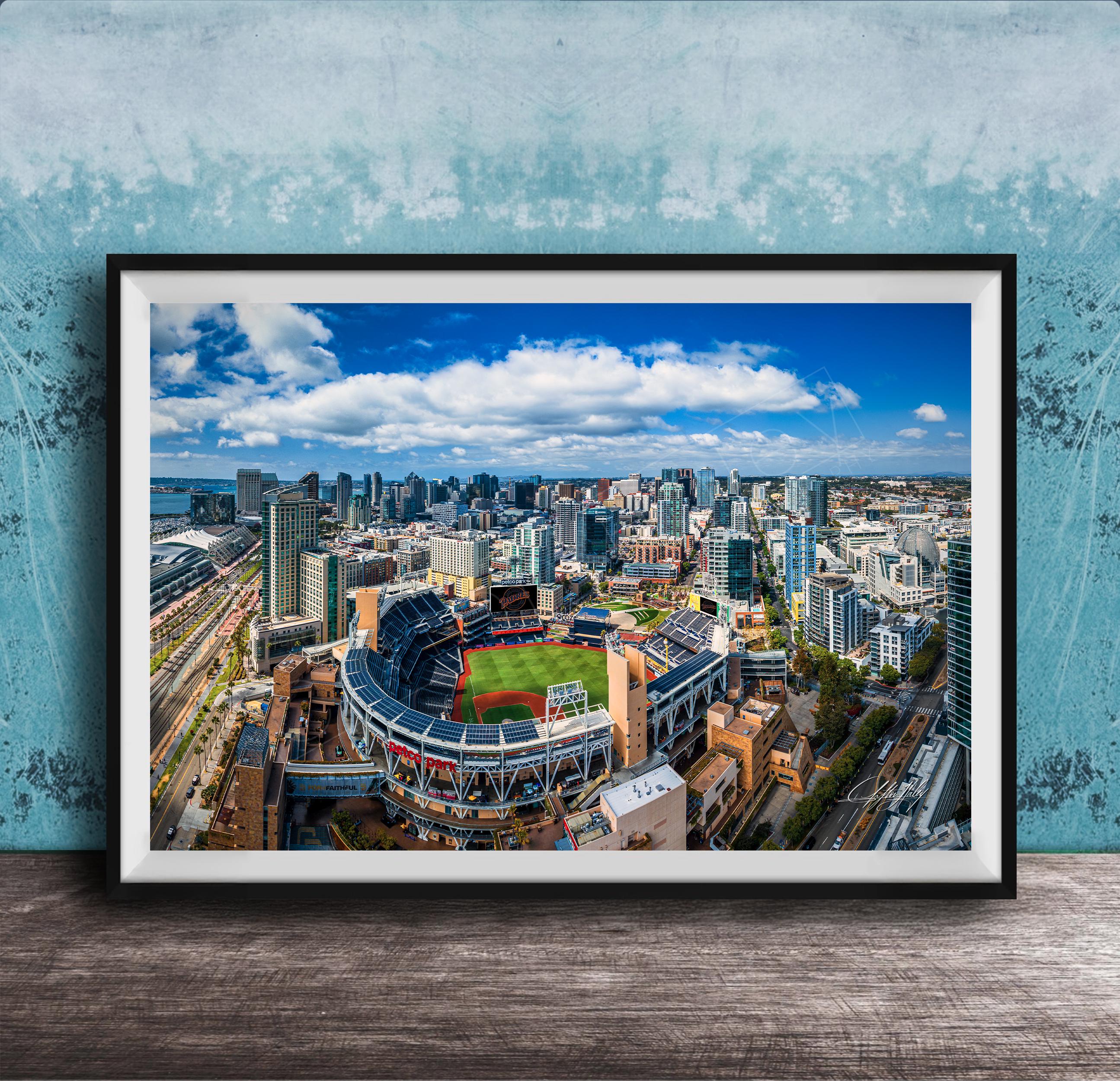 Crafted with precision and passion, this fine art print brings together elements of Padres baseball art and military base view photography, making it a perfect addition for fans and collectors alike. The image was captured via drone, showcasing a unique San Diego drone perspective that highlights the city's vibrant skyline photography.
