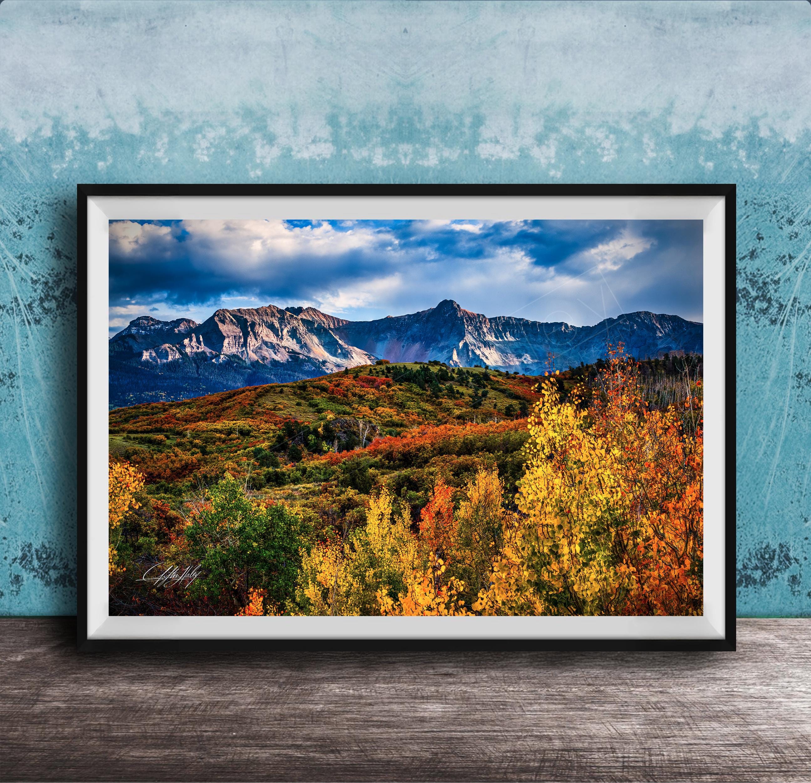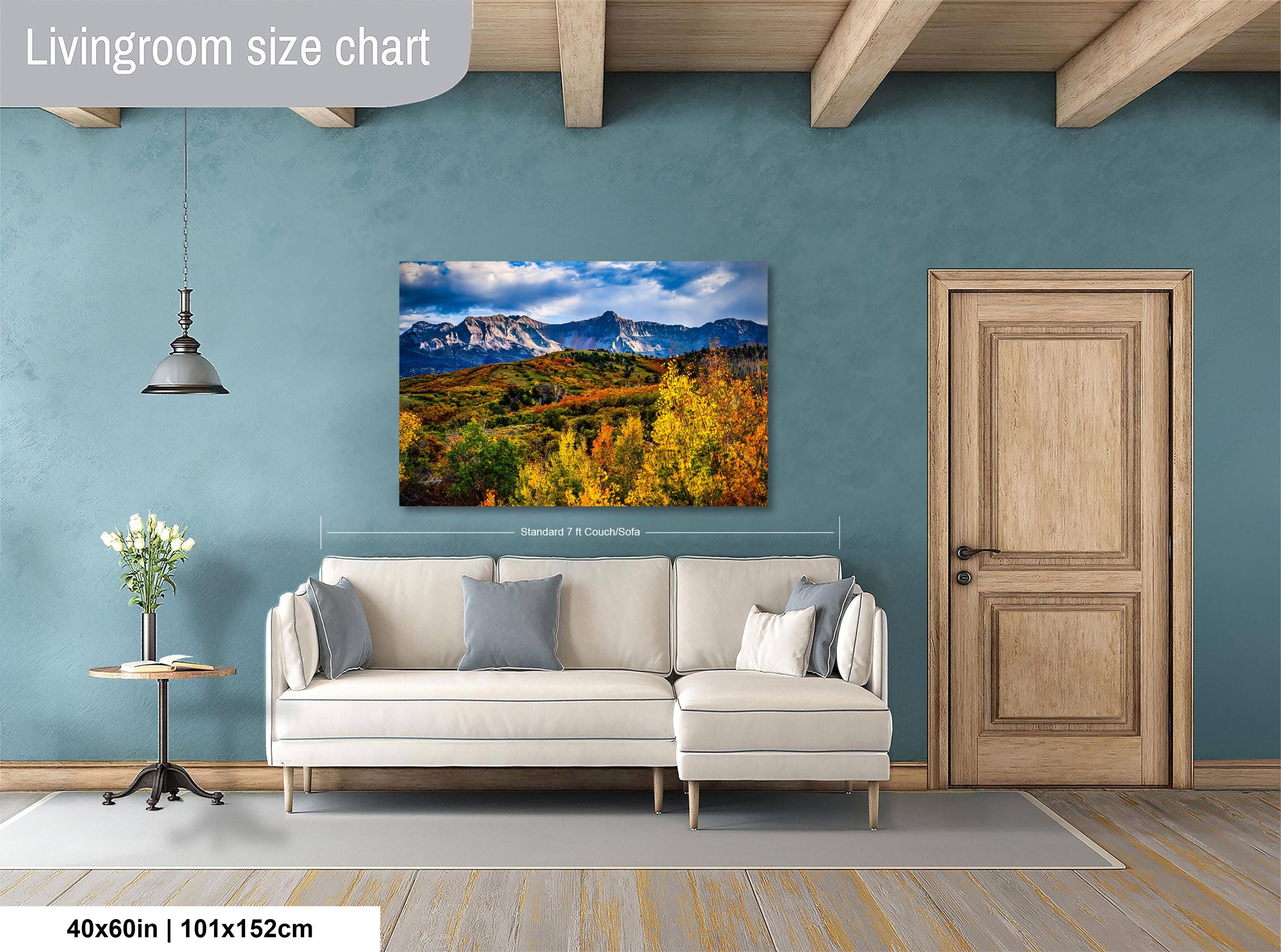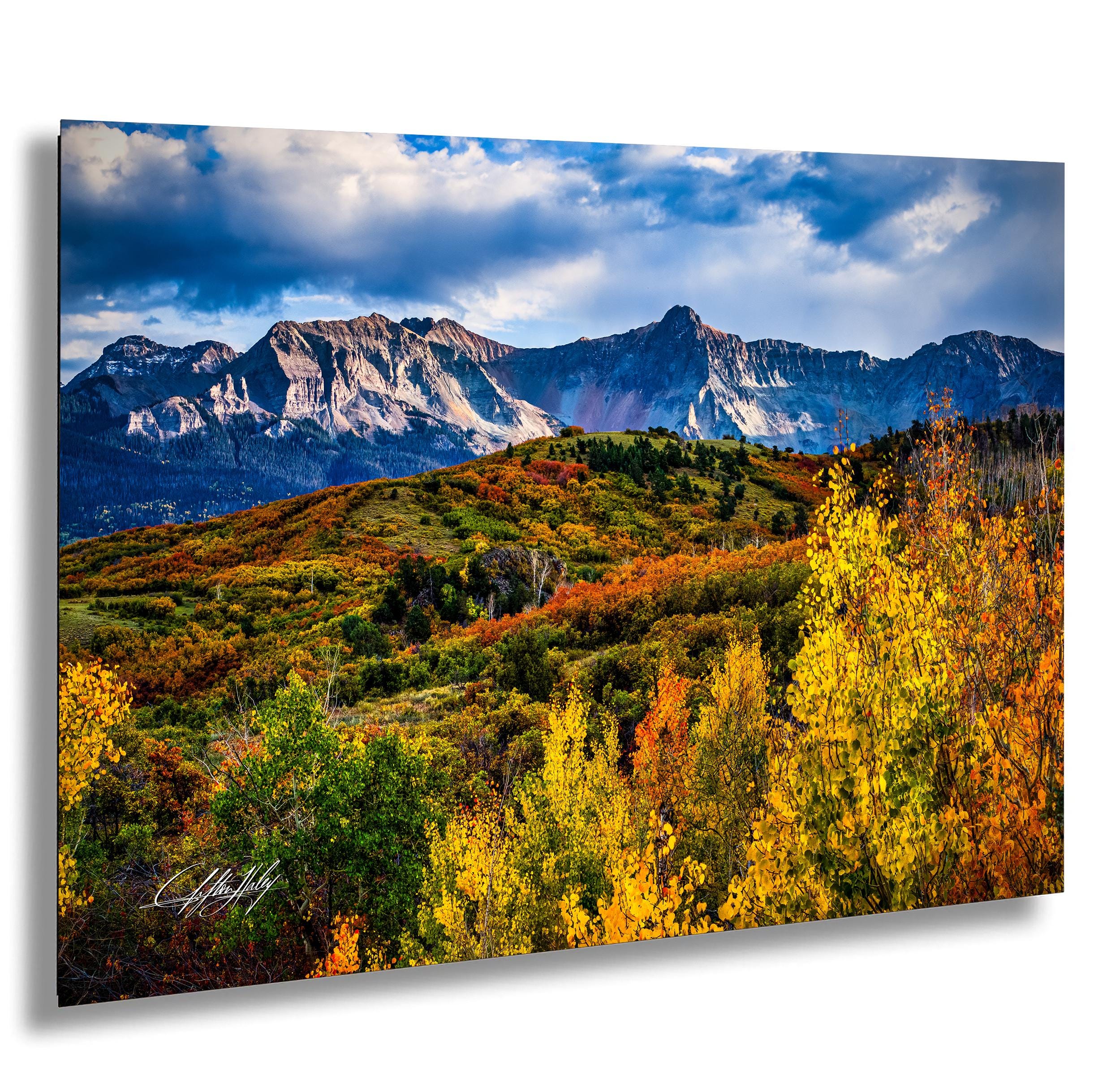 Experience the breathtaking beauty of the San Juan Mountains as golden Aspens shimmer in autumn light. This Colorado wall art captures the vibrant fall colors and majestic Mt. Sneffels view, bringing a touch of the American Alps into your home with stunning clarity and warmth.