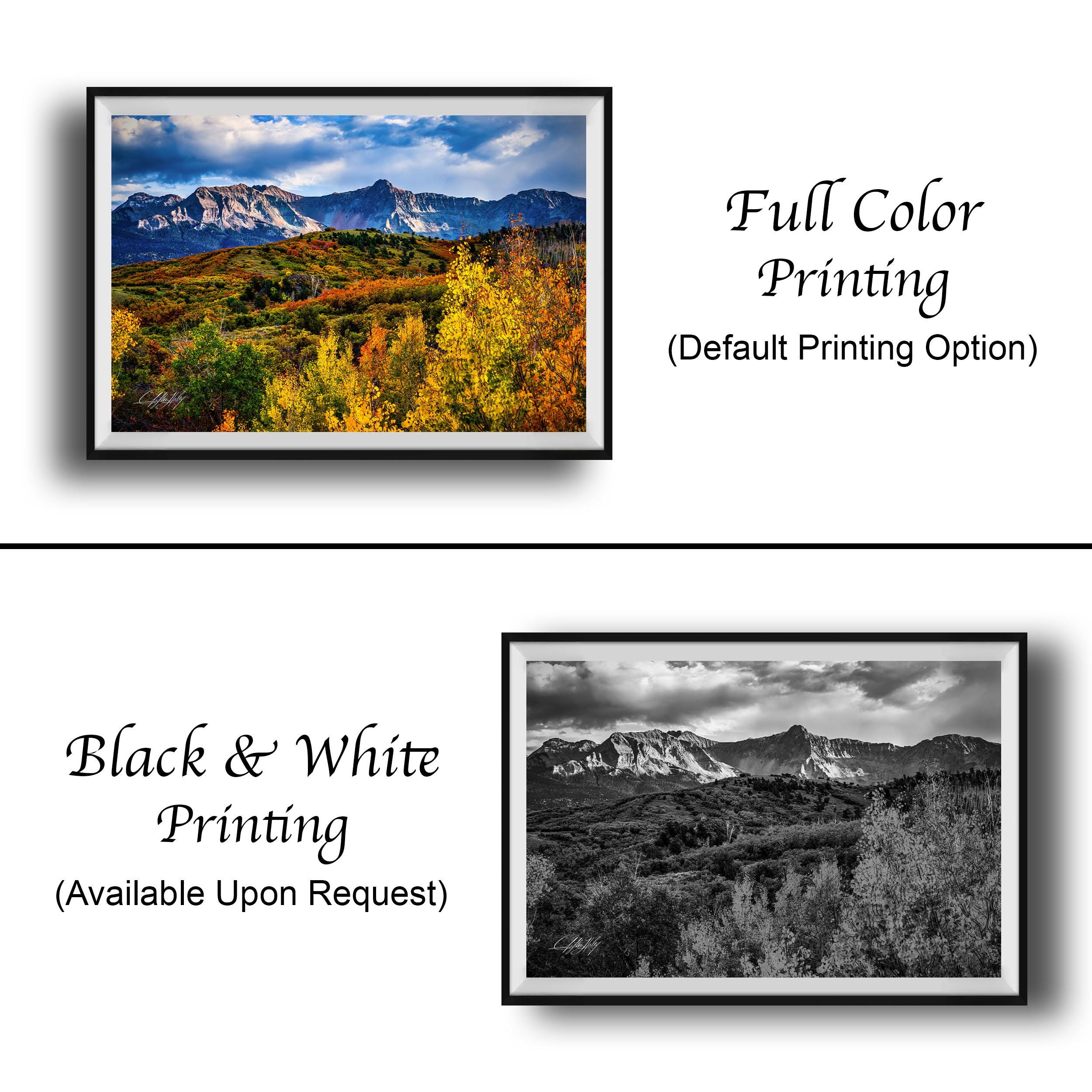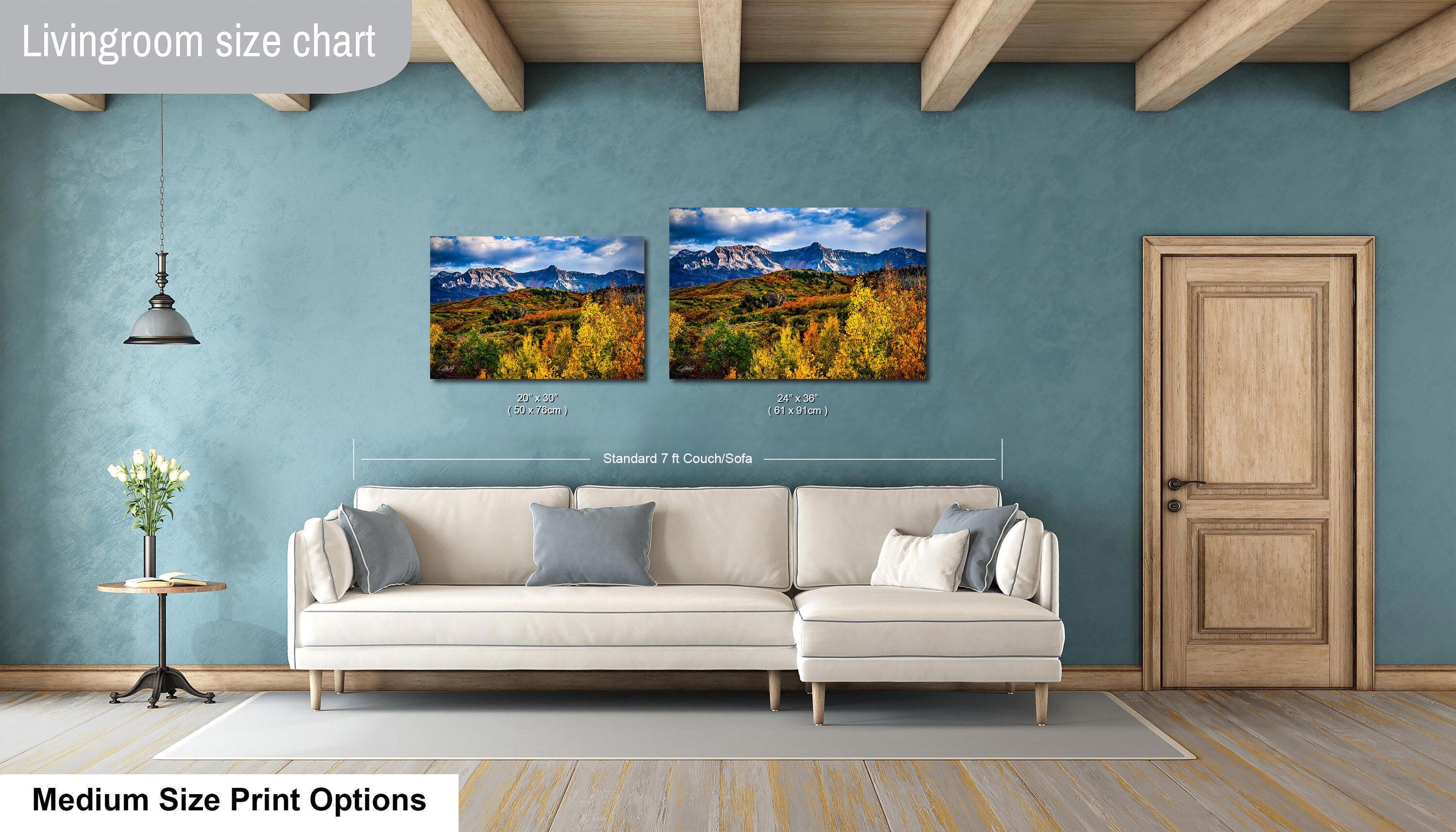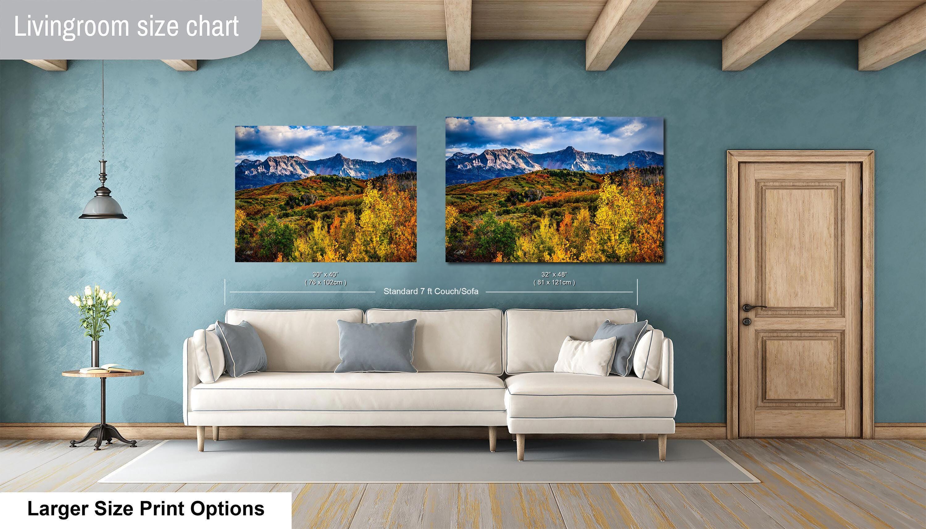 Experience the breathtaking beauty of the San Juan Mountains as golden Aspens shimmer in autumn light. This Colorado wall art captures the vibrant fall colors and majestic Mt. Sneffels view, bringing a touch of the American Alps into your home with stunning clarity and warmth.
