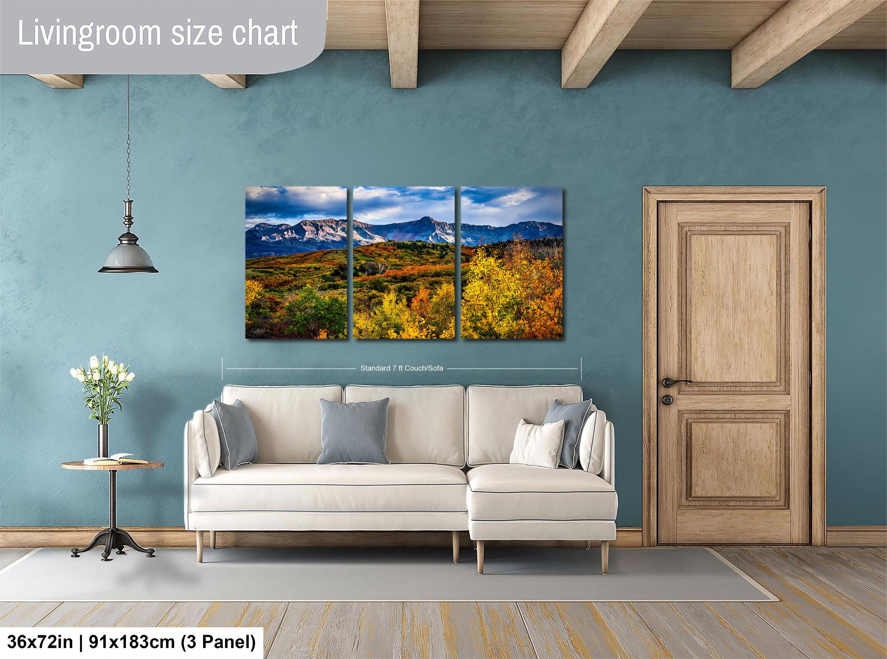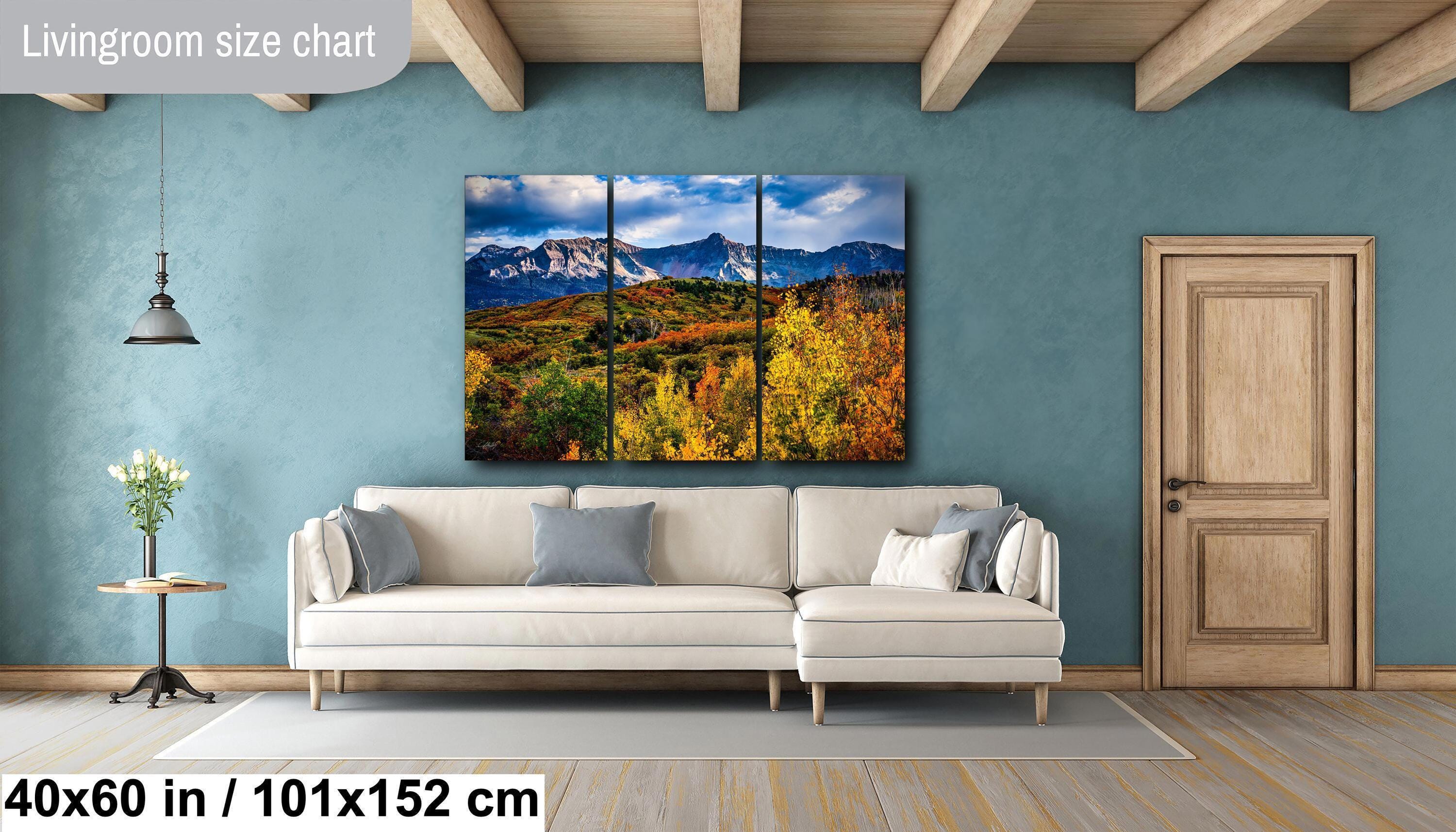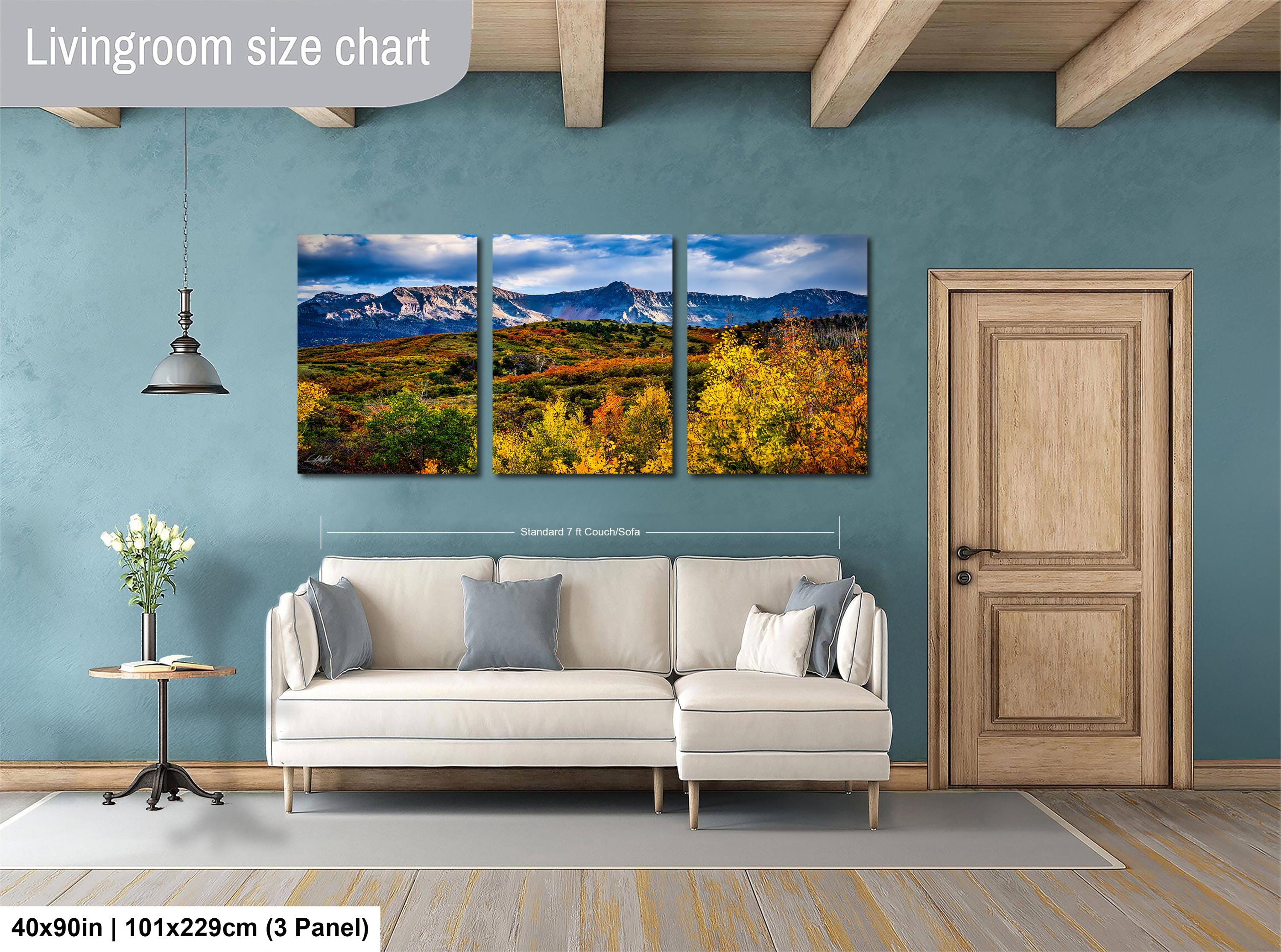 Immerse yourself in a large 3 piece wall decor set that showcases the serene mountain scene decor perfect for any nature lover. The rich autumn leaves fall hues reflect Colorado's colorful spirit, making this canvas a standout Rocky Mountain print.