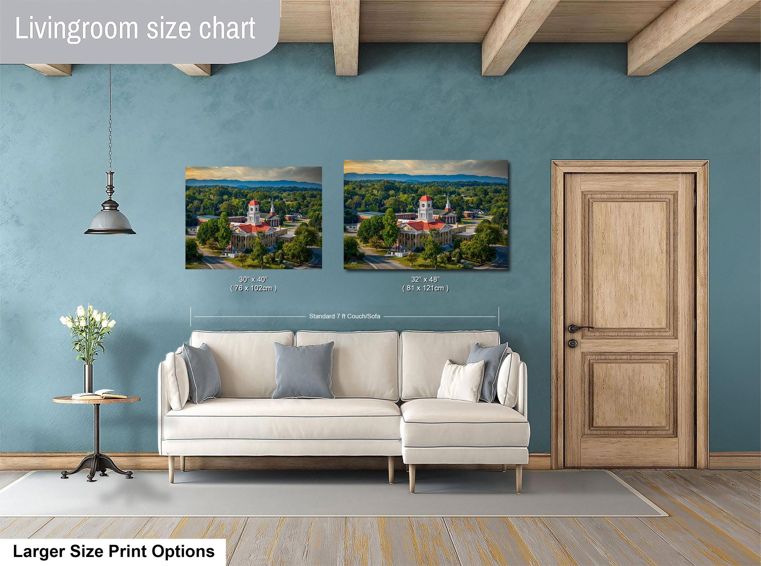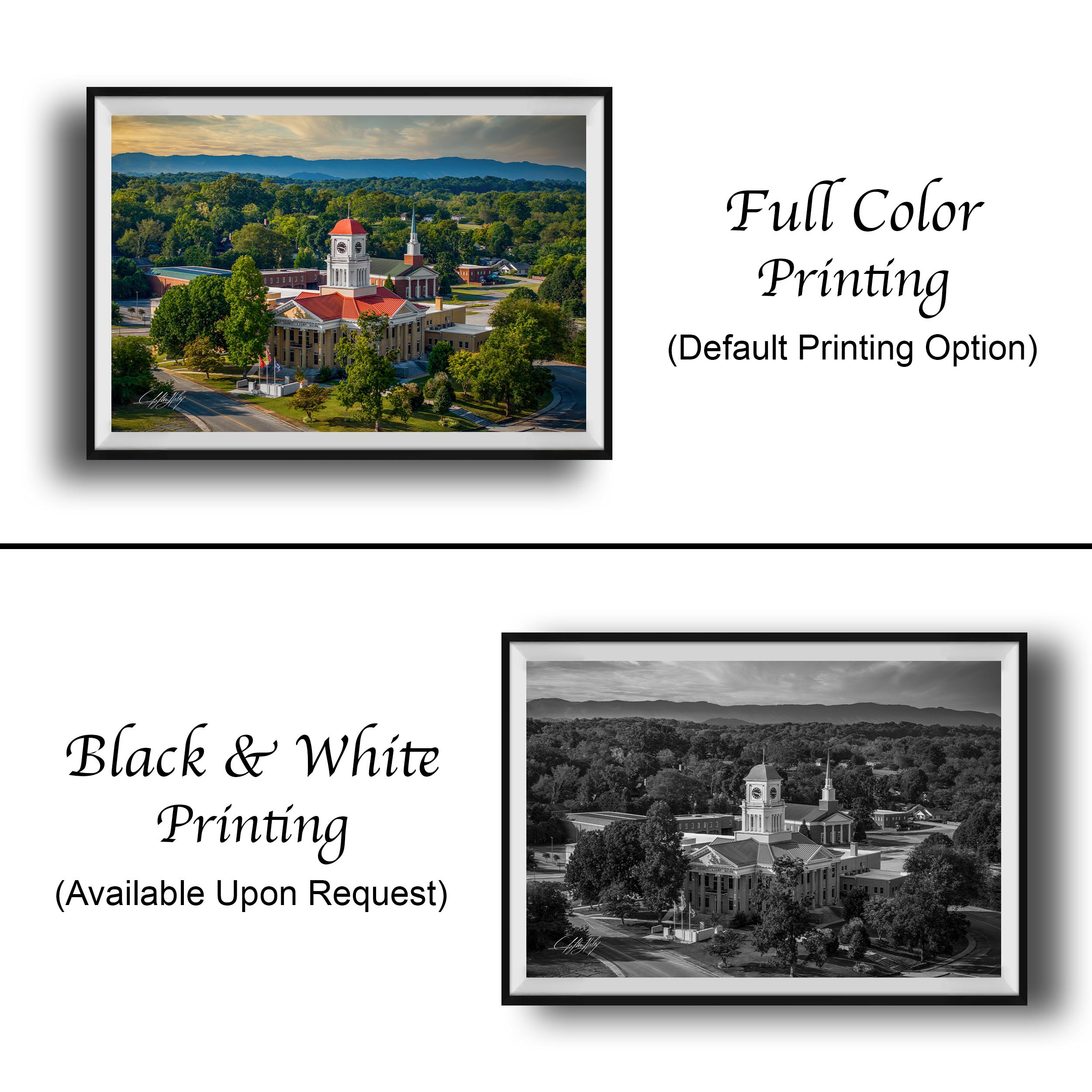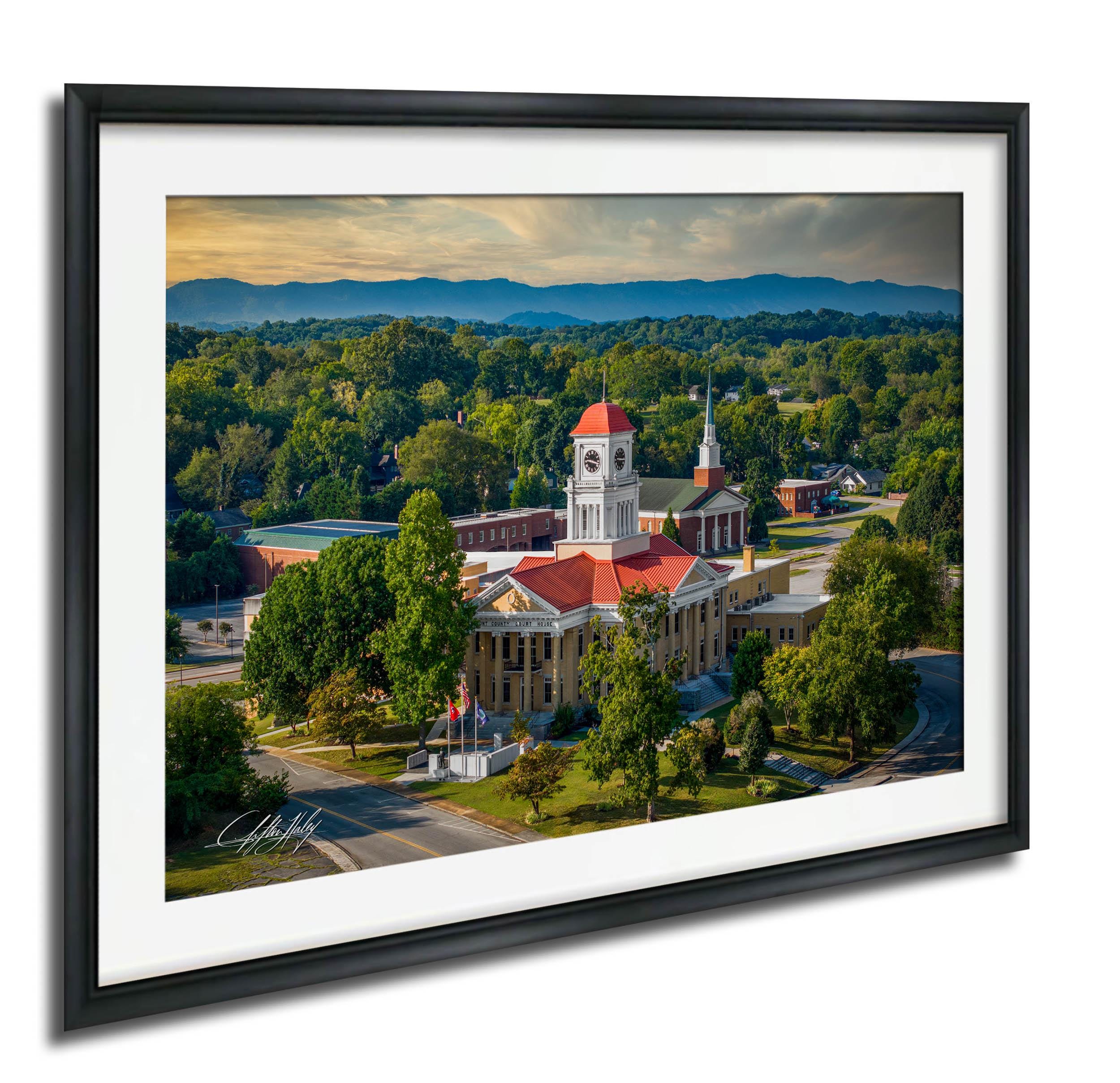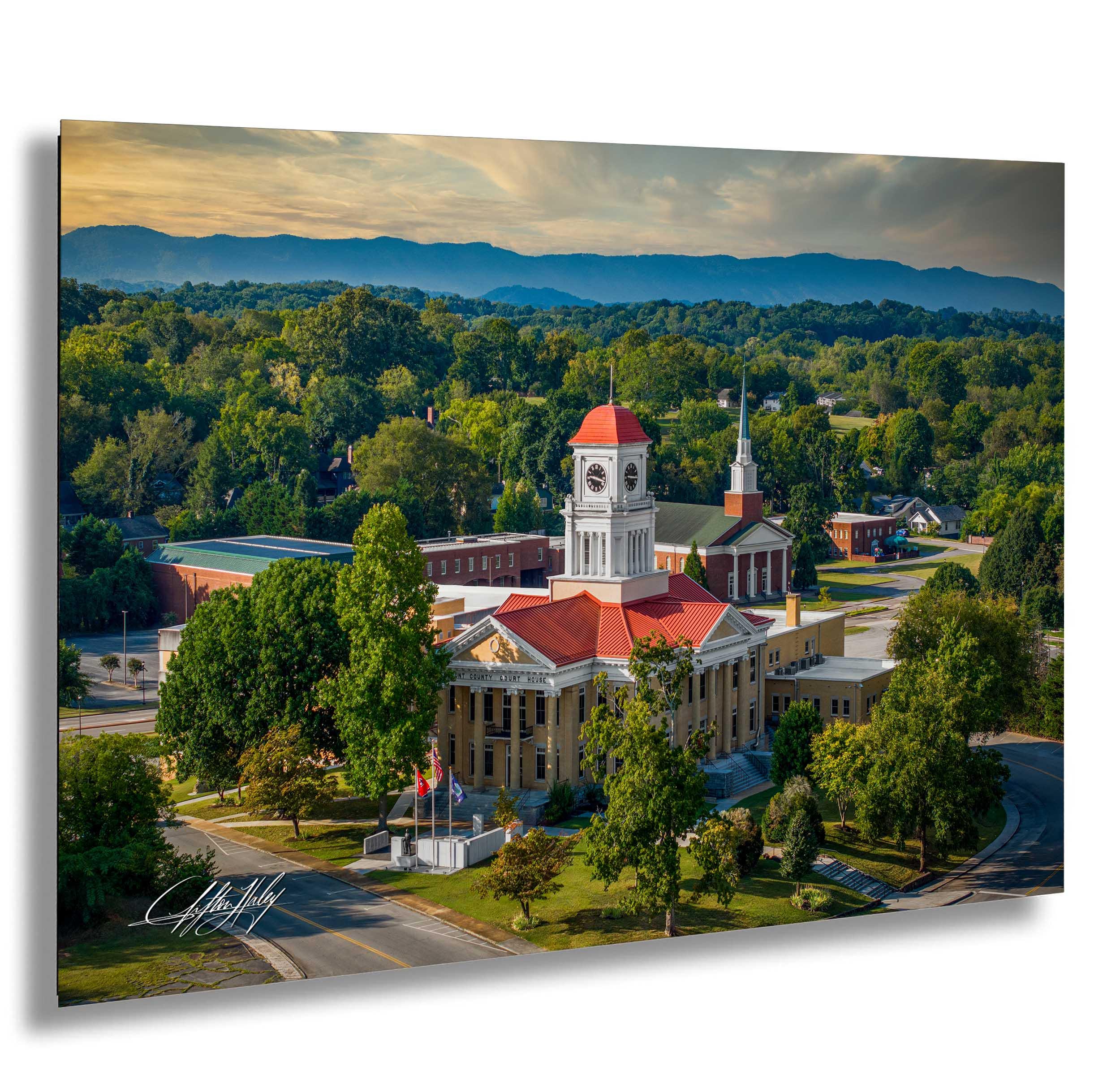 Maryville Courthouse art captures a timeless moment where history and nature meet in the heart of Tennessee. This autumn history print beautifully showcases the Maryville courthouse framed by the Great Smoky Mountains, evoking warm autumn artwork that honors the town's rich legacy.