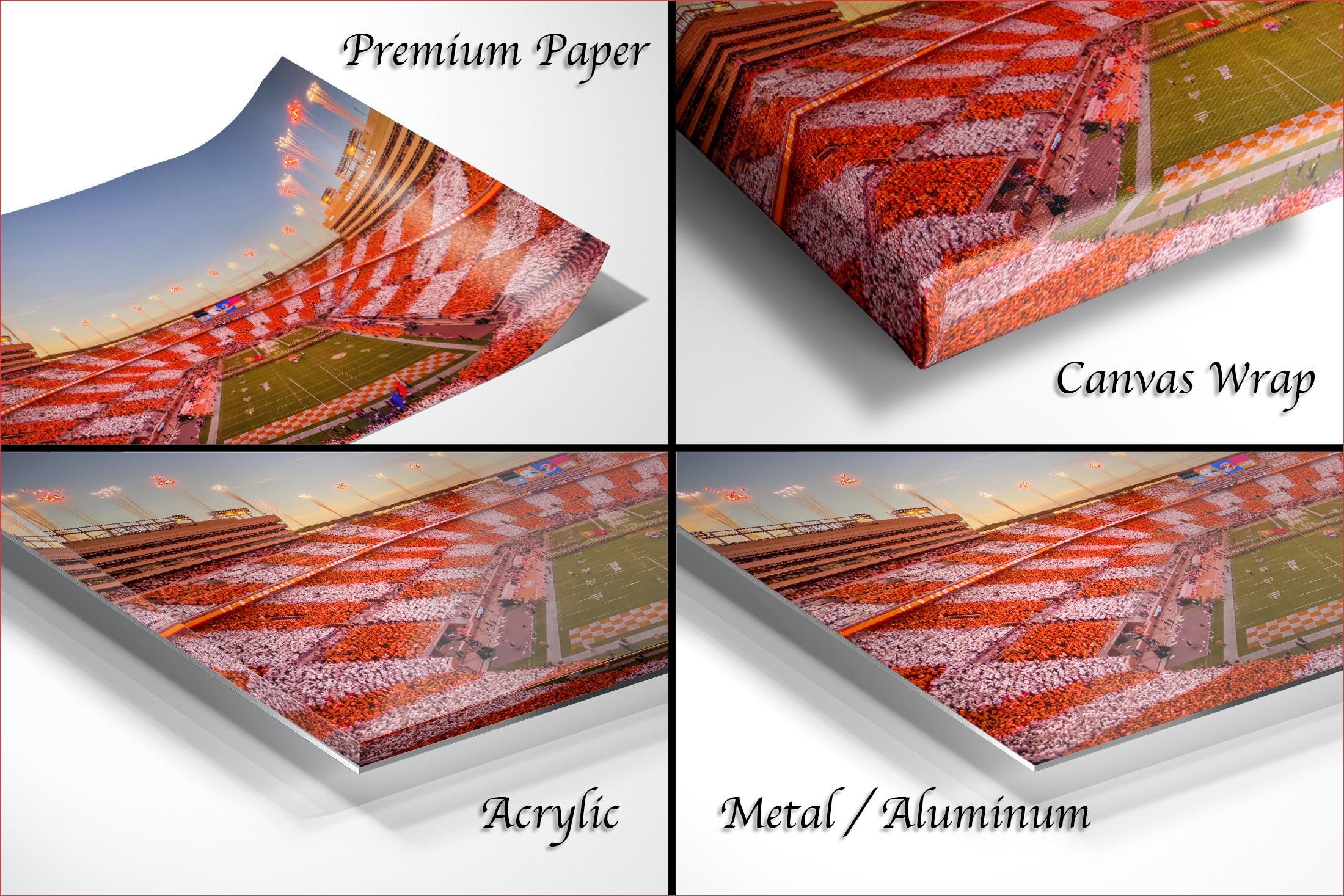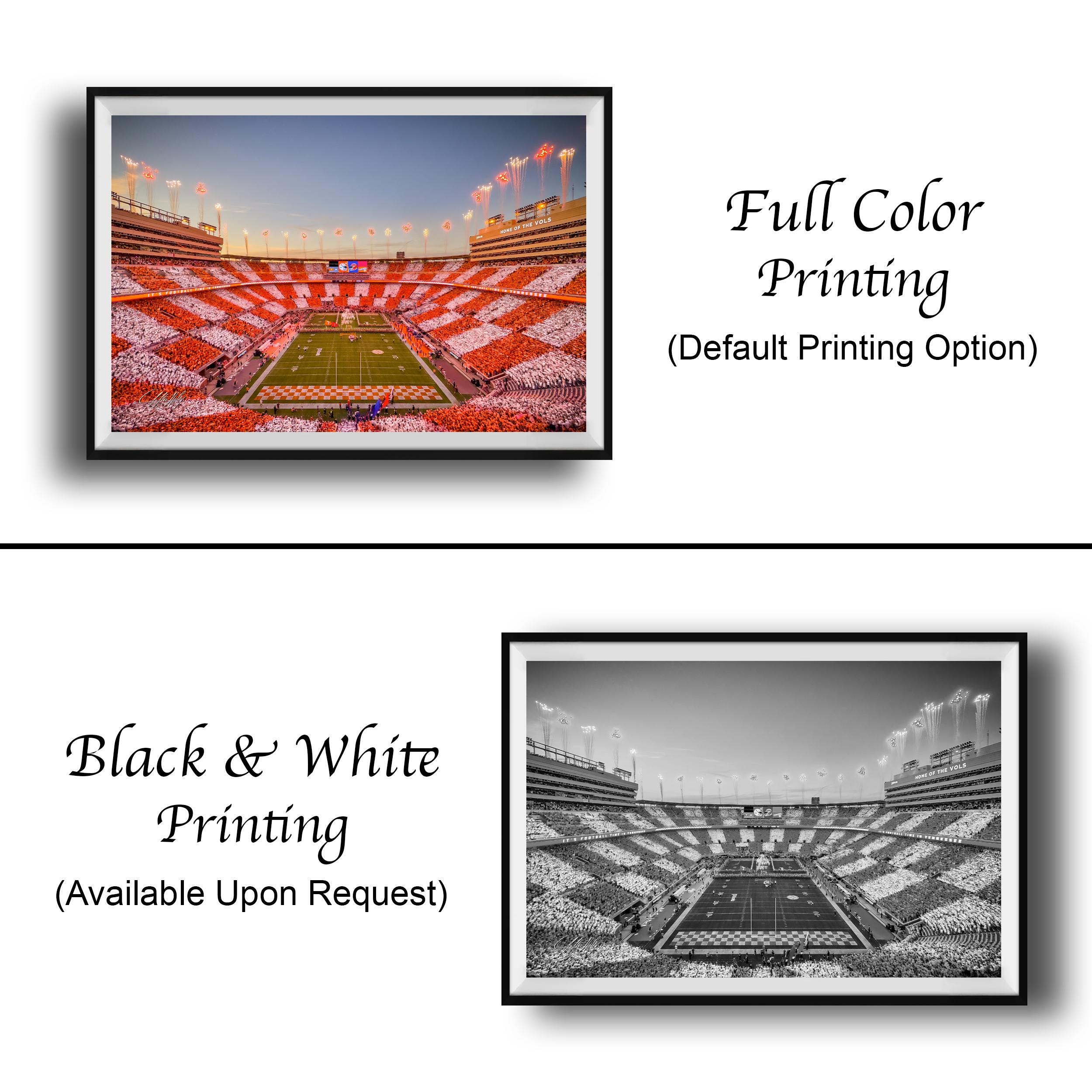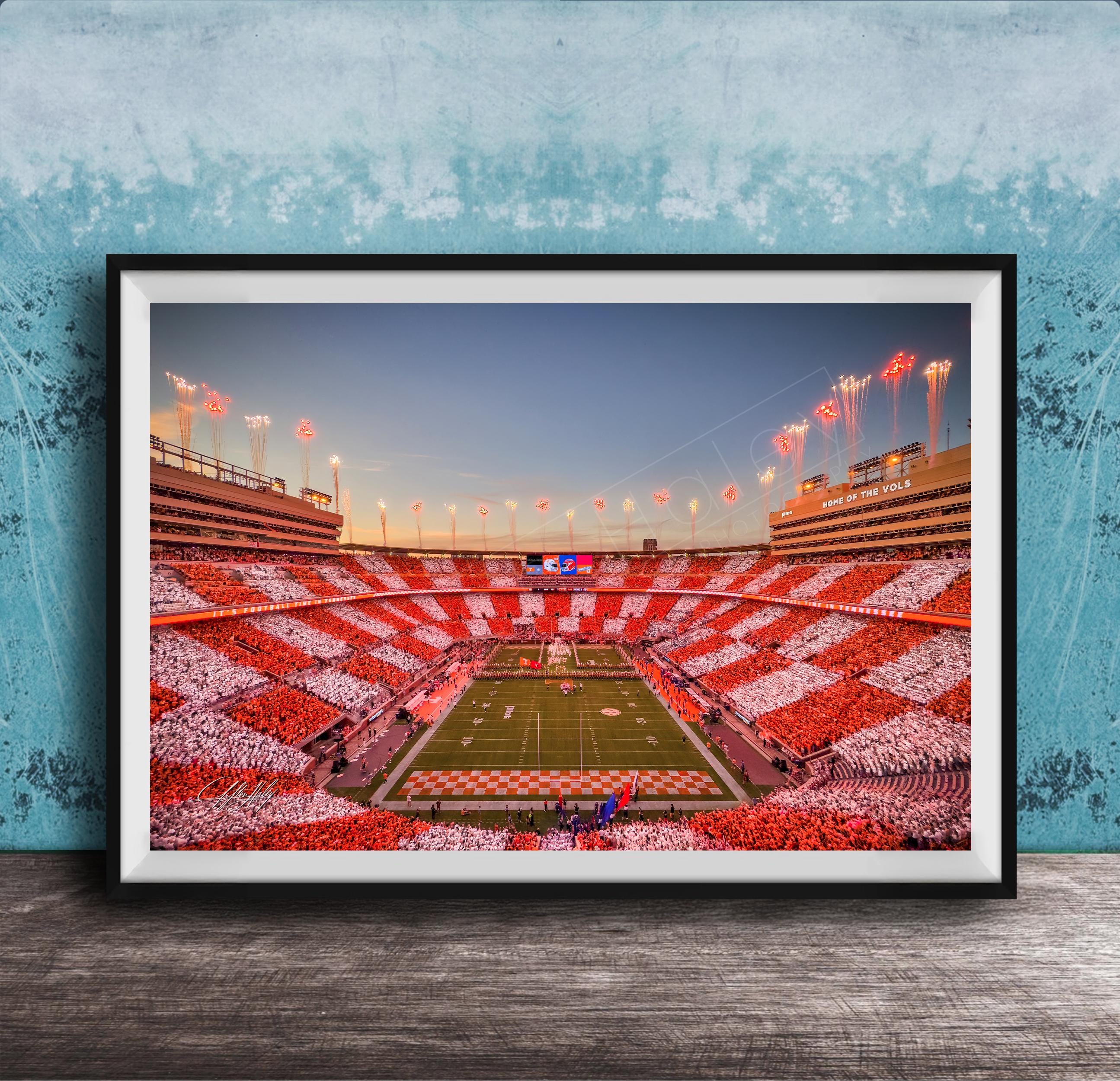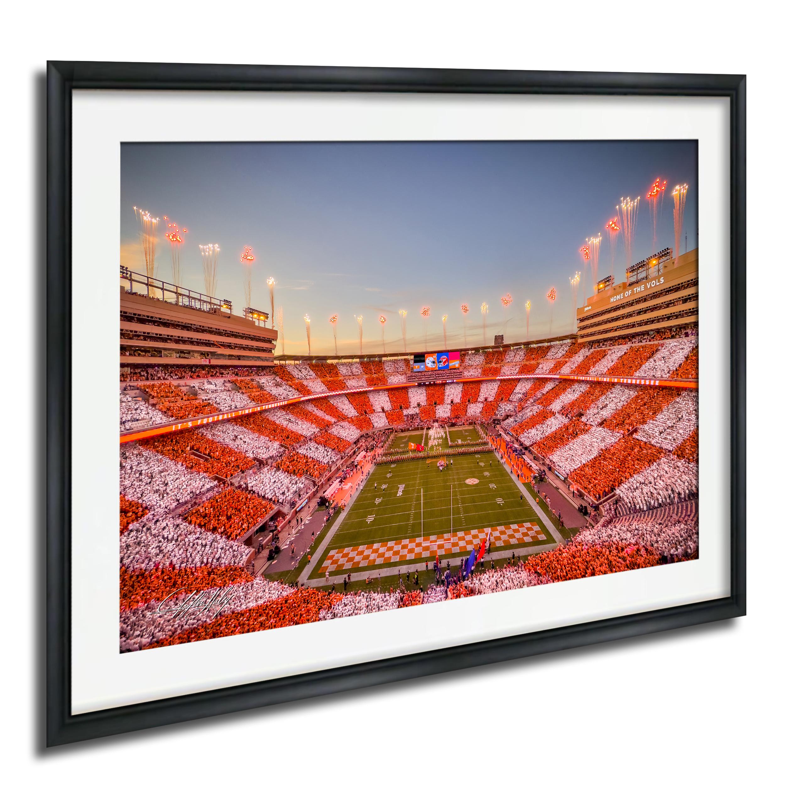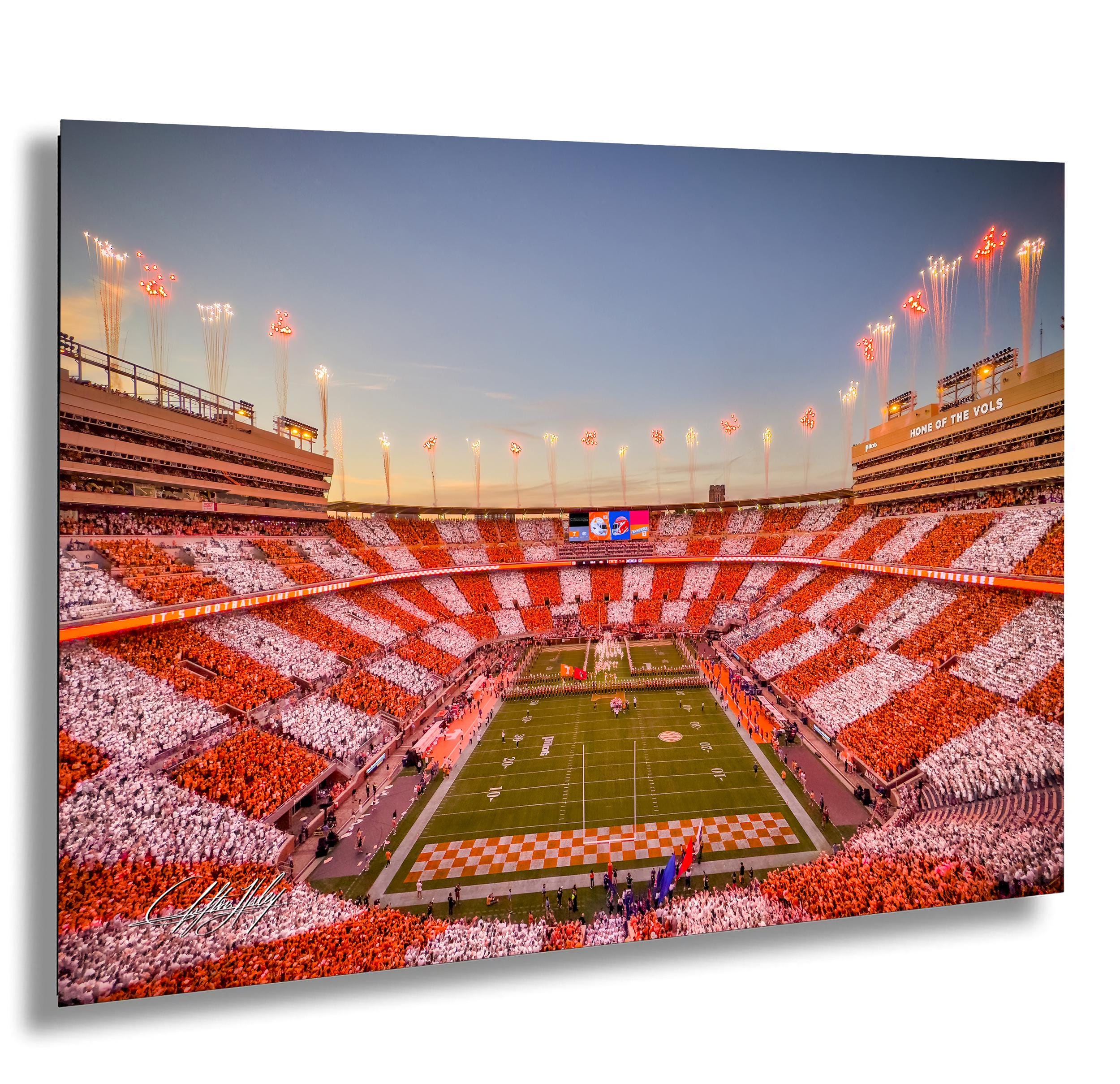 Celebrate the iconic UT Vols vs FL Gators overtime moment with this custom fine art featuring Neyland Stadium, checkerboard end zones, and fireworks lighting the sky. This exclusive artwork captures a defining football tradition at Neyland Stadium, showcasing the Tennessee Volunteers' grit and the electric atmosphere filled with orange white colors and cheers from vols faithful.
