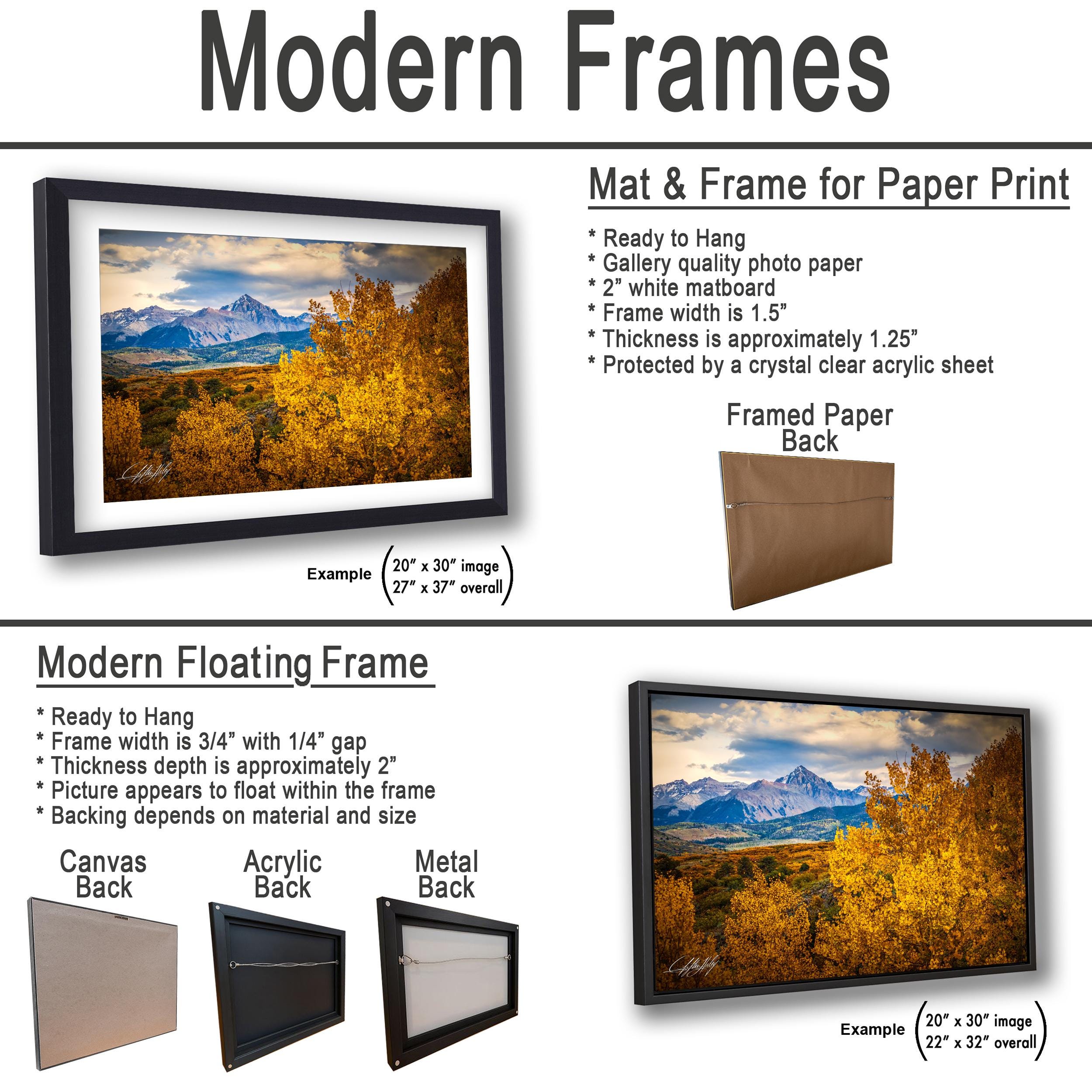 - 1. Framed paper, acrylic, and metal prints include a 2" white mat border - 2. Canvas prints are mounted flush with no mat border - 3. Processing times vary due to handmade nature; please allow time for careful creation and shipping