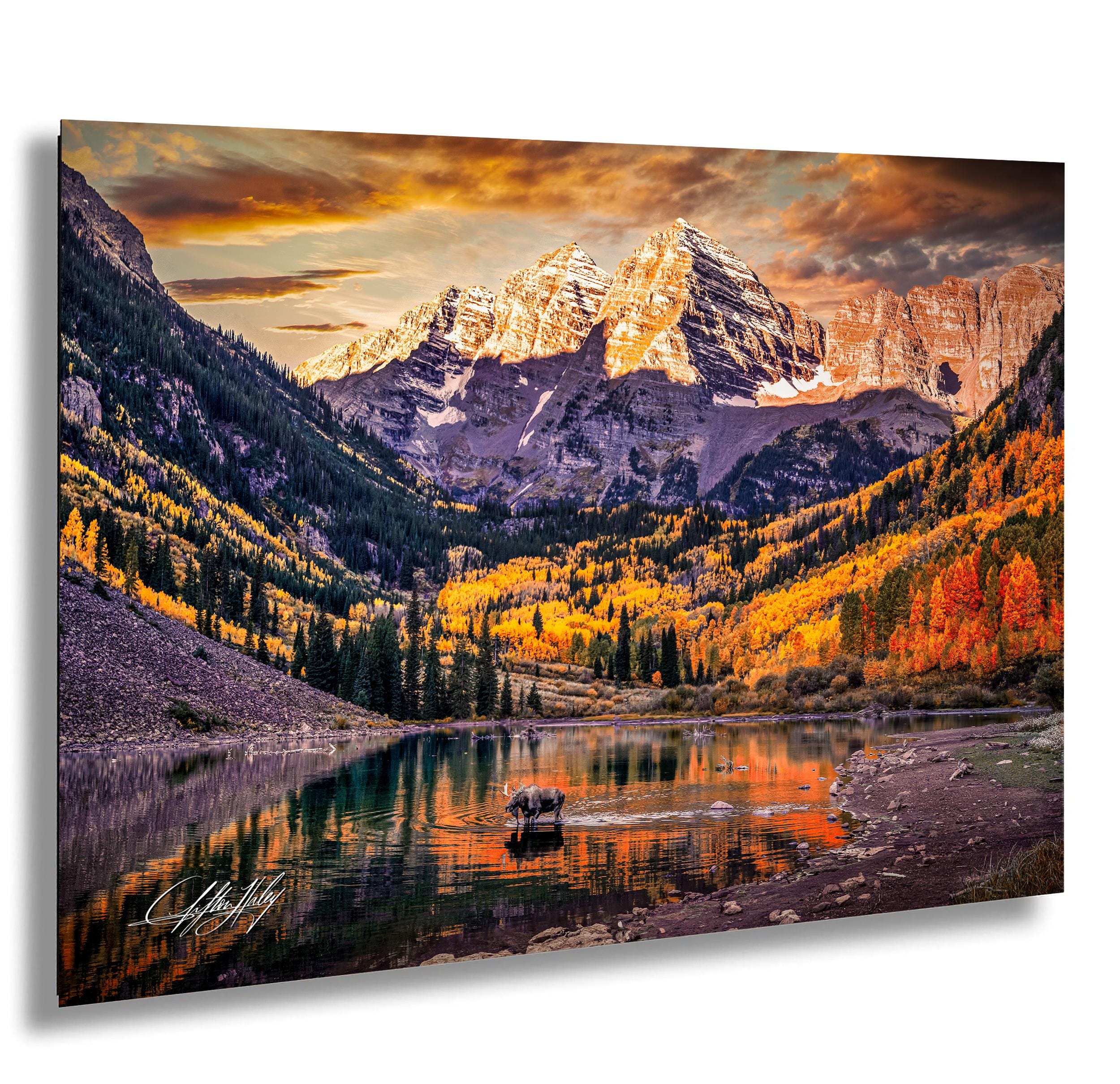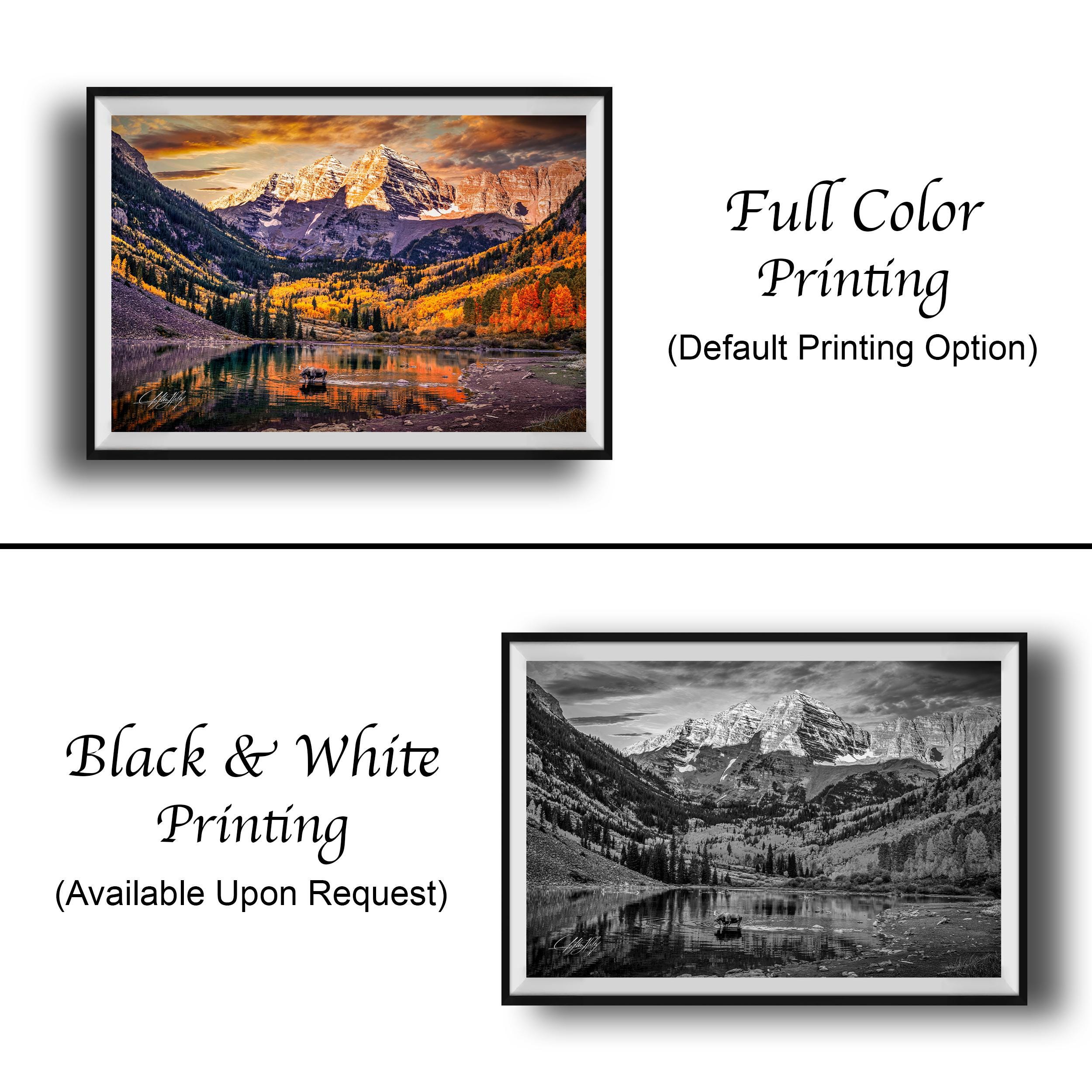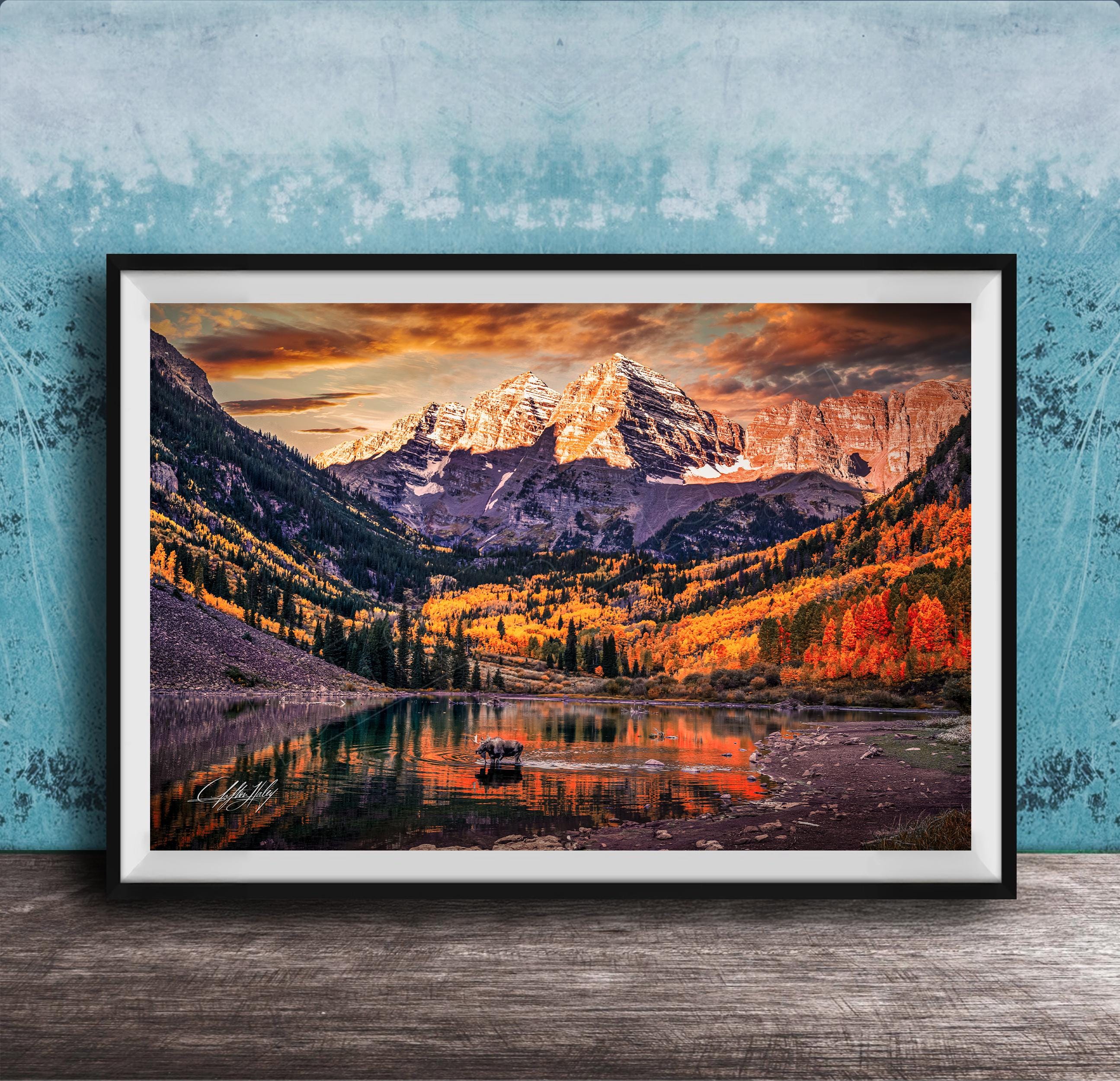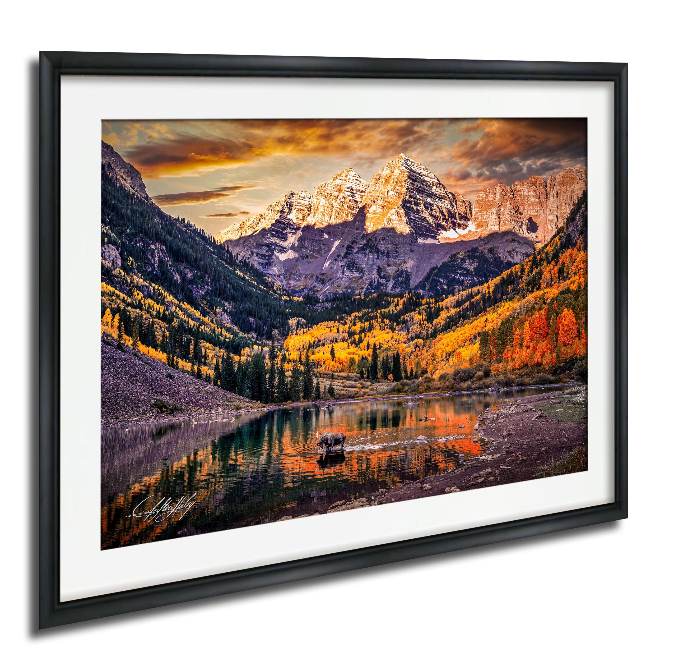 Discover the breathtaking beauty of Colorado's autumn with this exquisite Maroon Bells art print. Showcasing a majestic bull moose amidst golden aspen trees, this autumn canvas art perfectly embodies the essence of colorado mountain landscapes and the vibrant aspen fall photo hues that define the season.