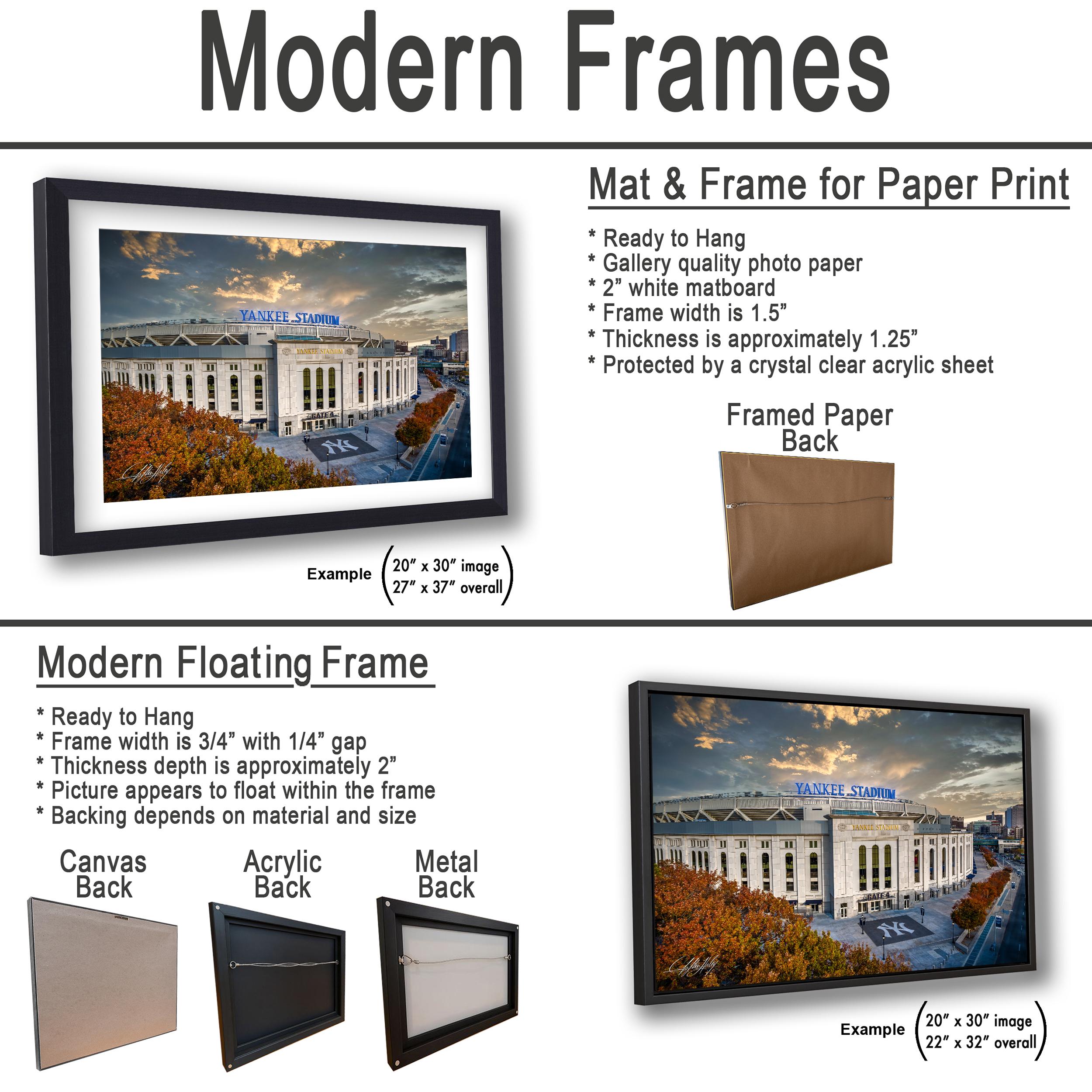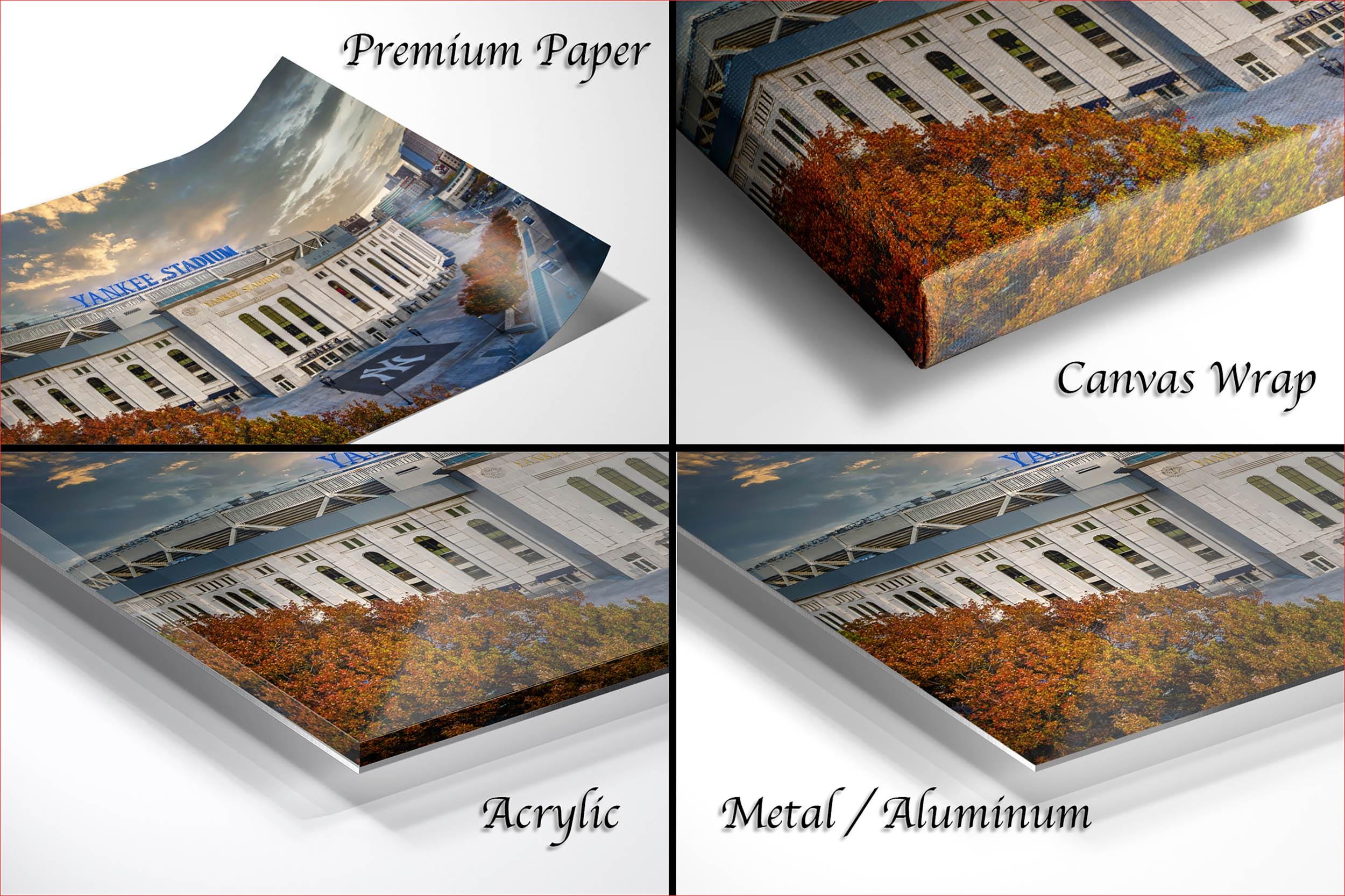 Crafted with attention to detail, this artwork is available as framed paper prints, acrylics, aluminum/metal prints with a 2" white mat border, or canvas prints that are flush mounted without a mat. Each option showcases the legendary "House that Ruth Built" in vivid color and crisp clarity, making it an ideal sports fan gift or centerpiece for your collection.