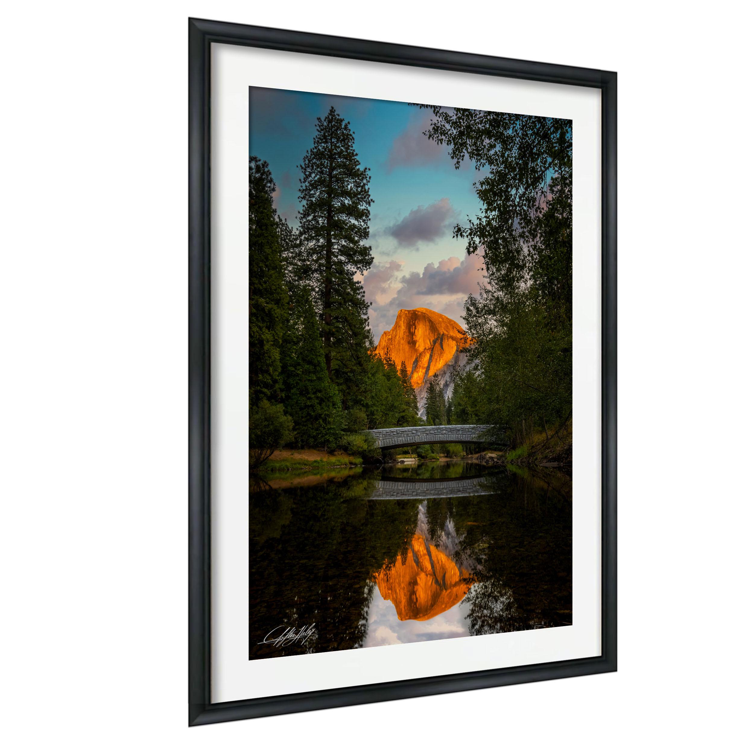 Experience the serene beauty of Yosemite with this Yosemite Sentinel Bridge poster, capturing Half Dome’s golden glow and its perfect reflection in the Merced River—a true scenic wall decor for hiking lovers and nature enthusiasts.