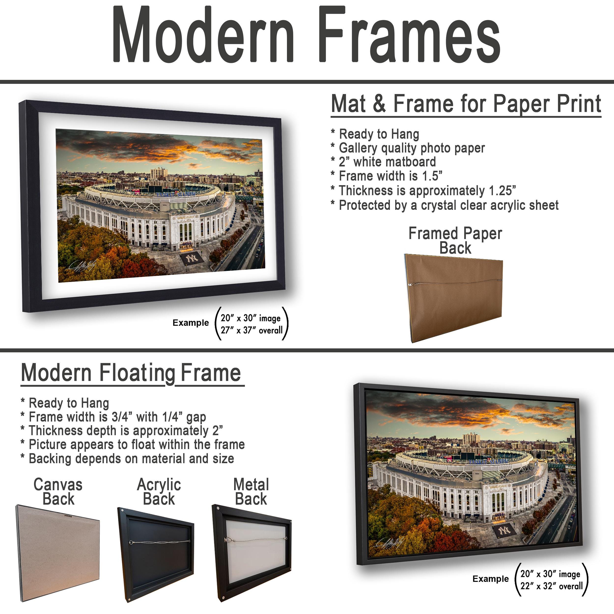 3.1) Only framed paper prints, acrylics and aluminum/metal prints will have a 2" white mat border. 3.2) Canvas prints will be a flush mounted (no mat border) to the frame.