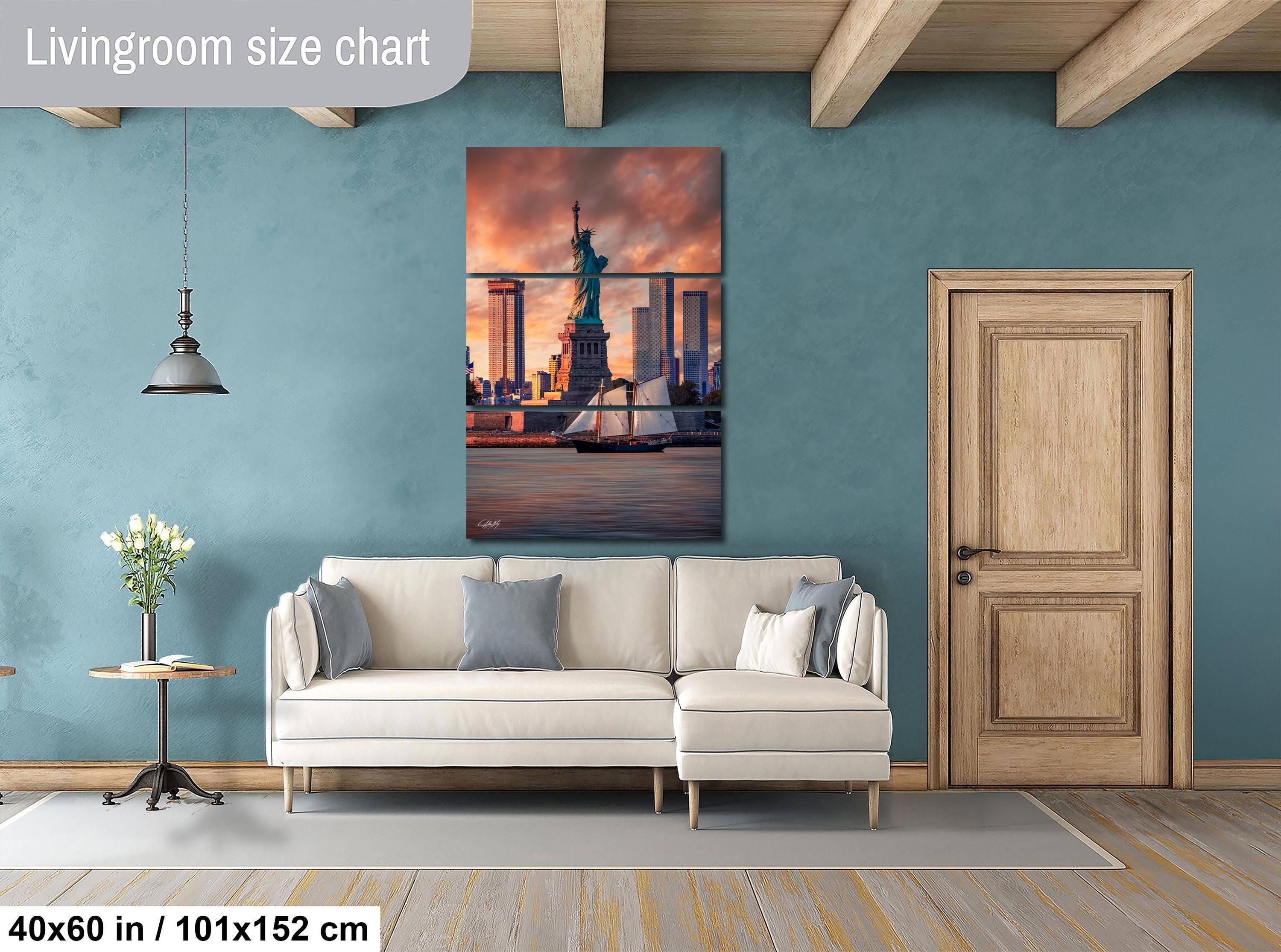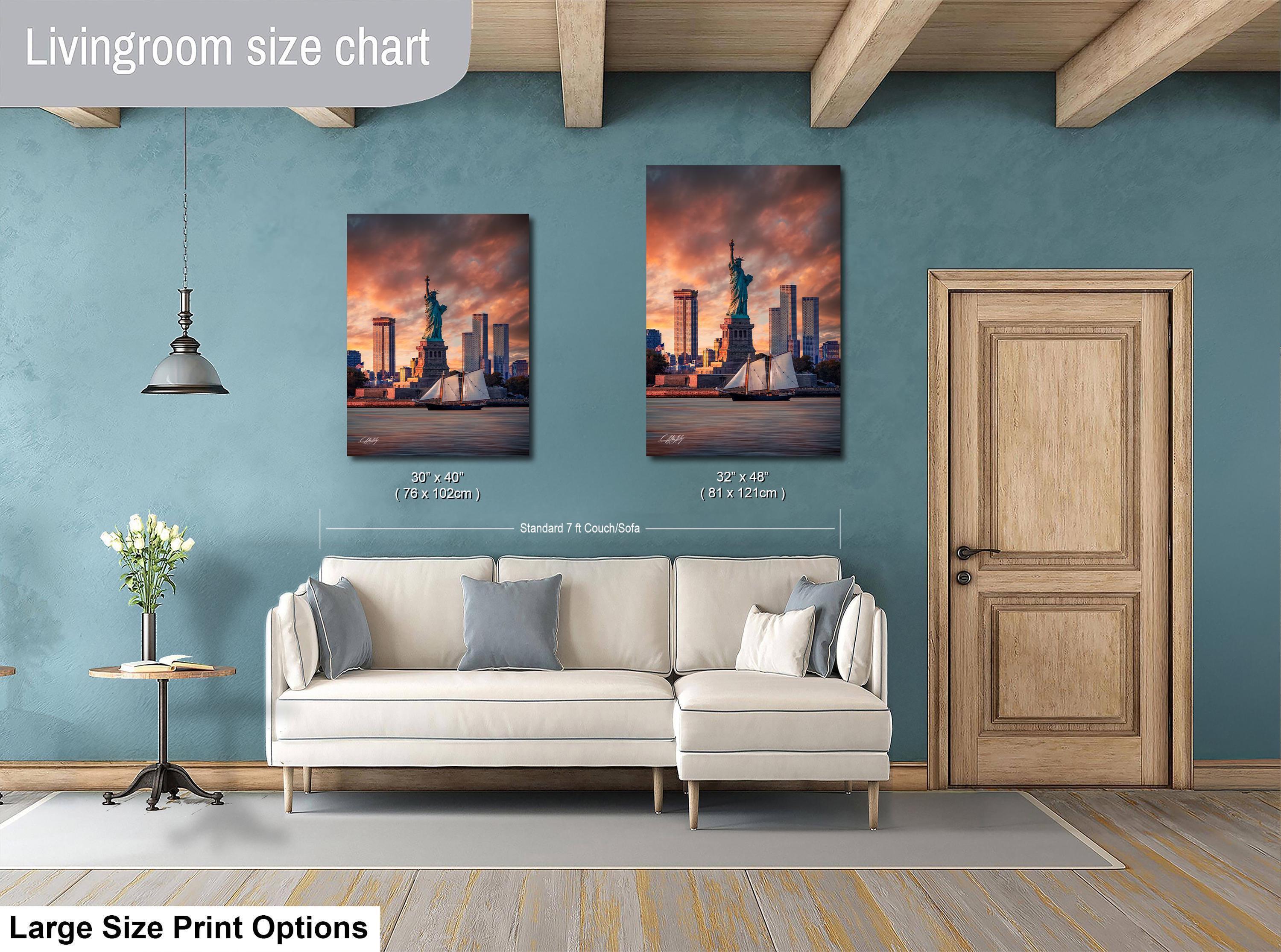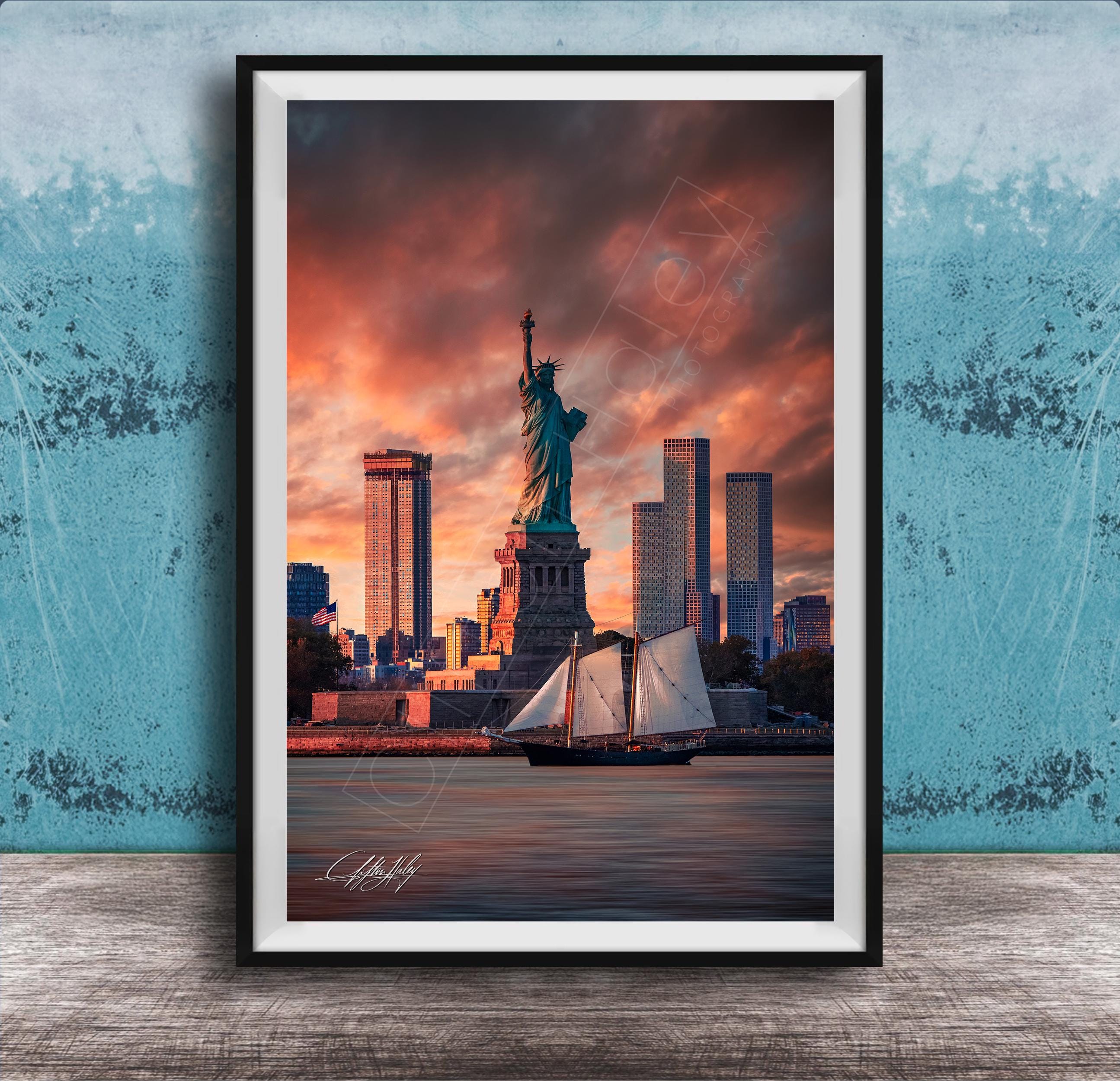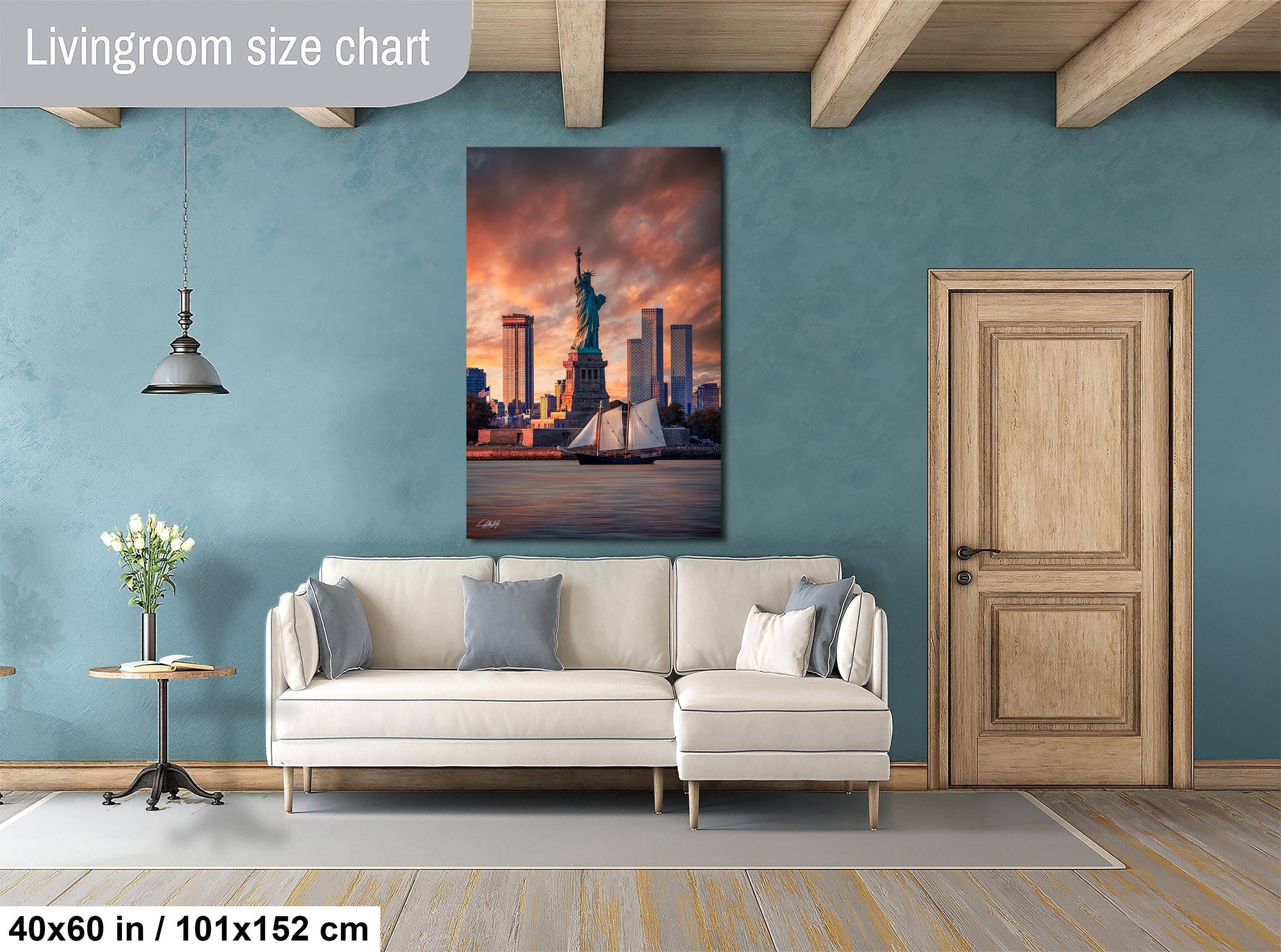 Celebrate the magic of New York City with this vibrant Statue of Liberty wall art. Featuring Lady Liberty set against a dramatic sunrise or sunset skyline, with a sailboat gliding through the scene, this print blends warm and cool tones for a striking, abstract cityscape. Perfect for fans of urban art and modern or mid-century decor, it brings bold energy and iconic beauty to any space.