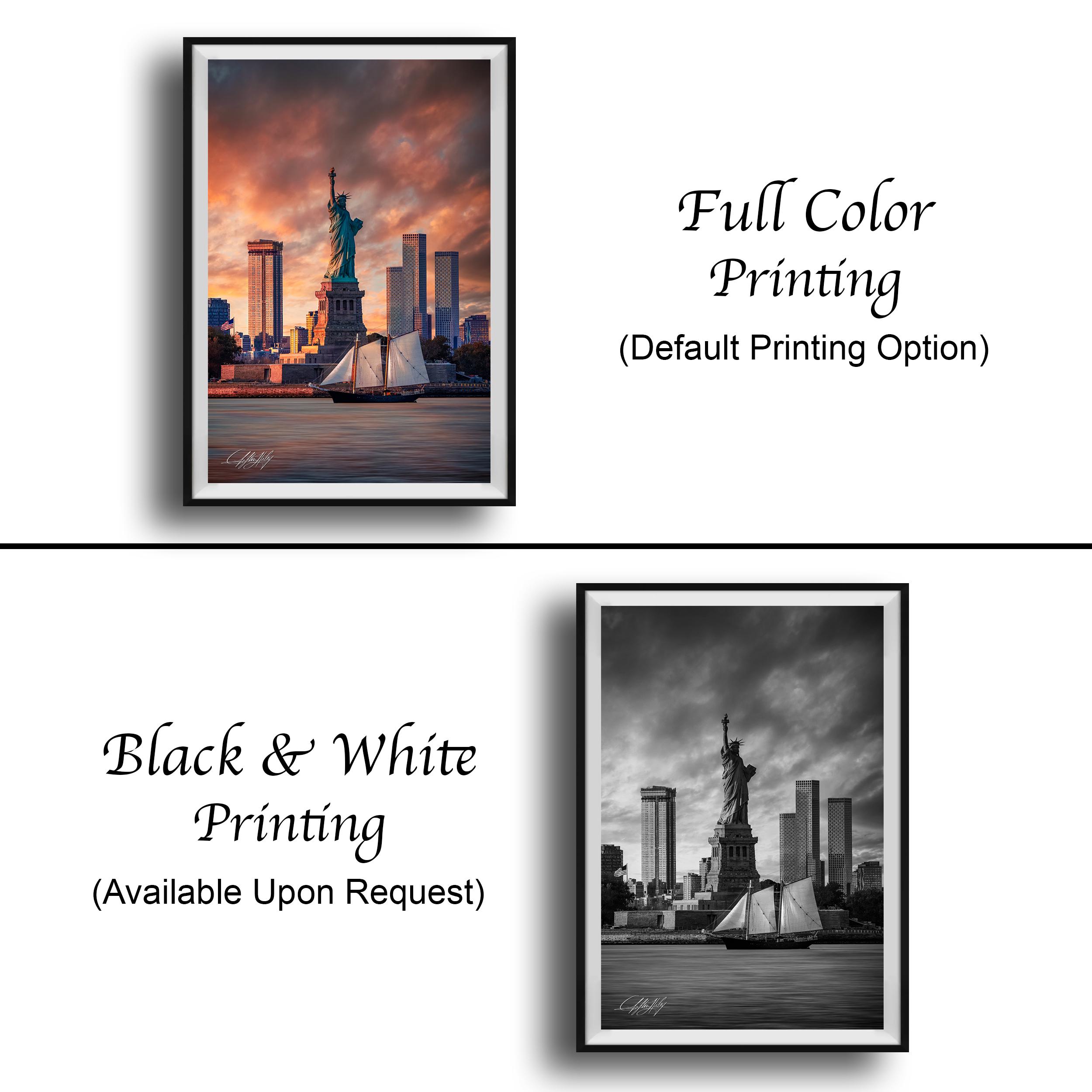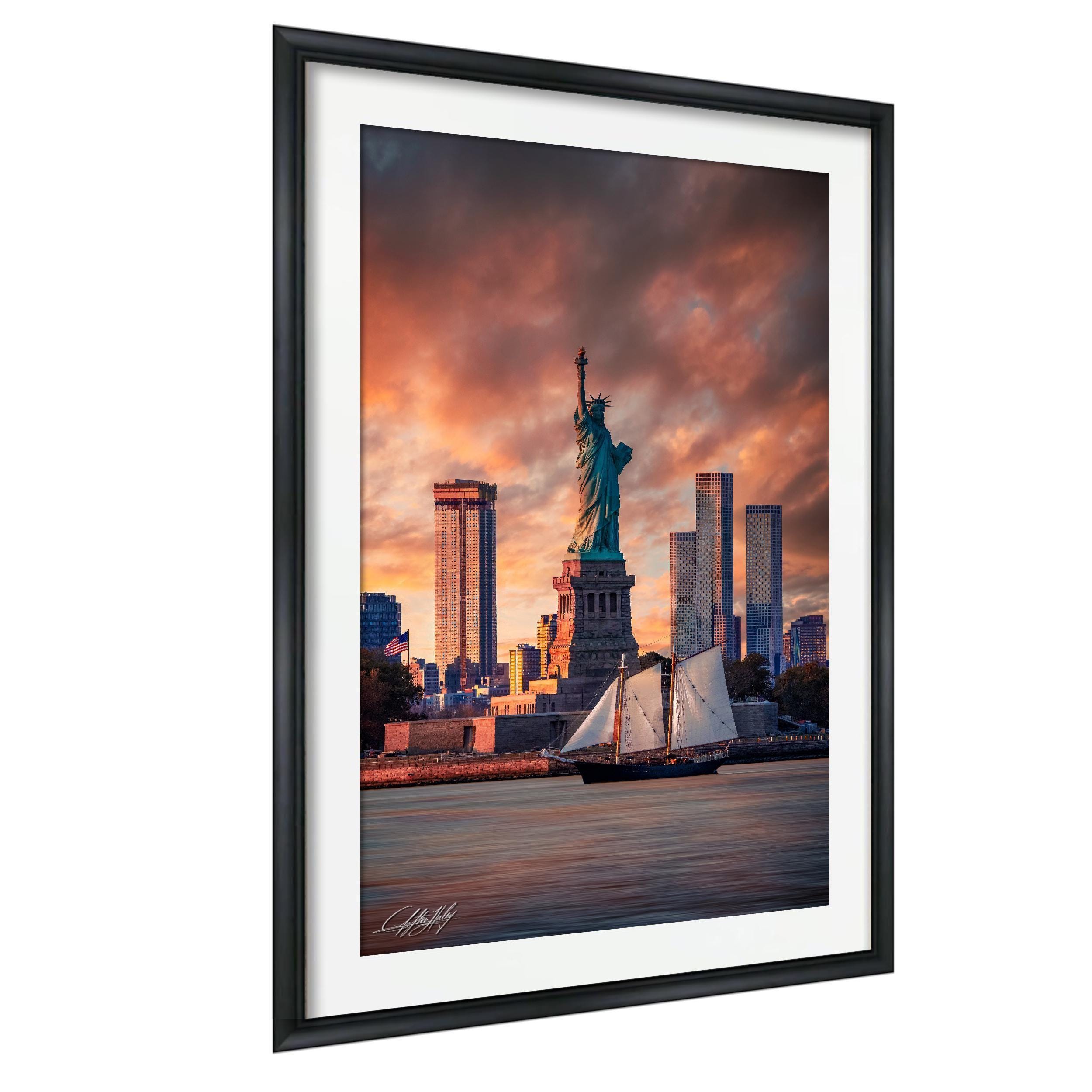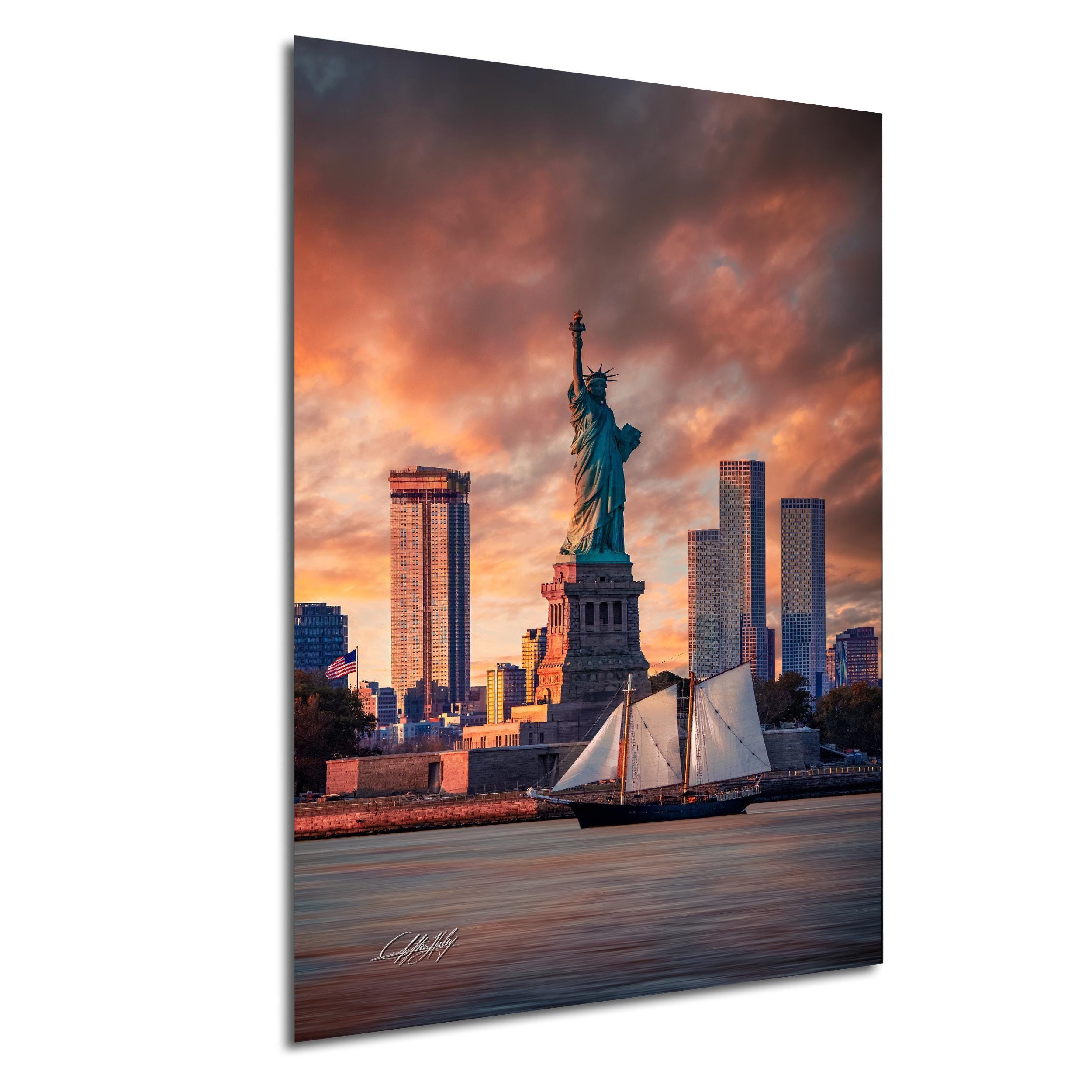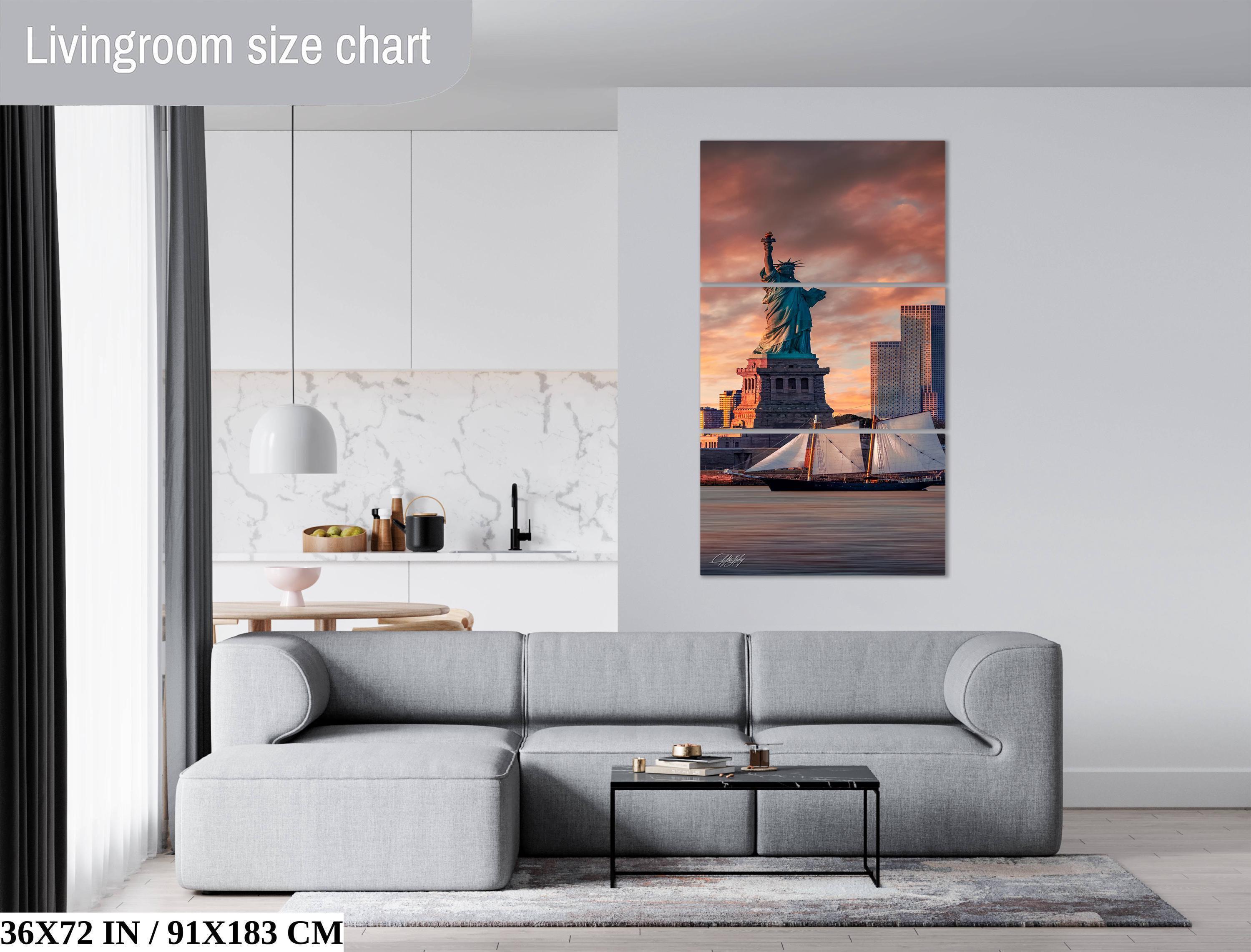 Celebrate the magic of New York City with this vibrant Statue of Liberty wall art. Featuring Lady Liberty set against a dramatic sunrise or sunset skyline, with a sailboat gliding through the scene, this print blends warm and cool tones for a striking, abstract cityscape. Perfect for fans of urban art and modern or mid-century decor, it brings bold energy and iconic beauty to any space.