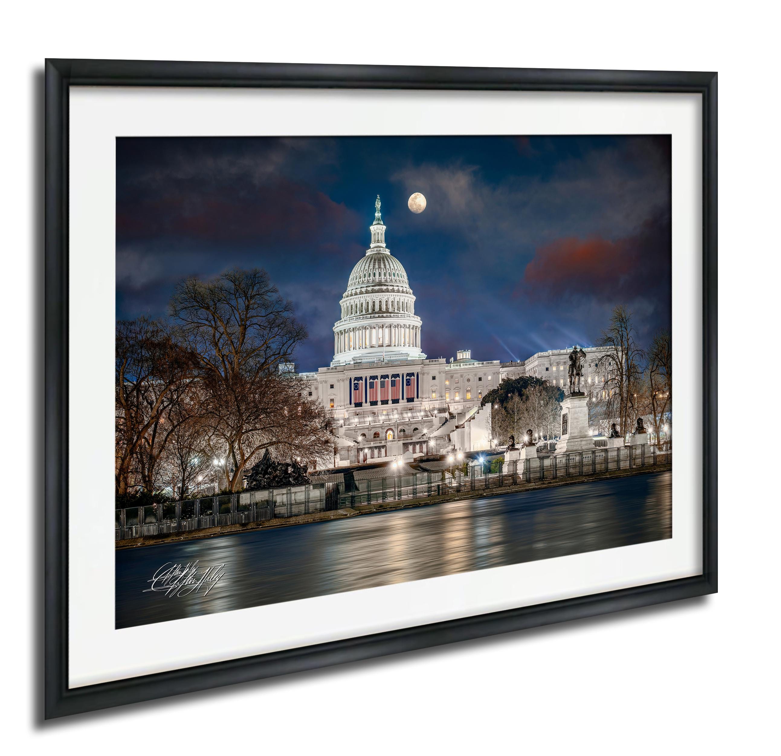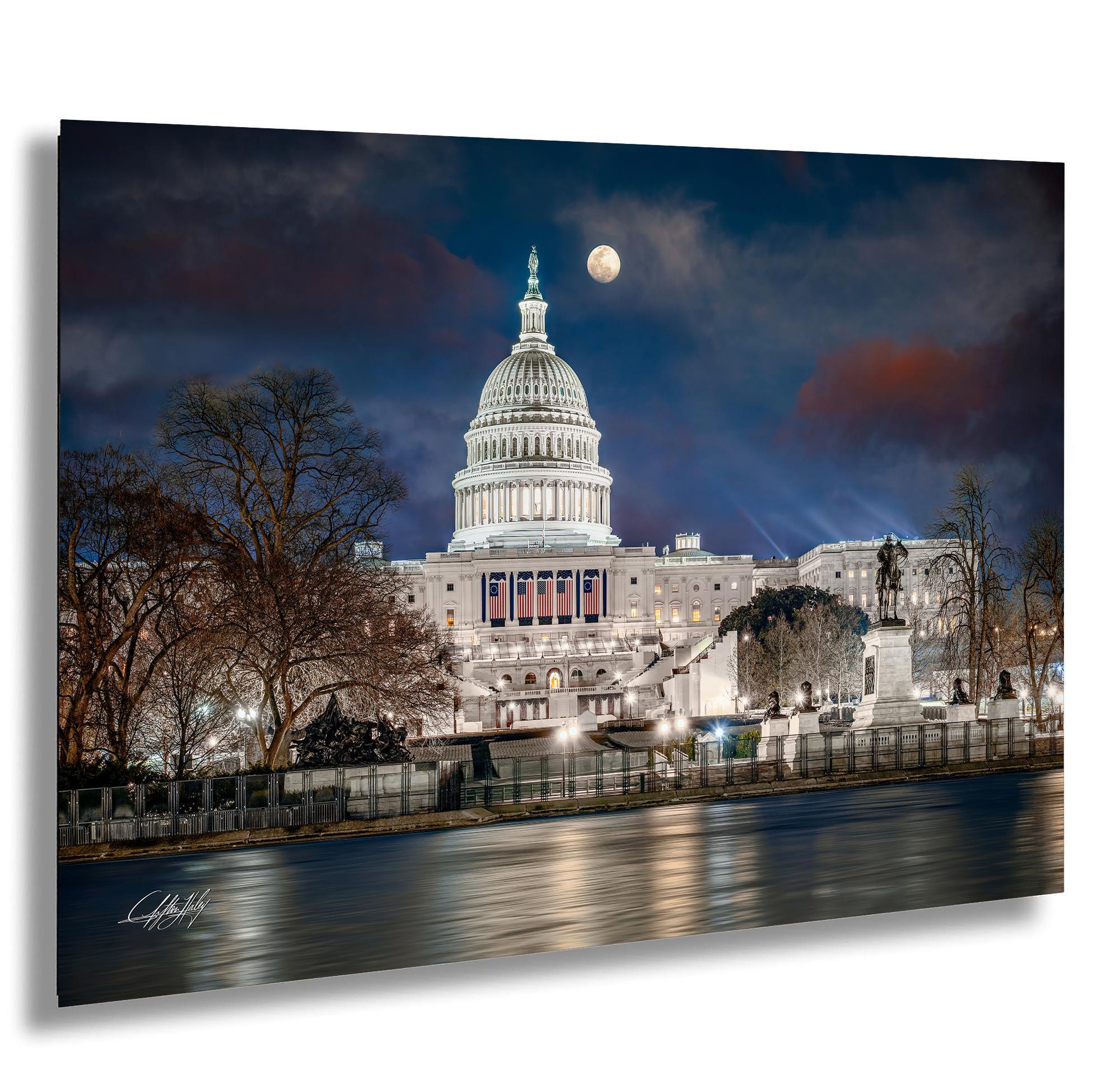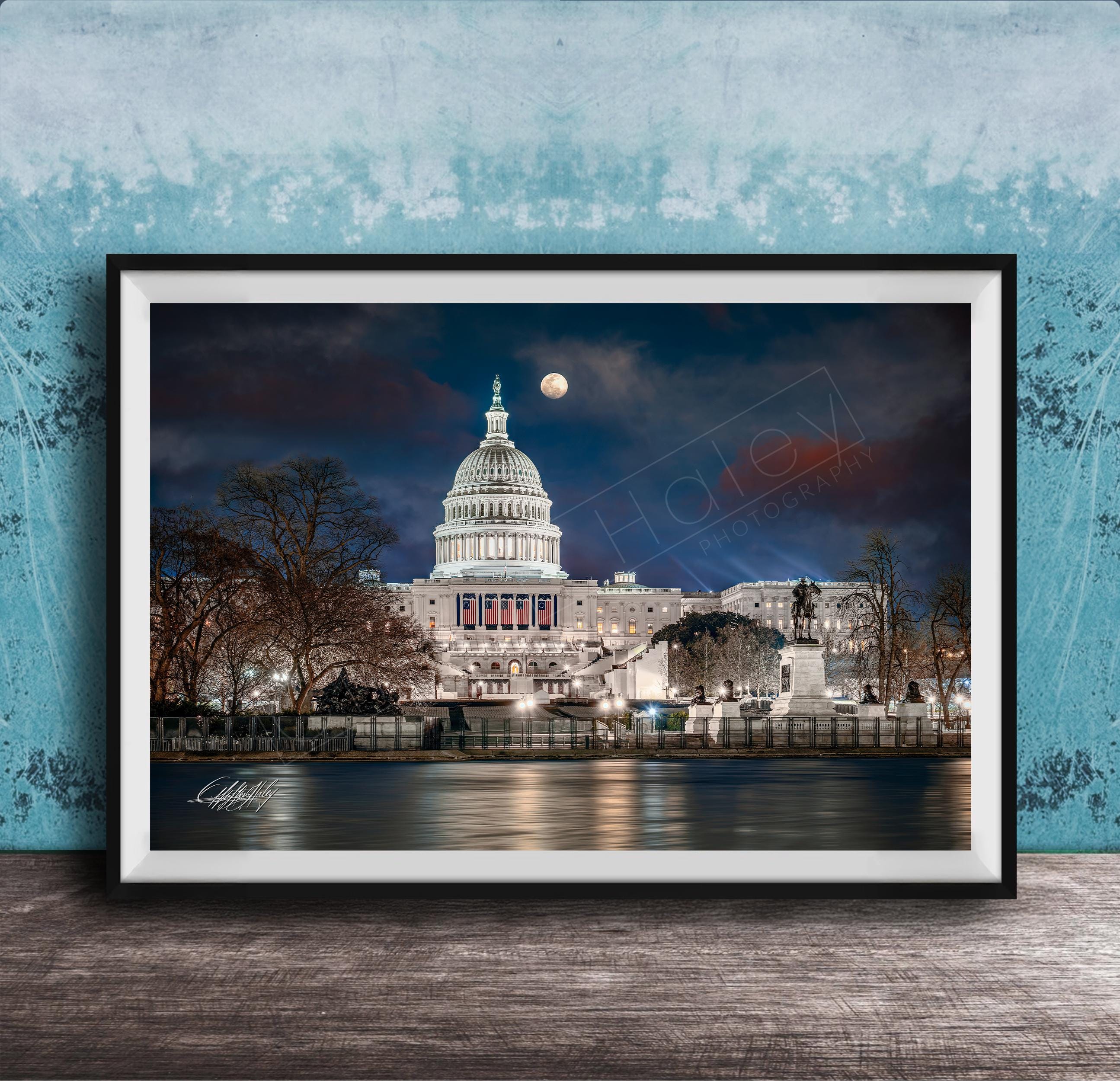 What secrets does the Capitol whisper under the glow of a full moon, framed by frozen waters and storied monuments? Standing before the Capitol Reflecting Pool, now a glistening sheet of ice, this artwork captures the perfect blend of history and nature. The Capitol Building, with its iconic dome aglow under the full moon, stands as a steadfast beacon in “The Federal City,” surrounded by silent guardians like the Ulysses S. Grant Memorial.