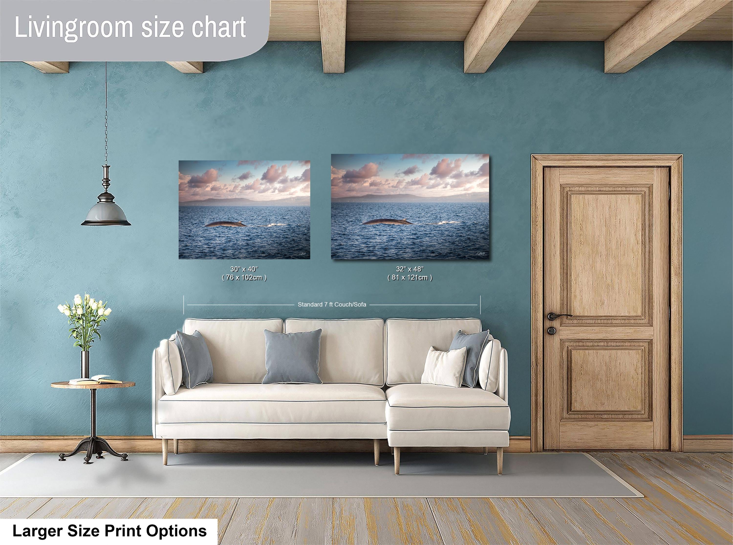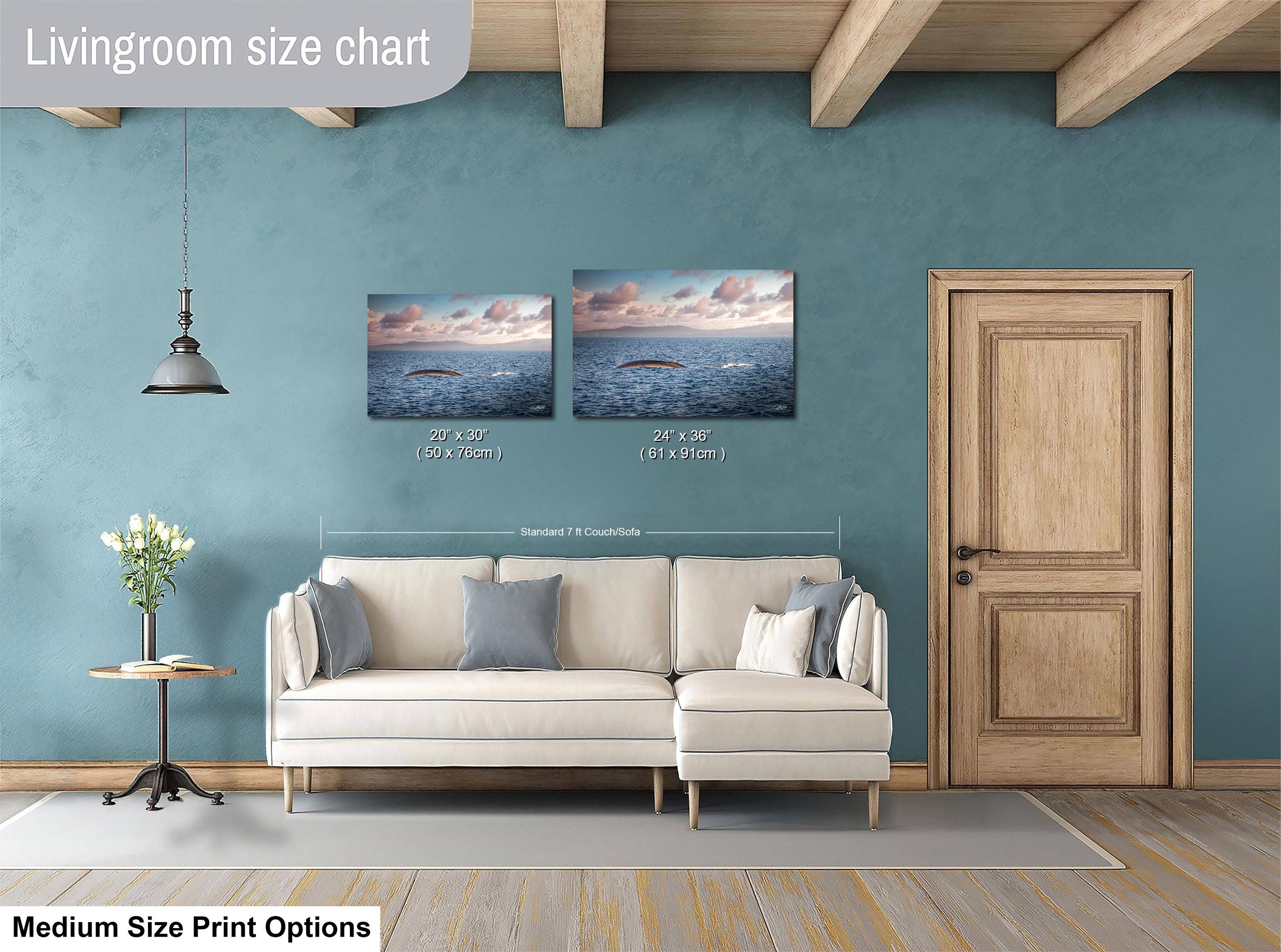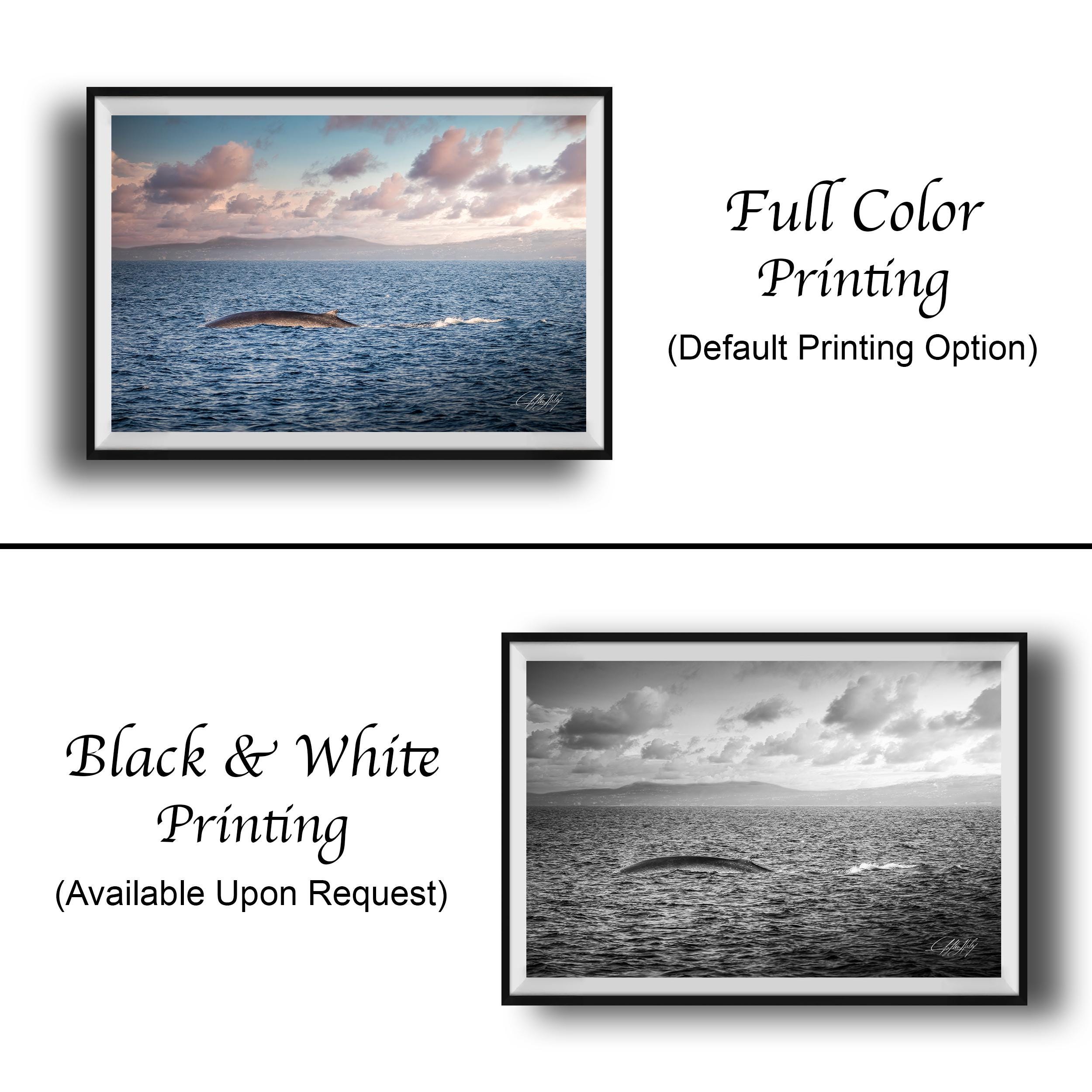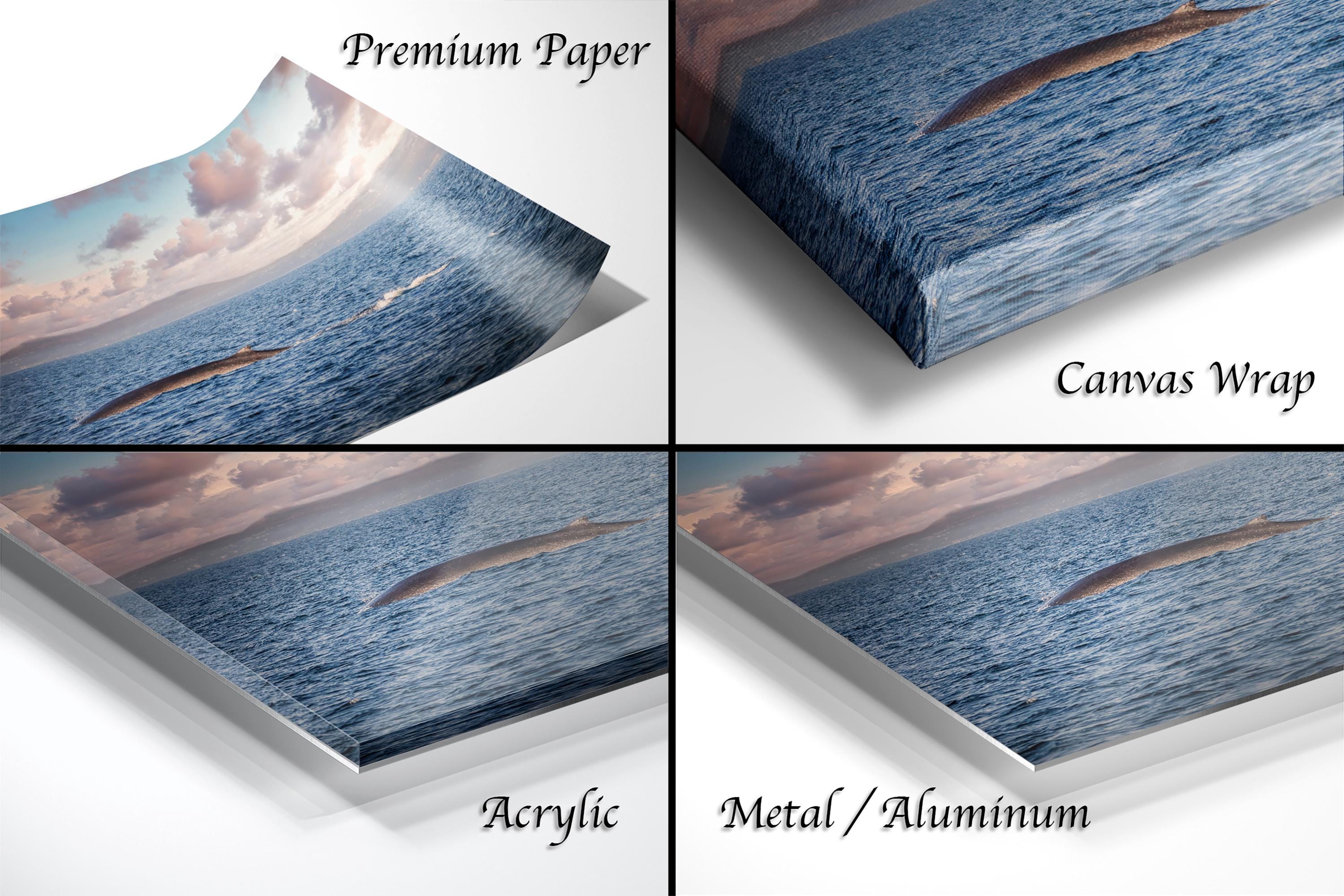 Key details: - Made-to-order custom fine art with no returns, but exchanges or replacements available if damaged - Framed paper prints, acrylics, and metal prints include a 2" white mat border; canvas prints are flush mounted without a mat - Perfect gift for whale watching enthusiasts or lovers of coastal living room accents