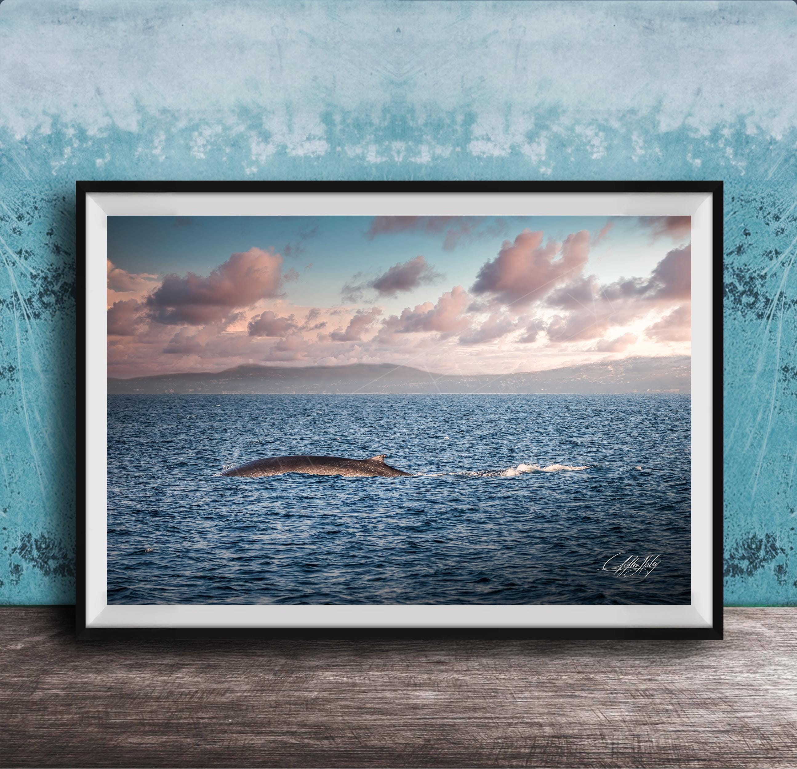 Fin Whale Pacific print captures the awe-inspiring moment when a majestic fin whale rises from the ocean depths, bringing the serene beauty of marine wildlife into your coastal living room. This baleen whale wall art reflects the golden hour glow over the Pacific Ocean, perfect for adding a tranquil oceanside home accent.