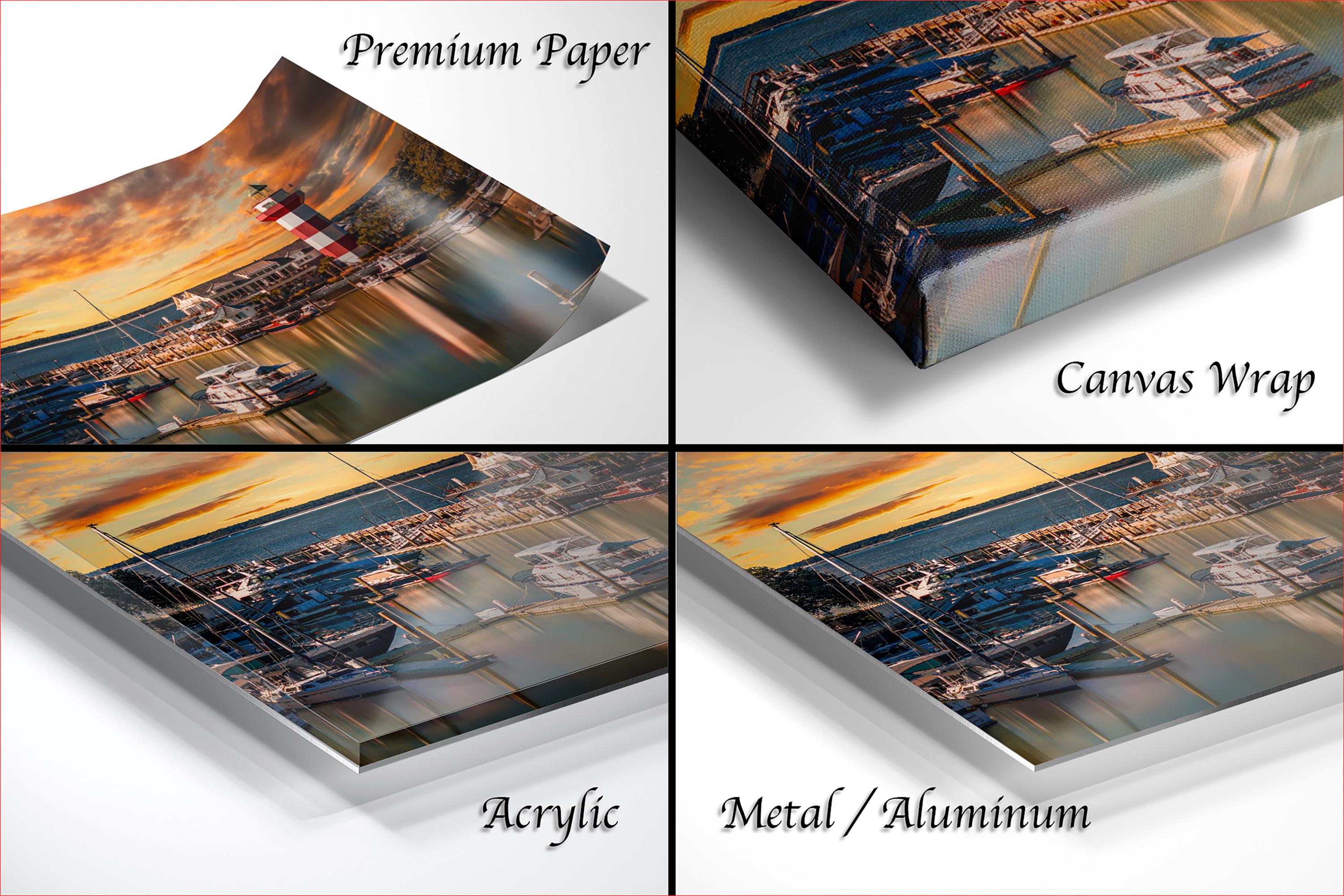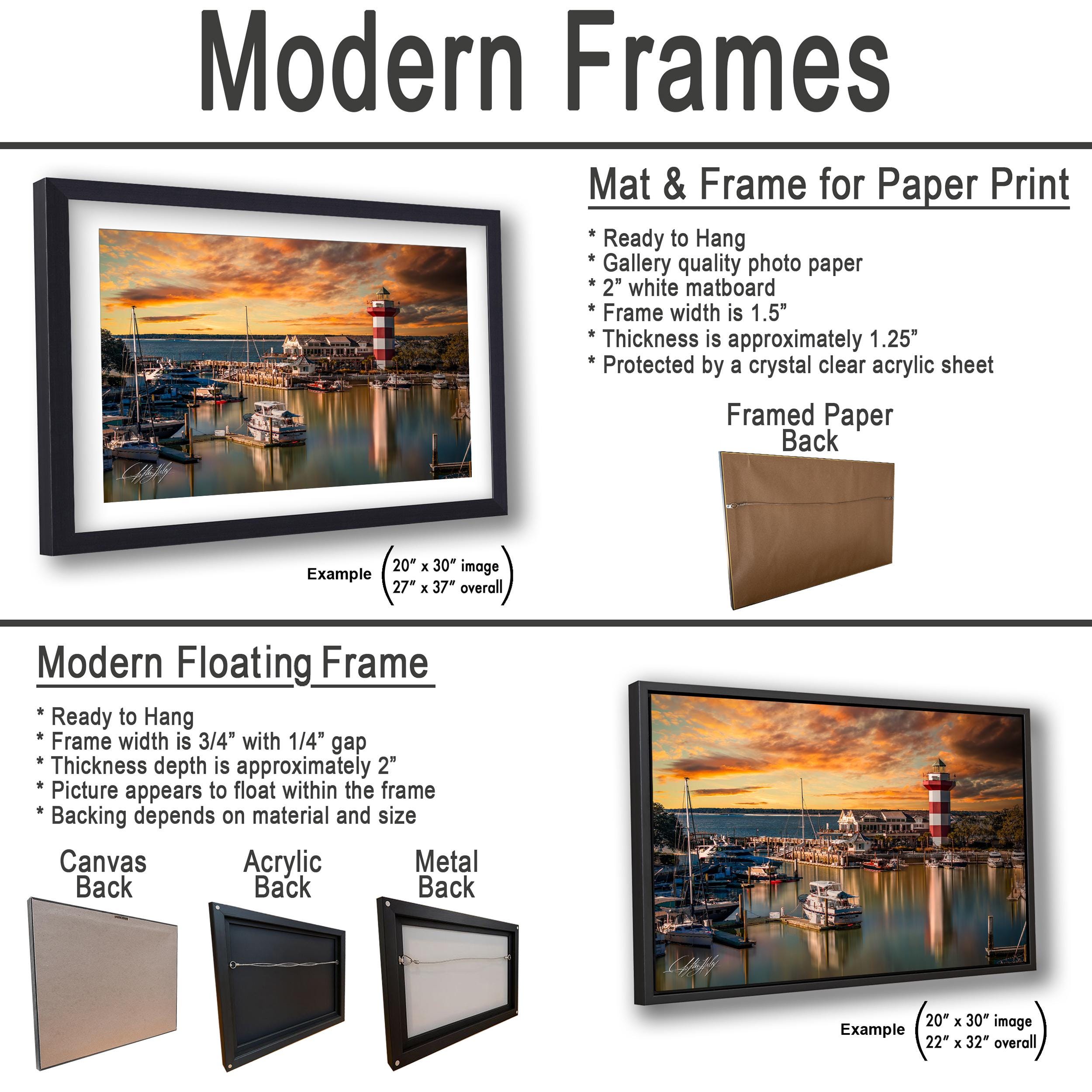 3.1) Only framed paper prints, acrylics and aluminum/metal prints will have a 2" white mat border. 3.2) Canvas prints will be a flush mounted (no mat border) to the frame.