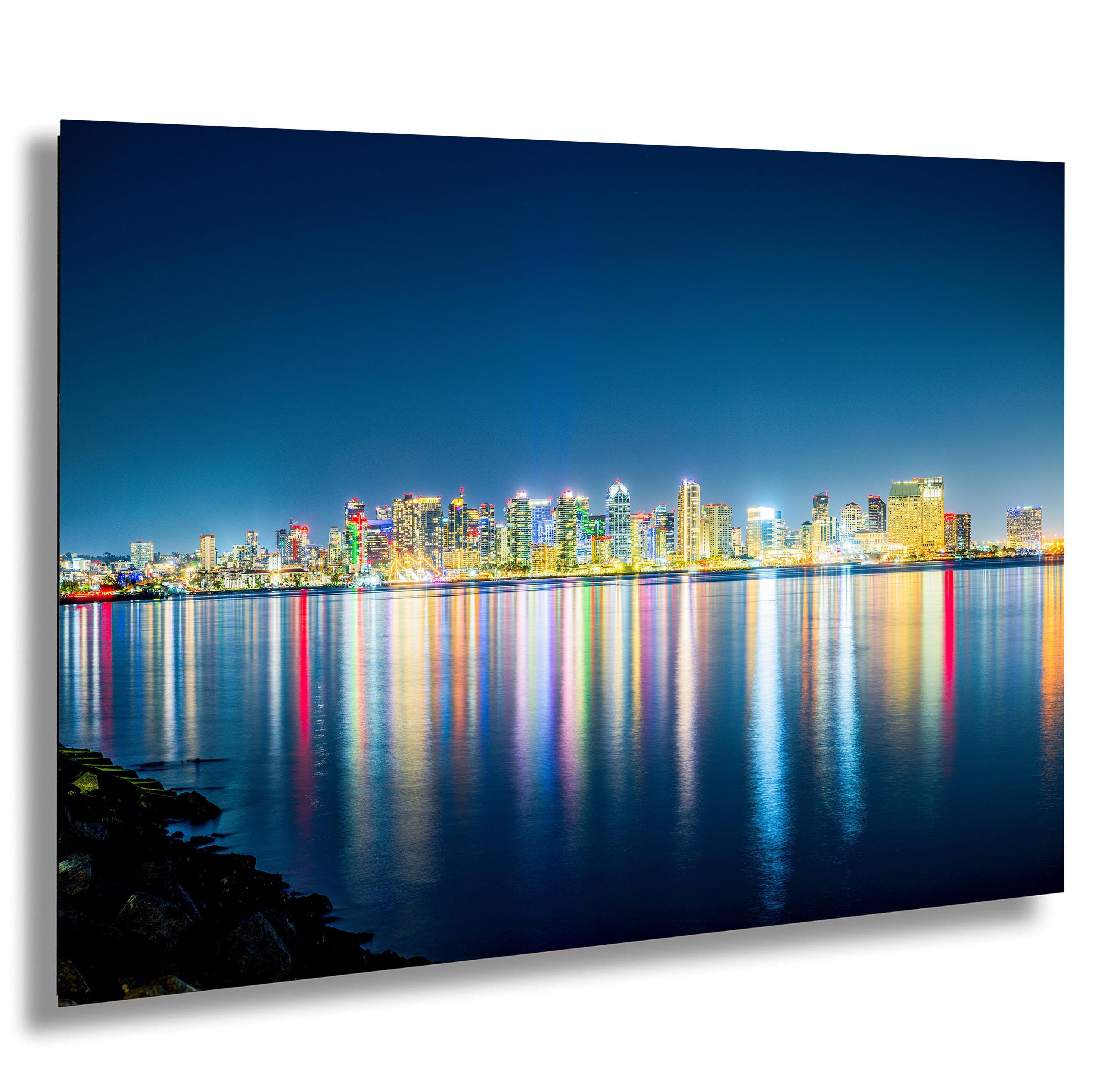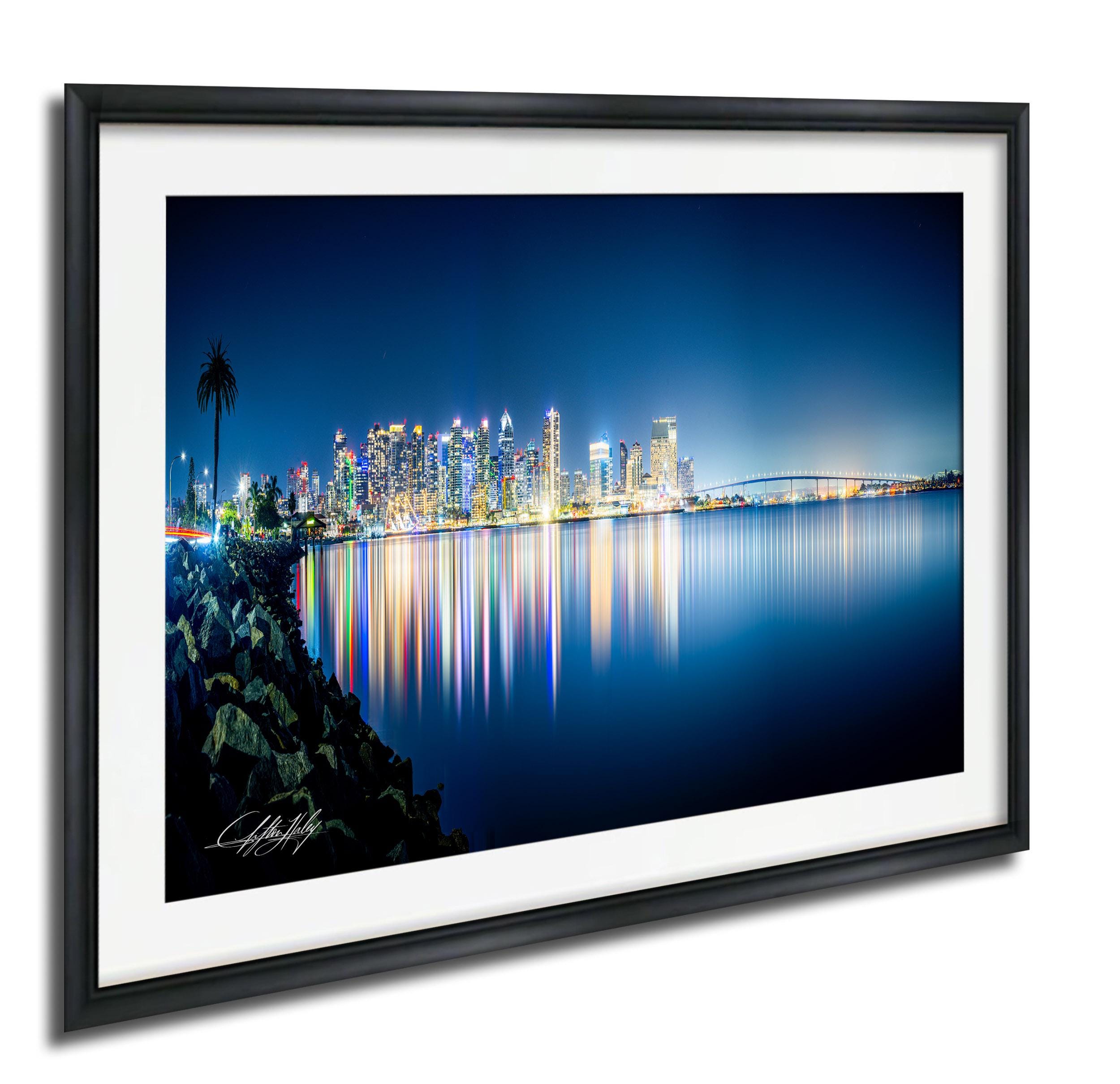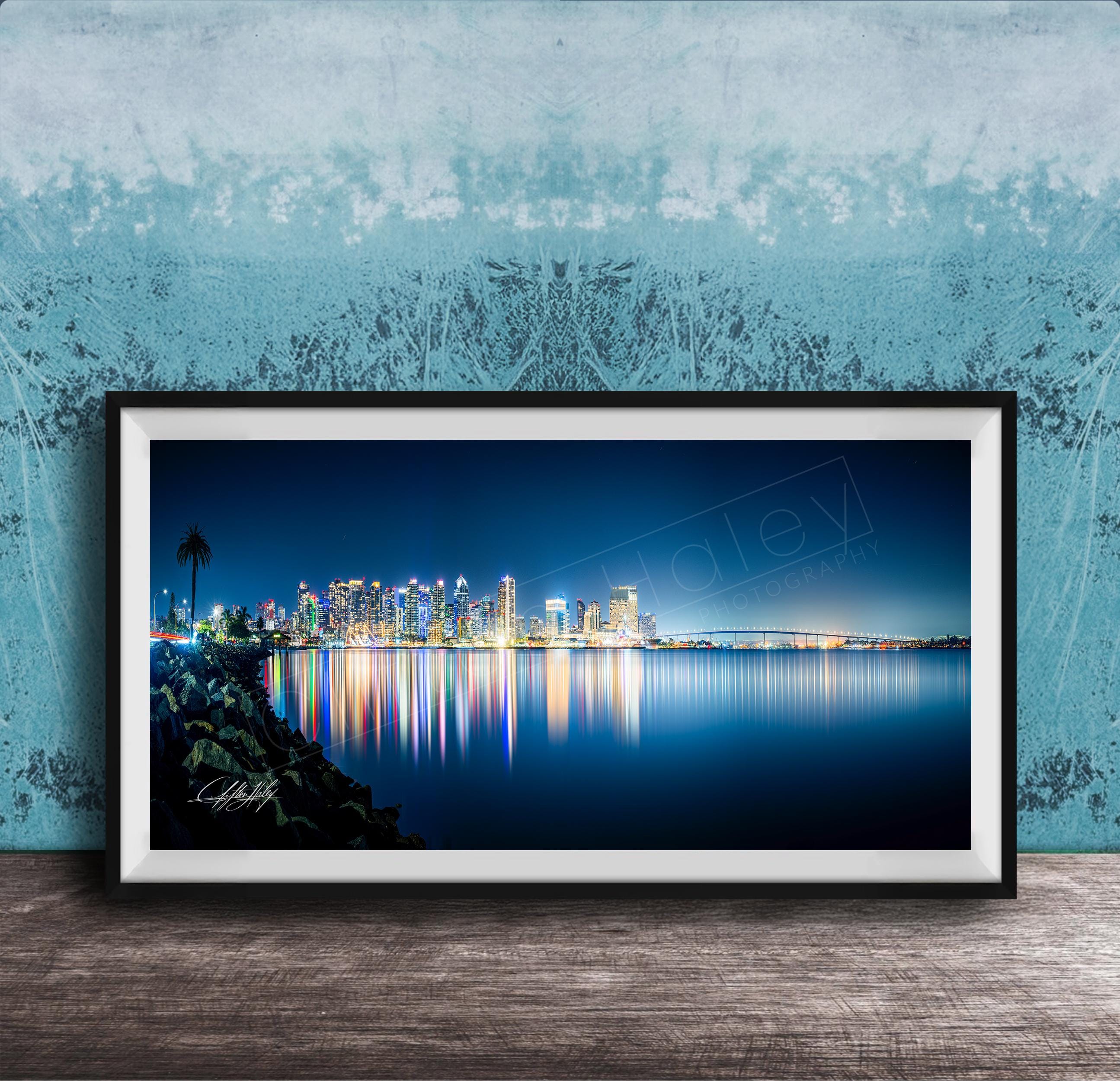 This custom fine art print celebrates San Diego’s rich history and dynamic skyline, making it an ideal travel memory or southwestern decor addition. The artwork reflects the serene beauty of San Diego Bay, with the city lights mirrored on the water, evoking a peaceful yet lively atmosphere.