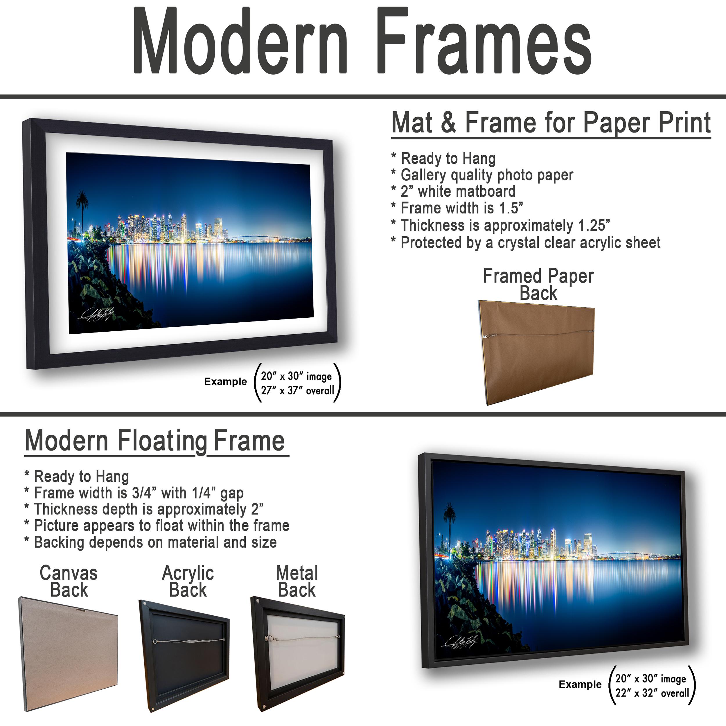 - Framed paper prints, acrylics, and metal prints include a 2" white mat border for an elegant finish.