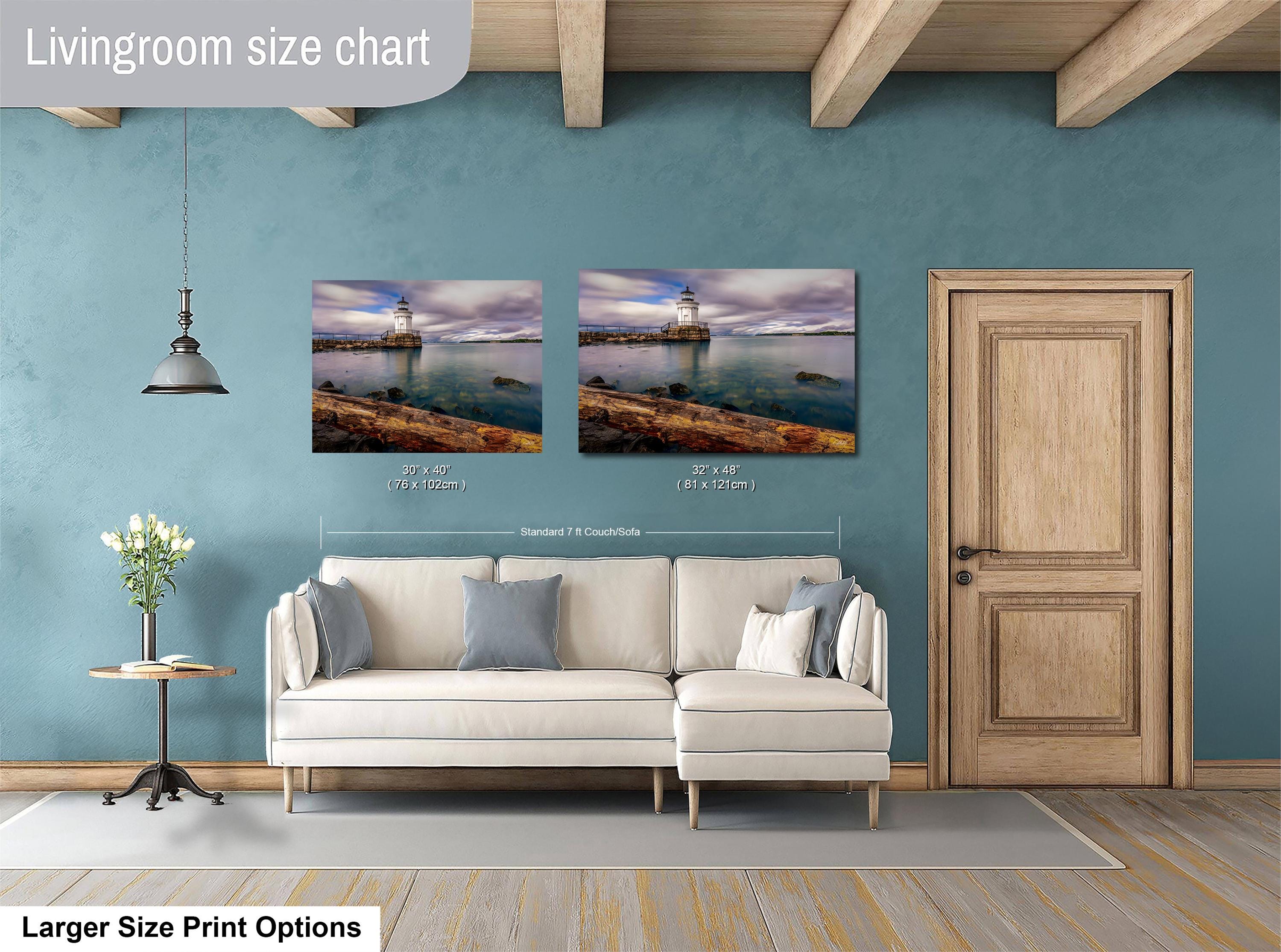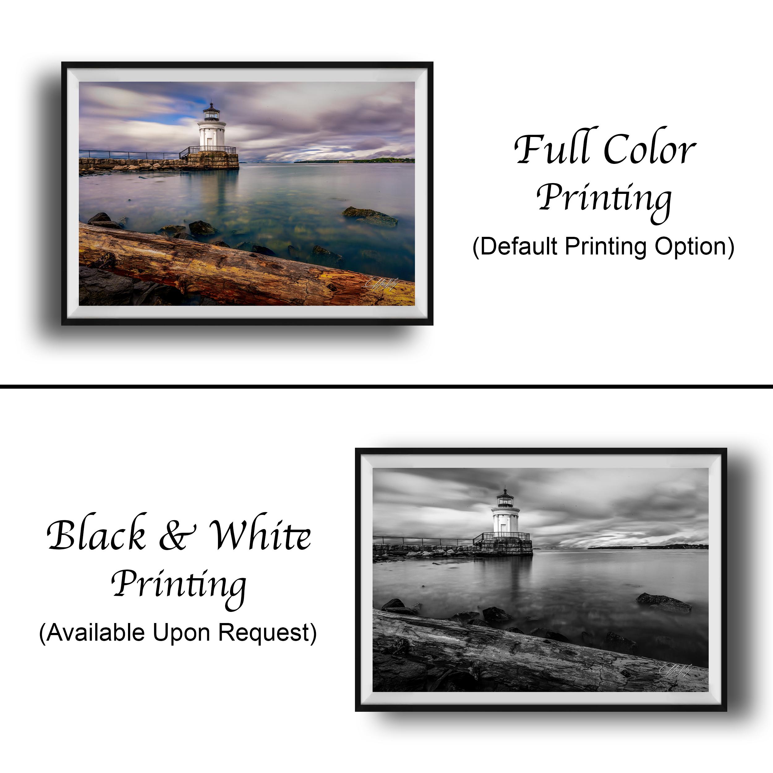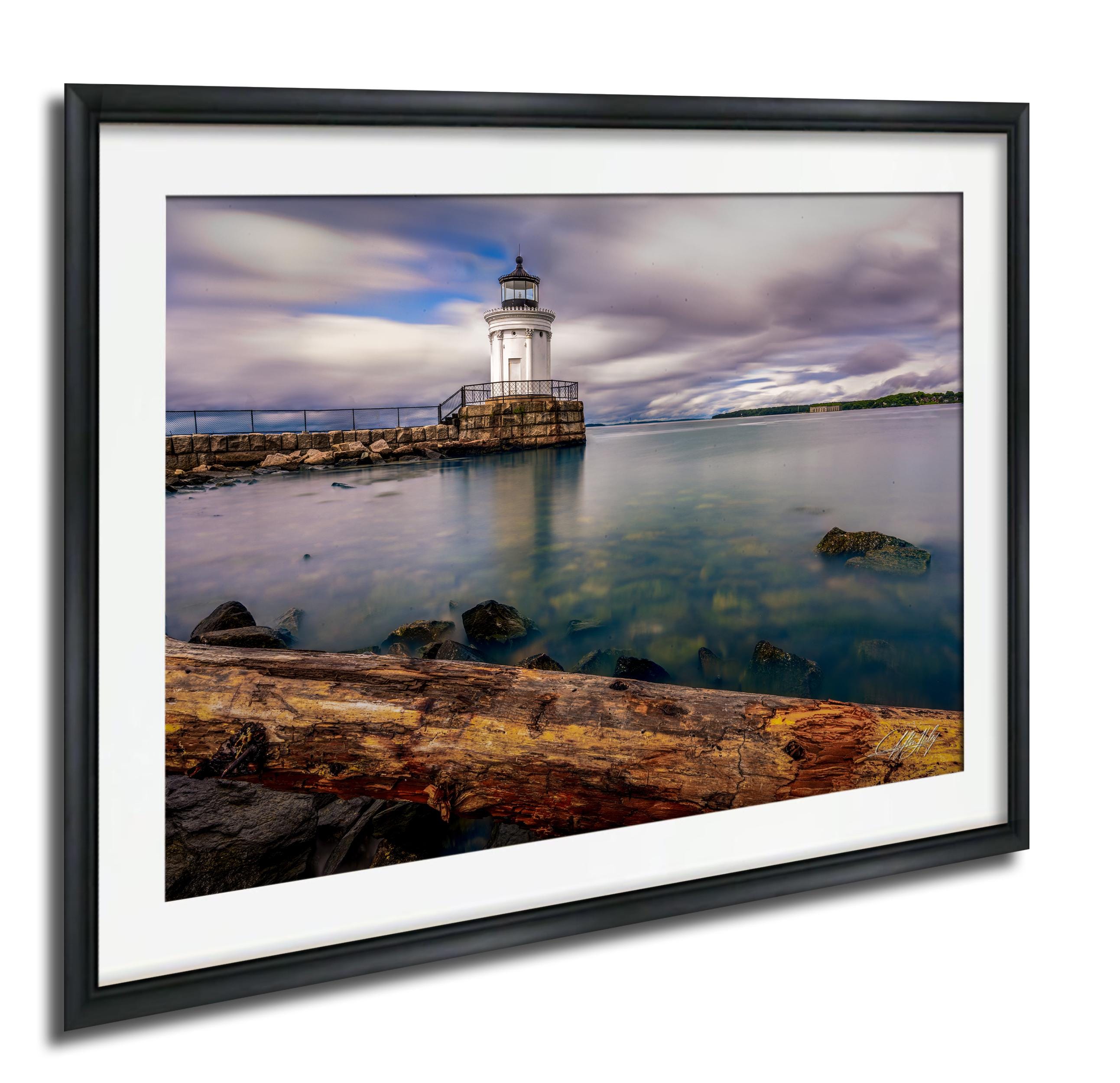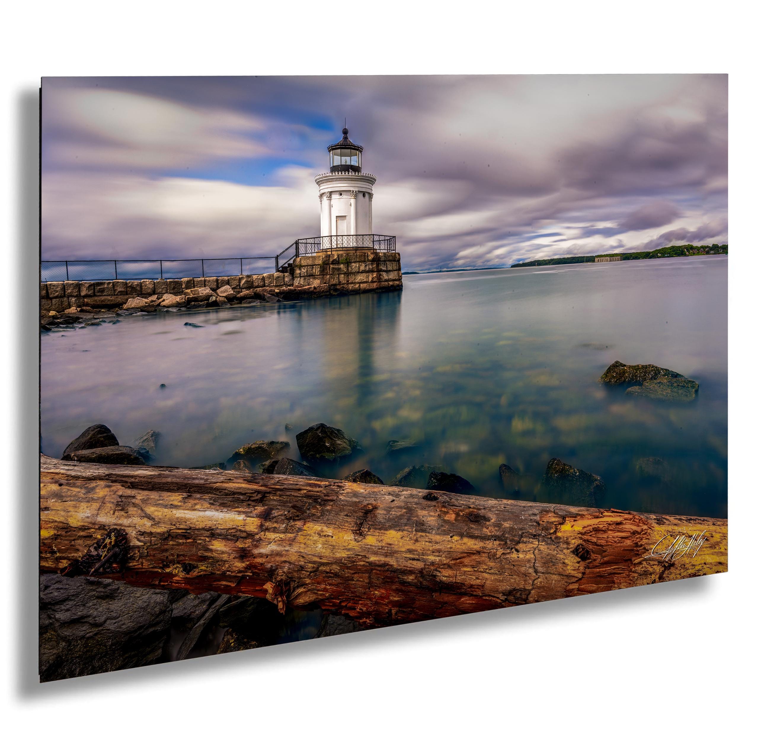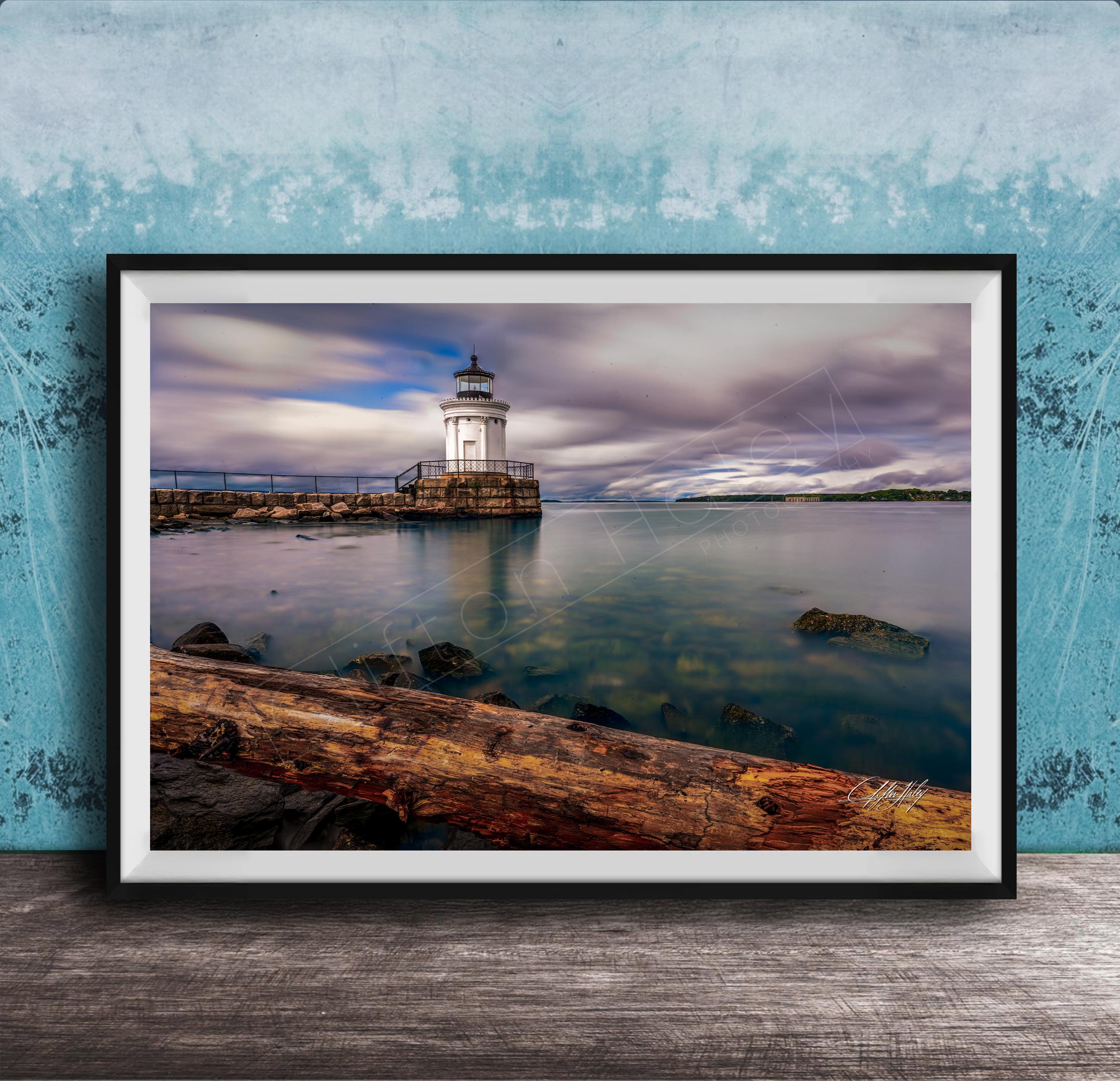 Discover the serene beauty of Bug Head Lighthouse captured in this fine art photography print, a timeless seascape from Portland, Maine. This nautical wall art brings the peaceful essence of Portland Harbor into your home, perfect for lovers of coastal home decor and maritime history.