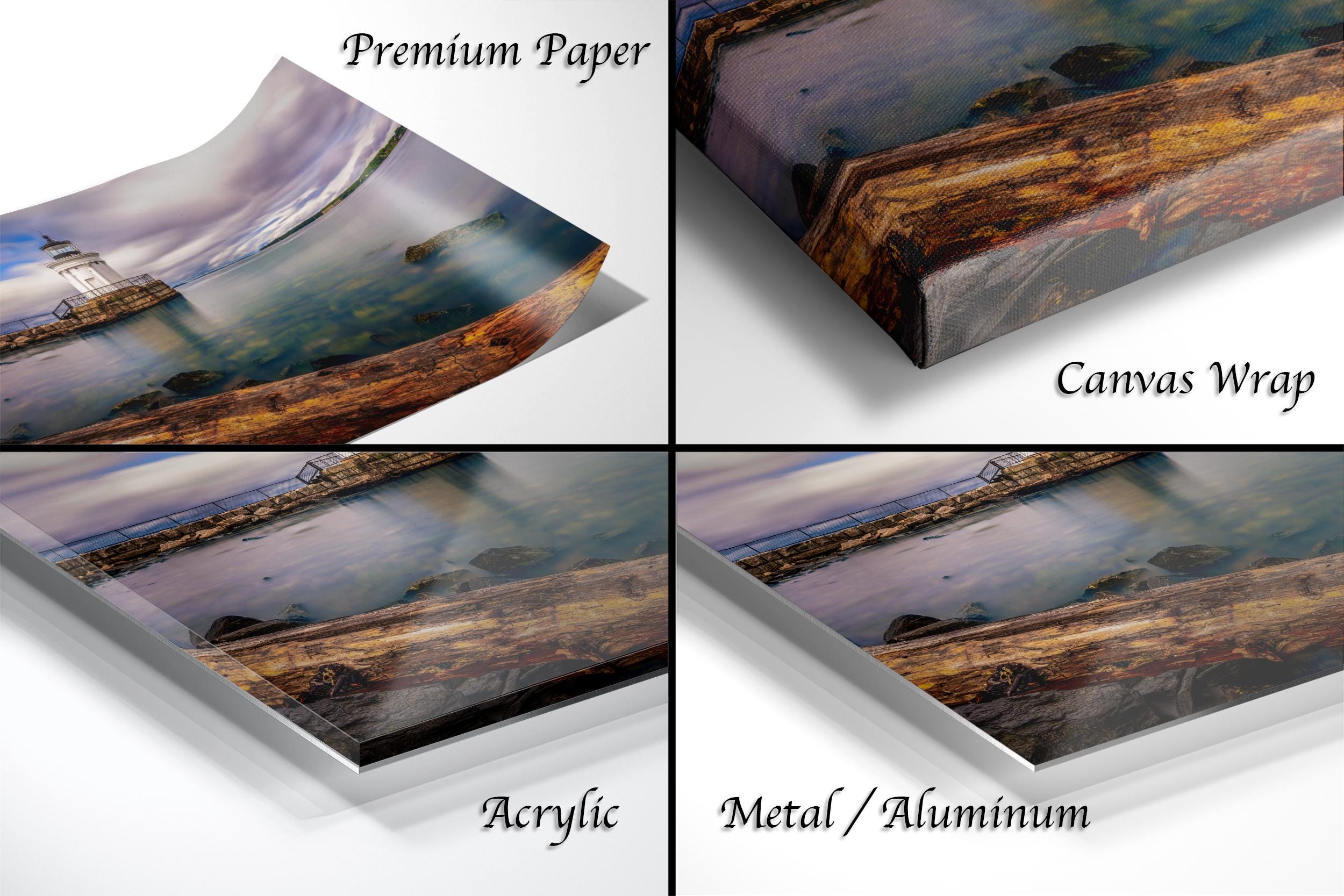 Each piece is made-to-order and signed by the artist in the bottom corner, ensuring a unique creation for your home. Choose from framed paper prints, acrylics, aluminum/metal prints with a 2" white mat border, or canvas prints with flush mounting to suit your style.
