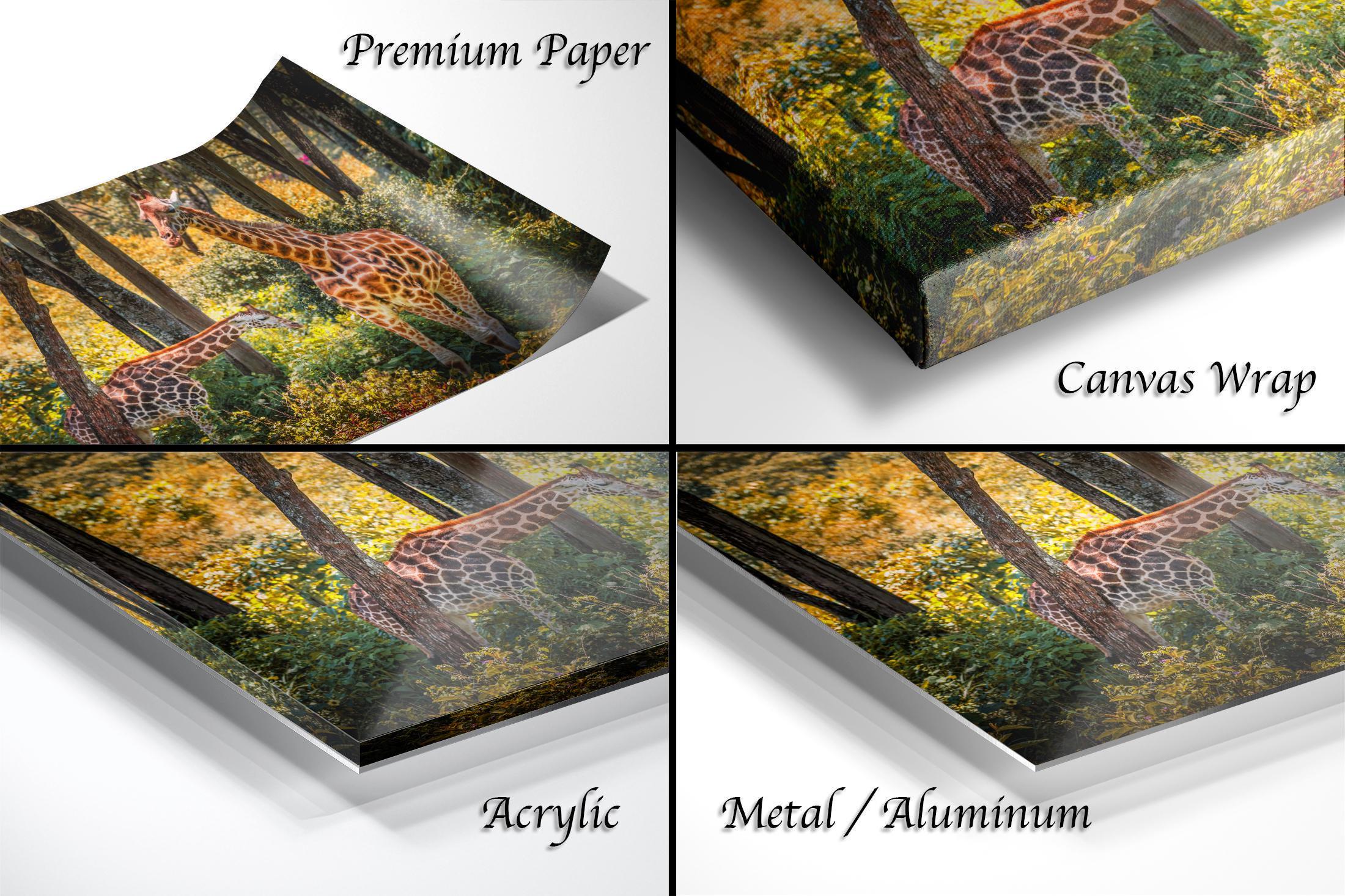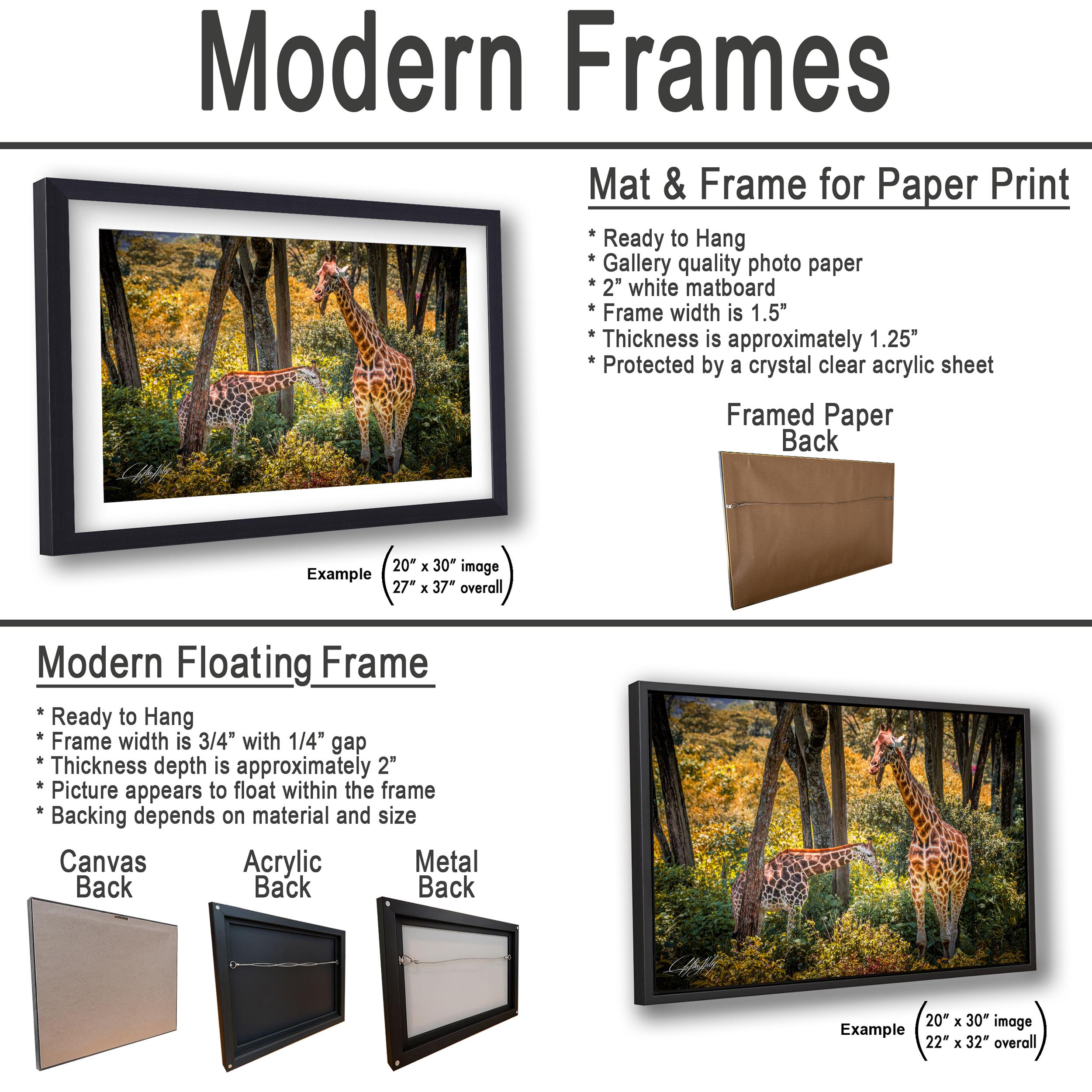 Please note: 1. We do not offer returns as each product is custom made, but damaged items will be gladly replaced. 2. Framed paper prints, acrylics, and metal prints feature a 2" white mat border; canvas prints are flush mounted without a mat border.