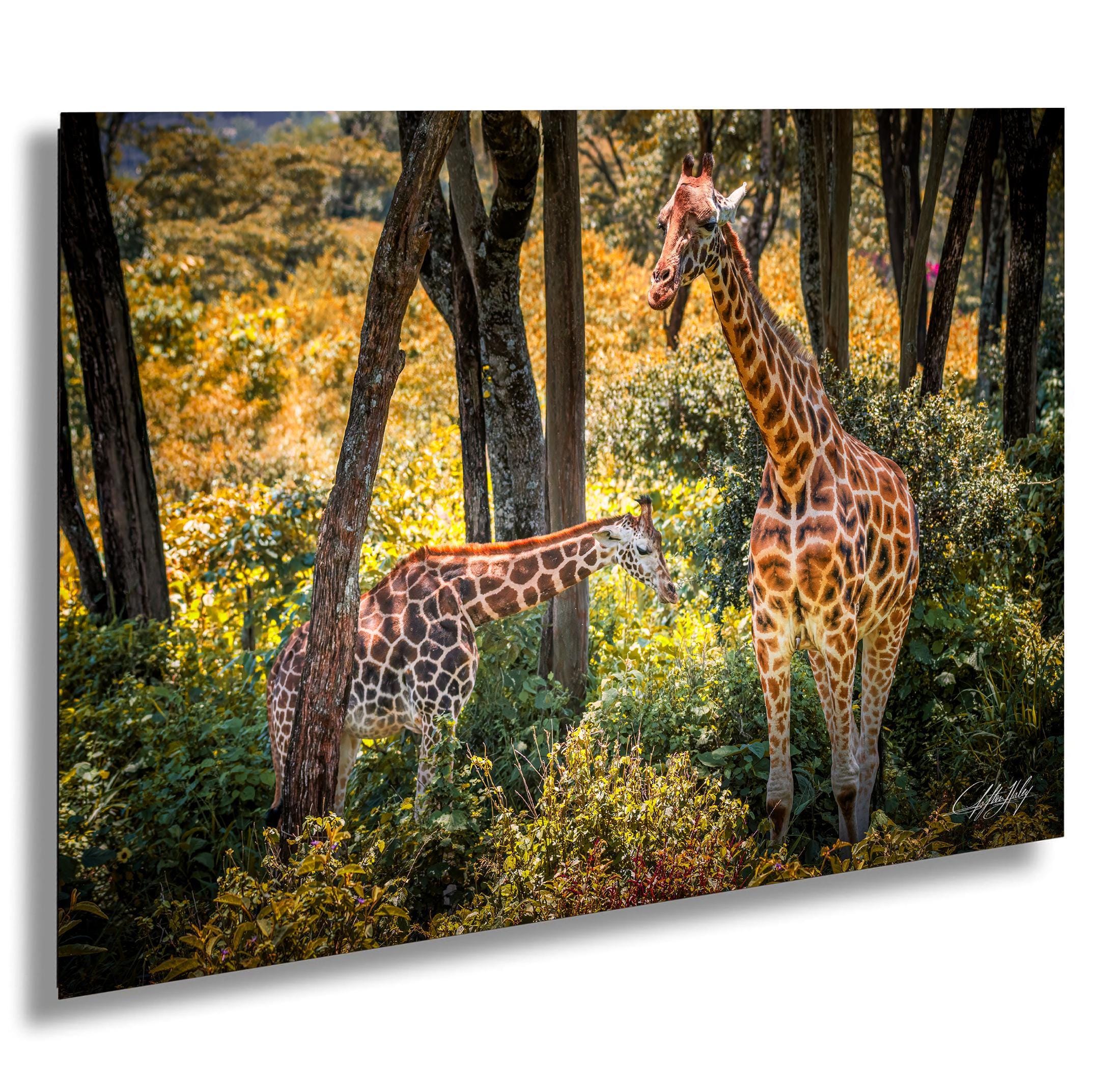 Step into a world where safari art meets vibrant maximalist animal themes. This striking piece features a mother giraffe and her calf, embodying resilience and grace amidst the warm hues of the African landscape.
