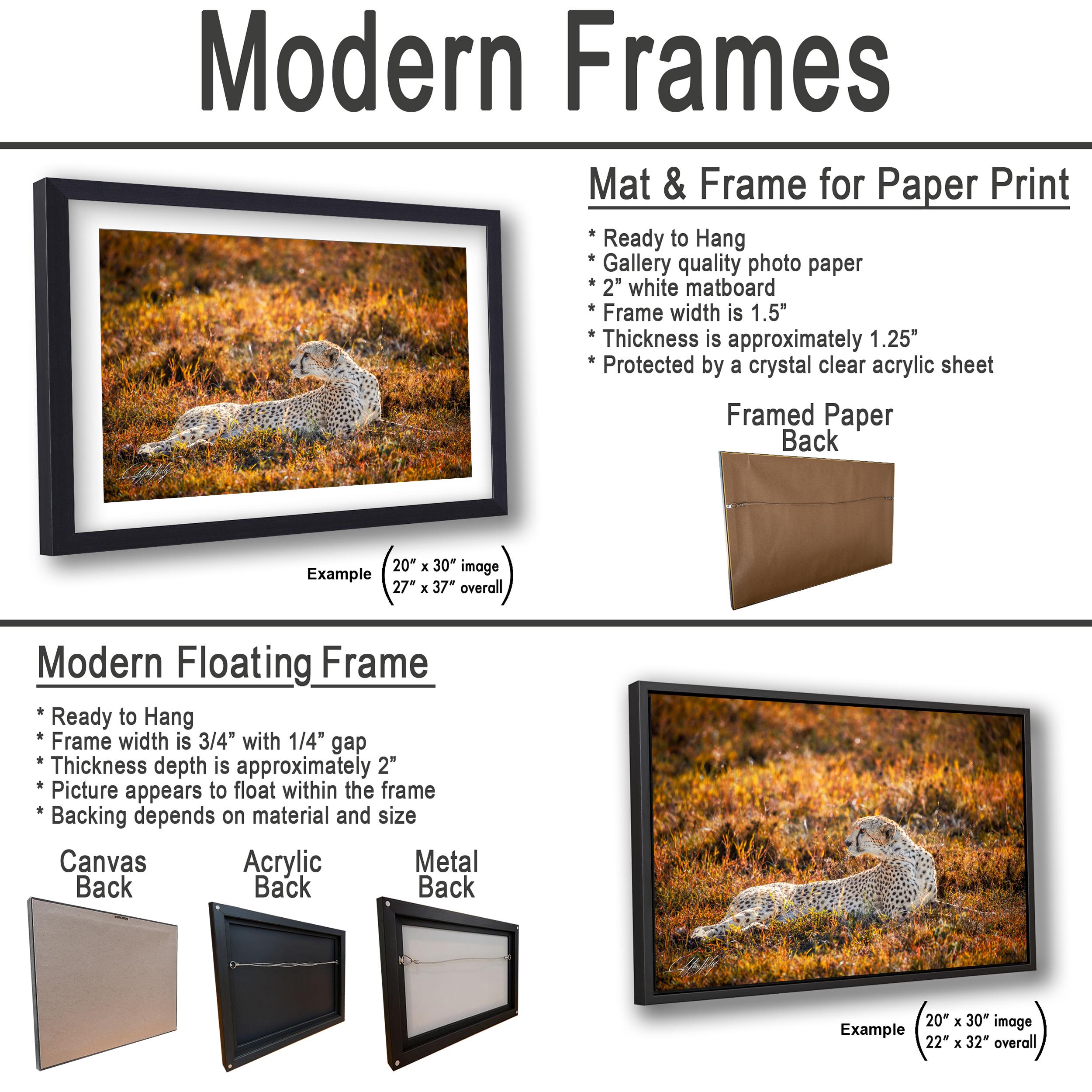 Print options include: - Framed paper prints - Acrylic prints - Aluminum/metal prints featuring a 2" white mat border for an elegant finish - Canvas prints that are flush mounted with no mat border for a sleek look