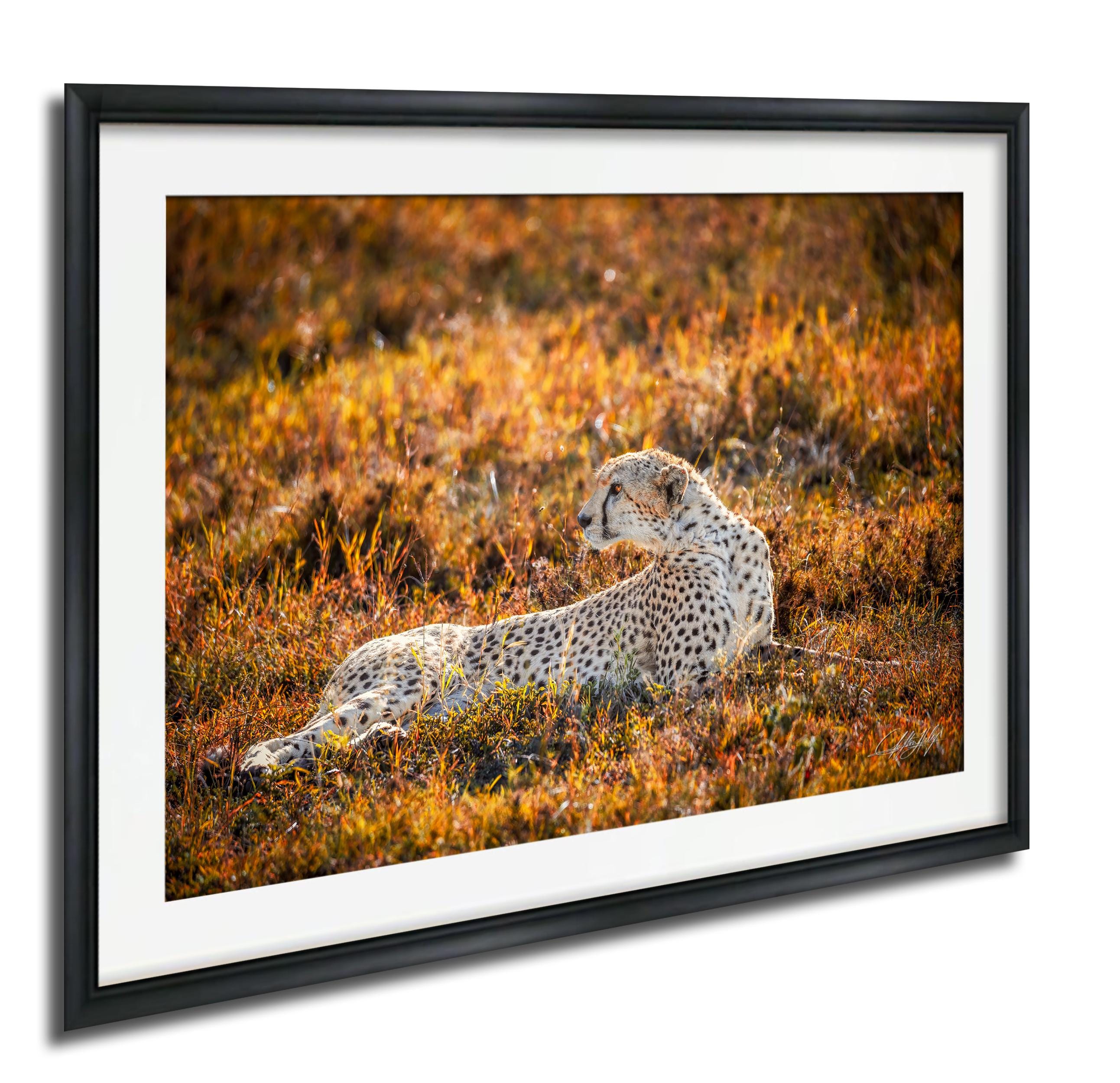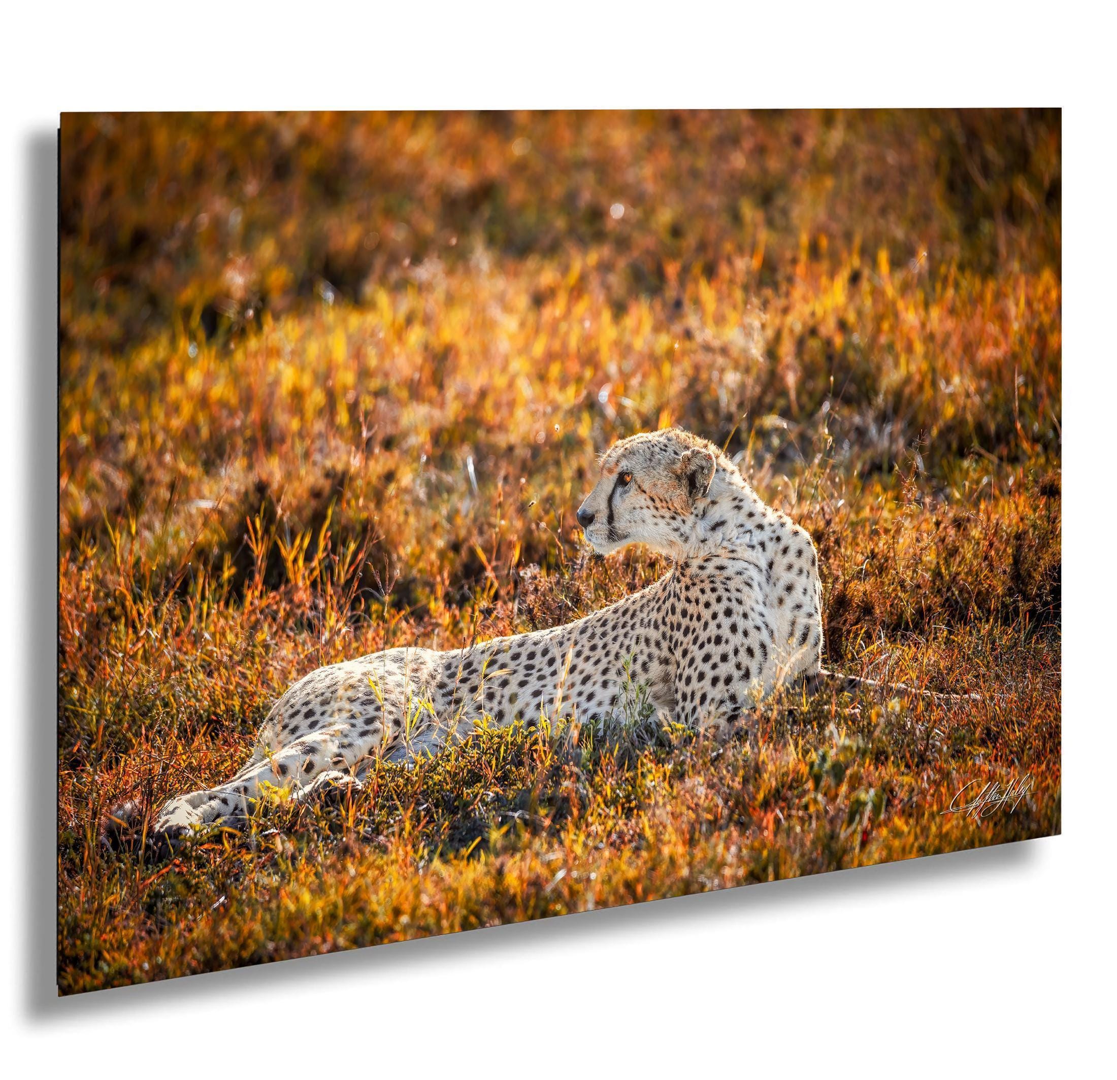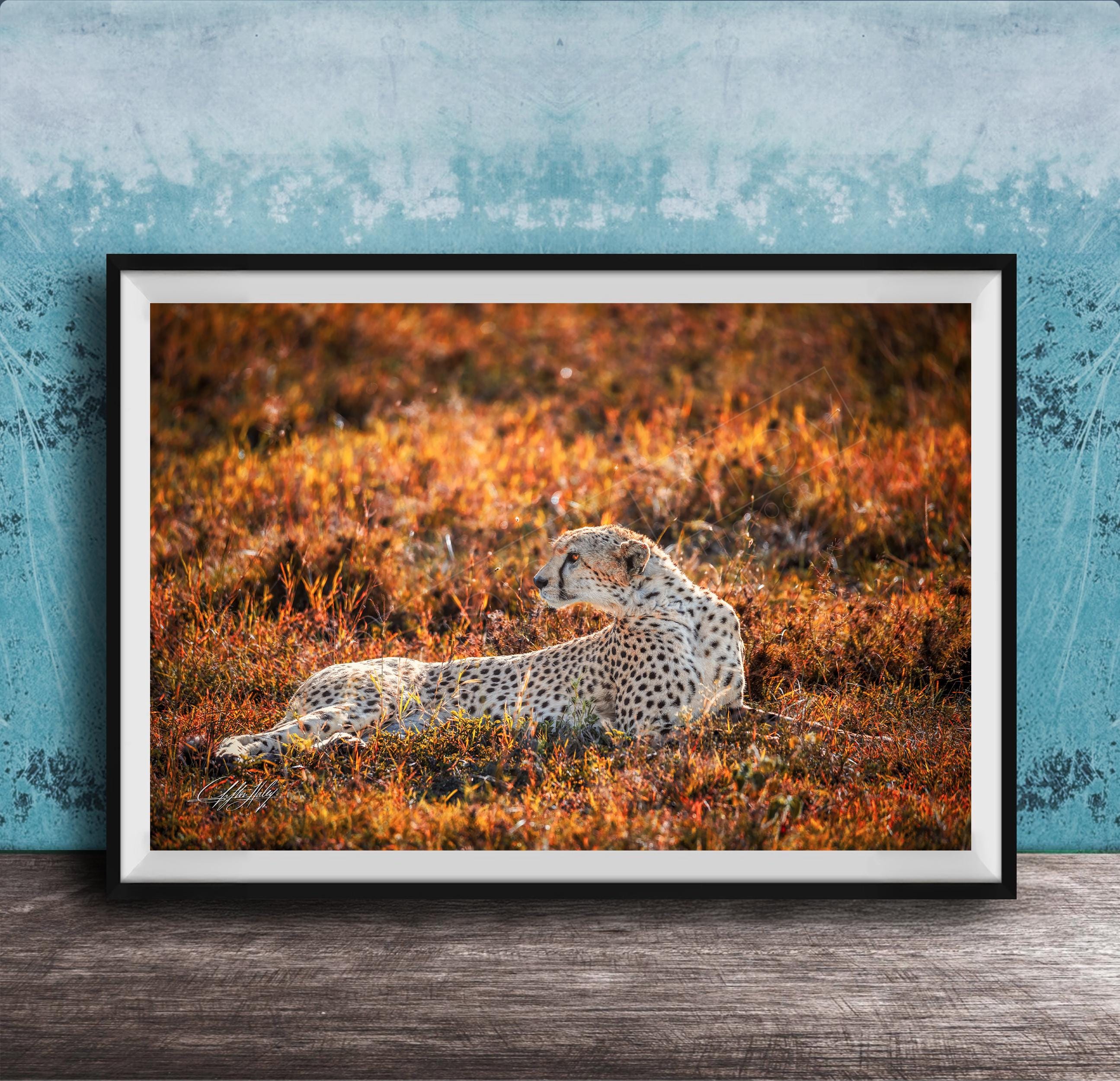 Step into the wild with this maximalist cheetah piece that captures the essence of Kenya’s iconic Mara. The artwork showcases a sleepy cheetah in its natural habitat, blending vivid colors and dynamic energy to enliven your walls.